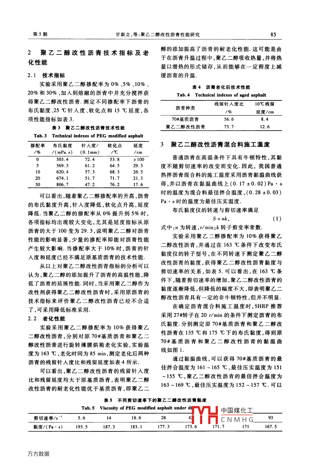 2014年9月鄭州大學(xué)學(xué)報(bào)(工學(xué)版)Sep,2014第35卷第5期Journal of Zhengzhou University( Engineering Science)Vol 35 No 5文章編號(hào):1671-6833(2014)05-0084-03聚乙二醇改性瀝青性能研究甘新立!,張楠2,劉羽2(1.長安大學(xué)特殊地區(qū)公路工程教育部重點(diǎn)實(shí)驗(yàn)室,陜西西安710064;2.長安大學(xué)材料科學(xué)與工程學(xué)院,陜西西安710064摘要:為研究聚乙二醇改性瀝青的技術(shù)性能,測定了不同聚乙二醇摻配率下瀝青的布氏黏度、針入度、軟化點(diǎn)和延度指標(biāo),對(duì)聚乙二醇改性瀝青的性能進(jìn)行了分析;通過對(duì)殘留針入度比和殘留延度的測定,分析了聚乙二醇改性瀝青的老化性能;通過黏度-剪切速率曲線,分析了聚乙二醇改性瀝青的流變特性;通過黏溫曲線獲得聚乙二醇改性瀝青路面的施工溫度,并進(jìn)行了分析.研究結(jié)果表明,隨著聚乙二醇摻配率的增加,瀝青的黏度增加、針入度減小、軟化點(diǎn)升高、延度降低;聚乙二醇改性瀝青的耐老化性能優(yōu)于原基質(zhì)瀝青;聚乙二醇改性瀝青在163℃的條件下呈現(xiàn)一定的非牛頓特性;通過黏溫曲線荻得的聚乙二醇改性瀝青混合料的施工溫度略高于普通瀝青混合料關(guān)鑣詞:道路工程;聚乙二醇;相變材料;瀝青性能中圖分類號(hào):U414文獻(xiàn)標(biāo)志碼:Adoi:10.3969/ J.ssn.1671-66833.2014.05.019度、軟化點(diǎn)、延度和動(dòng)穩(wěn)定度等方面分析了聚乙0引言醇對(duì)瀝青劑及其混合料的影響9在高溫季節(jié),瀝青路面表層溫度可能達(dá)到60筆者通過測定不同聚乙二醇添加率下瀝青的℃以上,易使瀝青路面出現(xiàn)車轍等高溫病害.相變布氏黏度25℃針入度、軟化點(diǎn)和15℃延度,分析材料能夠在一定溫度范圍內(nèi)發(fā)生物相轉(zhuǎn)化,吸收不同聚乙二醇添加率條件下瀝青的性能;通過改或放出大量熱量,但自身溫度不發(fā)生變化,將相變變布氏黏度儀轉(zhuǎn)子型號(hào),在不同剪切速率下測定聚材料加入到瀝青混合料中能夠起到儲(chǔ)存熱量調(diào)乙二醇改性瀝青的黏度,獲得聚乙二醇改性瀝青的節(jié)路面溫度的作用2).聚乙二醇是一種具有水黏度一剪切速率曲線,分析了瀝青的流變特性;在溶性的高分子化合物,在一定溫度下發(fā)生熔融吸不同溫度下測定聚乙二醇改性瀝青的布氏黏度,對(duì)收、儲(chǔ)存熱量并保持溫度恒定,是一種常用的相變聚乙二醇改性瀝青混合料的拌合溫度進(jìn)行分析材料國內(nèi)外對(duì)于相變材料的性能做了大量1原材料技術(shù)性質(zhì)研究3),但對(duì)于聚乙二醇在道路工程上的應(yīng)用則很少涉及張一博等通過綜合熱分析和紅外光實(shí)驗(yàn)采用瀝青為中海70#基質(zhì)瀝青,相關(guān)技譜,分析了多種相變材料的高溫性能,并選擇了適術(shù)性能如表1.聚乙二醇采用國產(chǎn)某聚乙二醇于瀝青路面使用的相變材料.胡曙光等從針入200,0其相關(guān)技術(shù)性質(zhì)如表2表1瀝青技術(shù)指標(biāo)Tab 1 Technical indexes of asphalt60℃動(dòng)力黏度25℃針入度相對(duì)密度/瀝青種類/(Pa·s)(0.1mm)70#基質(zhì)瀝青275.453.826.81.034表2聚乙二醇技術(shù)指標(biāo)Tab 2 Technical indexes of PEG外觀色澤羥值/水份/pH值規(guī)格分子量(25℃(Pt-Co)( mgKOH·g%(1%水溶液)PEG-2000乳白色固狀物51-631800~2200≤1.05.0~7.0收稿日期:2013-05-30;修訂日期:2013-06-19基金項(xiàng)目:中國博土后科學(xué)基金項(xiàng)目(2013M500請(qǐng)省科技支判H中國煤化工CNMH(高?;究蒲袠I(yè)務(wù)費(fèi)專項(xiàng)資助(CHD2011J164)作者簡介:甘新立(1988-),男,陜西漢中人,長安大學(xué)博士生,主要從事路面材料研究,E-mail:ganxing2007@126.com第5期甘新立,等:聚乙二醇改性瀝青性能研究852聚乙二醇改性瀝青技術(shù)指標(biāo)及老醇的添加提高了瀝青的耐老化性能這可能是由化性能于在瀝青升溫過程中,聚乙二醇吸收熱量,并將熱量以潛熱的形式儲(chǔ)存,從而能夠在一定程度上減2.1技術(shù)指標(biāo)緩瀝青的升溫實(shí)驗(yàn)采用聚乙二醇摻配率為0%、5%、10%、表4瀝青老化后技術(shù)性能20%和30%,加入到熔融的瀝青中并充分?jǐn)嚢璜@Tab 4 Technical indexes of aged asphalt得聚乙二醇改性瀝青測定不同摻配率下瀝青的殘留針入度比10℃殘留布氏黏度、25℃針入度、軟化點(diǎn)和15℃延度,各瀝青種類延度/cm項(xiàng)性能指標(biāo)如表370#基質(zhì)瀝青56.6表3聚乙二醇改性瀝青技術(shù)性能聚乙二醇改性瀝青73.712.6Tab 3 Technical indexes of PEG modified asphalt摻配率布氏黏度針入度/軟化點(diǎn)延度3聚乙二醇改性瀝青混合料施工溫度/(mPa.s)(0.1mm)℃03.450372.453.8>100普通瀝青在高溫條件下具有牛頓特性,其黏569.364.5度不隨剪切速率的改變而變化.因此,我國普通620.457.368.326.5674.171.721.3熱拌瀝青混合料的施工溫度采用瀝青黏溫曲線獲806.747.276.217.6得,并以瀝青在黏溫曲線上(0.17±0.02)Pa·s可以看出,隨著聚乙二醇摻配率的升高瀝青時(shí)的溫度為混合料最佳拌合溫度,(0.28±0.03)的布氏黏度升高,針入度降低,軟化點(diǎn)升高,延度Pas時(shí)的溫度為最佳壓實(shí)溫度降低.當(dāng)聚乙二醇的摻配率從0%提升到5%時(shí),布氏黏度儀的轉(zhuǎn)速與剪切速率滿足各項(xiàng)指標(biāo)均出現(xiàn)較大變化,尤其是延度指標(biāo)從原s=nk瀝青的大于100變?yōu)?9.3,說明聚乙二醇對(duì)瀝青式中:n為轉(zhuǎn)速,r/min;k轉(zhuǎn)子剪變率常數(sh