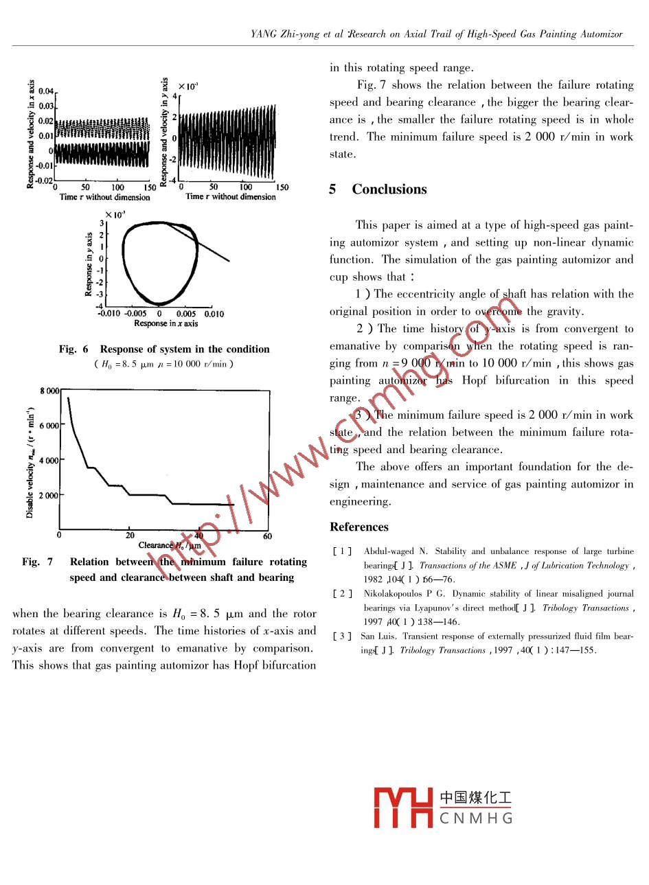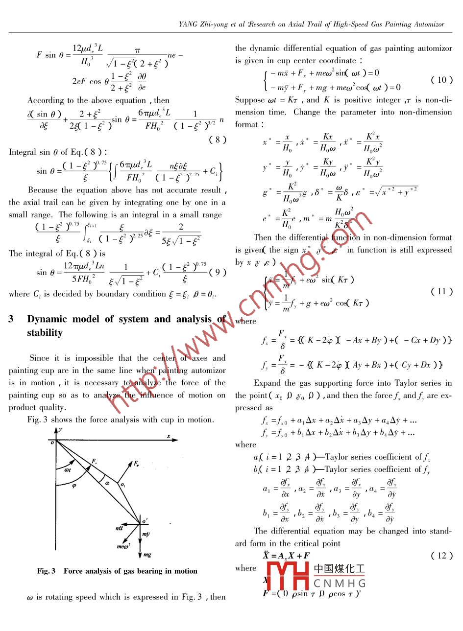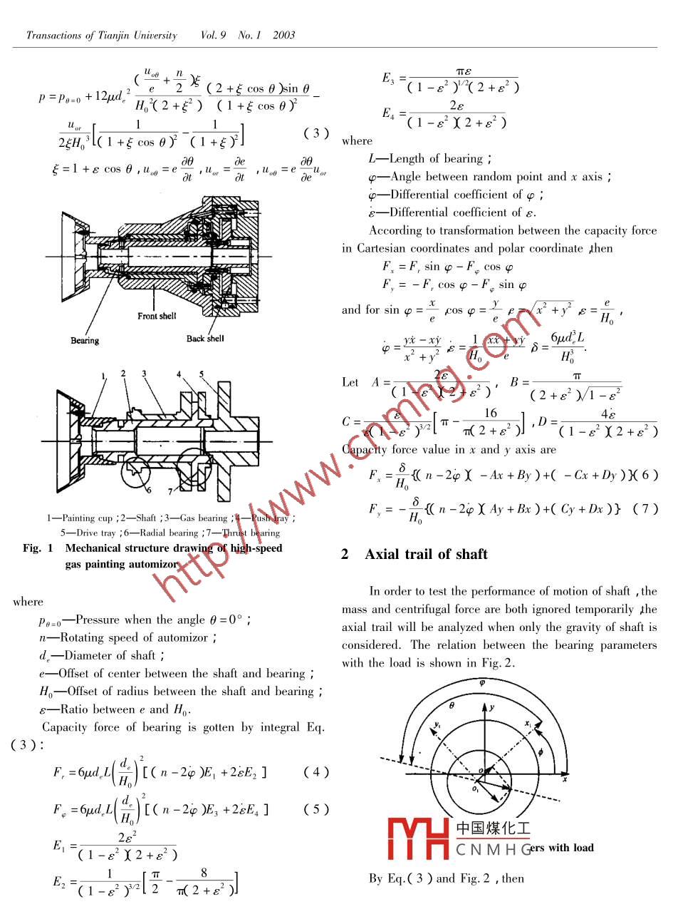Transactions of Tianjin UniversityVol 9 No. 1ar.2003Research on Axial Trail of High-SpeedGas Painting AutomizorYANG Zhi-yong(楊志永), ZHANG Da-we(張大衛(wèi)), HUANG Tian(黃田)School of Mechanical Engineering Tianjin University, Tianjin 300072, ChinaAbstract The non-linear dynamic model is set up of one type of high-speed painting automizor with gas suppoing system. The stability of motion and dynamic response of the gas painting automizor system are studied overrelatively wide range of rotating speed by numerical analytic method the critical velocity under working condition is found, and rotate stability and critical condition are discussed in theory. Furthermore, the range of thecritical parameter of the system when Hopf bifurcation occurs and the law between axis trace and bearing clear-ce are acquired,tooKeywords gas bearing painting automizor stability of motion axial trail critical velocityArticle ID:006-4982(2003)1-0045-0The auto-static painting is one of the most important speed gas painting automizor. Suppose gas has noworking procedures in making the high- level car i stability pressibility and it is the 2-D constant flow. The functionof motion and axial trail in process are the key factors that of motion and continuity of gas in cylindrical coordinate areffect the quality of car surface and the performance, lifeduand reliability of painting automizor which is an important(1a)part. Up to now, the research on stability of motion hasbeen done well by many scholars1迎=a2(1b)sults have also been gotten. But for the gas bearing forced damp are usually solved with1=0dz(1c)linear method thus some important dynamic characters areignored inevitably and most of the objects they studied are0r dethe big rotor-bearing system of generator which is simpli- wherefied into beam or pad which has many concentrated mas-ofses. The dynamic response is analyzed with modal synthe-u, -Radial speed of gassis, impedance mapping method and other dynamic sub-6— Angle between randeaxIstructure methods. But the response of this type of rotorr--Radial distance between the shaft and bearing ibearing system with high speed light load and single bear-z-Coordinate in axis directioning has not been found by nowAccording to the above, this paper will aim at a typeu-Dynamic viscidity of gas and u=pu iof high-speed gas painting automizor system and settinDensity of gasup non-linear dynamic functien the basis ofp--Pressuremeric analysis it is necessary to analyze the stability of mo-Considering the axes disturbance and boundary condition and dynamic response in wide rotate range and getle pressuredistributing of gas bearing by solving thecritical value and the rule between the track of axes centerIng clearanceTH中國煤化工CNMHG1 Capacity force of gas bearing** Aceepted date 2002-09-02YANG Zhi-yong born in 1972 male Dr associate Prof.E-mail azy (@aFig 1 shows the mechanical structure drawing of high-Supported by Tianjin Key Projec( No. 993802611Transactions of Tianjin University Vol 9 No I 2003EP=Po=0+1Bud 2e+25(2+5 cos 0 )sin 0(2+E2)H0(2+62)(1+cos)EaH(1+5cos0)(1+)(3)L-Length of bearing iE=l+8 cos 0,udtcP--Angle between random point and x axisDifferential coefficient ofDifferential coefficient of eAccording to transformation between the capacity forcein Cartesian coordinates and polar coordinate thenF=FFFF sinFront sheltand for sin cos c=xe=x+y2 e=Back shellrx t v1bud.LHoHLetA=,22、,B=X2+2(2+2C=x1=ym2+2),D1-x2+2Capacity force value in x and y axis arδDy )6)I-Painting cup 2-Shaft 3--Gas bearing 4--Push trayF,=-n“n-24X4y+Bx)+(Gy+Dx)}(7Fig. 1 Mechanical structure drawing of high-speed2 Axial trail of shaftgas painting automizorIn order to test the performance of motion of shaft themass and centrifugal force are both ignored temporarily thePeso-Pressure when the angle 0=0axial trail will be analyzed when only the gravity of shaft isn-Rotating speed of automizorconsidered. The relation between the bearing parametersd-Diameter of shaftwith the load is shown in Fig. 2e-Offset of center between the shaft and bearingHo-Offset of radius between the shaft and bearingnd HoCapacity force of bearing is gotten by integral EqF,=01(n-2i)E1+2E2](4))E3+2E4](5)H中國煤化工Er(1-2X2+2)CNMH Gers with loadE2246YANG Zhi-yong et al Research on Axial Trail of High-Speed Gas Painting Automizor12udLthe dynamie differential equation of gas painting automizorF sin eB6?!?-(2+2)is given in cup center coordinateFt mew sIn (t(10)FAccording to the above equation, thenSuppose at= KT, and K is positive integer T is non-di-d sin 0) 26 ud Lmension time. Change the parameter into non-dimensionsin 002(1-FH02(1-2)format(8)KxIntegral sin 0 of Eq (8)HHow(1-52)6 LD…=ecausebove has not accurate resultthe axial trail can be given by integrating one by one in aHsmall range. The following is an integral in a small rangeHo(1-8eHK281(1-y4=sThen the differential function in non-dimension formatThe integral of Eq (8)isis given( the sign x y e in function is still expressed1-52by x y s)(9)5FH0E1-2i=f+ea sir KThere C, is decided by boundary condition E=5 0=0(11)f +g+eG co( KT)3 Dynamic model of system and analysis of wherestabilityFf =e=tK-2 x-Ax+ By )+(-Cx+Dy)jince it is impossible that the center of axes andpainting cup are in the same line when painting automizorftK-2 x Ay +Bx)+( cy + Dx)]it is necessary to analyze the force of theExpand the gas supporting force into Taylor series inpainting cup so as to analyze the influence of motion on the point( xo p yo p ), and then the force f and f, are exproduct qualitypressed asFig 3 shows the force analysis with cup in motion.f=f20+a1△x+a2△x+a3△y+a4△jf,=f,wherea(i=1 2 3 A)Taylor series coefficient of f,b i=l 2 3 4)Taylor series coefficient of f,d, dd df,dfo,;o,The differential equation may be changed into standI form in the critical pointX=AFig 3 Force analysis of gas bearing in motionH中國煤化工CNMHGw is rotating speed which is expressed in Fig 3, thenT D Pcos TTransactions of Tianjin Uni