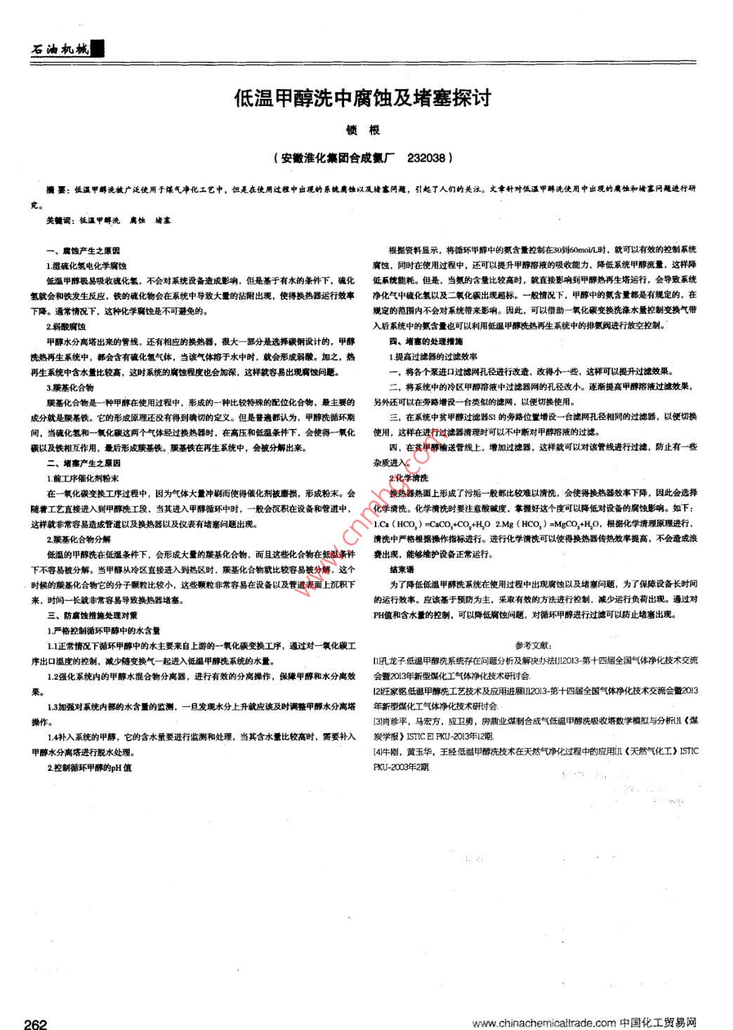 石油機低溫甲醇洗中腐蝕及堵塞探討鎖根(安徽淮化集團合成氨廠232038)擴萎:低溫甲薅洗被廣泛使用于煤氣凈化工藝中,但是在使用過程中出現(xiàn)的系腐蝕以及豬寶問題,引起了人們的關注。文章針對低溫甲醇洗使用中出現(xiàn)的腐蝕和櫧寡問題進行研關詞:低溫甲醇洗腐蝕堵根據資料顯示,將循環(huán)甲醇中的氨含量控制在30到60m0機L時,就可以有效的控制系統(tǒng)1濕硫化氫電化學腐蝕腐蝕,同時在使用過程中,還可以提升甲醇溶液的吸收能力,降低系統(tǒng)甲醇流量,這樣障低溫甲醇極易吸收魂化氫,不會對系統(tǒng)設備造成影響,但是基于有水的條件下,硫化低系統(tǒng)能耗。但是,當氨的含量比較高時,就直接影響到甲醇熱再生塔運行,會導致系統(tǒng)氫就會和鐵發(fā)生反應,鐵的硫化物會在系統(tǒng)中導致大量的沾附出現(xiàn),使得換熱器運行效率凈化氣中硫化氫以及二氧化碳出現(xiàn)超標。一般情況下,甲醇中的氨含量都是有規(guī)定的,在下降。通常情況下,這種化學腐蝕是不可避免的規(guī)定的范圍內不會對系統(tǒng)帶來影響。因此,可以借助一氧化碳變換洗滌水量控制變換氣帶2弱酸腐蝕入后系統(tǒng)中的氨含量也可以利用低溫甲醇洗熱再生系統(tǒng)中的排氨閥進行放空控制甲醇水分離塔出來的管線,還有相應的換熱器,很大一部分是選擇碳鋼設計的,甲醇四、堵塞的處理指施洗熱再生系統(tǒng)中,都會含有硫化氫氣體,當該氣體溶于水中時,就會形成弱酸。加之,熱1提高過濾器的過濾效率再生系統(tǒng)中含水量比較高,這時系統(tǒng)的腐蝕程度也會加深,這樣就容易出現(xiàn)腐燭問題一,將各個泵進口過濾網孔徑進行改造,改得小一些,這樣可以提升過濾效果。3羰基化合物二,將系統(tǒng)中的冷區(qū)甲醇溶液中過濾器網的孔徑改小。逐漸提高甲醇溶液過濾效果羰基化合物是一種甲醇在使用過程中,形成的一種比較特殊的配位化合物,最主要的另外還可以在旁路增設一臺類似的濾網,以便切換使用成分就是羰基鐵。它的形成原理還沒有得到確切的定義。但是普遍都認為,甲醇洗循環(huán)期三,在系統(tǒng)中貧甲醇過濾器S!的旁路位置增設一臺濾網孔徑相同的過濾器,以便切間,當硫化氫和一氧化碳這兩個氣體經過換熱器時,在高壓和低溫條件下,會使得一氧化使用,這樣在進行過濾器清理時可以不中斷對甲醇溶液的過濾。碳以及鐵相互作用,最后形成羰基鐵。羰基鐵在再生系統(tǒng)中,會被分解出來。四,在貧甲醇輸送管線上,增加過濾器,這樣就可以對該管線進行過濾,防止有一些堵塞產生之原因雜質進入1前工序催化劑粉末2化學清洗在一氧化碳變換工序過程中,因為氣體大量沖刷而使得催化劑被磨損,形成粉末。會換熱器熱面上形成了污垢一般都比較難以清洗,會使得換熱器效率下降,因此會選擇隨著工藝直接進入到甲醇洗工段,當其進入甲醇循環(huán)中時,一般會沉積在設備和管道中,化學清洗。化學清洗時要注意酸堿度,掌握好這個度可以降低對設備的腐蝕影響。如下這樣就非常容易造成管道以及換熱器以及儀表有堵塞問題出現(xiàn)。lCa(HCO2)=CCO+CO2+HO2Mg(HCO2)=MgCO+HQ,根據化學清理原理進行,羰基化合物分解清洗中嚴格根據操作指標進行。進行化學清洗可以使得換熱器傳熱效率提高,不會造成浪低溫的甲醇洗在低溫條件下,會形成大量的羰基化合物,而且這些化合物在低溫條件費出現(xiàn),能夠維護設備正常運行。下不容易被分解。當甲醇從冷區(qū)直接進入到熱區(qū)時,羰基化合物就比較容易被分解,這個時候的腺基化合物它的分子顆粒比較小,這些顆粒非常容易在設備以及管道表面上沉積下為了降低低溫甲醇洗系統(tǒng)在使用過程中出現(xiàn)腐蝕以及堵塞問題,為了保障設備長時間來,時間一長就非常容易導致?lián)Q熱器堵塞的運行效率。應該基于預防為主,采取有效的方法進行控制,減少運行負荷出現(xiàn)。通過對三、防腐蝕措施處理對策PH值和含水量的控制,可以降低腐蝕問題,對循環(huán)甲醇進行過濾可以防止堵塞出現(xiàn)1嚴格控制循環(huán)甲醇中的水含量11正常情況下循環(huán)甲醇中的水主要來自上游的一氧化碳變換工序,通過對一氧化碳工參考文獻序出口溫度的控制,減少隨變換氣一起進入低溫甲醇洗系統(tǒng)的水量。龍子低溫甲醇冼系統(tǒng)存在問題分析及解決辦法2013第十四屆全國氣體凈化技術交流12強化系統(tǒng)內的甲醇水混合物分離器,進行有效的分離操作,保障甲醇和水分高效會置2013年新型煤化工氣體凈化技術研討會2家銘低溫甲醇冼工藝技術及應用進展203-第十四屆全國氣體凈化技術交流會暨2031.3加強對系統(tǒng)內部的水含量的監(jiān)測,一日發(fā)現(xiàn)水分上升就應該及時調整甲醇水分離塔年新型煤化工氣體凈化技術研討會操作。3肖珍平,馬宏方,應衛(wèi)勇,房業(yè)煤制合成氣低溫甲醇洗吸收塔數(shù)學模擬與分析《煤14補入系統(tǒng)的甲醇,它的含水量要進行監(jiān)測和處理,當其含水量比較高時,需要補入炭學報》1 STIC EI PKU-203年2期甲醇水分離塔進行脫水處理4牛剛,黃玉華,王經低甲醇冼技術在天然氣凈化過程中的應用《天然氣化工》sTC2控制循環(huán)甲醇的pH值KU-2003年2期262www.chinachemicaitradecom