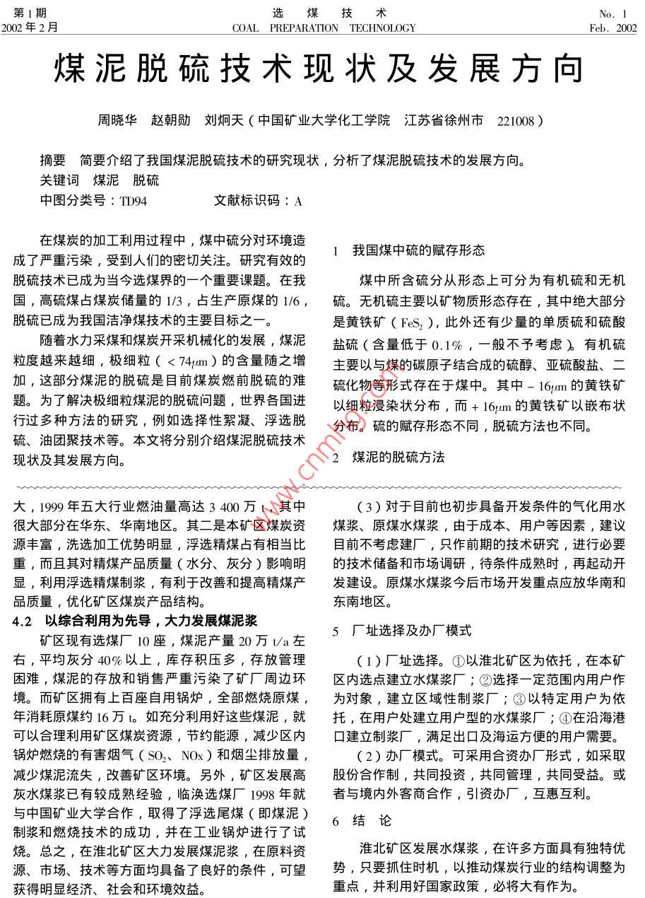 第1期選煤技術(shù)2002年2月COAL PREPARATION TECHNOLOGYFeb. 200淺談淮北礦區(qū)水煤漿技術(shù)開發(fā)李玉才江渭清(淮北礦業(yè)集團煤質(zhì)運銷處安徽省淮北市235006)摘要文章介紹了淮北礦區(qū)水煤漿技術(shù)開發(fā)的現(xiàn)狀、內(nèi)容、優(yōu)勢,提出了建議,展望了礦區(qū)發(fā)展水煤漿的前景。關(guān)鍵詞水煤漿技術(shù)開發(fā)建議展望中圖分類號:TQ536文獻標識碼:A1前言大型企業(yè)?,F(xiàn)有生產(chǎn)礦井14對,年產(chǎn)原煤17Mt以水煤漿具有與油一樣的流動性和良好的穩(wěn)定上,尚有1對在建礦井。生產(chǎn)選煤廠10座,設(shè)計性,便于裝卸、儲存、管道運輸和泵送,可在爐中洗選加工能力15.8M/a,洗選加工工藝先進,裝備霧化燃燒。其燃燒效率高,有害物排放量低,是目精良,系統(tǒng)靈活,是華東地區(qū)重要的能源基地。前理想的代油、代煤、節(jié)能、清潔型燃料。礦區(qū)煤炭資源豐富,煤種齊全,煤炭品質(zhì)優(yōu)經(jīng)過20年的研究和開發(fā),我國與水煤漿技術(shù)良,含硫量特低,磷、砷等有害元素含量極少,可相關(guān)的制漿、儲運、燃燒、工程等技術(shù)已趨成熟。曆性好。礦區(qū)地理位置優(yōu)越,交通便捷。各種水煤漿已分別在電站鍋爐、工業(yè)鍋爐、工業(yè)窯3.2現(xiàn)狀爐燃燒成功,取得了巨大的經(jīng)濟、社會和環(huán)境效淮北礦區(qū)水煤漿技術(shù)開發(fā)始自1998年。臨渙益。目前已經(jīng)形成了科研開發(fā)、設(shè)備制造、生產(chǎn)及選煤廠與中國礦業(yè)大學(xué)合作,取得了浮選尾煤制漿應(yīng)用完整的產(chǎn)業(yè)化體系。和燃燒技術(shù)的成功,建立了礦區(qū)第一個浮選尾煤制2水煤漿的市場前景漿生產(chǎn)線,且已在4t鍋爐上試燒成功目前已建立了課題組,確定了研究方向,初步1999年燃料行業(yè)統(tǒng)計資料表明,用于發(fā)電、石化、建材、冶金鋼鐵、化工五大行業(yè)的燃油約制訂了礦區(qū)水煤漿技術(shù)發(fā)展規(guī)劃。3400萬t,占全國燃油量的85%,若只將其中的33適合淮北礦區(qū)煤質(zhì)特點的水煤漿品種50%用水煤漿代替,每年可代油2000萬t以上?;幢钡V區(qū),水煤漿品種大致可分為4大類型5(1)據(jù)調(diào)查,安徽省內(nèi)五大行業(yè)每年消耗重油個品種52.4萬t,其中電廠燃油4.1萬t;江蘇省僅南京市(1)精煤水煤漿。選用浮選精煤(灰分小于年消耗重油量約10萬t;加上華東、華南及中南地10%)作為制漿原料,產(chǎn)品可作鍋爐代油燃料。區(qū)鍋爐燃燒重油量,數(shù)量非常可觀。若按2水煤(2)經(jīng)濟型水煤漿??紤]開發(fā)兩個品種,一是漿替代1t重油計算,僅安徽省內(nèi)每年就需要水煤選用原生煤泥(灰分15%~25%)作為制漿原料漿約105萬t,市場前景非常廣闊。產(chǎn)品可作鏈條鍋爐燃料。二是選用浮選尾煤作為制〔2〕用水煤漿代替煤炭在鍋爐中燃燒,環(huán)保效漿原料,產(chǎn)品可作沸騰爐、鏈條爐燃料。益好。省內(nèi)及華東地區(qū)大中城市采暖燃煤鍋爐數(shù)量(3)氣化用水煤漿。選用原煤(灰分小于大,這也是水煤漿的潛在用戶。25%)作制漿原料,產(chǎn)品可作德士古爐氣化造氣用(3)目前淮北礦區(qū)自用鍋爐年用煤量16萬原料左右,在臨渙選煤廠煤泥漿試燒成功后,全礦區(qū)鍋(4)原煤水煤漿。選用灰分大于20%原料爐均可考慮改燒煤泥漿。產(chǎn)品作工業(yè)窯爐燃料。3淮北礦區(qū)水煤漿開發(fā)條件4淮北礦區(qū)發(fā)展水煤漿建議3.1礦區(qū)簡介4.1以浮選精煤為原料,大力發(fā)展代油水煤漿淮北礦業(yè)(集團)有限責(zé)任公司是國有獨資特以華東地區(qū)用戶為重點供貨對象,在礦區(qū)以發(fā)收稿日期:2001-10-25展精煤水煤漿為重點,尤其是發(fā)展以浮選精煤為制第1作者簡介:李玉才男,1952年生,高工,19年畢漿原料的精煤水煤漿。其有利條件如下:我國石油第1期選煤技術(shù)2002年2月COAL PREPARATION TECHNOLOGYFeb. 200煤泥脫硫技術(shù)現(xiàn)狀及發(fā)展方向周曉華趙朝勛劉炯天(中國礦業(yè)大學(xué)化工學(xué)院江蘇省徐州市221008)摘要簡要介紹了我國煤泥脫硫技術(shù)的研究現(xiàn)狀,分析了煤泥脫硫技術(shù)的發(fā)展方向。關(guān)鍵詞煤泥脫硫中圖分類號:TD94文獻標識碼:A在煤炭的加工利用過程中,煤中硫分對環(huán)境造我國煤中硫的賦存形態(tài)成了嚴重污染,受到人們的密切關(guān)注。研究有效的脫硫技術(shù)已成為當今選煤界的一個重要課題。在我煤中所含硫分從形態(tài)上可分為有機硫和無機國,高硫煤占煤炭儲量的13,占生產(chǎn)原煤的1陌6,硫。無機硫主要以礦物質(zhì)形態(tài)存在,其中絕大部分脫硫已成為我國潔凈煤技術(shù)的主要目標之一是黃鐵礦(FeS3),此外還有少量的單質(zhì)硫和硫酸著水力采煤和煤炭開采機械化的發(fā)展,煤泥鹽硫(含量低于0.1%,一般不予考慮)有機硫粒度越來越細,極細?!?74rm)的含量隨之增主要以與煤的碳原子結(jié)合成的硫醇、亞硫酸鹽、加,這部分煤泥的脫硫是目前煤炭燃前脫硫的難硫化物等形式存在于煤中。其中-16m的黃鐵礦題。為了解決極細粒煤泥的脫硫問題,世界各國進以細粒浸染狀分布,而+16m的黃鐵礦以嵌布狀行過多種方法的研究,例如選擇性絮凝、浮選脫分布。硫的賦存形態(tài)不同,脫硫方法也不同。硫、油團聚技術(shù)等。本文將分別介紹煤泥脫硫技術(shù)現(xiàn)狀及其發(fā)展方向2煤泥