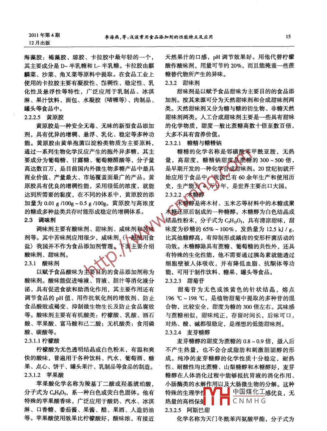 2011年第4期食品工程112月出版FOOD ENGINEERING淺談常用食品添加劑的性能特點(diǎn)及應(yīng)用On performance and applications of common food additives李海燕*喬建芬(山西輕工職業(yè)技術(shù)學(xué)院,太原030013)LI Hai-yan°QIAO Jian- -fen(Shanxi light industry vocational and technical college, Taiyuan 030013 ,China)摘要介紹了食品添加劑的定義、發(fā)展趨勢(shì);重點(diǎn)介紹了食品防腐劑、食品乳化劑、增稠劑、食品調(diào)味劑以及食用色素等的性能特點(diǎn)及應(yīng)用;強(qiáng)調(diào)食品添加劑的使用安全。關(guān)鍵詞食品添加劑; 防腐劑;著色劑;調(diào)味劑;安全性;標(biāo)準(zhǔn)Abstract The definition and development trend of food additives were introduced.Food preservatives , food emulsifers,food thickeners , food flavorings and food pigments were mainly introduced. The safe use of food additives was empha-sized.Keywords food additive; preservative; pigment; flavoring; safety; standard中圖分類號(hào):TS202.3文獻(xiàn)標(biāo)識(shí)碼:A文章編號(hào):1673- -6004(2011)04- 0014 -02食品添加劑是構(gòu)成現(xiàn)代食品工業(yè)的重要因素,化;對(duì)于改善食品的色、香、味,增加食品營養(yǎng),提高c)能夠使食品工業(yè)節(jié)約資源、降低成本,在食品品質(zhì),改善加工條件,防止食品變質(zhì),延長食極大地提升食品品質(zhì)和檔次的同時(shí),增加其附加品的保質(zhì)期有極其重要的作用。因此,食品添加劑值,產(chǎn)生明顯的經(jīng)濟(jì)效益和社會(huì)效益。工業(yè)在現(xiàn)代食品工業(yè)中占據(jù)重要地位。1.2.2食品添加劑發(fā)展趨勢(shì)a)開發(fā)天然、營養(yǎng)、多功能的食品添加劑;,1食品添加劑的定義及作用b)致力開發(fā)多樣化、專用的添加劑。1.1食品添加劑的定義2食 品添加劑的種類《中華人民共和國食品安全法》第九十九條中對(duì)食品添加劑下的定義:“食 品添加劑,指為改善食品添加劑按來源可分為天然食品添加劑和人食品品質(zhì)和色、香、味,以及為防腐和加工工藝的工合成食品添加劑。按功能進(jìn)行分類,主要有:營需要而加入食品中的人工合成或者天然物質(zhì)?!别B(yǎng)強(qiáng)化劑、防腐防霉劑、抗氧化保鮮劑、增稠劑、1.2 食品添加劑的作用和發(fā)展趨勢(shì)乳化劑、螯合劑(含穩(wěn)定劑和凝固劑)、品質(zhì)改良1.2.1食品添加劑的主要作用劑、調(diào)味劑、色澤處理劑、食用香精、香料等。a)能夠改善食品的品質(zhì),提高食品的質(zhì)量,2.1 食品防腐劑滿足人們對(duì)食品風(fēng)味、色澤、口感的要求;食品防腐劑是為了抑制食品腐敗和變質(zhì),延長b)能夠使食品加工制造工藝更合理、更衛(wèi)生、貯存期和保鮮期的一類添加劑_日前堂用的食品防更便捷,有利于食品工業(yè)的機(jī)械化、自動(dòng)化和規(guī)模腐劑主要有4歲中國煤化工梨酸及其鹽*李海燕,女,1966年出生, 1988年畢業(yè)于忻州師范學(xué)院化學(xué)類、丙酸及其鹽YH_ CNMH G教育專業(yè),實(shí)驗(yàn)師。2.1.1苯甲 酸及其鈉鹽收稿日期: 2011-10-29苯甲酸又稱安息香酸,是一種常用的有機(jī)殺菌14食品工程2011年第4期.12月出版劑。在pH值低的環(huán)境中,苯甲酸對(duì)廣范圍的微生乳化劑,廣泛用于起酥油、糕點(diǎn)、面包、糖果、冰物有效,但對(duì)產(chǎn)酸菌作用弱。當(dāng)pH高于5.5時(shí),淇淋中,起乳化、發(fā)泡、防結(jié)晶、抗老化作用。對(duì)很多霉菌和酵母沒有效果。苯甲酸抑菌的最適宜2.2.1.2蔗糖脂肪酸酯pH值為2.5~4,對(duì)一般微生物的完全抑制最小質(zhì)蔗糖脂肪酸酯是- -種性能優(yōu)良、高效、安全的量分?jǐn)?shù)為0.05% ~0.1%。乳化劑。蔗糖脂肪酸酯以蔗糖部分為親水基,長碳2.1.2山梨酸及其鹽類鏈脂肪酸部分為親油基,在體內(nèi)可被消化成蔗糖和山梨酸化學(xué)名為2,4-己二烯酸,結(jié)構(gòu)式為脂肪酸而被吸收。蔗糖脂肪酸酯無毒、無刺激,易CH2CH=CHCH=CH- CO0H,是-種廣 譜食品防腐劑。被生物降解, 因此在食品中的使用沒有限制。2.1.3丙酸及其鹽類2.2.1.3失水 山梨醇脂肪酸酯丙酸是具有類似醋酸剌激酸香的液體,由于是失水山梨醇脂肪酸酯的商品名為司盤(span) ,人體新陳代謝的正常中間物,故無毒性,其ADI值司盤類乳化劑在堿催化下與環(huán)氧乙烷起加成反應(yīng),不加限制。丙酸對(duì)霉菌、好氣性細(xì)菌、革蘭氏陰性可得到Tween (吐溫)類乳化劑。菌,尤其是對(duì)使面包生成絲狀黏質(zhì)的大腸芽孢桿菌2.2.1.4大豆磷脂有效,并能防止黃曲霉毒素的產(chǎn)生,所以常用于面大豆磷脂又稱大豆卵磷脂或磷脂,為淡黃色或包及糕點(diǎn)的制作。丙酸鹽具有相同的防腐效果,常褐色透明、半透明的黏稠物質(zhì)。他是大豆油生產(chǎn)中用的是鈣鹽和鈉鹽。的副產(chǎn)品,是- -種天然的表面活性劑。其主要成分2.1.4對(duì)羥基苯甲 酸及其酯類是卵磷脂、腦磷脂和肌醇磷脂。大豆磷脂作為乳化對(duì)羥基苯甲酸酯又稱尼泊金酯,為無色結(jié)晶劑,具有優(yōu)良的乳化性、抗氧化性、分散性和保濕或白色結(jié)晶粉末,無味,無臭。主要用于醬油、性, 已廣泛用于食品、速溶奶、人造奶油、顆粒飲果醬、清涼飲料等。防腐效果優(yōu)于苯甲酸及其鈉料、營養(yǎng)乳化劑等方面。鹽,使用量約為苯甲酸鈉的1/10,適宜pH值為2.2.2增稠劑4~8。對(duì)羥基苯甲酸酯的毒性低于苯甲酸,丙酯增稠劑是- ~類能提高食