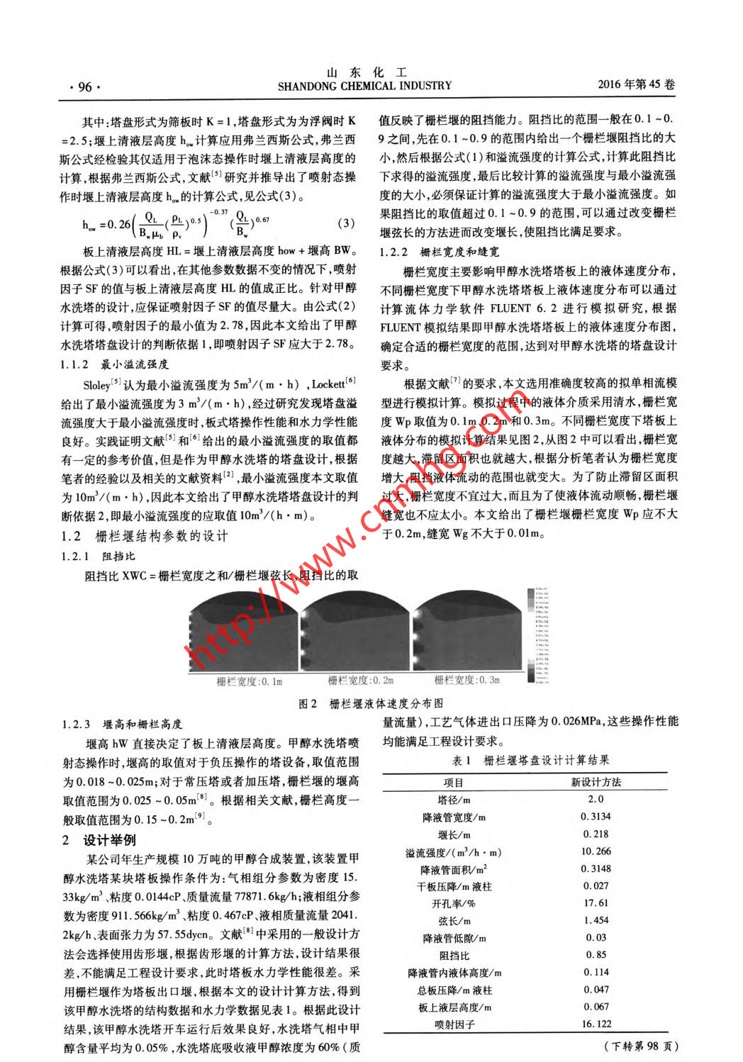 山東化工●96●SHANDONG CHEMICAL INDUSTRY2016年第45卷其中:塔盤形式為篩板時K = 1,塔盤形式為為浮閥時K值反映了柵欄堰的阻擋能力。阻擋比的范圍- -般在0.1 ~0.=2.5;堰上清液層高度h.計算應(yīng)用弗蘭西斯公式,弗蘭西9之間,先在0.1 ~0.9的范圍內(nèi)給出-一個柵欄堰阻擋比的大斯公式經(jīng)檢驗(yàn)其僅適用于泡沫態(tài)操作時堰上清液層高度的小,然后根據(jù)公式( 1)和溢流強(qiáng)度的計算公式,計算此阻擋比計算,根據(jù)弗蘭西斯公式,文獻(xiàn)(5]研究并推導(dǎo)出了噴射態(tài)操下求得的溢流強(qiáng)度,最后比較計算的溢流強(qiáng)度與最小溢流強(qiáng)作時堰上清液層高度h。的計算公式,見公式(3)。度的大小,必須保證計算的溢流強(qiáng)度大于最小溢流強(qiáng)度。如h. =0.26(1)) (y)。(3)果阻擋比的取值超過0.1 ~0.9的范圍,可以通過改變柵欄堰弦長的方法進(jìn)而改變堰長,使阻擋比滿足要求。板上清液層高度HL=堰上清液層高度how+堰高BW。1.2.2柵欄寬度和縫寬根據(jù)公式(3)可以看出,在其他參數(shù)數(shù)據(jù)不變的情況下,噴射柵欄寬度主要影響甲醇水洗塔塔板上的液體速度分布,因子SF的值與板上清液層高度HL的值成正比。針對甲醇不同柵欄寬度下甲醇水洗塔塔板上液體速度分布可以通過水洗塔的設(shè)計,應(yīng)保證噴射因子SF的值盡量大。由公式(2)計算流體力學(xué)軟件FLUENT 6.2進(jìn)行模擬研究,根據(jù)計算可得,噴射因子的最小值為2. 78,因此本文給出了甲醇FLUENT模擬結(jié)果即甲醇水洗塔塔板上的液體速度分布圖,水洗塔塔盤設(shè)計的判斷依據(jù)1 ,即噴射因子SF應(yīng)大于2.78。確定 合適的柵欄寬度的范圍,達(dá)到對甲醇水洗塔的塔盤設(shè)計1.1.2 最小溢流強(qiáng)度要求。Sloley's)認(rèn)為最小溢流強(qiáng)度為5m2/(m . h) ,lockett]l根據(jù)文獻(xiàn)[7]的要求,本文選用準(zhǔn)確度較高的擬單相流模給出了最小溢流強(qiáng)度為3 m'/(m●h) ,經(jīng)過研究發(fā)現(xiàn)塔盤溢型進(jìn)行模擬計算。模擬過程中的液體介質(zhì)采用清水,柵欄寬流強(qiáng)度大于最小溢流強(qiáng)度時,板式塔操作性能和水力學(xué)性能度Wp取值為0.1m.0. 2m和0.3m。不同柵欄寬度下塔板上良好。實(shí)踐證明文獻(xiàn)[51和161)給出的最小溢流強(qiáng)度的取值都液體分布的模擬計算結(jié)果見圖2,從圖2中可以看出,柵欄寬有一定的參考價值,但是作為甲醇水洗塔的塔盤設(shè)計,根據(jù)度越大,滯留區(qū)面積也就越大,根據(jù)分析筆者認(rèn)為柵欄寬度筆者的經(jīng)驗(yàn)以及相關(guān)的文獻(xiàn)資料(2) ,最小溢流強(qiáng)度本文取值增大,阻擋液體流動的范圍也就變大。為了防止滯留區(qū)面積為10m'/( m. h) ,因此本文給出了甲醇水洗塔塔盤設(shè)計的判過大,柵欄寬度不宜過大,而且為了使液體流動順暢,柵欄堰斷依據(jù)2,即最小溢流強(qiáng)度的應(yīng)取值10m'/(h. m)。縫寬也不應(yīng)太小。本文給出了柵欄堰柵欄寬度Wp應(yīng)不大1.2 柵欄堰結(jié)構(gòu)參數(shù)的設(shè)計于0. 2m,縫寬Wg不大于0.01m。1.2.1 阻擋比阻擋比XWC =柵欄寬度之和/柵欄堰弦長,阻擋比的取柵欄寬度:0.1m柵欄寬度:0.2m柵欄寬度:0.3m圖2柵欄堰液體速度分布 圖1.2.3堰 高和柵欄高度量流量) ,工藝氣體進(jìn)出口壓降為0. 026MPa,這些操作性能堰高h(yuǎn)W直接決定了板上清液層高度。甲醇水洗塔噴均能滿足工程設(shè)計要求。射態(tài)操作時,堰高的取值對于負(fù)壓操作的塔設(shè)備,取值范圍表1 柵欄堰塔盤設(shè)計計算結(jié)果為0.018 ~0.025m;對于常壓塔或者加壓塔,柵欄堰的堰高項目新設(shè)計方法.取值范圍為0.025 ~ 0.05m[8]。根據(jù)相關(guān)文獻(xiàn),柵欄高度一塔徑/m2.0般取值范圍為0.15~0. 2m(9。降液管寬度/m0.3134堰長/m0.2182設(shè)計舉例溢流強(qiáng)度/(m2/h.m)10. 266某公司年生產(chǎn)規(guī)模10萬噸的甲醇合成裝置,該裝置甲降液管面積/m20. 3148醇水洗塔某塊塔板操作條件為:氣相組分參數(shù)為密度15. .干板壓降/m液柱0.02733kg/m'、粘度0.0144cP、質(zhì)量流量77871. 6kg/h;液相組分參開孔率/%17.61數(shù)為密度911.566kg/m'、粘度0. 467cP、液相質(zhì)量流量2041.弦長/m1. 4542kg/h表面張力為57. 55dycen。文獻(xiàn)[8] 中采用的- -般設(shè)計方降液管低隙/m0.03法會選擇使用齒形堰,根據(jù)齒形堰的計算方法,設(shè)計結(jié)果很阻擋比0. 85差,不能滿足工程設(shè)計要求,此時塔板水力學(xué)性能很差。采降液管內(nèi)液體高度/m0.114用柵欄堰作為塔板出口堰,根據(jù)本文的設(shè)計計算方法,得到總板壓降/m液柱0.047 .該甲醇水洗塔的結(jié)構(gòu)數(shù)據(jù)和水力學(xué)數(shù)據(jù)見表1。根據(jù)此設(shè)計板上液層高度/m0. 067結(jié)果,該甲醇水洗塔開車運(yùn)行后效果良好,水洗塔氣相中甲噴射因子16. 122醇含量平均為0. 05% ,水洗塔底吸收液甲醇濃度為60% (質(zhì)(下轉(zhuǎn)第98頁)