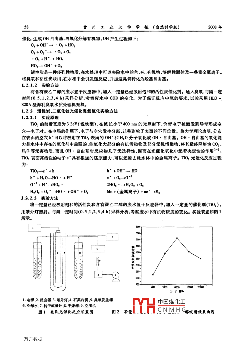 第37卷第3期貴州工業(yè)大學(xué)學(xué)報(bào)(自然科學(xué)版)Vol 37 No. 3008年5月JOURNAL OF GUIZHOU UNIVERSITY OF TECHNOLOGYMay.2008文章編號(hào):1009-0193(2008)03-0057-04臭氧氧化處理聚乙二醇的研究陳璐(貴州師范大學(xué)材建工程學(xué)院,貴州貴陽(yáng)550014)摘要:系統(tǒng)地研究了夾氧氧化處理水中難降解有機(jī)化合物聚乙二醇的方法及效果,分別選用了臭氧,O3/活性炭和TiO2/UV/o3/活性炭復(fù)合處理的方法,結(jié)罘表明,TiO2/UV/O3/活性炭復(fù)合處理聚乙二醇得到最好效果。關(guān)鍵詞:臭氧氧化;聚乙二醇;光催化氧化;COD中圖分類號(hào):TQ09文獻(xiàn)標(biāo)識(shí)碼:A0前言臭氧具有極強(qiáng)的氧化性,臭氧氧化及與此有關(guān)深度氧化處理工藝,如臭氧/紫外線,在廢水處理中有廣闊的前景。臭氧是一種強(qiáng)氧化劑,它能與許多有機(jī)物質(zhì)發(fā)生反應(yīng),其氧化作用機(jī)理目前尚無(wú)肯定的研究結(jié)論通常認(rèn)為主要來(lái)自臭氧離解的·OH自由基,它是發(fā)生在水中的已知氧化劑中最活潑的氧化劑,它很容易通過(guò)基型反應(yīng)將各種類型的有機(jī)物氧化?!H自由基還可與其他物質(zhì)如苯衍生物等形成二次氧化基(R")它還能將碳酸鹽或重碳酸鹽離子氧化成可起三次氧化劑作用的碳酸根(CO3)或重碳酸根(HCO3),臭氧分子可離解成過(guò)氧化物離子(HO2-CO2)的過(guò)羥基。聚乙二醇又名聚乙烯二醇或聚氧乙烯二醇,是一種不同聚合度的混合物。由于聚合度的不同,會(huì)產(chǎn)生性質(zhì)用途上的差別。目前常見的聚乙二醇有PEG-200PEG-400、PEC600、PEC40000PEC6000等。般來(lái)說(shuō)聚乙二醇化學(xué)性質(zhì)比較穩(wěn)定,無(wú)臭或味微臭,具有吸濕性,絕大多數(shù)都易溶于水。本類物質(zhì)可溶于乙醇、丙酮、氯仿等多數(shù)有機(jī)溶媒。本類物質(zhì)通常情況下不活潑、不水解、耐熱。在室溫條件下,分子量在700以下的聚乙二醇類通常為無(wú)色或幾乎無(wú)色的透明澄清稠液體,分子量在2000以上時(shí),室溫下為固體。聚乙二醇水溶液pH值呈微酸性或中性室內(nèi)實(shí)驗(yàn)表明,聚乙二醇在水中發(fā)生強(qiáng)烈吸附,并形成兩層或更多有序?qū)?。分子量?00以上的PEG均具有良好的可結(jié)晶性能2。以下就臭氧在處理溶解于水中的分子量分別為200,1000,600,1000,000的聚乙二醇的問(wèn)題進(jìn)行研究。1實(shí)驗(yàn)方法11實(shí)驗(yàn)材料及儀器1.1.1實(shí)驗(yàn)材料分別采用分子量為200、1000600010000000的聚乙二醇配置COD約為1000mgL的模擬廢水,催化劑選用了 Degussa P25納米級(jí)的銳鈦礦型二氧化鈦和30-80目的活性炭,實(shí)驗(yàn)用水為蒸餾水1.1.2實(shí)驗(yàn)儀器cY-1型多功能光化學(xué)儀,HI0-820A型臭氧水質(zhì)處理機(jī),LZB-4型玻璃轉(zhuǎn)子流量計(jì)。12實(shí)驗(yàn)方法12.1活性炭、臭氧氧化實(shí)驗(yàn)方法12.1.1實(shí)驗(yàn)原理往水中投加臭氧,其強(qiáng)氧化性使有機(jī)物分子斷鏈成小分V中國(guó)煤化工的途徑通過(guò)OHCNMHG收稿日期:2008-03-19作者簡(jiǎn)介:陳璐(1983-),女貴州畢節(jié)人,助教研究方向:水污染控制技術(shù)貴州工業(yè)大學(xué)學(xué)報(bào)(自然科學(xué)版)2008年催化,生成OH自由基,再氧化分解有機(jī)物,OH產(chǎn)生過(guò)程如下:O,+OH02+HO03+O2O3+H→HO3HO3→OH+O2活性炭是一種多孔性物質(zhì)在水處理中可以去除水中的色、味、有機(jī)物溶解性固體及一些重金屬離子。將臭氧和活性炭聯(lián)用,在水相中會(huì)引發(fā)鏈反應(yīng),并加速臭氧轉(zhuǎn)化為羥基自由基。12.1.2實(shí)驗(yàn)方法將含有聚乙二醇的廢水置于反應(yīng)器中,加入一定量已經(jīng)吸附飽和的活性炭催化劑。通入臭氧每隔一定時(shí)間(0.5,1,2,3,4h)采樣分析,考察廢水中COD的變化。為了保證反應(yīng)中氧的要求,試驗(yàn)采用HLO-820A型海利臭氧水質(zhì)處理機(jī)充氧12.2活性炭、二氧化鈦光催化臭氧氧化實(shí)驗(yàn)方法12.2.1實(shí)驗(yàn)原理TO2的禁帶寬度為32ev(銳鈦型),在波長(zhǎng)小于400mm的光照射下,價(jià)帶電子被激發(fā)到導(dǎo)帶形成空穴一電子對(duì)。在電場(chǎng)的作用下,電子與空穴發(fā)生分離遷移到粒子表面的不同位置。熱力學(xué)理論表明,分布在表面的空穴h可以將吸附在TO2表面的OH和H2O分子氧化成OH·自由基。OH·自由基的氧化能力是水體中存在的氧化劑中最強(qiáng)的,能氧化大部分的有機(jī)污染物及部分無(wú)機(jī)污染物,將其最終降解為CO2、H2O等無(wú)害物質(zhì)而且OH·自由基對(duì)反應(yīng)物幾乎無(wú)選擇性,因而在光催化氧化中起著決定性的作用。TO2表面高活性的電子e具有很強(qiáng)的還原能力,可以還原去除水體中的金屬離子。TO2光催化反應(yīng)過(guò)程為TiO + e +hh+OH→Hoh+H2O→Ho·+He^+O2→0-22HO2·→H2O2+O2H2O2+O2→H0·+OH+O2Mn+(金屬離子)+ne→M12.2.2實(shí)驗(yàn)方法將一定量已經(jīng)吸附飽和的活性炭和含有聚乙二醇的廢水置于反應(yīng)器中,加入一定量的催化劑(TO2),用紫外燈照射。每隔一定時(shí)間(0.5,1,2,3,4h)采樣分析,考察廢水中有機(jī)物濃度的變化。實(shí)驗(yàn)裝置如圖1所示。分子量如1.電源;2.反應(yīng)器3紫外燈;4.石英冷阱;5.臭氧發(fā)生器中國(guó)煤化工6冷卻水;7轉(zhuǎn)子流量計(jì);8.干燥器;9空壓機(jī)圖1夾氧光催化反應(yīng)裝置圖圖2等量CNMHO吸附效果曲線陳