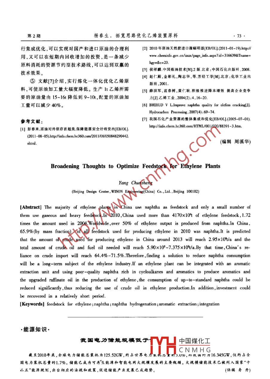 第17卷第2期中外能源2012年2月SINO-GLOBAL ENERGY《煉油與化工技術(shù)拓寬思路優(yōu)化乙烯裝置原料楊春生(惠生工程(中國)有限公司北京設(shè)計中心,北京100102)摘要我國乙烯工業(yè)基本以石腦油為原料,氣體原料和重質(zhì)原料較少。2010年我國乙烯原料的消耗量已達(dá)到4170x10以上,是2004年原料消耗量的1.72倍。世界范陽內(nèi),50%以上的乙烯產(chǎn)能是用石腦油生產(chǎn)的。我國2010年石胸油占乙.烯原料的比例為65.9%(質(zhì)量分?jǐn)?shù))。據(jù)估算預(yù)測,2013年前后我國用于生產(chǎn)乙烯的原油為2.95x10V/a,包括燃料油在內(nèi)的原油需求量將達(dá)到5.90x10*-7.375x10+/a,屆時原油對外依存度達(dá)到64.4%-71.5%。為此,如何減少石腦油的消耗,將是乙烯工業(yè)的長期課題。如果把乙烯裝置和芳烴抽提裝置集成起來.把高含環(huán)烷烴和芳烴的劣質(zhì)石腦油用于生產(chǎn)芳烴,性質(zhì)改善后的芳烴抽余油用于生產(chǎn)乙婚,揚(yáng)長避短,物盡其用,可以顯著踱少合格石腦油的消耗量.減少生產(chǎn)乙烯的原油用量,并具有良好的投資回收期。關(guān)鍵詞乙烯原料 石腦油石腦油加氫芳烴抽提集成1前盲由表1可見,2010年乙烯原料的消耗量已達(dá)我國乙烯工業(yè)基本以石腦油為原料,氣體原料4170x10t以上,是2004年原料消耗量的1.72 倍。和重質(zhì)原料較少。石油烴經(jīng)蒸汽裂解生產(chǎn)的三烯、表中2008年以后的原料單耗有所下降,應(yīng)該三苯是三大合成材料及有機(jī)化工產(chǎn)品的基礎(chǔ)原料。是各廠“優(yōu)化操作、節(jié)能降耗降低乙烯損失率”的根據(jù)全國乙烯行業(yè)協(xié)會的統(tǒng)計,到2010年底,我國結(jié)果,也是尋找輕質(zhì)原料、回收FCC干氣中的乙烯共有乙烯裝置27套(含合資企業(yè)),總生產(chǎn)能力和輕烴的結(jié)果。但就石腦油裂解來說,基本可以認(rèn)1469.5x101/a。如果加上沈陽蠟化公司的重油催化為原料的單耗為3.2t/t 乙烯左右。裂解(CPP)裝置13.5x104/a和包頭煤制烯烴(MTO)2.2我國2012~2013年將投產(chǎn)和改擴(kuò)建的乙烯項(xiàng)目裝置的30x104/a 乙烯能力,則全國共有乙烯生產(chǎn)我國目前正在建設(shè)或即將啟動改擴(kuò)建并將于能力1513x10*/a。 2010 年全國乙烯的實(shí)際產(chǎn)量為2012~2013年投產(chǎn)的乙烯項(xiàng)目見表2。即近期將新1422.2x10*(含合資企業(yè))。增乙烯生產(chǎn)能力330x10*/a,加上2010年底1469.5x本文重點(diǎn)討論石油烴蒸汽裂解生產(chǎn)乙烯的原10t/a石油烴裂解生產(chǎn)能力,到2013年后我國蒸汽料問題及其優(yōu)化設(shè)想。裂解的乙烯產(chǎn)能將達(dá)到1799.5x10*/a。按原料單耗2原料來源困擾乙烯工業(yè)的發(fā)展3.21/t 乙烯計算,屆時我國將需要蒸汽裂解原料2.1我國2005~2010年乙烯產(chǎn)量與原料消耗量5758.4x10t/a。根據(jù)行業(yè)協(xié)會的統(tǒng)計,我國2005-2010年乙烯2.3石腦油占乙烯原料的比例的產(chǎn)量、原料消耗量等數(shù)據(jù)見表1。就世界范圍來說,50%以上的乙烯產(chǎn)能是用石表1我國2005- 2010年乙烯的產(chǎn)量與原料消耗量年份乙烯產(chǎn)量/原料消耗量/原料單耗/(:+)備注2005 7539152 242522553.22含合資企業(yè)本文作者系本刊學(xué)術(shù)指導(dǎo)委員會委員。2006 8522902 276244823.23不含惠州乙烯作者中國煤化工年畢業(yè)于天津大學(xué)化工2007 9447759 303364403.21同上MHCNMH C*期從事化工和石油化2008 9157267 29094093.18工裝置的設(shè)計工作,1986年后主要從事乙烯裝置的設(shè)計工作和2009 9736141 307859103.16項(xiàng)目的前期工作,在《乙烯工業(yè))、《中外能源》等刊物上發(fā)表多2010 13278340 41703532篇學(xué)術(shù)論文。E-mail :yangchunshengl@wison.com中外能源SINO-GLOBAL ENERGY2012年第17卷腦油生產(chǎn)的,如2005年世界乙烯原料構(gòu)成中,石腦據(jù)統(tǒng)計數(shù)據(jù),我國所用的石腦油原料占全部乙.油占53%。烯原料的比例見表3。表2我國2012~2013年即將投產(chǎn)或改擴(kuò)建的乙烯項(xiàng)目名設(shè)計規(guī)模(109進(jìn)展?fàn)顩r備注撫順大乙烯80(新建)包括PE、PP、汽油加氫、苯抽提等8套裝置,2012年投產(chǎn)中石油集團(tuán)四川大乙烯包括PE、PP、合成橡膠、EO/EC 等9套裝置,2012年投產(chǎn)大慶乙烯改擴(kuò)建60(新建)包括PE.PP、汽油加氫、芳烴抽提等裝置,2012年投產(chǎn)武漢大乙烯包括PE、PP、EO/EG等9套裝置,2013年投產(chǎn)中石化與韓國SK集團(tuán)合資福建乙烯改擴(kuò)建30(新建)乙烯產(chǎn)能由80x10t/a提高到110x10v/a,2013年底投產(chǎn)中石 化與??松梨?沙特阿美合資表3我國石腦油占乙烯原料的比例%(質(zhì)量分?jǐn)?shù))年1月1日起至2010年12月31日止,把進(jìn)口石年份2000年2005年 2006年 2009年 2010年腦油的關(guān)稅下調(diào)至1%,并對進(jìn)口和國產(chǎn)的用作乙比例61.765.866.165.烯、芳烴類產(chǎn)品原料的石腦油免征消費(fèi)稅。由此可我國乙烯的其他裂解原料為輕柴油,加氫尾見國家是鼓勵石腦油進(jìn)口的。油,抽余油,輕烴C2、C.C4等??梢越普J(rèn)為,我國據(jù)文獻(xiàn)[1]報導(dǎo),中國工程院研究報告認(rèn)為,我石腦油原料的比例為66%。國的石油對外依存度不宜超過60%。地緣政治變2.4我國原油進(jìn)口k預(yù)測化、自然災(zāi)害等,都會對能源供應(yīng)帶來不利影響。對目前我國60%左右的原油用于汽油、煤油、柴外依存度過高會危及國家的經(jīng)濟(jì)