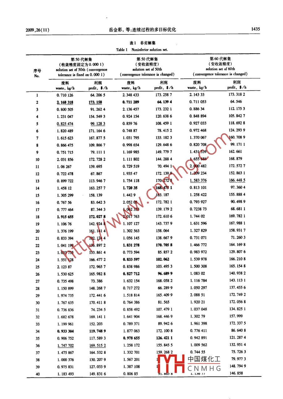 第26卷第11期計(jì)算機(jī)與應(yīng)用化學(xué)Vol. 26, No, 112009年11月28日Computers and Applied ChemistryNovember, 2009連續(xù)過程的多目標(biāo)優(yōu)化岳金彩"2,程華農(nóng)”,楊霞’,鄭世清”,韓方煜^(1.華南理工大學(xué)化工與能源學(xué)院,廣東,廣州, 510640; 2.青島科技大學(xué)計(jì)算機(jī)與化工研究所,山東,青島,266042)摘要:在模塊環(huán)境( Aspen PIlus)下,建立了基于多目標(biāo)遺傳算法NSCA- I求解多目標(biāo)優(yōu)化問題的系統(tǒng)結(jié)構(gòu),并對(duì)含循環(huán)物流的連續(xù)過程廢料最小化問題進(jìn)行求解。在求解過程中遭傳算法需要反復(fù)調(diào)用流程模擬,而流程中循環(huán)物流的迭代收斂使優(yōu)化計(jì)算效率較低。為減少流程迭代次數(shù)本文提出2個(gè)加速策略:一是變收斂精度策略,在優(yōu)化計(jì)算初始階段,使流程在較低精度下收斂,快速淘汰劣點(diǎn),隨著優(yōu)化的進(jìn)行,將流程收斂精度逐步提高,得到高質(zhì)量的非劣解;二是循環(huán)流初值策略,利用已有的計(jì)算值,回歸決策變量與循環(huán)流變量的對(duì)應(yīng)關(guān)系,改善循環(huán)流初值。實(shí)例結(jié)果表明,加速策略減少了一半左右的流程迭代次數(shù),效率提高50% ,本文提出的求解多目標(biāo)問題的方法能方便地得到問題的Pareto最優(yōu)解集,可應(yīng)用于- -般連續(xù)化I過程的多目標(biāo)優(yōu)化。關(guān)鍵詞: NSGA-I;模塊環(huán)境;多目標(biāo)優(yōu)化;連續(xù)過程中圖分類號(hào): TQ028; TQ015.9; 0 6-39文獻(xiàn)標(biāo)識(shí)碼: A文章編號(hào): 1001-4160(2009)11-1433-14371引言的處理方法[5-14] ,但遺傳算法需要反復(fù)大量計(jì)算目標(biāo)函數(shù),過程工業(yè)在改善人類衣食住行的同時(shí),也大最消耗著資特別是當(dāng)流程存在循環(huán)流時(shí),絕大部分機(jī)時(shí)消耗在流程收斂源、能源并產(chǎn)生污染。21世紀(jì)的過程工業(yè)正面臨由可持續(xù)上,效率較低。本文在模塊環(huán)境下( Aspen Plus) 應(yīng)用NSCA-發(fā)展要求,特別是環(huán)境保護(hù)帶來的一系列嚴(yán)重挑戰(zhàn)。過程工l對(duì)連續(xù)流程的多目標(biāo)優(yōu)化進(jìn)行研究,針對(duì)循環(huán)流的收斂提出兩種加速策略,取得了很好的效果。業(yè)的經(jīng)營(yíng)目標(biāo)不再僅僅局限于經(jīng)濟(jì)利益的最大化,而是資源節(jié)約、環(huán)境友好和經(jīng)濟(jì)效益等多個(gè)目標(biāo)的最優(yōu)化。多目標(biāo)2系統(tǒng)結(jié)構(gòu)及加速策略優(yōu)化要同時(shí)優(yōu)化多個(gè)可能相互沖突的目標(biāo)函數(shù),因而有一個(gè)Aspen Plus用戶界面是-一個(gè)ActiveX服務(wù)器應(yīng)用程序,非劣解集,又稱Pareto解集。多目標(biāo)優(yōu)化問題有2種處理策略,一種是先轉(zhuǎn)化為單目利用接口程序能把Aspen Plus所模擬過程的輸人輸出與其標(biāo)問題,再用各種單目標(biāo)優(yōu)化方法求出非劣解集['2 ,這需要它一些應(yīng)用程序如優(yōu)化算法連接起來,實(shí)現(xiàn)軟件集成[15-16]。接口程序一般用Visual Basic( VB)語言設(shè)計(jì),通過VB編程多次構(gòu)造目標(biāo)函數(shù)并求解,比較繁瑣,而且隨著目標(biāo)函數(shù)的環(huán)境可直接操作Aspen Plus提供的對(duì)象,并使用它們的屬增加,計(jì)算量呈指數(shù)增長(zhǎng)。另一種策略是直接求解,最常用性、方法和事件,實(shí)現(xiàn)Aspen Plus的功能。的算法是多目標(biāo)遺傳算法( MOGA) ,已開發(fā)多種算法[)) ,如:本文將NSGA-II與Aspen Plus集成,用于過程的多目標(biāo)NSCA[4] ,NPCA[5] , SPEA(6] , NSCA-I7]等。MOGA計(jì)算量?jī)?yōu)化。Aspen Plus作為模擬器用于計(jì)算NSCA-II 中每一個(gè)較大,但算法簡(jiǎn)單。體所代表的工況。個(gè)體中包含的優(yōu)化變量及Aspen Plus的近十幾年人們對(duì)遺傳算法求解化工過程多目標(biāo)問題進(jìn)計(jì)算結(jié)果和信息(包括是否收斂,迭代次數(shù),收斂精度等)都行了一些研究。Gupal8-1] 等人應(yīng)用NSGA先后對(duì)T.業(yè)反應(yīng)通過接口進(jìn)行傳遞。系統(tǒng)結(jié)構(gòu)如圖1所示。器分離器和過程流程等進(jìn)行了設(shè)計(jì)優(yōu)化和操作優(yōu)化研究,遺傳算法計(jì)算個(gè)體的適應(yīng)值時(shí),需要反復(fù)調(diào)用Aspen與常規(guī)優(yōu)化方法的對(duì)照研究表明利用NSGA求解多目標(biāo)優(yōu)Plus。提高Aspen Plus的計(jì)算效率非常重要。對(duì)于有循環(huán)流化問題具有- -定優(yōu)勢(shì)。Amyl2] 等人應(yīng)用NSGA對(duì)苯乙烯反的連續(xù)過程,本文提出2種策略以減少流程迭代次數(shù)。應(yīng)器進(jìn)行了3個(gè)目標(biāo)的優(yōu)化。以上研究的問題模型比較簡(jiǎn)計(jì)算開始時(shí)遺傳算法的個(gè)體是隨機(jī)產(chǎn)生的,經(jīng)過各代優(yōu)單,過程模型多是基于方程的。對(duì)復(fù)雜大系統(tǒng)的研究還很不化,逐步向Pareto前沿道近。在計(jì)算初期,非劣解的數(shù)不充分,難以指導(dǎo)實(shí)際化工過程的優(yōu)化和設(shè)計(jì)。若使用嚴(yán)格熱多,各個(gè)體離Pareto前沿還較遠(yuǎn),流程迭代沒有必要以高精力學(xué)、動(dòng)力學(xué)模型又會(huì)導(dǎo)致問題過于復(fù)雜,難以收斂。將過度收中國(guó)煤化工t模擬計(jì)算量,可迅速程看作黑箱,使用成熟的模擬器簡(jiǎn)化優(