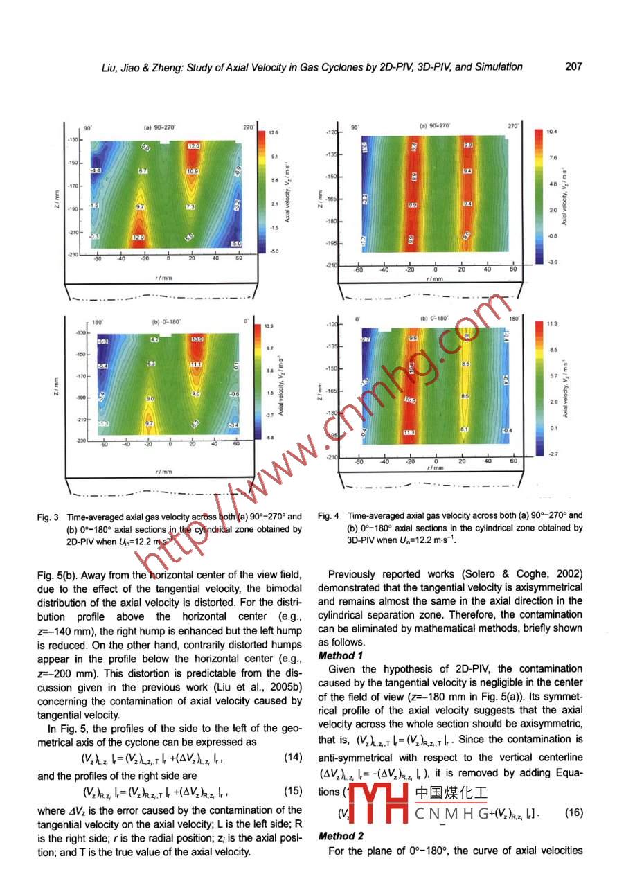 CHINA PARTICUOLOGY Vol 4. Nos 3-4. 204-210.2006STUDY OF AXIAL VELOCITY IN GAS CYCLONES BY 2D-PIV3D-PIV AND SIMULATIONZhengliang Liu, Jinyu Jiao and Ying ZhengDepartment of Chemical Engineering, University of New Brunswick15 Dineen Drive, P.O. Box 4400. Fredericton, NB. Canada E38 5A3. CanadaAuthor to whom correspondence should be addressed. Tel: 001-506-473329, E-mail: yzheng@unb.caAbstract The axial velocity distribution in a gas cyclone has been examined with two-dimensional particle imagevelocimetry(2D-PIV) and three-dimensional particle image velocimetry(3D-PIv) experiments in this study. due to theregistered in the axial velocity detected by 2D-PIV Efficient methods are proposed in this work to remove this contami-nation. The contamination-removed 2D-PIV data agree well with 3D-PIV results. The distributions of the axial velocity arealso computed by the Reynolds stress model(RSM)and verified using the PIv experimental results. Reasonableagreements are obtainedKeywords particle image velocimetry(PIV), numerical simulationelocity, cyclone separatorsIntroductionthis work, the axial velocity in a gas cyclone is studiedboth experimentally and numerically. Both two-dimensionalGas cyclones have been widely used as(2D)and three dimensional(3D )PIVs are used to measureseparators in the petrochemical and process itthe axial velocities. The contamination induced by thesince a centurury ago. The fiow pattems in gas cyclotangential velocity in the 2D-PIV measurements is re-of importance to their performance, and extensive research moved by mathematical methods. The contamina-has been caried out by experimental approaches and tion-removed results are compared with the experimentnumerical simulations. The experimental techniques for data obtained by 3D-PIV. The simulation results are veriobserving flow fields have been advanced from Pitot tubes fied using the experimental dataand hot-wire anemometers( HWA)to non-intrusive tech-niques such as laser Doppler anemometry(LDA)(Solero 2. Experimental Setup and MeasurementCoghe, 2002; Peng et al., 2002; Obermair et al. 2003; Huet al., 2005). However, all these aforementioned tech-Methodsniques have the common limitation that they make one- A schematic diagram of the experimental apparatus ispoint measurement for one test On the other hand, particle depicted in Fig. 1, where the cyclone was made of pleximage velocimetry(PIv) which can detect the whole-field glass. The detailed structure and dimensions(units in mmvelocity at the same time has been extensively used in of the cyclone are respectively shown in Fig. 2 and listed inrecent years( Stanislas et al., 2003; Liu et aL., 2005a).Table 1. Air stream was introduced to the cyclone tangenSince the flow field in an industrial cyclone was first tially through a scroll type inlet by a regenerative blowersimulated by Boysan et al. in 1982, numerical simulations (Gast R6150J-2)with a capacity of 365 m h-1.The inlethave attracted significant attention(HanjaliC, 1994; Meier& airflow rate being measured by a digital Pitot tube( KimoMori, 1999; Ma et al., 2000). In the field of modeling a con- AMI KS300)was controlled by a throttle valve and a byfined swirling flow, an important issue is how to accurately pass valve. the inlet air velocity ranged from 7.2 todescribe the turbulence behavior of the flow a number of 15.0.s", The pressure drop through the cyclone wasturbulence models are available, such as the standard k-e determined by a u-tube manometer. Detailed operatingmodel,the RNG. K-E model, and the Reynolds stress conditions are listed in Table 2. Tiny sugar particles(den-model(RSM)(Zhou, 1993). Hoekstra et al. (1999)evalu- sity: 1.58x10 kg m, refractive index: 1.54)of about 0.8ated the performance of these three turbulent closure microns in diameter were used as tracer particles, and theymodels with experimental results and reported that the were generated in a six-jet atomizer(TSI 9306A)by atom-RSM yields better prediction of the mean flow field in gascyclones. The RSM model involves the calculation of indi-izing a 5 wt% sugar solution. Experimental measurementsvidual Reynolds stresses using differential transport equa- tionswere performed across both0°-180°and90-270°sec中國煤化工 paration zonesnolds-averaged momentum equations. It has also been trace-nents First of all, theCN MHGy follow the centrifugaldocumented(Hu et al., 2005)that the results predicted by airflow. to determine the ability of tracer particles followingthe RSM model were in reasonable agreement with ex- the fluid and the speed at which the seed particles respondperimental dataLiu, Jiao& Zheng: Study of Axial Velocity in Gas Cyclones by 2D-P/V, 3D-P/, and Simulation1 Air filter, 2 Regenerative blower, 3 Bypass valve, 4 Throttle valve, 5 Atomizer, 6 Pitot tube, 7U-tube manometer, 8 Cyclone,9 Lightsheet optics, 10 Dual YAG laser, 11 Laser controller, 12 CCD cameras, 13 Synchronizer, 14 Computer systemFig. 1 Schematic diagram of the experimental apparatus and Piv systemto theusually introduced. It is defined asSttp/tgwhere tp is the characteristic time of tracer particles or180 velocity response time, and tg is the characteristic time ofthe vortex field4=2p+q2)d42136pd218(orp