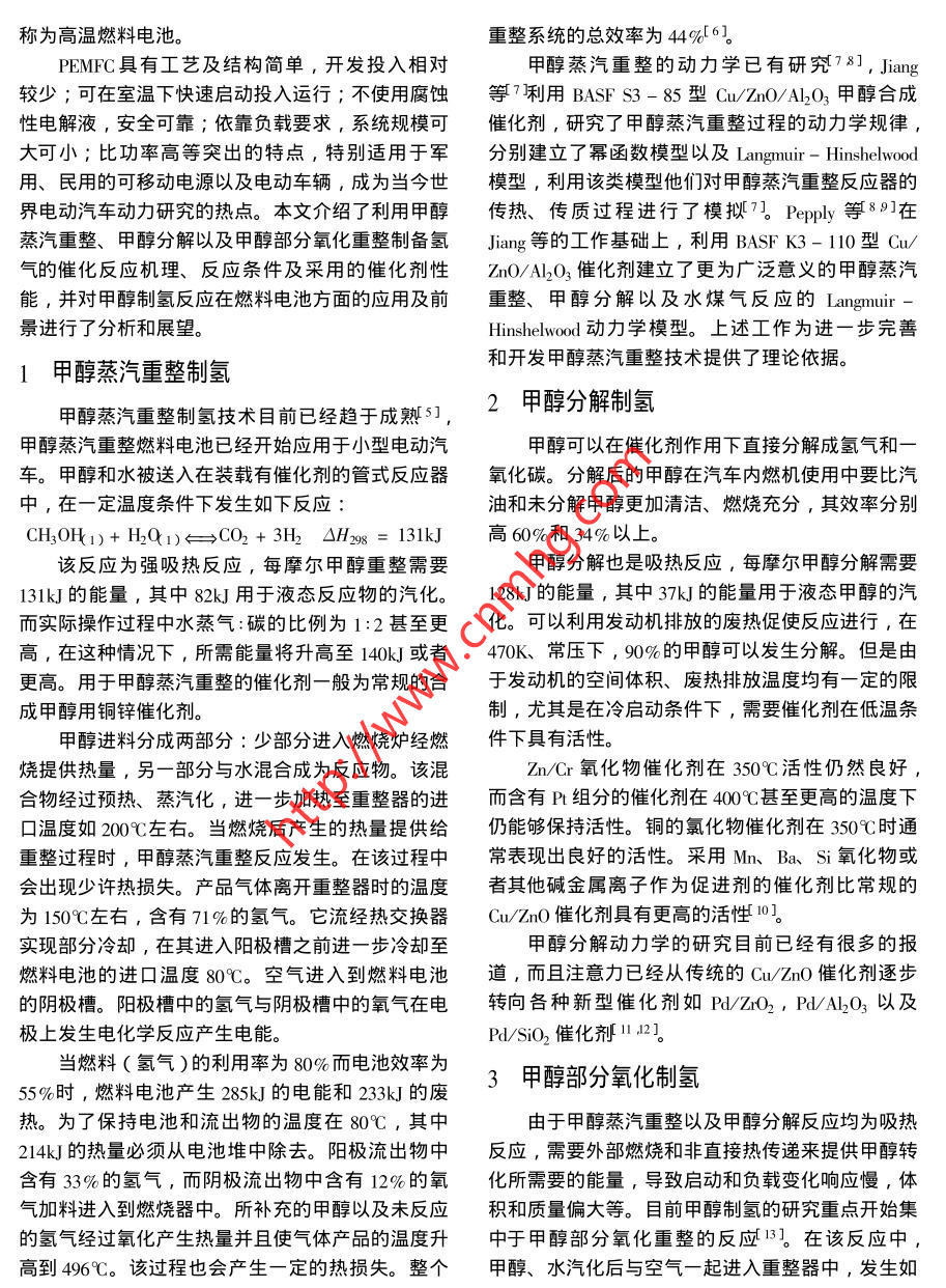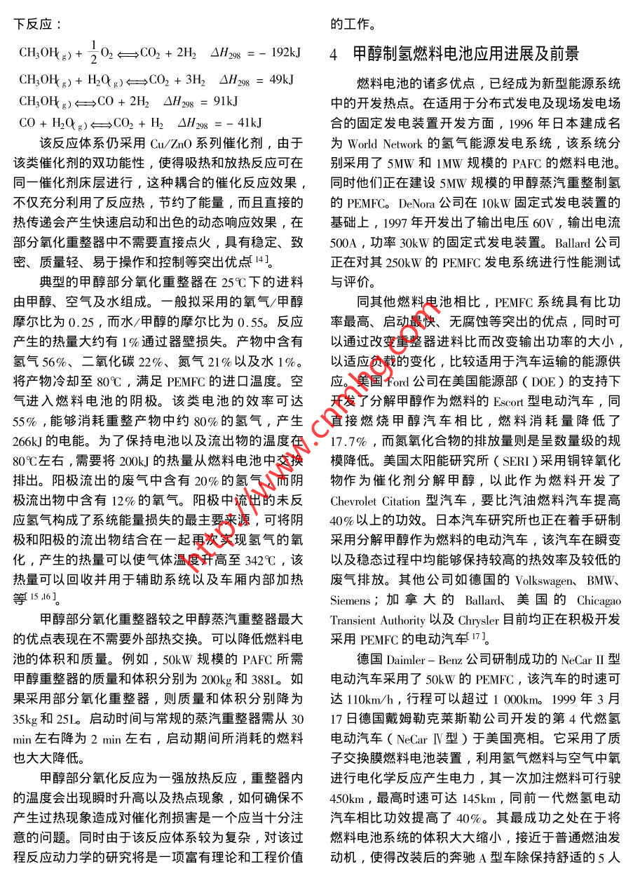 開發(fā)5司應(yīng)用Development and Application甲醇制氫的燃料電池技術(shù)及應(yīng)用*蔣元力林美淑金東 顯(慶北國(guó)立大學(xué)化學(xué)工程系,韓國(guó)大邱702-701 )提要以質(zhì)子交換膜燃料電池為例,介紹了甲醇蒸汽重整、甲醇分解以及甲醇部分氧化重整制氫為燃料電池提供燃料的催化反應(yīng)機(jī)理、反應(yīng)條件、催化劑性能等,并提出了甲醇制氫的質(zhì)子交換膜燃料電池的優(yōu)越性及應(yīng)用前景。關(guān)鍵詞甲醇蒸汽重整 ,甲醇分解,甲醇部分氧化重整,燃料電池隨著世界石油儲(chǔ)量的持續(xù)減少, 地球生態(tài)環(huán)境氫時(shí)發(fā)生吸熱反應(yīng),為了保證在-定的速率下將貯不斷惡化,能源和環(huán)境問題已經(jīng)成為制約各國(guó)經(jīng)濟(jì)存的氫氣全部釋放出來,需要不斷地向貯氫器提供持續(xù)發(fā)展的重要因素,因此世界-些國(guó)家加大了燃所需要的熱能。鑒于氫氣的儲(chǔ)存和運(yùn)輸?shù)睦щy,對(duì)料電池的開發(fā)力度。于大功率的燃料電池系統(tǒng),采用富氫燃料如甲醇等燃料電池是-種將燃料和氧化劑之間的化學(xué)能進(jìn)行現(xiàn)場(chǎng)轉(zhuǎn)化的方法制備氫氣,很有前景21。持續(xù)轉(zhuǎn)化為電能而電極-電解質(zhì)體系基本保持不變與天然氣、輕烴蒸汽轉(zhuǎn)化制氫或水煤氣制氫相的系統(tǒng)。該系統(tǒng)具有能量轉(zhuǎn)化效率高、污染排放比,甲醇蒸汽轉(zhuǎn)化制氫具有投資省、能耗低等特低、模塊式結(jié)構(gòu)、動(dòng)態(tài)響應(yīng)迅速等突出的優(yōu)點(diǎn)。燃點(diǎn)。前者需要800°C以上的高溫,轉(zhuǎn)化爐等設(shè)備需料電池采用的燃料主要有氫氣、天然氣、甲醇等。要特殊材料,同時(shí)需要綜合考慮能量的平衡及利目前出現(xiàn)的直接甲醇燃料電池(DMFC)技術(shù),由用,不適合小規(guī)模制氫。而甲醇蒸汽轉(zhuǎn)化制備氫氣于存在甲醇在電極間滲透容易造成電池性能下降以的反應(yīng)溫度低( 260~ 280°C) , 工藝條件緩和、能及在陽極未能氧化完全的少量甲醇在尾氣中排放等耗約為前者的50%[3A]。甲醇還具有宜于攜帶運(yùn)現(xiàn)象,使得其使用范圍受到了限制1。同常規(guī)的烴輸、可以像汽油-樣加注等優(yōu)點(diǎn)。因此研究甲醇轉(zhuǎn)類燃料相比,氫氣燃料電池系統(tǒng)的一個(gè)顯著優(yōu)點(diǎn)就化氫氣已經(jīng)成為該領(lǐng)域的研究熱點(diǎn)??刹捎?種過是其不產(chǎn)生二氧化碳、- -氧化碳、未燃燒的烴、鉛程將甲醇轉(zhuǎn)化成氫氣:甲醇蒸汽重整;甲醇分解;以及硫污染物。甲醇部分氧化重整。另外,由于使用的是氣體氫氣燃料,不存在燃目前采用甲醇現(xiàn)場(chǎng)制氫的燃料電池的種類較料霧化以及蒸發(fā)的問題。平均來說,氫氣車輛要比多,按照使用的電解質(zhì)種類主要有磷酸燃料電池汽油車輛的效率高22%。因此,燃料電池多采用( Phosphoric Acid Fuel Cells , PAFC)、質(zhì)子交換膜燃?xì)錃庾鳛槿剂?。為了確保燃料電池發(fā)電系統(tǒng)的正常料電池( Proton Exchange Membrane Fuel Cells ,運(yùn)行,首先要求解決的是氫氣燃料安全儲(chǔ)存與穩(wěn)定PEMFC)、堿性燃料電池( Alkaline Fuel Cell , AFC )供給的問題。小功率的可移動(dòng)電源采用金屬氫化物等,上述燃料電池工作溫度不高于200°C ,稱為低儲(chǔ)存氫氣,但是由于金屬氫化物的貯氫密度不夠溫燃料電池;而熔融型碳酸鹽燃料電池(Molten高,導(dǎo)致金屬貯氫器體積和質(zhì)量較大,限制了其在Carbonate Fuel Cells , MCFC )、固體氧化物燃料電池大功率發(fā)電系統(tǒng)中的應(yīng)用。而且由于金屬氫化物放( Solid Oxide Fuel Cells , SOFC )工作溫度高于650°C,. 該項(xiàng)目由韓國(guó)Ressearch Institute of Industrial Technology , Kyungpook National University贊助。34 2001年第7期化工進(jìn)展.稱為高溫燃料電池。重整系統(tǒng)的總效率為44%[6]。PEMFC具有工藝及結(jié)構(gòu)簡(jiǎn)單,開發(fā)投入相對(duì)甲醇蒸汽重整的動(dòng)力學(xué)已有研究78] , Jiang較少;可在室溫下快速啟動(dòng)投入運(yùn)行;不使用腐蝕等7利用BASF S3- 85型Cu/ZnO/Al2O3甲醇合成性電解液,安全可靠;依靠負(fù)載要求,系統(tǒng)規(guī)??纱呋瘎?研究了甲醇蒸汽重整過程的動(dòng)力學(xué)規(guī)律,大可小;比功率高等突出的特點(diǎn),特別適用于軍分別建立了冪函數(shù)模型以及Langmuir-Hinshelwood用、民用的可移動(dòng)電源以及電動(dòng)車輛,成為當(dāng)今世模型,利用該類模型他們對(duì)甲醇蒸汽重整反應(yīng)器的界電動(dòng)汽車動(dòng)力研究的熱點(diǎn)。本文介紹了利用甲醇傳熱、傳質(zhì)過程進(jìn)行了模擬7。Pepply 等89]在蒸汽重整、甲醇分解以及甲醇部分氧化重整制備氫Jjang等的工作基礎(chǔ)上,利用BASF K3- 110型Cu/氣的催化反應(yīng)機(jī)理、反應(yīng)條件及采用的催化劑性ZnO/Al2O3催化劑建立了更為廣泛意義的甲醇蒸汽.能,并對(duì)甲醇制氫反應(yīng)在燃料電池方面的應(yīng)用及前重整、甲醇分解以及水煤氣反應(yīng)的Languir -景進(jìn)行了分析和展望。Hinshelwood 動(dòng)力學(xué)模型。上述工作為進(jìn)一步完善和開發(fā)甲醇蒸汽重整技術(shù)提供了理論依據(jù)。1甲 醇蒸汽重整制氫甲醇蒸汽重整制氫技術(shù)目前已經(jīng)趨于成熟[S],2甲醇分解制氫甲醇蒸汽重整燃料電池已經(jīng)開始應(yīng)用于小型