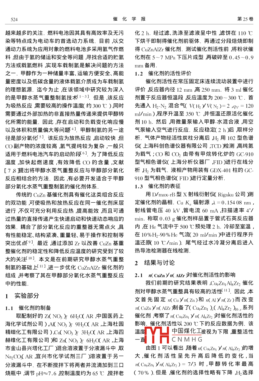 第25卷第7期催化學(xué)報(bào)2004年7月Vol. 25 No. 7Chinese Journal of Catalyst文章編號:0253-983X2004)7-052306研究論文:523-528Cuznalzr催化劑上甲醇氧化水蒸氣重整制氫Ⅰ.催化劑組成的優(yōu)化余立挺,馬建新21華東理工大學(xué)工業(yè)催化研究所,上海200237;2同濟(jì)大學(xué)新能源汽車工程中心,上海200092)摘要:采用共沉淀法制備了不同配比的 CuznaIzr復(fù)合氧化物催化劑并通過XRD和TPR等表征技術(shù)及活性評價(jià)考察了催化劑各組分配比對活性的影響從而對各組分配比進(jìn)行了優(yōu)化.結(jié)果表明組成為CuZn)AlZr4)的催化劑具有最高的催化活性反應(yīng)溫度為200℃時(shí)甲醇轉(zhuǎn)化率可高達(dá)卯1%而重整氣體中CO的體積分?jǐn)?shù)僅為0.12%.具有較高分散性及高還原性能的表相(u組分的增加有利于提高催化劑的活性an可以起到隔離和分散Cu的作用而A和Zr的存在可以穩(wěn)定表相Cu2+的存在形式關(guān)鍵詞:氧化銅,氧化鋅,氧化鋁,氧化鋯,復(fù)合氧化物,甲醇氧化水蒸氣重整中圖分類號:0643文獻(xiàn)標(biāo)識碼:AInvestigation on Oxidative Steam Reforming of Methanolover CuznAIZr catalystI. Optimization of Catalyst FormulationYU Liting, MA Jianxin(1 Institute of Industrial Catalysis East China university of Science and Technology, Shanghai 200237, China2 Clean Energy Automotive Engineering Center, Tongji University Shanghai 200092, ChinaAbstract: Low-temperature steam reforming of methanol is a relevant technique for on-board supply of hydrogenfor fuel-cell vehicles. Recently much attention was paid on oxidative steam reforming of methanol due to itsquick response and auto-thermal properties. This paper deals with the optimization of catalyst formulation ofCuZnAlZr composite oxide system. The catalyst was prepared by co-precipitation from aqueous solutions of CuZn, Al and Zr nitrates and Na2 CO3 (pH=7. 6)at 65 C. The influence of the catalyst composition such as theratios of n( CuZn yn( AIzr), n( Cu yn( Zn )and n(Al yn( Zr), on its catalytic performance for oxidative steam re-forming of methanol to hydrogen was investigated. The optimized composition of the catalyst was( Cu7 Zn3 h(AL). Over this catalyst the methanol conversion reached 91%at 200 C while the co)was only aslow as 0.08%. The dispersion of Cuo species and its occupation on the catalyst surface are the determining factors for the catalyst activity. The component Zn is responsible for the dispersion of Cuo, while the componentsAl and Zr give assistance to stabilize the existence of Cu species on the catalyst surfaceKey words: copper oxide zinc oxide alumina zirconia, composite oxide oxidative steam reforming ofmethane中國煤化工近年來由于大氣污染給環(huán)境帶來的危害日益的主CNMHG車尾氣的同時(shí)通過開嚴(yán)重特別是汽車尾氣的排放已成為城市大氣污染發(fā)新型的電動汽車來根本解決環(huán)境污染問題也受到收稿日期:203-09-22.第一作者:余立挺,男,1978年生,碩士研究生聯(lián)系人:馬建新.Te:(021)5985422;Emil:jama(@fev-sh.com524催化學(xué)報(bào)第25卷越來越多的關(guān)注.燃料電池因其具有高效率及無污化2h.經(jīng)過濾、洗滌至濾液呈中性濾餅在110℃染等特點(diǎn)成為電動車的首選動力系統(tǒng).目前,以交下烘干即制得催化劑前驅(qū)體.再通過分段焙燒即制通動力系統(tǒng)為應(yīng)用對象的燃料電池多采用氬氣作燃得 CuZnalzr催化劑.測試催化劑活性前將粉狀催料但由于氫的儲運(yùn)和安全等問題尋找合適的貯氫化劑在5~7MPa下壓片成型再破碎至0.45~0.9方法或載氫燃料實(shí)現(xiàn)車載制氫是解決問題的方法mm備用.之一.甲醇作為一種儲量豐富、運(yùn)輸方便安全、高能1.2催化劑的活性評價(jià)量密度以及低碳含量的液體載氬介質(zhì)成為車載制氫催化劑活性在常壓固定床連續(xù)流動裝置中進(jìn)行的理想氫源.迄今為止在該領(lǐng)域中研究較為深入評價(jià)反應(yīng)器內(nèi)徑12mm高250mm.將3ml催化的是甲醇水蒸氣重整制氫技術(shù)1-31.但是該反應(yīng)劑置于反應(yīng)器恒溫段反應(yīng)溫度為200~300℃.首為吸熱反應(yīng)需要較高的操作溫度約300℃)同時(shí)先通入H2N2混合氣WH2yWN2)=2,qy=120需要通過外部加熱的非直接熱量傳遞來提供甲醇轉(zhuǎn)m/min)程序升溫至350℃并恒溫還原活化催化化所需的能量.因此存在啟動和負(fù)載變化響應(yīng)慢劑10h.然后用微量泵輸入甲醇-水混合液用空以及體積和質(zhì)量偏大等問題41.甲醇制氫的另一途氣泵輸入空氣進(jìn)行反應(yīng).反應(yīng)穩(wěn)定(2h取樣分徑是部分氧化5].該反應(yīng)為放熱反應(yīng)啟動較快但析.氣體產(chǎn)物經(jīng)活性炭柱分離后H2用102型色譜CO副產(chǎn)物的濃度較高氬氣提純較為復(fù)雜,一般只儀上??苿?chuàng)色譜儀器有限公司,ICD臉測高純氮適用于燃料電池汽車的啟動階段6.為了降低反應(yīng)為載氣;OO和OO由帶有甲烷轉(zhuǎn)化爐的GC910溫度加快起燃速度,有效降低OO的含量,文獻(xiàn)型氣相色譜儀(上海分析儀器廠FI進(jìn)行在線分[78提出將甲醇水蒸氣重整反應(yīng)與甲醇部分氧化析H為載氣.液相產(chǎn)物用裝有GDX-401柱的GC反應(yīng)相結(jié)合的方法.因此有必要開發(fā)適合于甲醇910型氣相色譜儀FID進(jìn)行定量分析部分氧化水蒸氣重整制氫的催化劑體系1.3催化劑的表征傳統(tǒng)的C1Zn基催化劑具有催化這類組合反應(yīng)用D/ max-rB型X射線衍射儀 Rigaku公司測的雙功能可使吸熱和放熱反應(yīng)在同一催化劑床層定催化劑的晶相.CuK。輻射源λ=0.15408mm,進(jì
