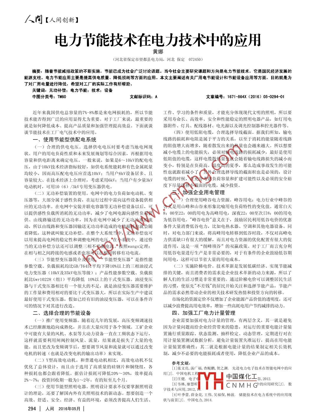 人間[人間創(chuàng)新]電力節(jié)能技術在電力技術中的應用黃娜(河北省保定市望都縣電力局,河北保定072450)摘要:隨著節(jié)能減排政策的不斷實施,節(jié)能已成為社會廣泛討論話題。當今社會主要研究課題和方向是電力節(jié)能技術,它是國民經(jīng)濟發(fā)展的能源支柱。電力節(jié)能應用主要是提高供電質(zhì)量、降低損耗等方面的應用。本文主要闡述有關廠"用電節(jié)能設計和節(jié)能設備應用等方面,目的就是為了對廠用電量進行降低,希望對工廠的實際工作有所幫助。關鍵詞:無功補償:電力節(jié)能:技術:設備中圖分類號: TM60文獻標識碼: A文章編號: 1671-864X (2016) 05- 0294-01近年來我國供電總?cè)萘康?%-8%都是來電網(wǎng)損耗的,所以節(jié)能工作、學習的條件和質(zhì)量,,才能充分體現(xiàn)現(xiàn)代文明的照明,所以要技術能否得到廣泛的應用顯得尤為重要。對于工廠來說,最重要的采用壽命長、 高效率、安全和性能穩(wěn)定的照明電器產(chǎn)品,如燈用電就是如何降低成本、提高產(chǎn)品質(zhì)量和加強管理提高效益。下面就談器附件、 燈具、配線器材、電光源以及調(diào)光控制器和控光器件等。談節(jié)能技術在工廠電氣技術中的應用。(四)使用低阻電纜,合理選擇導線截面。據(jù)我們所知,輸電-、使用節(jié)能型供配電系統(tǒng)線路的損耗和電阻是屬于平方的關系,以至于消耗的能量隨著線路(一)合理的供電電壓。選擇供電電壓時要考慮當?shù)仉娋W(wǎng)現(xiàn)的阻值增 大而增多,隨者散發(fā)出來的熱量也會越來越大。所以想要狀、用戶的用電負荷性質(zhì)和未來發(fā)展規(guī)劃等綜合因素,再根據(jù)用電減小電纜上的電能損失,必須對輸電線路的損耗減少,最好是使用容量和供電距離來確定電壓。一般來說, 如果是6~ 10kV的配電電低阻值的電纜, 這樣電纜散熱量也就會隨著輸電線路損失的減小而壓,由于10kV技術經(jīng)濟指標較好,如供電系統(tǒng)能耗和有色金屬耗量變小,特別是在負荷高、溫度高的夏季,那么造成事故發(fā)生的可能均較小,因而高壓配電電壓應首選10kV;當用戶6kV設備居多、且性也就跟著減小了。另外合理選擇導線的截面積也是必須的,設計容量較大、在技術經(jīng)濟上合理時,考慮采用6kV; 當用戶有少量3kV電纜的時候,在充分考慮負荷容量和擴建可能性以及必須的安全裕電動機時,可用10 (6) /3kV專用變壓器供電。度下盡量選擇小截面的電纜,減少投資。(二)無功補償裝置的使用。電網(wǎng)中的電力負荷如電動機、變?nèi)?、加強企業(yè)用電管理壓器等,大部分屬于感性負荷,在運行過程中需向這些設備提供相(一)合理使用峰谷電力資源。峰谷用電:電力行業(yè)中峰谷的應的無功功率。在電網(wǎng)中安裝并聯(lián)電容器等無功補償設備以后,可含 義是用山峰和山谷來形象比喻用電負荷特性的變化值。通常白天以提供感性負載所消耗的無功功率,減少了電網(wǎng)電源向感性負荷提8: 00至22: 00的用電為高峰用電,深夜22: 00至次日8: 00的用電供、由線路輸送的無功功率,因為在電網(wǎng)中減少了無功功率的流為低谷用電。”峰谷電價”意義在于,鼓勵居民利用低谷電價的優(yōu)惠動,所以由線路和變壓器因輸送無功功率造成的電能損耗也就會隨條 件大量消費低谷電力,比如電熱水器、空調(diào)和其他電器設備。同著降低,這種就叫做無功補償。在整個大系統(tǒng)當中,無功補償也可時,對電力部門來說,將高峰用電轉(zhuǎn)移到低谷時段,不僅對高峰電以用來提高電網(wǎng)的穩(wěn)定性和調(diào)整電網(wǎng)的電壓。在小系統(tǒng)中,通過恰力供需缺口有很大的緩解,而且對電力資源的優(yōu)化配置有很大的促當?shù)臒o功補償方法還可以調(diào)整三相不平衡電流。按照wangs定理:進作用,這是一項“削峰填谷”的雙贏政策。對于工廠-而言充分利在相與相之間跨接的電感或者電容可以在相間轉(zhuǎn)移有功電流。用低谷電量進行生產(chǎn)是非常必要的,對于有條件的企業(yè)鼓勵低谷期(三) 節(jié)能型變壓器簡介及使用?!?節(jié)能型變壓器”是指性能間用電,這樣可以節(jié)省大量的用電成本。參數(shù)空載、負載損耗均比GB/T6451平均下降10%以上的三相油浸式(二)實施階梯電價。技術革新是發(fā)展低碳經(jīng)濟、實現(xiàn)節(jié)能減電力變壓器(10kV及35kV電壓等級);產(chǎn)品性能參數(shù)空載、負載損排的關鍵,而且消費者的需求是企業(yè)技術革新的動力來源,所以了耗比Gwr10228 (組I)平均降低10%以 上的干式變壓器。油浸變壓解 人們的生活習慣是非常重要的。通過階梯電價可以調(diào)整居民生活器與干式變壓器相比有一個很大的不足,就是油浸變壓器需要維護的習慣,使原先”不差錢”的居民開始關注和選擇節(jié)能產(chǎn)品,節(jié)能產(chǎn)的工作量和費用相對的要比干式變壓器大,所以在實際生產(chǎn)中建議品的需求必然帶動企業(yè)的相關技術研發(fā)熱情和投資方向的轉(zhuǎn)移。最好使用干式變壓器,假如已經(jīng)有舊的油浸變壓器,可以在條件許市場化的資源定價不僅增加了企業(yè)能源產(chǎn)品價值的透明度,還可可的情況下對其進行改造。以減少浪費提高用電效率,增加一些高耗電用戶節(jié)約減排的動力。二、選擇合理的節(jié)能設備四、加強工廠電力計量管理(一) 推