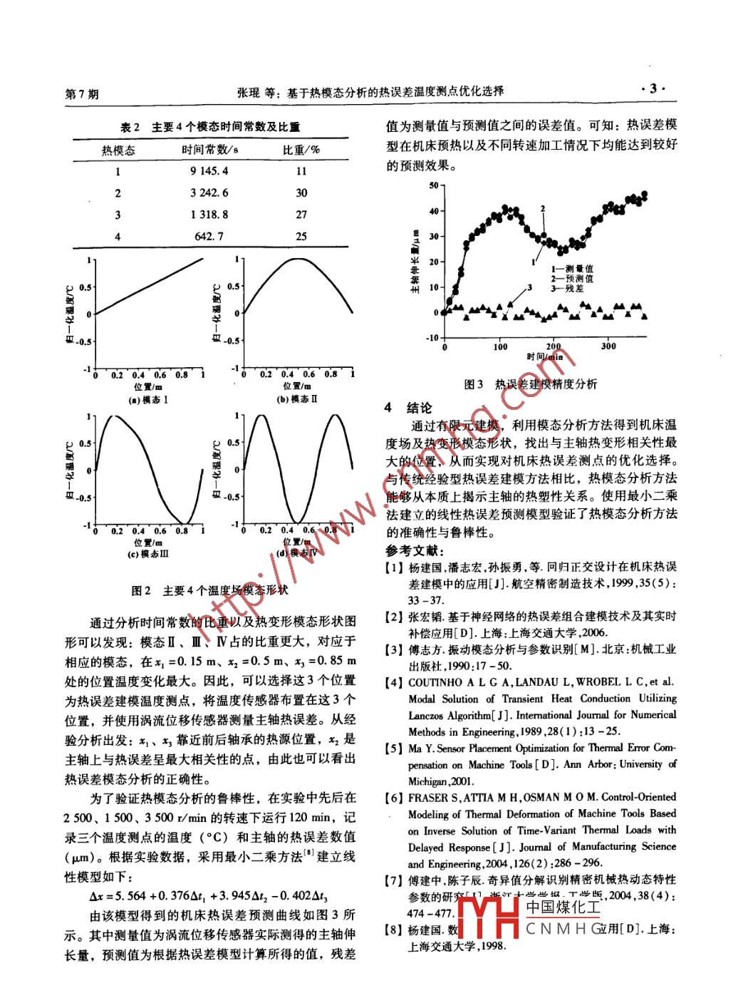 2012年4月機床與液壓Apr.2012第40卷第7期MACHINE TOOL HYDRAULICSVol. 40 No. 7DoI:10.3969/jisn.1001-3881.2012.07.001基于熱模態(tài)分析的熱誤差溫度測點優(yōu)化選擇張琨,張毅,侯廣鋒,楊建國(上海交通大學(xué)機械工程學(xué)院,上海200240)摘要:針對影響機床熱誤差建模的溫度場分布問題,提出一種熱模態(tài)分析方法,對機床熱誤差建模溫度測點進(jìn)行優(yōu)化選擇。以數(shù)控機床主軸溫度場分析為例,利用熱模態(tài)方法得到主軸各模態(tài)的時間常數(shù)、溫度場及熱變形模態(tài)形狀,從而確定溫度測點的最優(yōu)位置。并通過實驗驗證了所建立模型的準(zhǔn)確性與魯棒性。關(guān)鍵詞:數(shù)控機床;熱誤差;溫度測點選擇;熱模態(tài)中圖分類號:TG502.15文獻(xiàn)標(biāo)識碼:A文章編號:1001-3881(2012)7-001-3Selection of Sensor Placement for Thermal Error CompensationBased on Thermal Mode analysisZHANG Kun, ZHANG Yi, HOU Guangfeng, YANG JianguoSchool of Mechanical Engineering, Shanghai Jiaotong University, Shanghai 200240, China)Abstract: Aimed at the influence of temperature field distribution of machine tool on thermal error modeling, a method basedthermal mode analysis was proposed to select the optimum points of temperature sensors. Time constants, temperature field and thermalexpansion modal shapes of the spindle were calculated, so the optimum locations of temperature sensors were obtained. Satisfactory re-sults are achieved in terms of model accuracy and robustness through experimentKeywords: Machine tool; Thermal error; Temperature sensor placement; Thermal mode誤差補償技術(shù)是提髙機床加工精度的一項關(guān)鍵技1熱模態(tài)分析概述術(shù),在現(xiàn)代工業(yè)中越來越受到重視。有效實施誤差補模態(tài)分析是一種廣泛應(yīng)用于結(jié)構(gòu)動力學(xué)問題的方償?shù)那疤崾墙⒑线m的誤差補償模型。由于在實際加法,它能夠確定設(shè)計結(jié)構(gòu)或機械部件的振動特性,得工過程中很難直接測得刀尖點和工件之間的熱誤差,到結(jié)構(gòu)的固有頻率和振型,由于它們是進(jìn)行動力學(xué)研所以必須將熱誤差與一些容易測得的變量聯(lián)系起來建究的重要參數(shù),所以模態(tài)分析也是更為詳細(xì)的動力學(xué)立數(shù)學(xué)模型,最常見的就是熱誤差一溫度模型。由于分析如譜響應(yīng)分析、瞬態(tài)動力學(xué)分析、頻譜分析的起機床熱誤差的影響因素眾多,為了使建立的模型盡可點3。類似地,模態(tài)分析方法也可以被引入到了熱傳能地具有魯棒性和精確性,如何對機床溫度測點進(jìn)行遞問題的分析之中。模態(tài)分析的本質(zhì)是將復(fù)雜的動優(yōu)化選擇成為熱誤差建模中的關(guān)鍵問題。國內(nèi)外有很態(tài)系統(tǒng)分解為簡單的子系統(tǒng),這也是有限元方法的本多學(xué)者在此方面進(jìn)行了廣泛深人的研究。最普遍的選擇溫度傳感器位置的方法是根據(jù)經(jīng)驗預(yù)先在機床多個質(zhì)屬性,因此也可以使用有限元方法對熱模態(tài)進(jìn)行分位置上布置溫度傳感器,然后使用統(tǒng)計學(xué)方法選出對析。機床結(jié)構(gòu)熱變形的過程是首先由輸入的熱負(fù)載導(dǎo)方法大大加重了誤差測量和計算的工作量,且在實際致溫度場的變化,然后溫度場的不均勻變化最終導(dǎo)致加工中由于布線過多會影響機床正常工作。由于僅僅了熱變形。要從本質(zhì)上掌握機床的熱特性,就必須得從經(jīng)驗出發(fā),沒有充分考慮到機床溫度場的動態(tài)特性到機床溫度場的分布,即對熱傳遞微分方程進(jìn)行求對熱誤差的影響,所建立的熱誤差模型很難保證很高解。瞬態(tài)熱傳遞問題的基本微分方程為:的精度和魯棒性。作者從機床傳熱特性出發(fā),提出了CT(r)+K,T(t)=Q(r)一種基于熱模態(tài)分析的機床熱誤差測點優(yōu)化選擇方式中:Cr為熱容矩陣,K為熱傳遞系數(shù)矩陣,T(t)法,經(jīng)實驗驗證,提高了熱誤差模型的魯棒性為溫度向量,Q(t)為熱負(fù)載向量。v凵中國煤化工收稿日期:2011-03-11CNMHG基金項目:“高檔數(shù)控機床與基礎(chǔ)制造裝備”國家科技重大專項項目(2000X014-2作者簡介:張琨(1988-),男,碩土研究生,主要從事數(shù)控機床熱誤差補償方面的研究。E- mail: wildbird2005@2機床與液壓第40卷式(1)的特征問題是:上式中的點,可以通過反向熱傳遞分析方法來Kr中=Cr中1A求解,使用奇異值分解方法可以得到r,的值。接式中;A為特征值對角矩陣,特征值為λ1、λ2、…、下來就可以由模態(tài)溫度來求出物理溫度、熱變形和熱λn;φr為相應(yīng)的特征向量矩陣。誤差式(2)中的特征值A(chǔ)的物理意義是自然時間常T(t)=φ(t)數(shù)(代表第i個模態(tài)對于熱負(fù)載的響應(yīng)時間)的倒U(t)=φ6(t)(10)數(shù),即有:λ2=1/r;。類似于結(jié)構(gòu)動態(tài)分析,每個特E(t)=φθ(t)征值或者自然時間常數(shù)都對應(yīng)于一個模態(tài),最小的特為了表征對機床熱變形影響最大的熱模態(tài),引入征值或者說最大的自然時間常數(shù)對應(yīng)最低的模態(tài),從熱模態(tài)比重系數(shù)c=5r,c的大小代表了每個模態(tài)而可以得到以特征向量表示的溫度場模態(tài)形狀。每個所占的比重。通常熱變形過程中只有幾個模態(tài)起主要溫度場模態(tài)形狀反映的是在單獨的模態(tài)下溫度場的分作用,其余影響較小的模態(tài)可以被忽略掉。布情況,實際的瞬時溫度場則是這些模態(