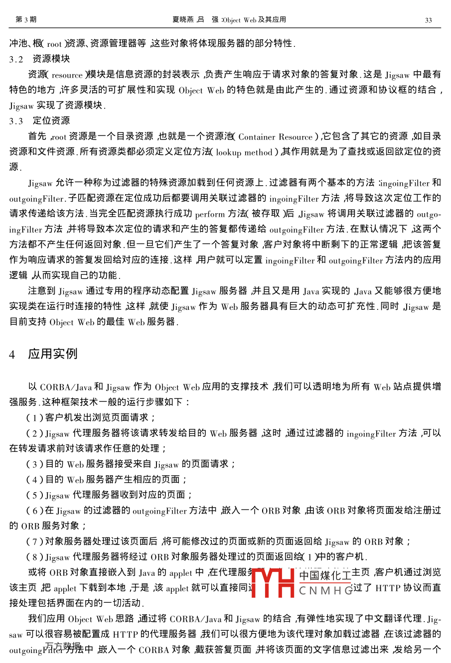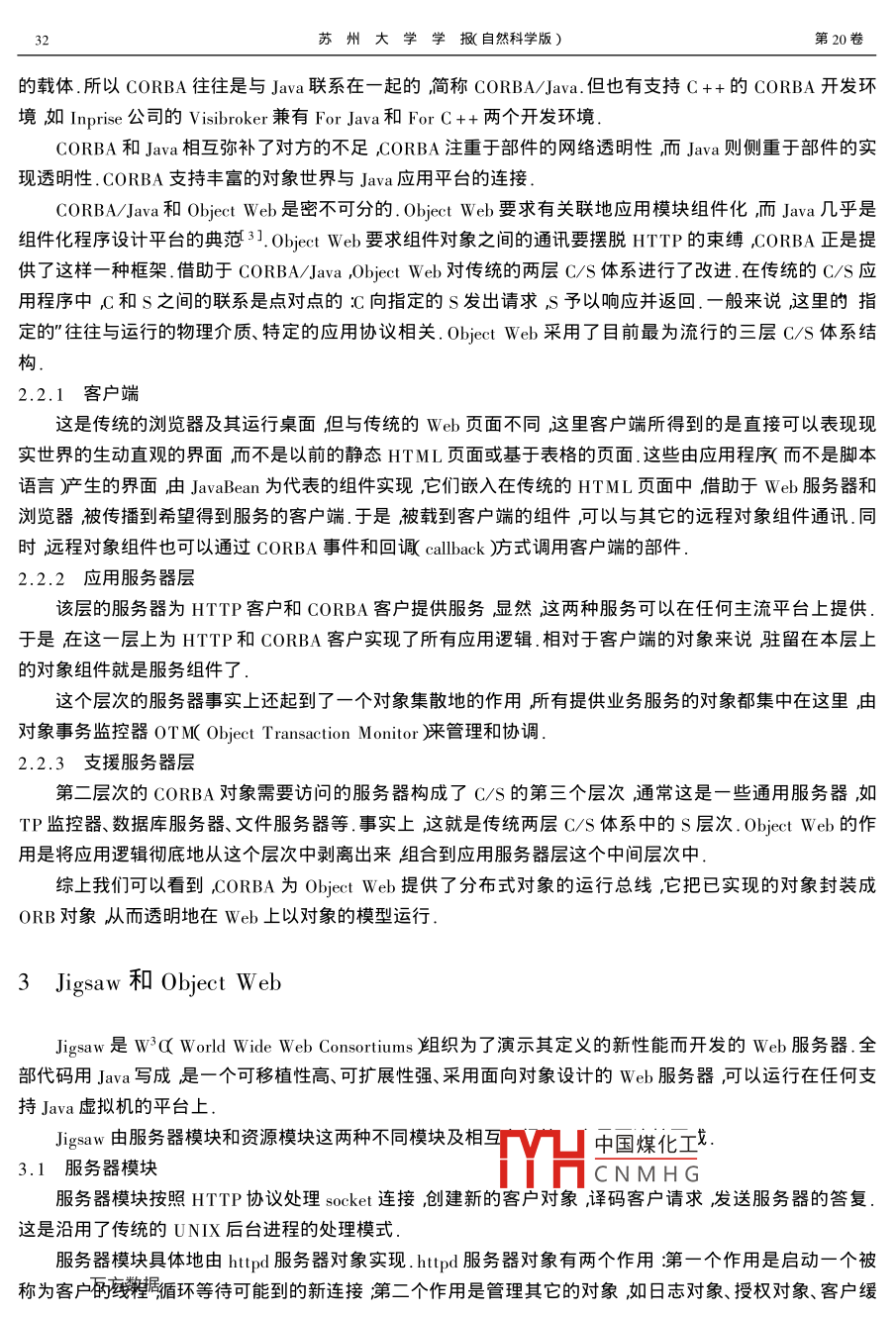 第20卷第3期蘇州大學學報《(自然科學版)004年7月OURNAL OF SUZHOU UNIVERSITY( NATURAL SCIENCE EDITION文章編號∶000207x2004)3-0031-04Obiect web及其應(yīng)用夏曉燕!2呂強12Ⅰ.蘇州大學計算機科學與技術(shù)學院江蘇蘇州2150062.江蘇省計箅機信息處理技術(shù)重點實驗室江蘇蘇州215006)摘要引入了 Object Web的概念并闡述了 CORBA和 Object Web互補的關(guān)系以及支持 Object Web的Web服務(wù)器實例 Jigsaw.最后給出了將 Object Web, CORBA和 Jigsaw結(jié)合在一起的應(yīng)用實例關(guān)鍵詞 Object Web汾布式對象 CORBA Jigsaw中圖分類號:TP393.02文獻標識碼∶A1 Obiect Web的引入World wide wel(簡稱web舶創(chuàng)立和發(fā)展使我們有可能建立一個開放的、跨平臺的網(wǎng)絡(luò)C/S應(yīng)用標準即跨操作系統(tǒng)的、跨硬件平臺的、跨語言環(huán)境的、能夠在網(wǎng)際運行的C/S應(yīng)用標準目前正開始Web與分布式對象結(jié)合我們稱為對象wel( Object Web)在這個階段中,Web只是提供給我們一個網(wǎng)絡(luò)平臺和基礎(chǔ)的網(wǎng)絡(luò)運行對象真正的應(yīng)用不是簡單瀏覽必須實現(xiàn)組件化和分布化這樣借助于 Internet作為物理網(wǎng)絡(luò)平臺,web作為應(yīng)用發(fā)布平臺用戶得到的應(yīng)用程序?qū)⑼该鞯剡\行在全球的網(wǎng)絡(luò)上不僅僅數(shù)據(jù)將透明地分布在網(wǎng)絡(luò)上應(yīng)用也將會透明地接受網(wǎng)絡(luò)上服務(wù)器的支持2 CORBA和 Obiect Web2.1 CORBA簡介CORBAC Common Object Request Broker Architecture是一個由 OMC( Object Management Group)發(fā)布的分布式面向?qū)ο髴?yīng)用系統(tǒng)的開發(fā)規(guī)范121得到除微軟之外的800多家主流公司的支持CORBA最令人注目的工作是將對象的界面與實現(xiàn)分離然后定義了對象之間交流的規(guī)范.這種規(guī)范用界面定義語言ID( Interface Definision language表達使得客戶方和服務(wù)方有了統(tǒng)一的獨立于實現(xiàn)的界面標準2.2 CORBA/Java和 Object Web的戰(zhàn)略組合CORBA雖然強調(diào)對象實現(xiàn)語言的獨立性但最流行的dTH中國煤化愛Java作為對象實現(xiàn)CNMHG收稿日期2004-01-17基金項目江蘇省自然科學基金資助項目(BK2003030)江蘇省計算機信息處理技術(shù)重點實驗室開放課題資助項目(KJSO3062)作者裔曉燕(1965-)女工程師主要從事計算機實驗設(shè)計和管理工作蘇州大學學撇(自然科學版)第20卷的載體所以 CORBA往往是與Java聯(lián)系在一起的簡稱 CORBA/Java.但也有支持C++的 CORBA開發(fā)環(huán)境如 Inprise公司的 Visibroker兼有 For Java和ForC++兩個開發(fā)環(huán)境CORBA和Java相互彌補了對方的不足 CORBA注重于部件的網(wǎng)絡(luò)透明性而Java則側(cè)重于部件的實現(xiàn)透明性. CORBA支持豐富的對象世界與Java應(yīng)用平臺的連接CORBA/Java和 Object Web是密不可分的. Object Web要求有關(guān)聯(lián)地應(yīng)用模塊組件化而Java幾乎是組件化程序設(shè)計平臺的典范3].ObiectWel要求組件對象之間的通訊要擺脫HTTP的束縛CORBA正是提供了這樣一種框架借助于 CORBA/Java, Object Wel對傳統(tǒng)的兩層C/S體系進行了改進在傳統(tǒng)的C/S應(yīng)用程序中C和S之間的聯(lián)系是點對點的向指定的S發(fā)出請求S予以響應(yīng)并返回.一般來說這里的指定的”往往與運行的物理介質(zhì)、特定的應(yīng)用協(xié)議相關(guān). Object Web采用了目前最為流行的三層C/S體系結(jié)構(gòu)2.2.1客戶端這是傳統(tǒng)的瀏覽器及其運行桌面但與傳統(tǒng)的Web頁面不同這里客戶端所得到的是直接可以表現(xiàn)現(xiàn)實世界的生動直觀的界面而不是以前的靜態(tài)HTML頁面或基于表格的頁面這些由應(yīng)用程序而不是腳本語言廣產(chǎn)生的界面由 Javabean為代表的組件實現(xiàn),它們嵌入在傳統(tǒng)的HTML頁面中借助于Web服務(wù)器和瀏覽器被傳播到希望得到服務(wù)的客戶端.于是被載到客戶端的組件可以與其它的遠程對象組件通訊.同時遠程對象組件也可以通過 CORBA事件和回調(diào) callback)式調(diào)用客戶端的部件2.2.2應(yīng)用服務(wù)器層該層的服務(wù)器為HTTP客戶和CORBA客戶提供服務(wù)顯然這兩種服務(wù)可以在任何主流平臺上提供于是在這一層上為HTTP和CORBA客戶實現(xiàn)了所有應(yīng)用邏輯.相對于客戶端的對象來說駐留在本層上的對象組件就是服務(wù)組件了這個層次的服務(wù)器事實上還起到了一個對象集散地的作用所有提供業(yè)務(wù)服務(wù)的對象都集中在這里由對象事務(wù)監(jiān)控器 OTM( Object Transaction Monitor來管理和協(xié)調(diào)2.2.3支援服務(wù)器層第二層次的 CORBA對象需要訪問的服務(wù)器構(gòu)成了C/S的第三個層次通常這是一些通用服務(wù)器如TP監(jiān)控器、數(shù)據(jù)庫服務(wù)器、文件服務(wù)器等事實上這就是傳統(tǒng)兩層C/S體系中的S層次. Obiect Web的作用是將應(yīng)用邏輯徹底地從這個層次中剝離出來組合到應(yīng)用服務(wù)器層這個中間層次中綜上我們可以看到 corba為 Object Web提供了分布式對象的運行總線,它把已實現(xiàn)的對象封裝成ORB對象從而透明地在Web上以對象的模型運行3 Jigsaw和 Object Webgaw是W3 World Wide Web Consortiums組織為了演示其定義的新性能而開發(fā)的web服務(wù)器全部代碼用Java寫成是一個可移植性高、可擴展性強、采用面向?qū)ο笤O(shè)計的Wcb服務(wù)器可以運行在任何支持Java虛擬機的平臺