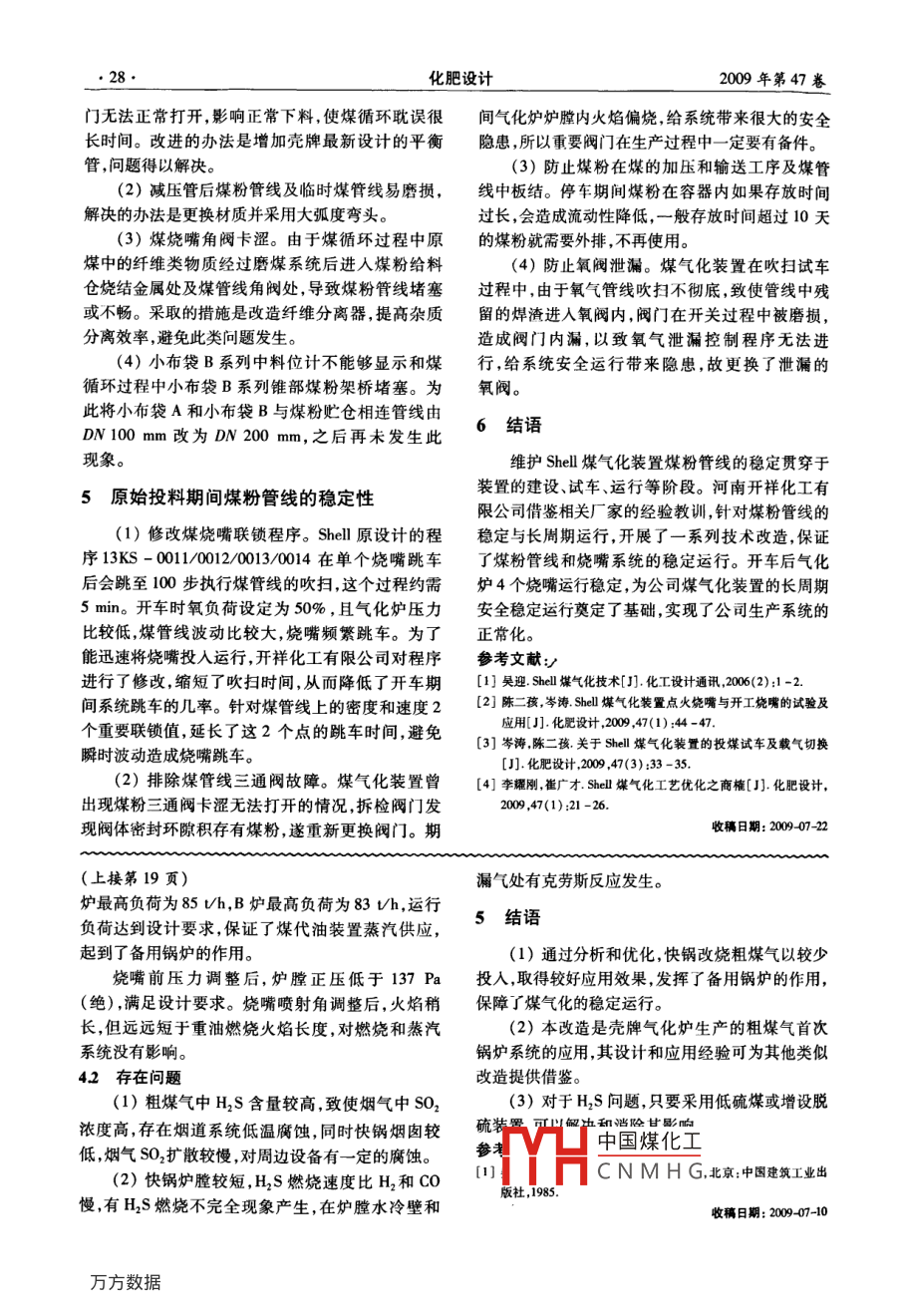 Oet.2009化肥設(shè)計.第47卷第5期●26●Chemical Fertilizer Design2009年10月.生產(chǎn)技術(shù)試論Shell煤氣化裝置煤粉管線的穩(wěn)定性陳二孩,岑濤,馬江濤 ,劉礦生(開祥化工有限公司,河南義馬472300)摘要: Shell煤氣化裝置是通過控制氧煤比來控制氣化爐爐膛溫度和合成氣組分,煤粉管線的穩(wěn)定對裝置長周期安全運行起到關(guān)鍵作用。分析探討了煤粉管線在施工階段、原始開車前的煤循環(huán)期間以及原始開車投煤過程中存在的問題和原因,提出并采取了相應(yīng)的技改措施,結(jié)果表明,開車后煤粉管線和燒嘴系統(tǒng)運行比較穩(wěn)定。關(guān)鍵詞: Shell煤氣化裝置;煤粉管線;煤循環(huán);穩(wěn)定性;分析;措施中圖分類號: TQ545文獻(xiàn)標(biāo)識碼:A文章編號:1004 - 8901(2009)05 -0026 -03Trying to Discuss Stability for Pulverized Coal Pipeline of Shell Coal Gasifcation PlantCHEN Er-hai, CEN Tao, MA Jiang tao, LU Kuang- sheng( Kairiang Chemical Enginering Company ld. , Yima Henan 472300 China)tion plant; the stability of pulverized coal pipeline played a citical role on the long- term and salety operation of the plant. Author has analyzed and dis-cused the exioting problems and their reason during constuction stage of the pulverized coal pipeline and during coal powder crculaion before onginallytarting- up and in the proces putig coal into oiginally sarting-up , and has presented and adopted the appopriate technicad rermation measures, theresult indicates that the operation is elatively stabile for the pulverized coal pipeline and bumner sysem alfer sartingup.Key words: Shell coal gaification plant; pulverized coal pipeline; coal powder crculation; eability; analyis; measures比來控制氣化爐爐膛溫度和合成氣成分,保證以液1 Shell 煤氣化工藝流程態(tài)形式出渣且達(dá)到以渣抗渣的效果??刂品椒ㄊ荢hell煤氣化工藝是典型的第2代煤氣化工藝確定進(jìn)人爐膛的氧氣量不變,而通過設(shè)定氧煤比來之一,進(jìn)料方式為干粉輸送,氣流床氣化。煤粉和決定進(jìn)入氣化爐爐膛內(nèi)的煤粉量,以煤粉的加入量氧氣并流進(jìn)入氣化爐內(nèi),在極為短暫的時間內(nèi)完成決定氧化反應(yīng)深度,從而達(dá)到合適的氣化爐爐膛溫升溫、揮發(fā)分脫除、裂解、燃燒及轉(zhuǎn)化等- - 系列物理度和氣化效率。由此可見,煤粉管線的穩(wěn)定對煤粉和化學(xué)反應(yīng),最終形成以CO+ H2為主的煤氣離開加入量氣化效率等起到至關(guān)重要的作用。煤粉管氣化爐。河南開祥化工有限公司Shell 煤氣化裝置線不穩(wěn)定還會引起爐溫波動,損壞燒嘴隔焰罩、耐工藝流程見圖1?;饘?、銷釘、水冷壁等內(nèi)件設(shè)備,甚至造成堵渣以及激冷氣循環(huán)飛灰過濾器濾芯進(jìn)水等事故的發(fā)生。因此,生產(chǎn)企原煤過熱焦汽業(yè)應(yīng)對煤粉管線的穩(wěn)定引起足夠的重視,將其納入[磨煤/干燥中出蒸汽項目的建設(shè)階級投料試車階段以及生產(chǎn)運行階段。3項目施工階段穩(wěn)定煤粉管線的前期工作「煤的加壓|廣除灰濕洗(1)參照其他已建成裝置煤粉管線的布置方床處理式,對原設(shè)計煤粉管線走向進(jìn)行了局部優(yōu)化,在保氧氣灰中水回用.證管線平滑度的前提下使每支煤粉管線比原設(shè)計圈1 Shell 煤氣化裝置工藝流程中國煤化工2煤粉管線穩(wěn)定性分析作重大;YHC N M H G人,2005畢業(yè)于河南大學(xué)化學(xué)化上學(xué)阮化學(xué)1.程與1Z專業(yè),從事Shell煤氣化裝置生產(chǎn)Shell煤氣化裝置的控制核心是通過控制氧煤技術(shù)管理工作。.第5期陳二孩等試論Shell煤氣化裝置煤粉管線的穩(wěn)定性●27.縮短20~ 30 m,減少了部分彎頭,以降低管線阻力。情況下,煤粉在不同負(fù)荷下循環(huán)至煤粉貯倉中,通(2)注意施工質(zhì)量。煤粉管線采用氬弧焊加過煤粉貯倉的 單位時間增加量r與煤粉管線穩(wěn)定時電焊的焊接工藝,并保證焊接后內(nèi)壁光滑無凸起,單位時間累積量x進(jìn)行修正,求出偏差系數(shù)k和b。以降低管線阻力,減少煤粉管線波動。修正后的煤粉量kx +b與煤粉貯倉增加量y一致,(3)針對煤加壓與輸送工序的燒結(jié)金屬容易損即進(jìn) 入燒嘴的煤粉測量值kx +b視為真實值。煤粉壞的問題,對燒結(jié)金屬設(shè)備進(jìn)行改造,提高了設(shè)備的管線穩(wěn)定時單位時間累積量x=DxS。式中:D表抗壓能力,改造后至今未發(fā)生燒結(jié)金屬的破損。示煤粉管線中懸浮物的密度測量值, kg/m' ;S表示(4)鎖斗高壓過濾器濾芯在煤鎖斗泄壓過程煤粉管線中懸浮物的速度測量值, m/so 1°煤燒嘴中容易受力脫落,故在濾芯下部增加了固定支撐。.煤循環(huán)數(shù)據(jù)見表1,煤粉管線穩(wěn)定時單位時間累積(5)在調(diào)試期間將煤粉經(jīng)過的地方清理干凈,量x與煤粉貯倉單位時間增量y的函數(shù)關(guān)系見所有螺栓連接部件都予以點焊或采用雙螺母加固,圖3。表11'煤燒嘴煤循環(huán)數(shù)據(jù)并在大布袋下方安裝煤粉過濾器,以防止纖維、樹葉等雜質(zhì)進(jìn)入煤粉管線。煤流量煤粉給料時間間隔煤流量煤粉貯倉增量工況倉壓力4原始開車 前的煤循環(huán)/kg.o-1/MPa/min */kg.a-' y/kg.s-1開車11.07300.666 61.06564.1 煤循環(huán)的必要性氧氣是氣體,氣體的計量儀表非常準(zhǔn)確;而固開車22.18 0.751.226 71.9578 .體物料煤粉計量往往不夠準(zhǔn)確,因此在原始開車前75%負(fù)荷2.505 0.821.761 4.2.551 4.100%負(fù)荷3.3412. 446 03. 294 0需要對煤