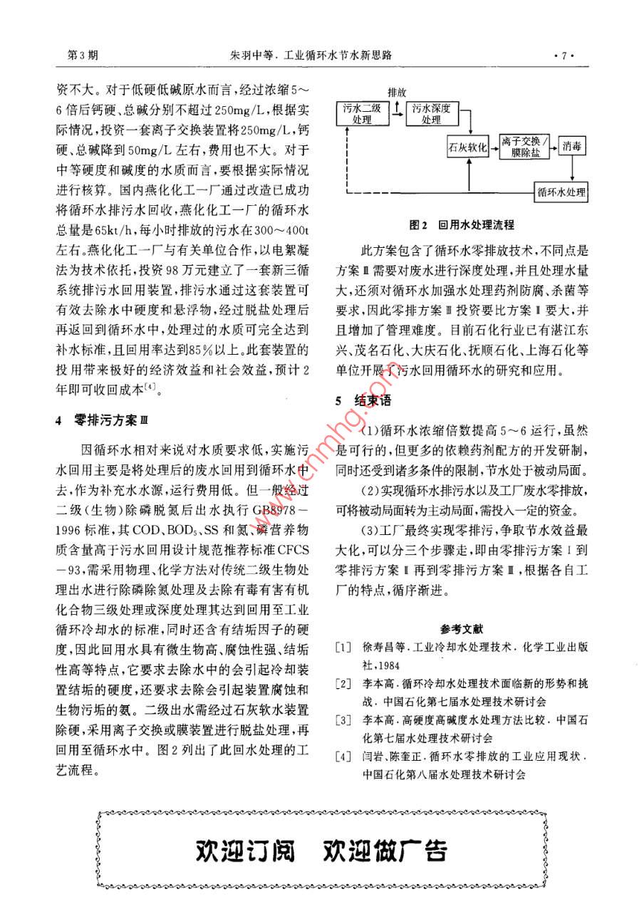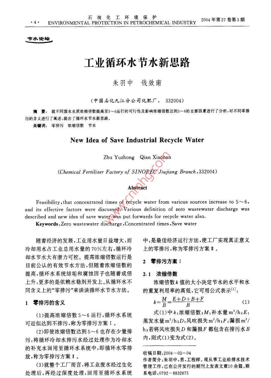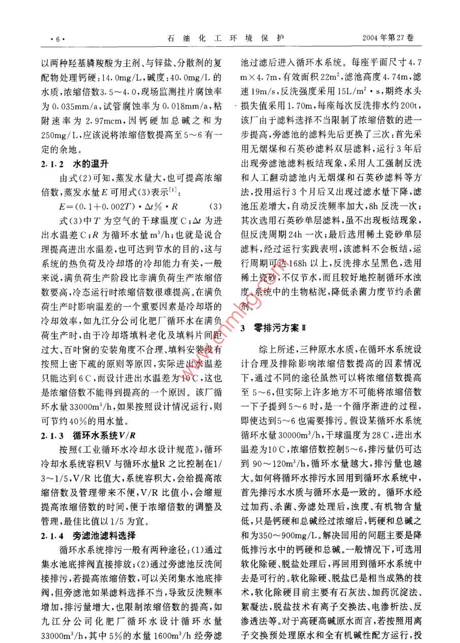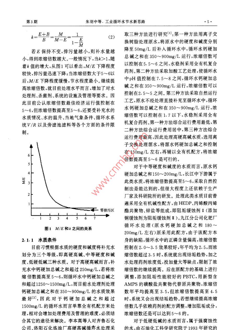 石油化工環(huán)境保護4. ENVIRONMENTAL PROTECTION IN PETROCHEMICAL INDUSTRY2004年第27卷第3期節(jié)水論壇工業(yè)循環(huán)水節(jié)水新思路朱羽中錢效南(中國石化九江分公司化肥廠,332004)摘要:就不同源水水質(zhì)濃縮倍數(shù)提高至5~6運行的可行性及影響濃縮倍數(shù)達到5~6的主要因素進行了分析,對不同零排污的含義進行了闡述,提出了循環(huán)水節(jié)水新思路關(guān)鍵詞:零排污濃縮倍數(shù)節(jié)水New Idea of Save Industrial Recycle WaterZhu yuzhong Qian XiaonanChemical Fertilizer Factory of SINOPEC Jiujiang Branch, 332004)AbstractFeasibility, that concentrated times of recycle water from various sources increase to 5-6and its effective factors were discussed. Various definition of zero wastewater discharge wasdescribed and new idea of save water was put forwards for recycle water also.Keywords: Zero wastewater discharge, Concentrated times, Save water隨著經(jīng)濟的發(fā)展,工業(yè)用水量日益增大,而中,是最佳經(jīng)濟運行方法,使工廠實現(xiàn)真正意義冷卻用水占工業(yè)總用水量的70%左右,循環(huán)冷上的零排污,稱為零排污方案。卻水節(jié)水大有潛力可挖。提高濃縮倍數(shù)運行是目前公認的有效節(jié)水方法,但隨著濃縮倍數(shù)的2零排污方案I提高,循環(huán)水系統(tǒng)結(jié)垢和腐蝕因子也隨著成倍2.1濃縮倍數(shù)上升,更多的是依賴水穩(wěn)劑開發(fā)上。從循環(huán)水不濃縮倍數(shù)k值的大小決定節(jié)水的水平和水同含義上的“零排污”來談?wù)勓h(huán)水節(jié)水方法。的重復(fù)利用率的高低,它可用公式表示:1零排污的含義M E+D+B+FB1)提高濃縮倍數(shù)5~6運行,循環(huán)水系統(tǒng)式(1)中k:濃縮倍數(shù);M:補水量m3/h;E:可近似達到不排污,稱為零排污方案I。蒸發(fā)水量m3/h;D:風(fēng)吹損失m3/h;F:漏損m3/(2)即使?jié)饪s倍數(shù)達到5~6也存在少量排h;若將風(fēng)吹損失D和漏損F都包含在排污水B污,將循環(huán)冷卻水排污水經(jīng)過處理作為冷卻水內(nèi),則式(1)變?yōu)槭?2)。的補充水回用至循環(huán)水系統(tǒng)中,即循環(huán)水零排放,稱為零排污方案I收稿日期:2004-03-04作者簡介:朱羽中,男,工程師。現(xiàn)從事工業(yè)給排水技術(shù)(3)就整個工廠而言,將工業(yè)廢水經(jīng)過生化管理工作,已在公開發(fā)行的期刊上發(fā)表文章10余篇聯(lián)處理后,再經(jīng)過深度處理,回用至循環(huán)水系統(tǒng)系電話:0792-8832675第3期朱羽中等,工業(yè)循環(huán)水節(jié)水新思路E+B MB M-E(2)取三種方法進行研究):第一種方法用離子交E換樹脂處理原水,將原水中的硬度和堿度分別若E保持不變,排污量越小,則補水量越降至50mg/L后補入循環(huán)水中,循環(huán)水鈣硬加小得到濃縮倍數(shù)越大。一般情況下,當(dāng)k>1,隨總堿之和在350~900mg/L運行濃縮倍數(shù)可著k值的增大從圖1可以看出,M/E下降程度以控制在55~6之間,水穩(wěn)劑采用全有機復(fù)合較快,排污量迅速下降;當(dāng)濃縮倍數(shù)大于5~6以藥劑。第二種方法采取加酸工藝處理,使循環(huán)水后,M/E下降程度緩慢,節(jié)水程度最小,繼續(xù)提中pH值控制在7.5~8之間,循環(huán)水鈣便加總高濃縮倍數(shù)就目前處理水平而言,增加了對水堿之和在350~900mg/L運行,濃縮倍數(shù)可以處理劑殺菌劑、系統(tǒng)的設(shè)施及管理等要求。因控制在25~5之間。第三種方法采取自然運行此目前公認濃縮倍數(shù)最佳經(jīng)濟運行值控制在工藝,原水不經(jīng)處理直接補充至循環(huán)水中循環(huán)5~6,但濃縮倍數(shù)提高至5~6,還要受補充水的水鈣硬加總堿之和在350~90mg運行,濃水質(zhì)情況、水的溫升當(dāng)?shù)貧庀髼l件、循環(huán)水系縮倍數(shù)可以控制在1.7以下,水穩(wěn)劑采用全有統(tǒng)V/R以及旁濾池濾料等各個方面的條件限機復(fù)合藥劑。第一種方法綜合運行費用最低第制。二種方法綜合運行費用居中,第三種方法綜合運行費用最高,因此處理高硬高堿水質(zhì)選用離子交換處理源水,將源水鈣硬加總堿之和控制在150mg/L左右,再輔以全有機配方將濃縮倍數(shù)提高至5~6是可行的對于中等硬度和堿度的水質(zhì)而言,原水鈣硬加總堿之和150~200mg/L,長江中下游屬于此類水質(zhì),將濃縮倍數(shù)提高至5~6,采取自然控制法是能達到的,但很大程度上還依賴于生產(chǎn)廠家及科研院所的研發(fā)。處理此類水質(zhì)目前普遍采用全有機堿性配方,由HEDP、丙烯酸丙烯零排污區(qū)酯共聚物、鋅鹽等組成,即阻垢緩蝕劑I(添加銅緩蝕劑為阻垢緩蝕劑夏)。九江分公司化肥廠圖1M/E和k之間的關(guān)系循環(huán)水處理(原水鈣硬加總堿之和180~200mg/L左右)原采用此配方,由于該配方本2.1.1水質(zhì)條件身的缺陷,循環(huán)水中的正磷含量偏高,濃縮倍數(shù)目前習(xí)慣根據(jù)水質(zhì)的硬度和堿度將補充水控制在2.0~3.5效果較好,年平均為2.5,而濃劃分為三個等級,即高硬高堿、中等硬度和堿縮倍數(shù)超過35時,系統(tǒng)就出現(xiàn)結(jié)垢趨勢,加之度、低硬低堿三種水質(zhì)。對于高硬高堿而言,補水處理藥劑濃度低,投加量大等缺點,限制了濃充水中鈣硬加總堿之和超過250mg/L,若將濃縮倍數(shù)的繼續(xù)提高。后在原配方的基礎(chǔ)上進行縮倍數(shù)提高至5~6,則循環(huán)水中鈣硬加總堿之調(diào)整,添加阻垢性能較好的PBTC,用新型含和超過1250~1500mg/L,而目前水處理劑處理AMPS
