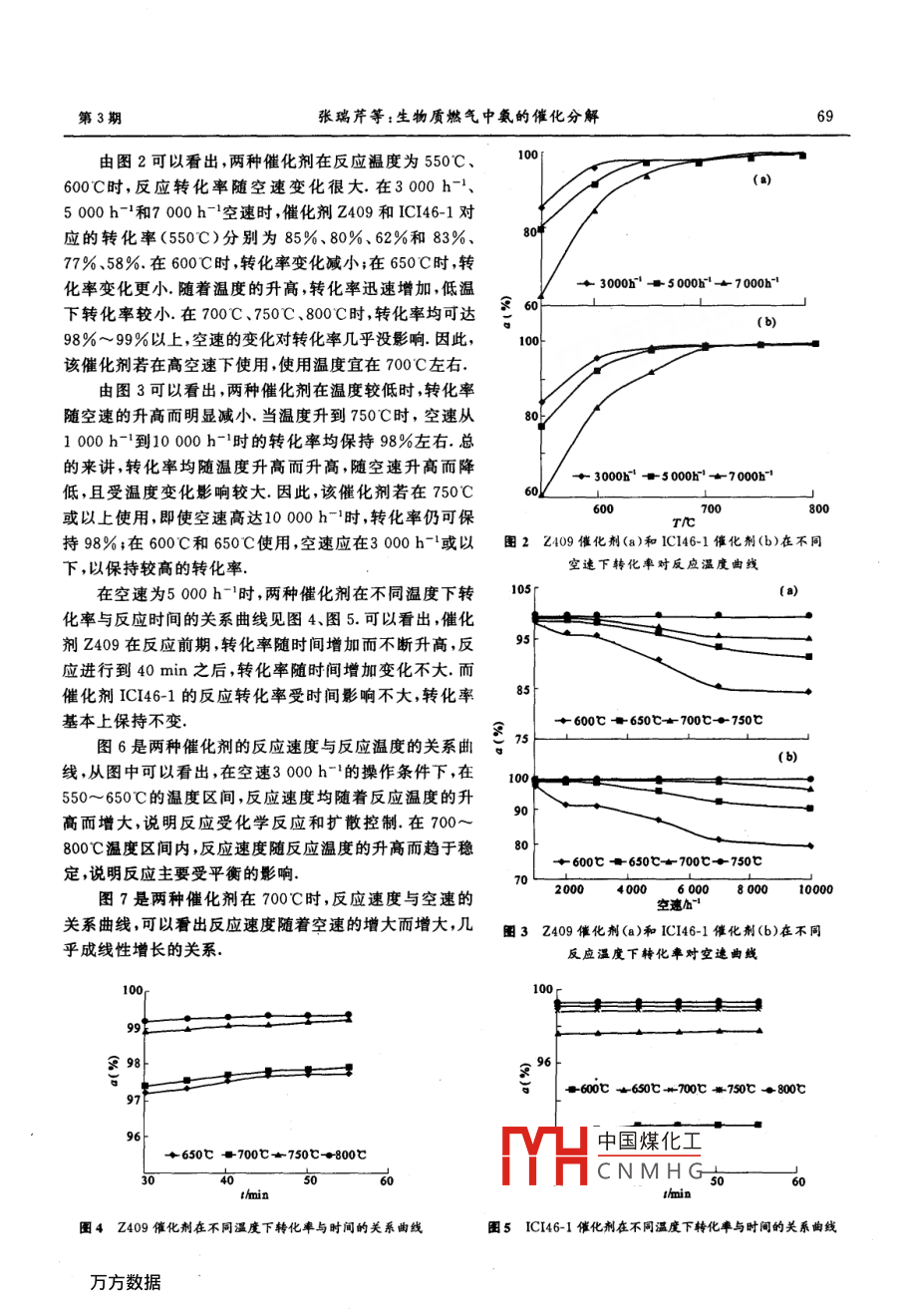 第36卷第3期鄭州大學學報(理學版)Vol. 36 No. 32004年9月JOURNAL OF ZHENGZHOU UNIVERSITYSep.2004生物質(zhì)燃氣中氨的催化分解張瑞芹,丁小會(鄭州大學化學系鄭州450052)摘要:選用兩種工業(yè)化的蒸汽轉(zhuǎn)化Ni基催化劑(Z409和ICI46-1)進行氨催化分解研究,考察了在不同空速、不同溫度下催化劑的催化性能結(jié)果表明,在一定條件下,兩種催化劑的催化轉(zhuǎn)化率均可達到98%~99%,在22h的催化劑壽命測試中,兩種催化劑的轉(zhuǎn)化率均能保持穩(wěn)定,具有良好的催化分解作用,可直接用于生物質(zhì)燃氣的高溫凈化,以脫除其中的污染物氨關(guān)鍵詞:生物質(zhì)燃氣;氨;催化分解中圖分類號:X511文章編號:1671-6841(2004)03-0067-060引言生物質(zhì)氣化是通過熱轉(zhuǎn)化技術(shù)將固體生物質(zhì)轉(zhuǎn)化為燃氣,產(chǎn)生的燃氣包括氫氣、碳氧化物、水、氮氣(如果用空氣的話)和少量甲烷及其它的碳氫化合物.產(chǎn)品還包括不等量的灰份和木炭顆粒物、少量的污染物氨硫化氫、揮發(fā)的堿金屬物質(zhì)和焦油.因此,汽化燃氣必須經(jīng)過凈化處理后才能使用.其中,氨在燃燒過程中會轉(zhuǎn)化為對大氣有嚴重污染的NO2,而且在不完全燃燒時生成的N2O可與臭氧反應生成NO,從而引起對臭氧層的破壞,故生物質(zhì)燃氣中的污染物氨必須經(jīng)過凈化處理,以滿足終端需要,減少環(huán)境污染口2.氨的脫除方法很多,可行的方法只有階段燃燒和氨的催化分解階段燃燒要對現(xiàn)有的工藝進行改造,使它的運用受到了一定的限制;采用催化分解的方法,可以將氨在催化劑的作用下分解為不產(chǎn)生二次污染的N2和H3國內(nèi)外許多學者已經(jīng)對多種金屬催化劑進行了篩選工作,以期尋找有效的氨催化分解催化劑所研究的催化劑包括Pt、Zn、Fe、Ni、Ru、M、Cu、Mn等,這些催化劑大部分活性較低,只有少數(shù)催化劑轉(zhuǎn)化率可達9%左右,但高溫生物質(zhì)中存在的硫會引起中毒現(xiàn)象使催化劑活性降低,故氨催化分解的關(guān)鍵是尋找到長效、高活性且具有高耐受性的催化劑.大量研究結(jié)果表明,金屬鎳(包括擔載型Ni基催化劑,Ni與其它金屬的復合型催化劑)是氨催化分解的最好的活性組分,鎳基催化劑具有較高的轉(zhuǎn)化率,對水蒸氣、硫化氫等毒物具有較強的耐受性,將成為今后氨催化分解研究和開發(fā)的重點,作者選用兩種工業(yè)化的鎳轉(zhuǎn)化催化劑進行氨的催化分解研究,考察了在不同空速、不同溫度下催化劑的催化性能,并對催化劑進行了表征分析1實驗部分1.1催化劑及其準備評價實驗中所用的催化劑是兩種商用蒸汽轉(zhuǎn)化催化劑:英國皇家化學工業(yè)的ICI46-1鎳基催化劑和中國齊魯石化公司的Z409鎳基催化劑催化劑的化學組成列于表1.兩種催化劑的活性組分是NO,都添加了堿性物質(zhì)添加劑,如鉀,鈣和鎂的氧化物.Z409中含有少量鑭和鈰的氧化物助劑.ICI46-1和Z409兩種商用的催化劑分別為4空和單空的8.0mm×1.2mm的柱狀產(chǎn)為測試用催化劑樣品.蒸汽轉(zhuǎn)化催化劑中N組分以氧化鎳存H中國煤化工20~30目的顆粒作CNMHG金屬N才具有催化收稿日期:2004-01-10基金項目:鄭州大學“十五”及“211工程”能源科學與技術(shù)重點學科資助項目作者簡介:張瑞芹(1965—),女,副教授,硬士,主要從事生物質(zhì)再生資源與環(huán)境催化研究;E-mailrqzhang@za,edu.cn鄭州大學學報(理學版)第36卷活性實驗過程中將催化劑置于高溫反應表1兩種催化劑的化學組成器中,在N2保護下升溫至700C,保持恒催化劑活性組分比表面積溫,用50%H2+50%N2混合氣還原催化助劑載體/(m2·g-1)劑,2.5h后還原完全,經(jīng)過預還原的催化aO, K2O, LnO. SiOz, Al2O, 1劑樣品用于隨后的催化測試中IC146-1aO, K,OSiO,, Al,O,8.782催化劑的評價裝置及方法氨的催化分解反應為氣一固相反應體系,催化劑性能及評價是在氣一固相支流流動催化反應裝置上進行的,測試裝置如圖1所示圖1實驗裝置流程圖1.N2;2.NH3(平衡氣為N2);3.氣體減壓閥;4.玻璃轉(zhuǎn)子流量計;5,反應爐;6.反應器7.氣體采樣器;8CP-3800氣相色譜儀;9.色譜工作站;10.排空在固定床不銹鋼反應器中進行催化劑活性評價,催化劑裝填量為0.25mL.催化劑床層位于電熱爐的等溫區(qū)內(nèi),測溫熱電偶端點置于催化劑層的中心,反應器入口和出口氣體組成中NH3的濃度由美國 Varian cp-3800氣相色譜儀分析,檢測器為TCD,色譜柱為CP一 PoraPLOt Q毛細管柱,柱長12.5m,氮氣作載氣由于TCD檢測器對氨濃度的檢測范圍不小于0.1%而在催化分解脫除氨的過程中,在某些實驗條件下,出口處氨的濃度會降至0.1%以下,使用GC不能準確測出數(shù)據(jù),所以,在實驗過程中作者采用氣相色譜法和氣體檢測管兩種手段同時進行檢測.反應體系中氣體流量由玻璃轉(zhuǎn)子流量計控制旨標1.3評價指1.3.1反應轉(zhuǎn)化率(a)反應前后氣體體積的變化忽略不計,氨的催化分解率即反應轉(zhuǎn)化率由下式計算反應轉(zhuǎn)化率a(%)={[NH2]m-[NH3]}/[NH3]×100,式中:[NH3]為初始反應混合物中NH3的體積分數(shù)[NH3]m為反應后氣體中NH3的體積分數(shù)1.3.2反應速度(R)R=單位時間單位質(zhì)量(或體積)的催化劑分解NH3的量(mol·g-1·s-或mL·g1·s-1).1.4催化劑的表征對預還原和反應后的兩種催化劑樣品進行XRD分析及表面和孔徑分析.XRD分析是在日本理學D/Max-3B型X射線衍射儀上進行的,掃描范圍:20從10°到70°;電流30mA;掃描速度為6°/min.比表面