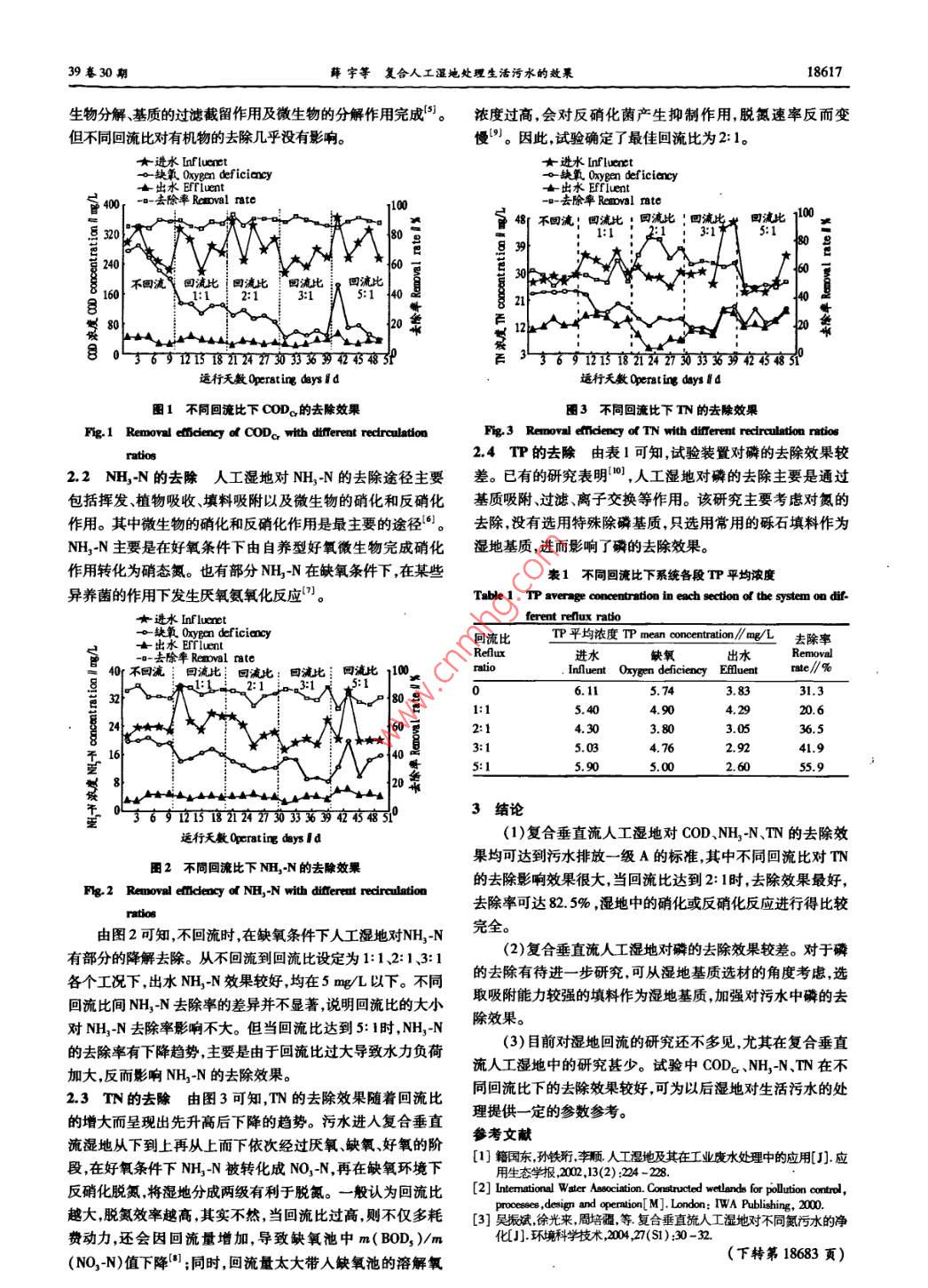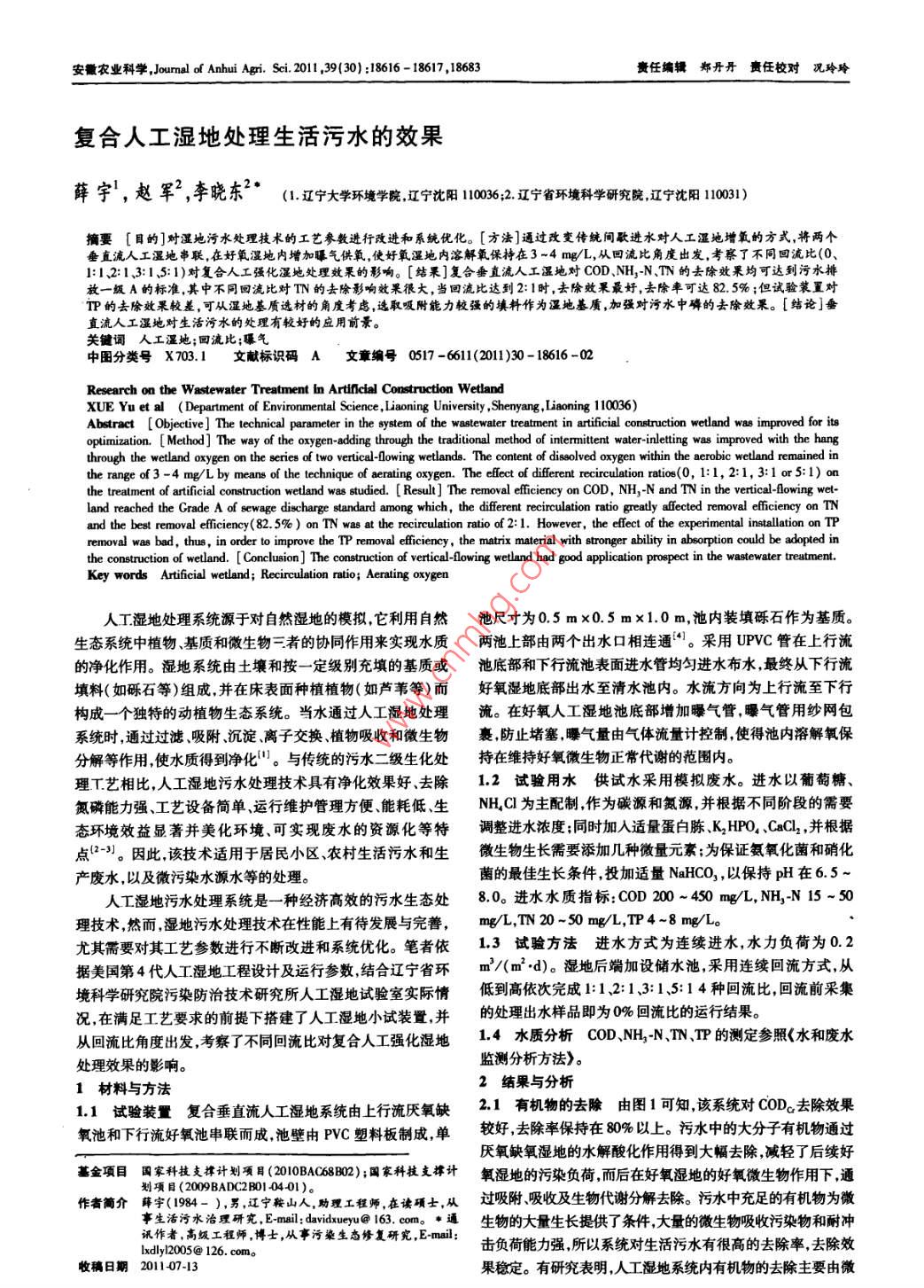安囊農(nóng)業(yè)科學(xué), Journal of Anhui Agr.si.201l,39(30):18616-18617,18683貴任編輯鄭丹丹實(shí)任校對(duì)況玲玲復(fù)合人工濕地處理生活污水的效果薛宇,趙軍2,李曉東2(1.遼寧大學(xué)環(huán)境學(xué)院,遼寧沈1052遼寧省環(huán)境科學(xué)研究院,寧洗沈用10摘要[目的]對(duì)濕地污水處理技術(shù)的工藝參教進(jìn)行改進(jìn)和系統(tǒng)優(yōu)化。[方法]通過(guò)改變傳魷間歌進(jìn)水對(duì)人工濕地增氧的方式,將兩個(gè)疊直流人工濕地串聯(lián),在好氧濕地內(nèi)增加曝氣供氧,使好氧濕地內(nèi)溶解氧保持在3-4mg/L,從回流比角度出發(fā),考察了不同回流比(0、l:1、2:1、3:1、5:1)對(duì)復(fù)合人工強(qiáng)化濕地處理效果的彩響。[結(jié)果]復(fù)合垂直流人工濕地對(duì)COD、 NH,-N, TN的去除效果均可達(dá)到污水排放一級(jí)A的標(biāo)準(zhǔn),其中不同回流比對(duì)TⅣN的去除影響效果很大,當(dāng)回流比達(dá)到2:1時(shí),去除效果最好,去除率可達(dá)82.5%;但試驗(yàn)蓑置對(duì)TP的去除效栗較差,可從濕地基質(zhì)選材的角度考慮,選取吸附能力較強(qiáng)的填料作為濕地基質(zhì),加強(qiáng)對(duì)污水中磷的去除效果。[結(jié)論」垂直流人工濕地對(duì)生活污水的處理有較好的應(yīng)用前景關(guān)鍵詞人工濕地;回流比;曝氣中圖分類號(hào)X703.1文獻(xiàn)標(biāo)識(shí)碼A文章編號(hào)0517-66l1(2011)30-18616-02Research on the wastewater Treatment in artifcial Construction WetlandXUE Yu et al Department of Environmental Science, Liaoning University, Shenyang, Liaoning 110036)Abstract [Objective] The technical parameter in the system of the wastewater treatment in artificial construction wetland was improved foroptimization. Method The way of the oxygen-adding through the traditional method of intermittent water-inletting was improved with the hangthrough the wetland oxygen on the series of two vertical-nowing wetlands. The content of dissolved oxygen within the aerobic wetland remained inthe range of 3-4 mg/L by means of the technique of aerating oxygen. The effect of different recirculation ratios(0, 1: 1, 2: 1, 3: 1 or 5:1)onthe treatment of artificial construction wetland was studied. Result]The removal efficiency on COD, NH, N and TN in the vertical-flowing wet-land reached the grade A of sewage discharge standard among which, the different recirculation ratio greatly affected removal efficiency on TNand the best removal efficiency(82. 5%)on tn was at the recirculation ratio of 2: 1. However, the effect of the experimental installation on TPremoval was bad, thus, in order to improve the tP removal efficiency, the matrix material with stronger ability in absorption could be adopted inthe construction of wetland. Conclusion] The construction of vertical-flowing wetland had good application prospect in the wastewater treatmentKey words Artificial wetland Recirculation ratio; Aerating oxygen人工濕地處理系統(tǒng)源于對(duì)自然濕地的模擬,它利用自然池尺寸為05mx0.5mx1.0m,池內(nèi)裝填礫石作為基質(zhì)。生態(tài)系統(tǒng)中植物基質(zhì)和微生物三者的協(xié)同作用來(lái)實(shí)現(xiàn)水質(zhì)兩池上部由兩個(gè)出水口相連通。采用UPVC管在上行流的凈化作用。濕地系統(tǒng)由土壤和按一定級(jí)別充填的基質(zhì)或池底部和下行流池表面進(jìn)水管均勻進(jìn)水布水最終從下行流填料(如礫石等)組成并在床表面種植植物(如蘆葦?shù)?而好氧濕地底部出水至清水池內(nèi)。水流方向?yàn)樯闲辛髦料滦袠?gòu)成一個(gè)獨(dú)特的動(dòng)植物生態(tài)系統(tǒng)。當(dāng)水通過(guò)人工濕地處理流。在好氧人工濕地池底部增加曝氣管曝氣管用紗網(wǎng)包系統(tǒng)時(shí),通過(guò)過(guò)濾吸附沉淀離子交換植物吸收和徽生物裹防止堵塞曝氣量由氣體流量計(jì)控制使得池內(nèi)溶解氧保分解等作用,使水質(zhì)得到凈化。與傳統(tǒng)的污水二級(jí)生化處持在維持好氧微生物正常代謝的范圍內(nèi)。理工藝相比,人工濕地污水處理技術(shù)具有凈化效果好、去除12試驗(yàn)用水供試水采用模擬廢水。進(jìn)水以葡萄糖氮磷能力強(qiáng)、工藝設(shè)備簡(jiǎn)單運(yùn)行維護(hù)管理方便能耗低生NHC為主配制作為碳源和氮源并根據(jù)不同階段的需要態(tài)環(huán)境效益顯著并美化環(huán)境可實(shí)現(xiàn)廢水的資源化等特調(diào)整進(jìn)水濃度同時(shí)加入適量蛋白胨K2HPO、CaCl2,并根據(jù)點(diǎn)2-)。因此該技術(shù)適用于居民小區(qū)農(nóng)村生活污水和生微生物生長(zhǎng)需要添加幾種微量元素;為保證氨氧化菌和硝化產(chǎn)廢水,以及微污染水源水等的處理。菌的最佳生長(zhǎng)條件,投加適量 Nahco3,以保持pH在6.5~人工濕地污水處理系統(tǒng)是一種經(jīng)濟(jì)高效的污水生態(tài)處8.0。進(jìn)水水質(zhì)指標(biāo):COD200-40mg/L,NH1-N15-50理技術(shù)然而濕地污水處理技術(shù)在性能上有待發(fā)展與完善,m/L,T20-50mg/L,T48mgL尤其需要對(duì)其工藝參數(shù)進(jìn)行不斷改進(jìn)和系統(tǒng)優(yōu)化。筆者依1.3試驗(yàn)方法進(jìn)水方式為連續(xù)進(jìn)水,水力負(fù)荷為02據(jù)美國(guó)第4代人工濕地工程設(shè)計(jì)及運(yùn)行參數(shù)結(jié)合遼寧省環(huán)m/(m·d)。濕地后端加設(shè)儲(chǔ)水池,采用連續(xù)回流方式,從境科學(xué)研究院污染防治技術(shù)研究所人工濕地試驗(yàn)室實(shí)際情低到高依次完成1:1、2:13:15:14種回流比,回