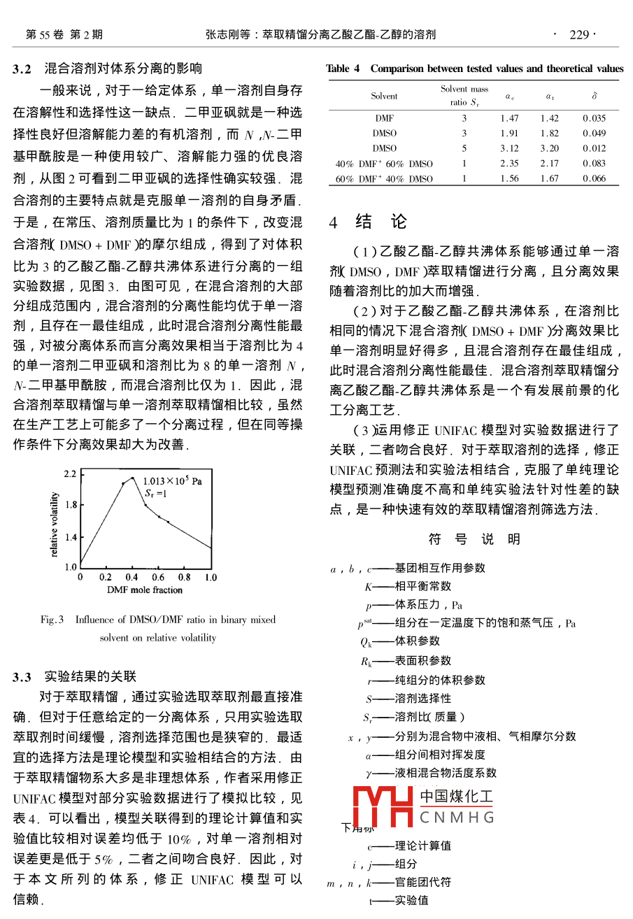 第55卷第2期化工學(xué)Vol 55 No22004年2月Journal of Chemical Industry and Engineering ChinaFebruary 2004研究論文萃取精餾分離乙酸乙酯-乙醇的溶劑222232222222張志剛2張衛(wèi)江楊志才1崔現(xiàn)寶天津大學(xué)化工學(xué)院化學(xué)工程研究所,天津3000氵長(zhǎng)春工業(yè)大學(xué)化工學(xué)院,吉林長(zhǎng)春130012)摘要通過實(shí)驗(yàn)對(duì)萃取精餾分離乙酸乙酯乙醇共沸體系的溶劑選擇進(jìn)行了研究.結(jié)果表明,二元混合溶劑〔N,N二甲基甲酰胺+二甲亞砜舶的分離性能優(yōu)于單一溶劑N,N二甲基甲酰胺或二甲亞砜).運(yùn)用修正UNFA模型對(duì)實(shí)驗(yàn)數(shù)據(jù)進(jìn)行了關(guān)聯(lián),發(fā)現(xiàn)修正UNAC模型預(yù)測(cè)法和實(shí)驗(yàn)法相結(jié)合是一種快速有效的萃取精餾溶劑選擇方法關(guān)鍵詞N,N-二甲基甲酰胺乙酸乙酯乙醇二甲亞砜 UNIFAC溶劑中圖分類號(hào)T0028.1文獻(xiàn)標(biāo)識(shí)碼A文章編號(hào)0438-1157(2004)02-0226-05SOL VENT FOR SEPARATING ETHYL ACETATE-ETHANOIBY EXTRACTIVE DISTILLATIONZHANG Zhigang'2, ZHANG Weijiang, YANG Zhicai and CUI Xianbao'Chemical Engineering Research Center, School of Chemical EngineeringSchool of Chemical Engineering, Changchun Industry University, Changchun 130012, Jilin, ChinaAbstract A number of solvents for separation of ethyl acetate-ethanol were examined in a VLE experiment apparatusThe integrated properties of the solvents were investigated and the experimental data were correlated with the modifiedUNIFAC model. It was found from the results that binary mixed solvents( DMSO + DMF )were superior to single solvent(DMSO or DMF )for separating ethyl acetate-ethanol by extractive distillation. The modified UNIFAC model combinedwith experiments is a rapid accurate approach to selecting the solvent for extractive distillationKeywords N, N-dimethylformamide( DMF), ethyl acetate ethanol dimethylsulfoxide( DMSo ) UNIFAC, solvent規(guī)模偏小,原料單耗高,且存在硫酸腐蝕性強(qiáng)、副反應(yīng)多尤其是副產(chǎn)物處理困難等缺點(diǎn).針對(duì)這種現(xiàn)乙酸乙酯又名醋酸乙酯,簡(jiǎn)稱EA.純物質(zhì)為狀,人們做了大量的研究改進(jìn)工作,主要著手于兩有水果香味的無色透明液體,具有優(yōu)異的溶解性和個(gè)方面∶①開發(fā)固體酸酯化催化劑代替硫酸,如采快干性,是一種應(yīng)用廣泛的有機(jī)化工原料,主要作用沸石分子篩固載的固體酸催化劑3,但迄今為止為溶劑用于涂料、油漆、人造革等產(chǎn)品中門,也作所推岀的催化劑造價(jià)高,活性下降快,還沒有大量為調(diào)香劑組分成為水果香精和奶油等香料的主要原用于工業(yè)化生產(chǎn);②改進(jìn)生產(chǎn)工藝,應(yīng)用萃取精餾料2].目前我國EA生產(chǎn)均采用乙酸乙醇酯化法,分離工藝過程.萃取精餾工業(yè)過程特征是加入第3該傳統(tǒng)方法工業(yè)生產(chǎn)簡(jiǎn)易,設(shè)備投資較少,但企業(yè)組沸盧和沸體系,其技術(shù)關(guān)鍵在于萃取中國煤化工2002-12-28收到初稿,2003-04-28收到修改稿CNMHG聯(lián)系人及第一作者:張志剛,男,35歲,碩士,講師Corresponding author ZHANG Zhigang, master, E-mail zhgzh(@eyou.com第55卷第2期張志剛等:萃取精餾分離乙酸乙酯-乙醇的溶劑227劑的選擇.清華大學(xué)綜合國內(nèi)外現(xiàn)有酯化工藝優(yōu)缺此時(shí)溫度不再變化的塔釜的組成即為平衡液相組點(diǎn)開發(fā)了加鹽萃取精餾技術(shù),但該工藝的缺點(diǎn)在于成.本裝置通過溫度來控制系統(tǒng)操作,共有3個(gè)測(cè)有機(jī)物脫鹽;還有國內(nèi)外應(yīng)用萃取反應(yīng)精餾進(jìn)行酯溫點(diǎn),分別測(cè)量體系的液相溫度、平衡溫度和保溫化的研究也獲得了有啟發(fā)作用的成果471,但由于溫度萃取精餾和反應(yīng)精餾兩個(gè)過程在同一塔中進(jìn)行,各全部實(shí)驗(yàn)試劑均采用市售產(chǎn)品,乙酸乙酯、乙段諸多因素影響的耦合使操作關(guān)系變得更復(fù)雜8],醇、二甲基亞砜、NN-二甲基甲酰胺均為分析純.實(shí)際生產(chǎn)操作難以控制乙酸乙酯-乙醇體系中乙酸乙酯與乙醇的配制體積綜上所述,因?yàn)閭鹘y(tǒng)工藝得到的粗酯中主要副比為x常壓下共沸組成約為25)產(chǎn)品為生產(chǎn)過程中過量的乙醇,含量約為9%9,1.2實(shí)驗(yàn)方法所以本文通過對(duì)萃取精餾乙酸乙酯和乙醇溶劑(有首先將120g加入混合溶劑的乙酸乙酯-乙醇待機(jī)物舶實(shí)驗(yàn)研究考查了一些單一溶劑、混合溶劑分離體系于錐形瓶中混合均勻,靜置一會(huì)兒,觀察及溶劑比對(duì)乙酸乙酯和乙醇共沸體系的影響,并將現(xiàn)象,檢查體系是否完全互溶.然后將瓶中料液完實(shí)驗(yàn)數(shù)據(jù)用 UNIFAC方程( Dortmund)進(jìn)行了關(guān)聯(lián),全倒入加熱釜,向冷凝器通入冷凝水,打開電源開從而為改進(jìn)國內(nèi)生產(chǎn)乙酸乙酯的傳統(tǒng)工藝以及糖廠關(guān),開始加熱.物料沸騰后,上升蒸氣經(jīng)冷凝器冷關(guān)于乙酸乙酯和乙醇的分離技術(shù)提出了新的研究方凝回流到加熱釜,控制平衡溫度與保溫溫度相差為向及有用數(shù)據(jù)±0.5℃,直到加熱釜的溫度和平衡溫度保持基本1實(shí)驗(yàn)部分不變,表示過程達(dá)到穩(wěn)定,維持平衡狀態(tài)1.5h最后分別提取積液槽中的液體樣和加熱釜中的液體1.1實(shí)驗(yàn)裝置及試劑準(zhǔn)備樣,立即進(jìn)行分析實(shí)驗(yàn)裝置如圖1所示,裝置本身主要包括5個(gè)1.3分析條件及