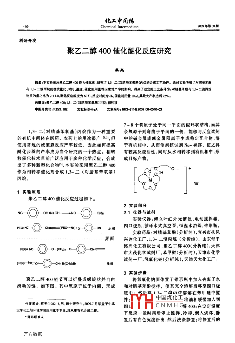 化工中間體Chemical Intermediate2000年第08期科研開發(fā)聚乙二醇400催化醚化反應研究摘要:本實驗采用聚乙二醇400作為催化劑研究了13-二(對腈基苯氧基)丙烷的合成工藝條件。通過實驗考察了對腈基苯酚與13-二溴丙烷的物質量比時間溫度催化劑用量等因素對產(chǎn)率的影響。得到了適宜的工藝條件為:對腈基苯酚與13-二溴丙烷物質的量之比為23:1.0,醚化反應溫度為60℃反應時間為6h,催化劑用量10ml,其最大產(chǎn)率達到72%。關鍵詞聚乙二醇400;1,3-二(對腈基苯氧基)丙烷;相轉移中圖分類號:T23162文獻標識碼:A文章編號:16728142009)080040037~8個氧原子處于同一平面的假環(huán)狀結構,而其1,3-二(對腈基苯氧基)丙烷作為一種重要余氧原子則彎曲于平面的一側,能夠與反應試劑的有機中間體在醫(yī)藥,農(nóng)藥上的用途很廣[,但中的堿金屬或堿金屬陽離子生成穩(wěn)定配合物,溶使用常規(guī)的威廉森反應產(chǎn)率較低,因此如何提高于有機相中,從而使親核試劑№u-棵露,使之具醚化步驟的產(chǎn)率成為當今研究的一個熱點。相轉有較高反應活性,同時從水相轉移到有機相中,形移催化技術目前廣泛應用于多種化學反應,合成成目標產(chǎn)物。出了多種新型化合物叫,本實驗采用聚乙二醇400作為相轉移催化劑合成1,3-二(對腈基苯氧基H丙烷。實驗原理聚乙二醇400催化反應過程如下。0m-2實驗部分2.1儀器與試劑實驗儀器:傅立葉紅外光譜儀,電動攪拌器,km7~c求相四口燒,循環(huán)水式真空,恒溫水浴鍋,德形瓶界面興達化工廠,1,3-二溴丙烷(分析純),山東鄒平銘興化工有限公司,聚乙二醇40(分析純),天津PEG市大茂化學試劑廠,苯甲醚(分析純),天津市化學試劑一廠,氫氧化鈉(分析純),天津天大化工廠PEG№rCN Br(CH2hB3實驗步驟聚乙二醇400鏈節(jié)可以折疊成螺旋狀并自由將氫氧化鈉固體置于錐形瓶中加入去離子水滑動的鏈,如下圖。其中氧原子位于內側,形成和對腈基苯酚攪拌,使其完全溶解后移至四口燒瓶中,后將13--丙驚溶解在苯甲醚中攪拌中國煤化工將油相緩慢加人到作者簡介:蔡亮(1982-),男,碩士研究生,2007月畢業(yè)于中北四口CNMHG醇400在設定溫度大學化工與環(huán)境學院應用化學專業(yè)現(xiàn)從事有機合成工作下反應一段時間后停止攪拌,冷卻,倒人燒杯,靜·通訊聯(lián)系人置后有白色沉淀析出,然后洗滌靜置;將靜置后的第08期聚乙二醇400催化醚化反應研究產(chǎn)物進行真空抽濾,干燥。從圖2中可以看出,當反應溫度為60℃時,醚化產(chǎn)物產(chǎn)率最高。當反應溫度低于60℃時,產(chǎn)4結果與討論物產(chǎn)率隨著溫度的升高而增大,溫度過低則會使4.1影響因素分析反應體系獲得能量不足,影響反應速率和產(chǎn)率。反4.11對腈基苯酚與1,3-二溴丙烷的物質量比應溫度高于60℃時,產(chǎn)率則出現(xiàn)下降趨勢。過高對產(chǎn)率影響和過低的溫度都不利于反應的進行,因此在實驗中選用溫度60℃為宜。4.1.3反應時間對產(chǎn)物產(chǎn)率的影響對基苯酚和1,3-二溴丙烷物質的盤比圖1對腈基苯酚和1,3-二溴丙烷的物質量之比和醚化產(chǎn)物產(chǎn)率關系曲線反應時間/h由圖1可以看出,隨著對腈基苯酚與1,3-二溴內烷物質的量之比的增加,水相的堿濃度相應圖3反應時間對醚化反應產(chǎn)物產(chǎn)率的關系曲線增加可以使其與對腈基苯酚更多接觸,形成酚鈉從圖3可以看出,反應時間在6h之前醚化的速度加快,濃度增大,從而提高反應速率,增加反應產(chǎn)物產(chǎn)率提高較快,8h后繼續(xù)延長反應時間產(chǎn)率。醚化產(chǎn)物的產(chǎn)率呈上升趨勢。當對腈基苯酚則產(chǎn)率有所下降,這可能是因為隨著反應時間的和1,3-二溴丙烷物質的量之比等于23:1.0時,延長,反應物濃度下降,使得反應物之間的碰撞幾產(chǎn)物的產(chǎn)率最大可達72%,此后繼續(xù)增大對腈基率變小,產(chǎn)率降低。同時反應時間過長也會因為苯酚和1,3-二溴內烷物質的量之比,產(chǎn)率有所下1,3-二溴丙烷的水解而使產(chǎn)率降低,并且從實際降,可能是隨著堿用量的增加致使1,3-二溴內烷生產(chǎn)成本考慮反應時間控制在6h為宜。的水解反應占優(yōu)勢。因此確定對腈基苯酚與1,3-4.1.4催化劑用量對產(chǎn)率的影響二溴丙烷最佳物質的量之比為23:1.0。4.1.2反應溫度對產(chǎn)率影響?zhàn)瘎┯昧?a1中國煤化工物產(chǎn)率關系曲線反應溫度/℃CNMHG化劑用量的增加醚化產(chǎn)物時廣皇工廾超努。陽著使用量的加大,催圖2反應溫度和釀化反應產(chǎn)物產(chǎn)率的關系曲線化劑聚乙二醇400與對腈基苯酚接觸越來越多化工中間體42·Chemical Intermediate2009年第08期形成的堿金屬絡合物也越來越多,不斷的進入到有機相中去,使得反應加速進行,產(chǎn)率也增加。催5結論化劑用量超過10ml后產(chǎn)率增加不大,因此從實際本研究采用聚乙二醇400為相轉移催化劑催效果考慮,催化劑用量選用10ml為佳?;瘜﹄婊椒雍铣?3-二(對腈基苯氧基)丙烷,4.2紅外譜圖分析以苯甲醚為溶劑通過正交實驗研究了對腈基苯酚聚乙二醇400催化醚化反應產(chǎn)物的紅外譜與1,3-二溴丙烷物質的量之比、反應溫度、催化圖如下。劑用量和反應時間對醚化產(chǎn)物產(chǎn)率的影響。通過對實驗結果的分析,得出對腈基苯酚醚化反應的最佳工藝條件:對腈基苯酚與1,3-二溴丙烷物質的量之比為2310,醚化反應溫度為60℃,反應時間為6h,催化劑用量1oml,其最