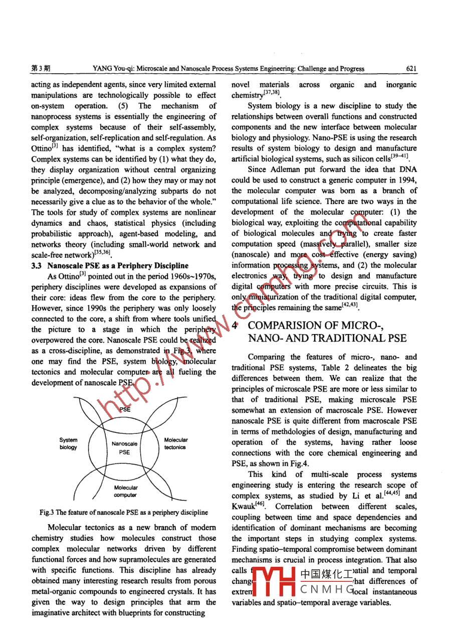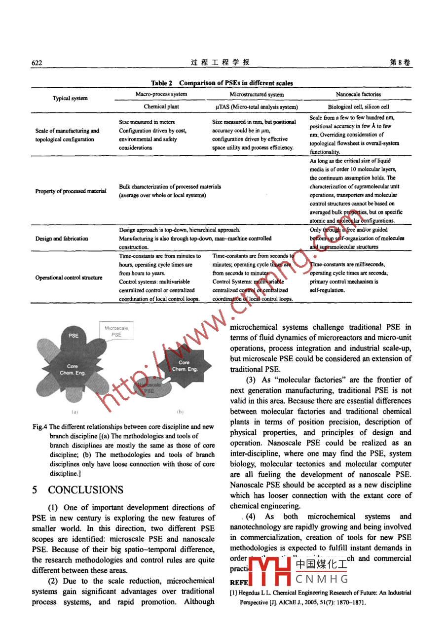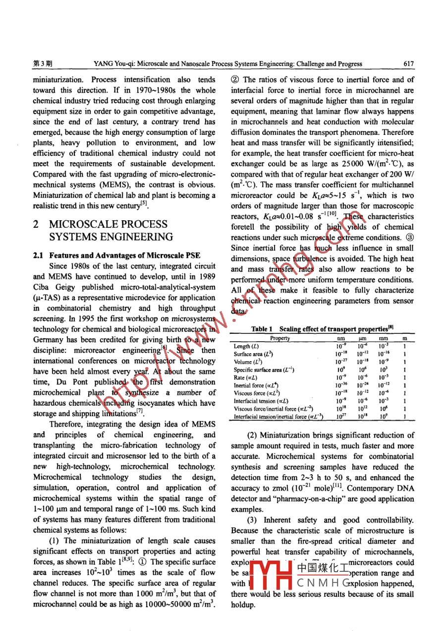 第8卷第3期過程工程學(xué)報(bào)Vol.8 No.32008年6月The Chinese Journal of Process EngineeringJune 2008Microscale and Nanoscale Process Systems Engineering: Challenge and ProgressYANG You-qi (楊友麒)(China National Chemical Information Center, Beijing 100029, China)Abstract: This is an overview of the development of process systems engineering (PSE) in a smaller world. Two diferentspatio-temporal scopes are identified for microscale and nanoscale process systems. Tbe features and challenges for eachscale are reviewed, and different methodologies used by them discussed. Comparison of these two new areas with traditionalprocess systems engineering is described. If microscale PSE could be considered as an extension of traditional PSE, nanoscalePSE should be accepted as a new discipline which has looser connection with the extant core of chemical engineering. Since“molecular factories" is the next frontier of processing scale, nanoscale PSE will be the new theory to bandle the design,simulation and operation of those active processing systems.Key words: process systems engineering; microchemical engineering; nanotechnology; molecular factoryCLC No: TQ021.8Document Code: AArticle ID: 1009- 606X(2008)03- 0616 -091 INTRODUCTION10000Eoolog, Indus pankAccording to Schumpeter's innovation wave theory,100we may now be living in the first half of bio/nan/infoTnodtonl PSEwave. We find there a shortage of knowledge iunderstanding the world of a smaller scale. For instance,Mcroscale PSE0.01in the nanoscale world only since. 1981 we havemanaged to measure the size of an atom cluster on a1E-4Pancscale PsEsurface, and only in 1991 we were able to move atomson a surface. Assembling molecules by physically1 1E-101E-8 1E6 1E4 0.01 1 100 100positioning their component atoms is an issue of theLength scale (m)21st centuryh-. Now we can say that we are enteringFig.1 The dfferent spatio temporal scopes of processan epoch of “molecular processing”. As Hegedus'lsysterns engineering (PSE)pointed out, there is a new overlap between chemicalengineering and chemistry in scales ranging from tensThe development of finechemical andof nanometers to hundreds of micrometers. This newpharmaceutical industries has promoted the demand ofoverlap is the focus of research to fill the knowledgespeedycommercialization of product innovation byvacancy in the small-scale world.shortening the period from laboratory to market.This small-scale world should be divided into two“Making your learming at a small scale and your profitscategories according to their spatial and temporalon a large scale” bas become the commoncharacteristics: microscale processsystems andunderstanding in the process industries. However,nanoscale process systems. Since there is a 1 000-time"learning at a small scale" used to mean lab and pilotdifference spatially between them, the research objects,plants, although now it means microscale and nanoscalemethodologies and dominating rules are quite different.experiments. This not only means that in recent researchThe characteristic length of the former systerms is 1~100environment, innovation could be accormplished muchum (microchannel size) and that of the latter systems isfaster, much cheaper and much better in smaller-scaleabout an nm (supramolecular size), the characteristicfacilities, but also means that many new processtime scale of the former systems is ms and that of thepossibilities could only be implemented in microscalelatter us. The spatial and temporal scopes of traditionalfacilities'process systems engineering (PSE), microscale PSE and中國煤化工re increasinglynanoscale PSE are shown in Fig.1. .challenodularization andYHCNMHGReeived date: 2008- 02- 18; Acepted date: 2008-04 -28Biograpby: YANG Youqi (1935-), male, native of Xiangtan City, Hunan Province, Bacbelor, Professor, major in process systems cogineering,E-mail: yang@pku.edu.cn.第3期YANG You-qi: Microscale and Nanoscale Process Systems Engineering Challenge and Progress617miniaturization. Process intensification also tends②The ratios of viscous force to inertial force and oftoward this direction. If in 1970~1980s the wholeinterfacial force to inertial force in microchannel arechemical industry tried reducing cost through enlargingseveral orders of magnitude higher than that in regularequipment size in order to gain competitive advantage,equipment, meaning that laminar flow always happenssince the end of last century, a contrary trend hasin microchannels and heat conduction with molecularemerged, because the high energy consumption of largediffusion dominates the transport phenomena. Thereforeplants, heavy pollution to environment, and lowheat and mass transfer will be significantly initensified;efficiency of traditional chemical industry could notfor example, the heat transfer coefficient for micro-heatmeet the requirements of sustainable development.exchanger could be as large as 25000 W/(m^."C), asCompared with the fast upgrading of micro-electronic-compared with that of regular heat exchanger of 200 W/mechnical systems (MEMS), the contrast is obvious.(m2."C). The mass transfer coefficient for multichannelMiniaturization of chemical lab and plant is becoming amicroreactor could be KLa≈5~15 s,which is tworealistic trend in this new centurys.orders of magnitude larger than those for macroscopicreactors, Ka~0.01~0.08 s [10. These characteristics2 MICROSCALE PROCESSforetell the possibility of high yields of chemicalSYSTEMS ENGINEERINGreactions under such microscale extreme conditions.③Since inertial force has much less influence in small2.1 Features and Advantages of Microscale PSEdimensions, space turbulence is avoided. The high heatSince 1980s of the last century, integrated circuitand mass transfer rates also allow reactions to beand MEMS have continued to develop, until in 1989performed under more uniform temperature conditions.Ciba Geigy published micro-total-analytical-systemAll of these make it feasible to f