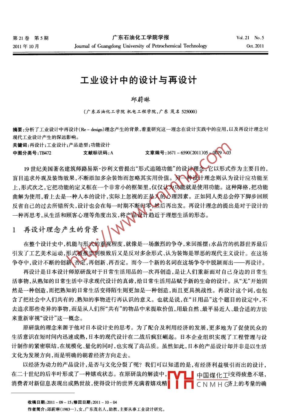 第21卷第5期廣東石油化工學(xué)院學(xué)報Vol.21 No.52011年10月Joumal of Guangdong University of Petrochemical TechnologyOet. 2011.工業(yè)設(shè)計中的設(shè)計與再設(shè)計邱蔚琳(廣東石油化工學(xué)院機電工程學(xué)院,廣東茂名525000)摘要:分析了工業(yè)設(shè)計中再設(shè)計(Re - design)理念產(chǎn)生的背景,著重研究這-理念在設(shè)計實踐中的應(yīng)用,以及再設(shè)計理念對現(xiàn)代工業(yè)設(shè)計產(chǎn)生的深遠影響。關(guān)鍵詞:再設(shè)計;工業(yè)設(shè)計;產(chǎn)品造型;功能設(shè)計中圖分類號:TB472文獻標(biāo)識碼:A文章編號: 1671 - 6590(2011)05 -0079 - 0319世紀(jì)美國著名建筑師路易斯.沙利文曾提出“形式追隨功能”的設(shè)計理念,它以形式作為主要目的,盲目追求外觀及裝飾效果,不斷添加多余裝飾而忽略其實用價值。另-種設(shè)計理念則認(rèn)為設(shè)計應(yīng)功能至上,形式次之,它把功能的定義框在一個非常小的框架里,僅僅認(rèn)為功能就是使用功能。這種降格,把功能曲解為使用,看上去是- -種人本的設(shè)計,實際上忽視的正是人的心理因素。正如同人類總會停下腳步回顧反省自己的過去所錯所失,設(shè)計也會在每一時期不斷歸零,然后再出發(fā)。再設(shè)計理念的提出是對于設(shè)計的一種再思考,從生活和顧客心理等角度出發(fā),將產(chǎn)品設(shè)計趨近于理想生活的形態(tài)。1再設(shè)計理念產(chǎn)生的背景在整個設(shè)計史中,機能與形式的重視程度,就像是一場激烈的爭奪,來回?fù)u擺:水晶宮的機器世界最后引發(fā)了工藝美術(shù)運動,形式被推崇到極致后又是反對多余形式、認(rèn)為裝飾是罪惡的現(xiàn)代主義設(shè)計。在這場爭奪中,設(shè)計不斷的創(chuàng)新、否定,再創(chuàng)新、再否定。而今一個新的名詞在這場爭奪中脫穎而出一再設(shè)計。再設(shè)計是日本設(shè)計師原研哉對于日常生活用品的一次再創(chuàng)造,是讓人們重新面對自己身邊的日常生活事物,從熟知的日常生活中尋求現(xiàn)代設(shè)計的真諦,給日常生活用品賦予新的生命的設(shè)計。從“無”開始固然是一種創(chuàng)造,而把熟知的日常生活變得陌生則更加是一種創(chuàng)造,而且更具挑戰(zhàn)性。再設(shè)計這個詞,也包含了把社會中人們共有的、熟知的事物進行再認(rèn)識的意義。也就是說,在“日用品”這個題目的設(shè)定中,不去追求那些奇異的事物,而是從人們所“共有"的物品中來提取價值,用最自然、最平易近人、最合適的方法來重新審視“設(shè)計”這- -概念。原研哉的理念來源于他對日本設(shè)計史的思考。為了配合及利用經(jīng)濟的發(fā)展,更多地為了促使民眾的生活意識在短時間內(nèi)迅速成熟,日本的現(xiàn)代設(shè)計在二戰(zhàn)后瘋狂崛起。日本企業(yè)組織實現(xiàn)了工程管理與設(shè)計制作的緊密聯(lián)結(jié),在規(guī)?;?、量化的同時,也實現(xiàn)了高品質(zhì)。雖然如此,日本的產(chǎn)品設(shè)計卻并非是以生活文化為發(fā)展方向,而是明確的朝著經(jīng)濟方向走去。以經(jīng)濟為動力的產(chǎn)品設(shè)計,是否與文化分裂了呢?我們可以知道的是,有經(jīng)濟利益吸引而出的設(shè)計,在二十世紀(jì)的后半葉形成了- -種嬉戲狀態(tài)。在原研哉的解讀中,中國煤化工變得疲憊不堪,消費者對新信息表現(xiàn)出成熟世故,使得設(shè)計的世界充滿著嬉戲精;MYHCNMHG濟上的考量的確收稿日期:2011 - 09- 15;修回日期:2011- 10- 04作者簡介:邱蔚琳(1983- -),女,廣 東茂名人,助教,主要從事工業(yè)設(shè)計研究。80廣東石油化工學(xué)院學(xué)報2011年是為設(shè)計的先決條件之一,但是對于經(jīng)濟利益的過度追求,甚至使得設(shè)計變得過于急躁,在尚未成熟的時候就投人使用。如果說設(shè)計的著重點總是為了棄舊及滿足好奇心,那么的遵循的就無非是技術(shù)本身的形式。更關(guān)鍵的是,設(shè)計的加入日益加強了這種傾向。對于此時的設(shè)計形式和功能,設(shè)計師甚至有意識地使其變得易于淘汰,走進“讓今天的東西明天看起來顯舊”的誤區(qū)。與此不同的是,再設(shè)計所認(rèn)為的設(shè)計如何配合功能把商品的使用性能調(diào)整到最適合使用的狀態(tài)。2“虛無”與“世界合理價值”的設(shè)計理念存在于我們生活中的商品形式,不是以嘩眾取寵來創(chuàng)造追捧的忠實消費者,就是以無所不用其極的手段來降低成本。而原研哉所主持的無印良品的概念卻是“虛無”(Emptiness)。在無印良品的廣告設(shè)計中,原研哉把一一個看似空無一物,卻能容納百川的容器取代信息本身,為受眾留出想象的空間(如圖1所示)。也就是以能接受多元解讀的向心力為核心,讓人們可以寄托自己的各種期待。圖1表現(xiàn)虛無空間與其說這是一種設(shè)計形式,不如說這是一種對于消費心理的引導(dǎo)。無印良品的商品設(shè)計,不在于盲目追求低價格或者是高價格,也不在于追求最方便或者是最高級的功用,而是在于追求一種最適合的功能、最適合的低價格。讓消費者在購買和使用商品的時候產(chǎn)生的不是這個最好”或者“這個更好”的想法,而是不論在功能或價格上都擁有“這樣就好’的想法"。這一種商品設(shè)計的根本和“再設(shè)計的設(shè)計理念是一脈相承的,它不是在于