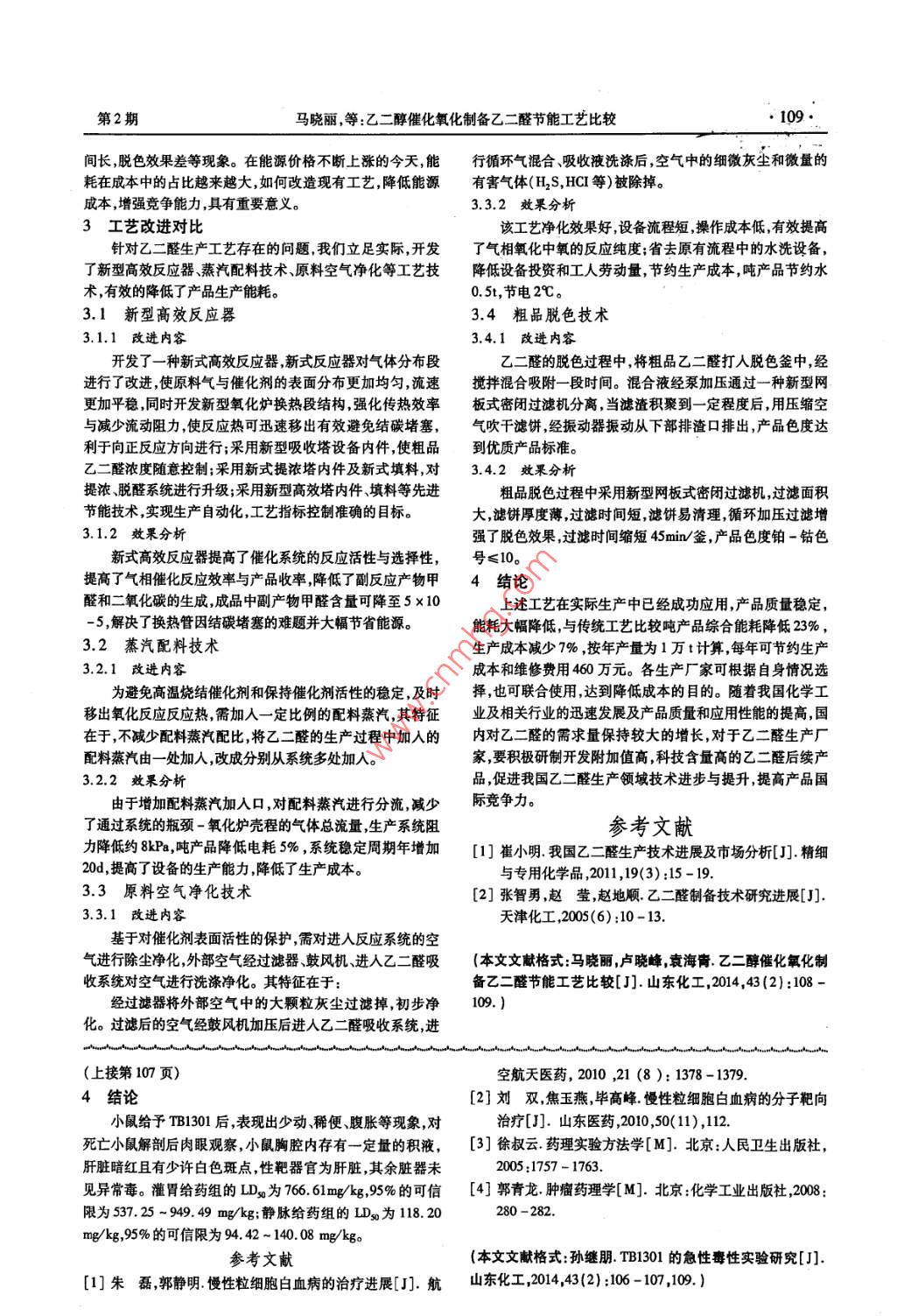 山東化工08SHANDONG CHEMICAL INDUSTRY2014年第43卷乙二醇催化氧化制備乙二醛節(jié)能工藝比較馬曉麗,盧曉峰,袁海青(金沂蒙集團(tuán)有限公司,山東臨沂276700摘要:乙二醛是一種用途十分廣泛的有機(jī)化學(xué)中間體,市場(chǎng)上銷(xiāo)售的產(chǎn)品多是濃度為30-40%的乙二醛水溶液,在紡織印染、建材、皮革、醫(yī)藥農(nóng)藥、國(guó)防涂料、輕工、粘合劑和環(huán)保等方面具有廣泛的應(yīng)用,國(guó)內(nèi)現(xiàn)有生產(chǎn)裝置多采用乙二醇催化氧化工藝,對(duì)于乙二醇氧化工藝降低生產(chǎn)能耗具有重大意義。關(guān)鍵詞:催化氧化;乙二醛;工藝;節(jié)能中圖分類號(hào):TQ224.14文獻(xiàn)標(biāo)識(shí)碼:A文章編號(hào):1008-021X(2014)02-0108-02MEG Preparation Catalytic Oxidation of Glyoxal and Energy Saving TechnologyMA Xiao-li, LU Xiao-feng, YUAN Hai-qingJinyimeng Group Co, Ltd, Linyi 276700, China)Abstract: Glyoxal is a very versatile organic chemical intermediates, the product that sells on the market is moreconcentration of 30 %-40% glyoxal aqueous solution. In textile printing and dyeing, construction materials, leathermedicine, pesticide, defense, coating, light industry, adhesives and environmental protection, it has a wide range ofapplications, Domestic existing production unit with MEG catalytic oxidation process, the oxidation process is of greatsignificance to reduce production energy consumption.Key words: catalytic oxidation; glyoxal; technology, energy saving乙二醛又名草酸醛,是分子結(jié)構(gòu)最簡(jiǎn)單的脂肪族二元程短過(guò)程簡(jiǎn)單不足之處是產(chǎn)品質(zhì)量較差含有一定量的甲醛。作為一種基本化工原料,乙二醛廣泛應(yīng)用于紡織的抗縮醛醇和酸等雜志需要經(jīng)過(guò)進(jìn)一步的純化處理才能滿足醫(yī)抗皺整理劑造紙、石油、冶金炸藥和建筑等工業(yè)上。由于藥等行業(yè)的質(zhì)量要求。乙二醛能選擇吸收任意濃度的二氧化硫,所以它在水處理、1.2乙醛硝酸氧化法洗滌、衛(wèi)生和化妝品工業(yè)上都有廣泛的應(yīng)用。由乙二醛合成乙醛硝酸氧化法是將40%硝酸和40%乙醛溶液按照一的乙醛酸產(chǎn)品可進(jìn)一步合成香蘭素等重要產(chǎn)品。乙二醛是定比例加入到氧化反應(yīng)釜內(nèi),在不同的催化劑作用下,以亞當(dāng)前多種行業(yè)的急需產(chǎn)品加強(qiáng)工藝管理、開(kāi)發(fā)節(jié)能技術(shù)、提硝酸鈉為引發(fā)劑控制反應(yīng)溫度在38-40℃,反應(yīng)10h,常壓高產(chǎn)品質(zhì)量對(duì)促進(jìn)國(guó)內(nèi)乙二醛行業(yè)發(fā)展有十分重要的現(xiàn)實(shí)加熱回收乙醛再通過(guò)反萃取或四級(jí)混合澄清萃取除去乙意義。醛、硝酸、草酸等,最后經(jīng)過(guò)減壓濃縮得到40%的乙二醛水生產(chǎn)方法溶液以乙醛計(jì)的收率約為3%~40%。該方法的優(yōu)點(diǎn)是我國(guó)乙二醛的研究工作始于20世紀(jì)70年代中期近年能耗低、產(chǎn)品中不含甲醛、產(chǎn)品質(zhì)量高能滿足醫(yī)藥及日用化來(lái)發(fā)展較快預(yù)計(jì)到2015年我國(guó)乙二醛總生產(chǎn)能力將超過(guò)工等行業(yè)的要求。缺點(diǎn)是副反應(yīng)多最主要的副反應(yīng)是部分30萬(wàn)va,在世界乙二醛生產(chǎn)中占據(jù)重要地位。目前,乙二乙醛被氧化成醋酸,還有少量目的物乙二醛被進(jìn)一步氧化成醛的生產(chǎn)方法較多有乙炔氧化法乙烯氧化法、草酸還原水乙醛酸和草酸,進(jìn)一步純化處理比較困難另外設(shè)備腐蝕嚴(yán)解法、乙二醇?xì)庀嘌趸耙胰┫跛嵫趸ǖ?。其中工業(yè)生重,三廢較多。產(chǎn)方法主要有乙二醇?xì)庀嘌趸耙胰┫跛嵫趸▋煞N。2乙二醇?xì)庀嘌趸に囍写嬖诘膯?wèn)題1.1乙二醇?xì)庀嘌趸ㄎ覈?guó)現(xiàn)階段乙二醛生產(chǎn)廠家主要采用乙二醇催化氧化乙二醇?xì)庀嘌趸ㄊ且叶┑膫鹘y(tǒng)生產(chǎn)方法是目前我藝該工藝存在綜合能耗高、產(chǎn)品質(zhì)量差、氧化反應(yīng)轉(zhuǎn)化率國(guó)的乙二醛廠家普遍采用該方法進(jìn)行生產(chǎn)。乙二醇預(yù)熱氣低等缺點(diǎn)。各大廠家通過(guò)強(qiáng)化管理優(yōu)化控制系統(tǒng)杜絕跑、化后與循環(huán)氣混合進(jìn)入催化反應(yīng)器,在650-670℃下反冒滴、漏等現(xiàn)象物料消耗無(wú)明顯變化。在工藝生產(chǎn)過(guò)程中應(yīng),產(chǎn)物以水激冷,形成乙二醛水溶液,再經(jīng)過(guò)脫色、真空吸氧化工序存在系統(tǒng)阻力高循環(huán)風(fēng)機(jī)負(fù)荷大等因素導(dǎo)致用電濾等后續(xù)處理過(guò)程得到乙二醛產(chǎn)品。乙二醇的單程轉(zhuǎn)化率量大,進(jìn)而影響原料進(jìn)入系統(tǒng)的總量降低了整套設(shè)備的年為80%-8%。以尾氣循環(huán)量來(lái)調(diào)節(jié)含氧量,產(chǎn)品含乙二生產(chǎn)能力;在凈化原料氣后處理工序存在電能水資源消耗醛濃度一般為30%-40%,該方法原料乙二醇易得、工藝流過(guò)高現(xiàn)象增加生產(chǎn)成本;因過(guò)濾器的缺陷致使產(chǎn)品過(guò)濾時(shí)收稿日期:2013-12-02作者簡(jiǎn)介:馬曉麗(1973—),女,工程師,從事有機(jī)化工產(chǎn)品的研究開(kāi)發(fā)工作。第2期馬曉麗,等:乙二醇催化氧化制備乙二醛節(jié)能工藝比較I09間長(zhǎng)脫色效果差等現(xiàn)象。在能源價(jià)格不斷上漲的今天,能行循環(huán)氣混合、吸收液洗滌后,空氣中的細(xì)微灰塵和微量的耗在成本