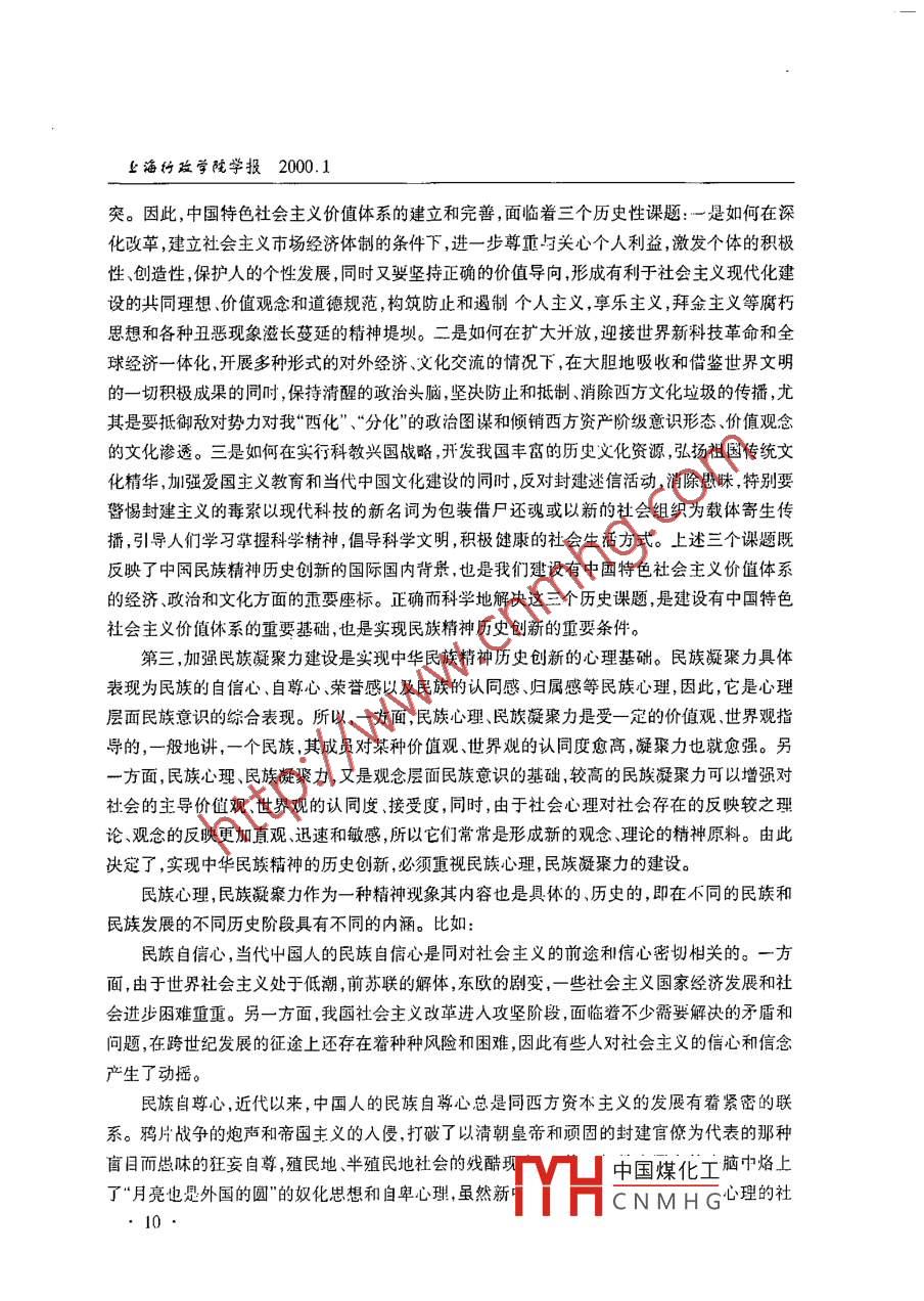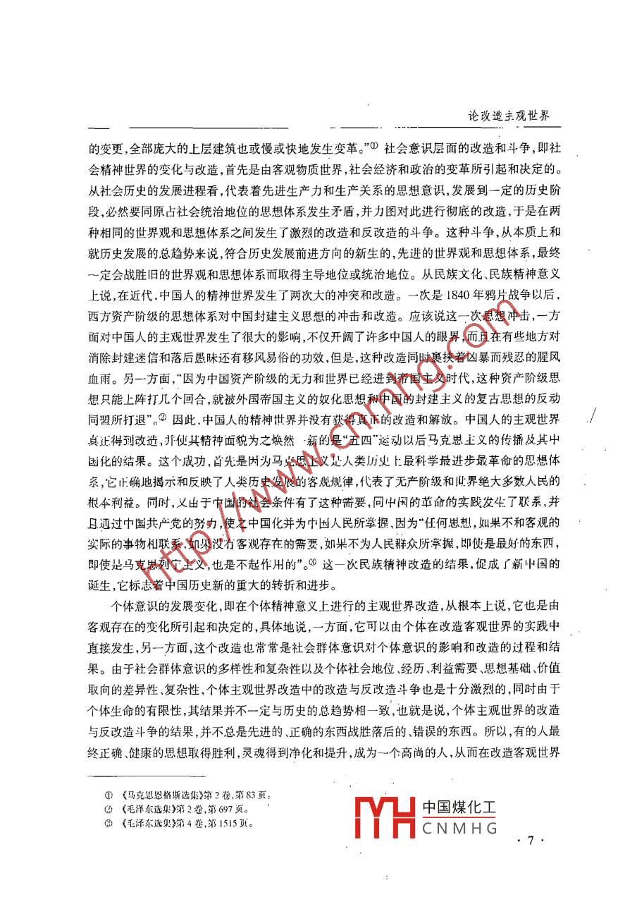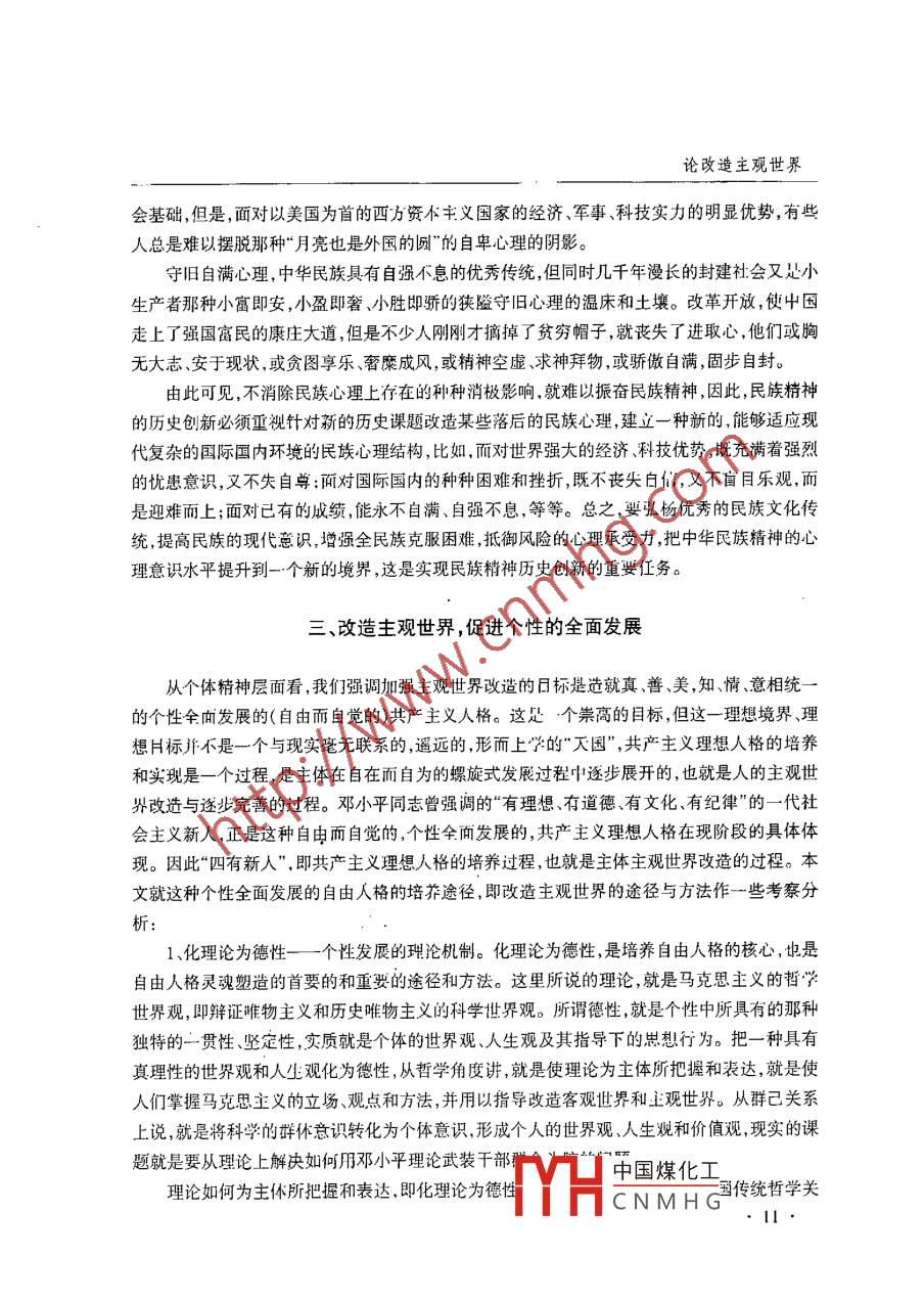 論改造主觀世界奚潔人人類改造世界的任務(wù)包括改造客觀世界和改造主觀世界,它們統(tǒng)一于人們的社會實踐活動,其根本規(guī)律和總體趨勢是:主觀與客觀的具體的、歷史的統(tǒng)-。因此,必須從這-根本規(guī)律和總體趨勢出發(fā)來把握主觀世界改造的本質(zhì)與特征。文章認(rèn)為,主觀世界,從社會意識的主體角庋看,可區(qū)分為群體意識和個體意識,因此,文章分別從群體意識和個體意識兩個不同的視角考察了改造主觀世界的具體內(nèi)涵,并且強(qiáng)調(diào),當(dāng)前加強(qiáng)主觀世界改造從群體意識改造的意義上說,就是要努力實現(xiàn)民族精神的歷史創(chuàng)新;從個體意識改造的意義上說,就是要重視個性的全面發(fā)展,即培養(yǎng)“有理想、有道德、有文化、有紀(jì)律”的社會主義一代新人。文章結(jié)合上述觀點,對個體主觀世界改造的途徑和方法進(jìn)行了理論述。作者:奚潔人男1947年生上海行政學(xué)院教授副院長關(guān)鍵詞:主觀世界民族精神個性發(fā)展馬克思的名言:“哲學(xué)家們只是用不同的方式解釋世界,而問題在于改變世界”。毛澤東則在他著名的《實踐論》中對“改變世界“的內(nèi)容作了哲學(xué)上的進(jìn)一步闡釋,他指出:“無產(chǎn)階級和革命人民改造世界的斗爭,包括實現(xiàn)下述的任務(wù):改造容觀世界,也改造自己的主觀世界改造自己的認(rèn)識能力,改造主觀世界與客觀世界的關(guān)系?!Р?qiáng)調(diào),“世界到了全人類都自覺地改造自己和改造世界的時候,那就是世界的共產(chǎn)主義時代”。②可見,改造自己的主觀世界,并且不斷地提高這種改造的白覺程度,是無產(chǎn)階級和革命人民改造世界,實現(xiàn)自己最崇高的共產(chǎn)主義理想的題中應(yīng)有之義,也是馬克思主義哲學(xué)的崇高使命。①《馬克思恩格斯選集》第1卷,第19頁,人民出版社1960年中國煤化工②《東選集》第ⅰ卷,第296頁,人民出辰社1993年版CNMHG上海行政學(xué)院學(xué)報2000.1、改造主觀世界實現(xiàn)主觀與客觀的具體的歷史的統(tǒng)主觀世界,是指人的思想觀念、意識和心理等,也稱為精神世界??陀^世界,是指在人們的意識之外獨立存在的物質(zhì)世界,包括自然界和社會。因此,同意識和物質(zhì)的概念一樣,主觀世界和客觀世界這兩個概念是對整個世界的高度抽象和概括。辯證唯物主義強(qiáng)訓(xùn)客觀世界是離開人的意識而獨立存在,不以人的意志為轉(zhuǎn)移的客觀實在,而主觀世界則是客觀世界在人腦中的能動的反映因此,一方面,隨著客觀世界的變化發(fā)展,主觀世界要對這種變化發(fā)展作出反映,所以,主觀世界的被改變、被“改造”具有客觀必然性。另一方面,主觀世界的變化和“改造”。特別是當(dāng)這種變化和改造的結(jié)果達(dá)到一定的自覺程度,即形成了反映一定歷史發(fā)展規(guī)徘的思想觀念和科學(xué)理淪的時候,這些成果,不僅對于改造客觀世界,而且對于人們自己的主觀世界改造都具有巨大的能動作用。需要強(qiáng)調(diào)指出的是改造主觀世界,無論是被動的改造,還是自覺的改造,其根本規(guī)律和總體趨勢是達(dá)到主觀與客觀的具體的、歷史的統(tǒng)一。正是在這種主客觀之問的雙向互動中實現(xiàn)社會的發(fā)展和人類的進(jìn)步,也就是說,客觀世界由自在之物變?yōu)闉槲抑锱c主觀世界(精神主體)由自在變?yōu)樽詾槭且粋€統(tǒng)一的歷史過程。認(rèn)識與把握主觀世界與客觀世界之間的這一根本規(guī)律,可以使我們在改造主觀世界中減少目性,提高自覺性:一是明確目的性,即強(qiáng)調(diào)我們是出于推進(jìn)客觀世界的改造和提高自身素質(zhì)的雙重目的,而究主觀世界的改造問題。二是強(qiáng)調(diào)實踐性,即不能離開客觀世界的改造而孤立、抽象地談?wù)撝饔^世界的改造問題,必須堅持在改造客觀世界的同時改造主觀世界的觀點。三是強(qiáng)調(diào)階段性,即必須從實際出發(fā)確定改造主觀世界的目標(biāo)和任務(wù),實事求是地評價主觀世界改造的實際成果,使主觀世界改造和客觀世界改造達(dá)到辯證的統(tǒng)一在社會意識領(lǐng)域從主體方面來說就涉及到群體意識和個體意識的關(guān)系問題。群體意識是指社會意識民族精裨、階級意識等,個體意識是指個體的自我意識精神世界,是具體存在的各有個性特點的精神主體。馬克思主義認(rèn)為,人的精神活動是個體的活動但人與人之間的社會聯(lián)系,又形成了人的群體意識。群體意識存在于個體意識之中離不開個別的精神主體同時一個個精神主體的意識,又總是群體意識這樣那樣的表現(xiàn)。群體意識和個體意識之間,一方面是互相聯(lián)系、互相影響,并在一定的條件下可以互相轉(zhuǎn)化另一方面,它們的發(fā)展變化仍有各自不同的許多特點,因此,下面我們分別加以分析群體意識的發(fā)展變化,即在社會群體意識意義上進(jìn)行的主觀世界改造。根據(jù)馬克思,恩格斯曾反復(fù)闡明的那個基本原理,“每一歷史時代主要的經(jīng)濟(jì)生產(chǎn)方式與交換方式以及必然由此產(chǎn)生的社會結(jié)構(gòu),是該時代政治的和精神的歷史所賴以確立的基礎(chǔ)”,并且“隨著經(jīng)濟(jì)基礎(chǔ)中國煤化工①《瑪克思恩格斯選集凈第1巷,第237頁。CNMHG論改造