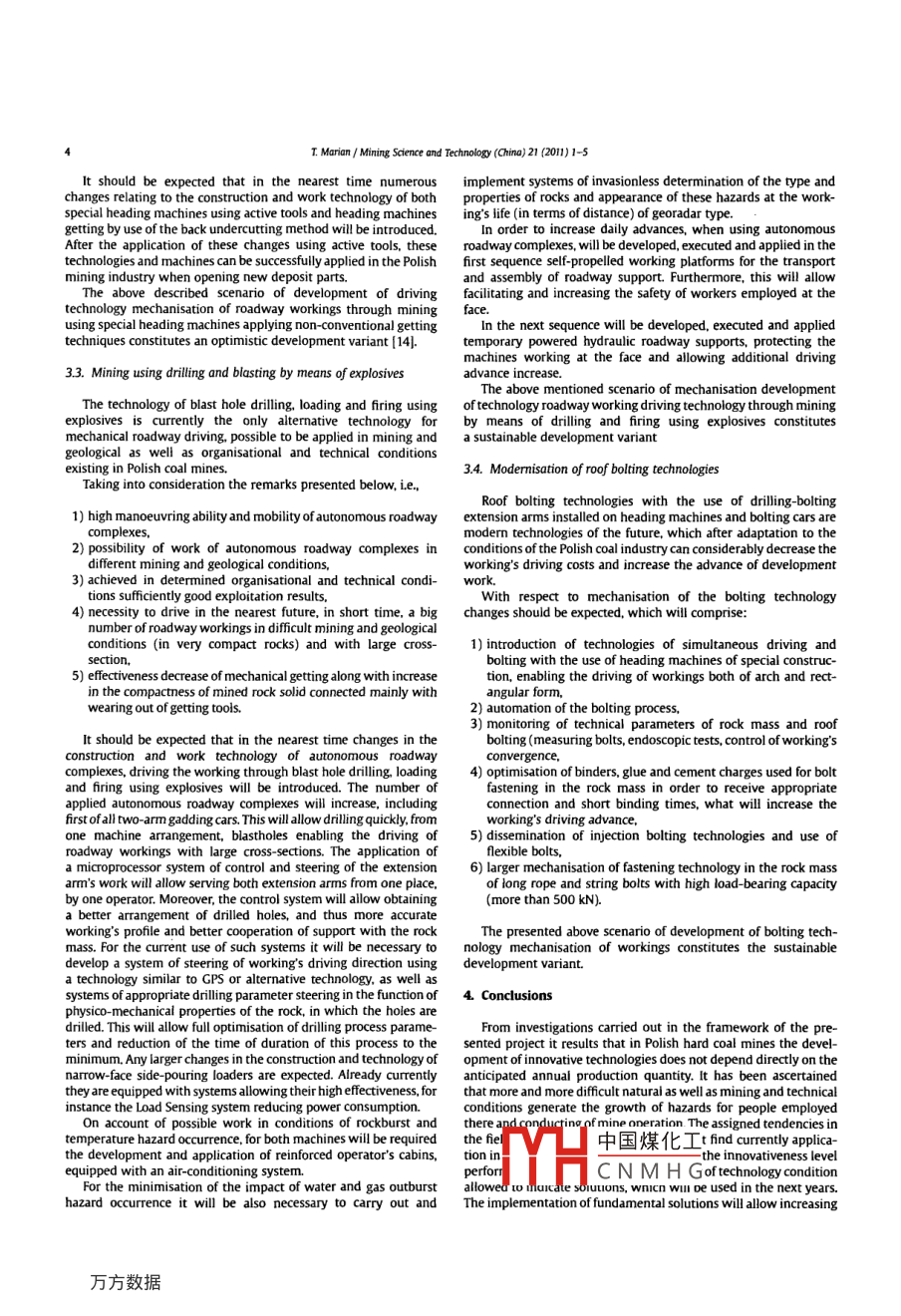 Mining Science and Technology(China)21(2011)1-5Contents lists available at Science DirectMining Science and Technology(China)ELSEVIERjournalhomepagewww.elsevier.com/locate/mstcDirections of changes of hard coal output technologies in PolandTurek marianCentral Mining institute, 40-166 Katowice, PolandARTICLEINFOABSTRACTThe author presents the results being the effect of the analysis of innovative rate of indivcepted 3 August 2009project: scenarios of technological development of hard coal extractive industry". Afteopening up, development and extraction technologies that are applied in polish hard coalheir classification with regard to innovation degree the author desomanner. He brings attention to the most effective systems for hard coal deposits'opening up, devel-opment and their extraction, including the extraction of the residual coal. The attention is also paid to thesafety level of the applied technologies.Copyright e 2011, China University of Mining Technology All rights reserved.1. IntroductionThe technologies counted among the time period until 2015constitute the optimistic variant of development of the hard coalThe presented analysis of innovativeness of individual technol- mining sector. The technologies implemented with lower intensity.ogies of the hard coal production process was carried out in the ie until 2020 constitute the variant of sustainable development offramework of the project entitled "Scenarios of technological hard coal mining Technologies counted among the time perioddevelopment of hard coal extractive industry"[1. In the framework after 2020 constitute the pessimistic vision of the mining sectorof conducted investigations the division into the following tech- development 5).nological areas was performed(Fig. 1)(21Among the variants of optimistic scenarios of development ofFor individual technological areas the corresponding with them underground deposit extraction technology were counted (Table 1)hnologies were presented according to their innovativeness 16.7)degree with the division into disseminated and development techAmong variants of sustainable and pessimistic scenarios ofnologies. The following innovativeness criteria were adopted [3]development of underground deposit extraction technology werecounted (Table 2)181)2B-Disseminated technologies, medium innovativeness level.2)2C-Disserminated technologies, high innovativeness level3)1A-Development technologies, low innovativeness level.4)1B-Development technologies, medium innovativeness leveL, 2. Extraction technologies5)1C-Development technologies, high innovativeness level.The optimistic variants of extraction technologies constitute theFor each technology group the following time periods of most effective systems for hard coal deposits and extraction ofimplementation of distinguished innovative technologies were remainders.gled out (41The basic systems of hard coal deposit extraction in Poland willemain longwall systems of different forms, with the distinct1)until 2010.2)until 2015The main directions of longwall system development will aim at3)until 2020 andthe improvement of system effectiveness and safety level through4)after 2020.1)improvement of reliability of individual equipment elements,·TeL:+4832258613mturekegig.eu.中國煤化工 lon of self-slIdeable dam1674-5264/5- see front matter Copyright e 2011, China University of Mining Technology.CNMHGdoi:101o16/mstc200908001T, Marian/ Mining Science and Technology( China)21(2011)1-5TECHNOLOGIESIn the sustainable variant of development of extraction tech-nologies possible to implement until 2020 the following technol-1)Fundamental directions of development of short-frend systems will to a high extent be in line with theassumed for longwall systems, however, there wiadditional fields of activities such as [111a)development of a getting system using one -organ cutter-loaders with increased capacity.b)determination of possibilities, determinants and technolo.es to conduct operations in conditions of a shoi0-30 m)"blind working2)The thick seam deposits of the saddle group in areas that do notequire surface protection should become in the nearest future專|53Ehe terrain for operational testsly the openSignificant is the fact that these systems were and are effec-d for coal seam extraction in the etan orChinese mining industry, often also in difficult mining andFig. 1. Technological areas.geological conditions.Basing on European experience there exist the possibility to3)development of the plough technique for the needs of extrac. start in the polish mining industry operational tests to use thetion of seams with thickness below 1.5 mlongwall sublevel caving system and open end-sublevel caving4)modification of driving and improvement of maintaining of system. Detailed analyses will require some elements of thisgate roads including crossings with the longwalltechnology mainly connected with occupational safety and mined5)improvement of thick coal size yield.coal contamination. To them belong among others[1216)better adaptation to natural hazard conditions, especially 1) assessment of impact of this system on the fire and rockburst7)use of remote steering systems and automatics.hazard increase and indispensable prevention scope relating tothese hazardsRemainder deposits, located within pillars and seam parts with 2)modification of construction of powered(sublevel cavingirregular forms will gradually force the use of short-front systemsrelated) support with respect to geological and mining condiespecially open end systems (pillar-open end)and roadway 3) development of an effective system of mined coal trans-portation from the longwall using one or two chain conveyors1)possibility to use the known and commonly applied mechabasing on the analysis of deposit use coefficient and mined coalnisation of mining operations,2)considerable elasticity from the aspect of adaptation tochangeable mining and geological conditions of coal seamIn spite of high innovativeness, am