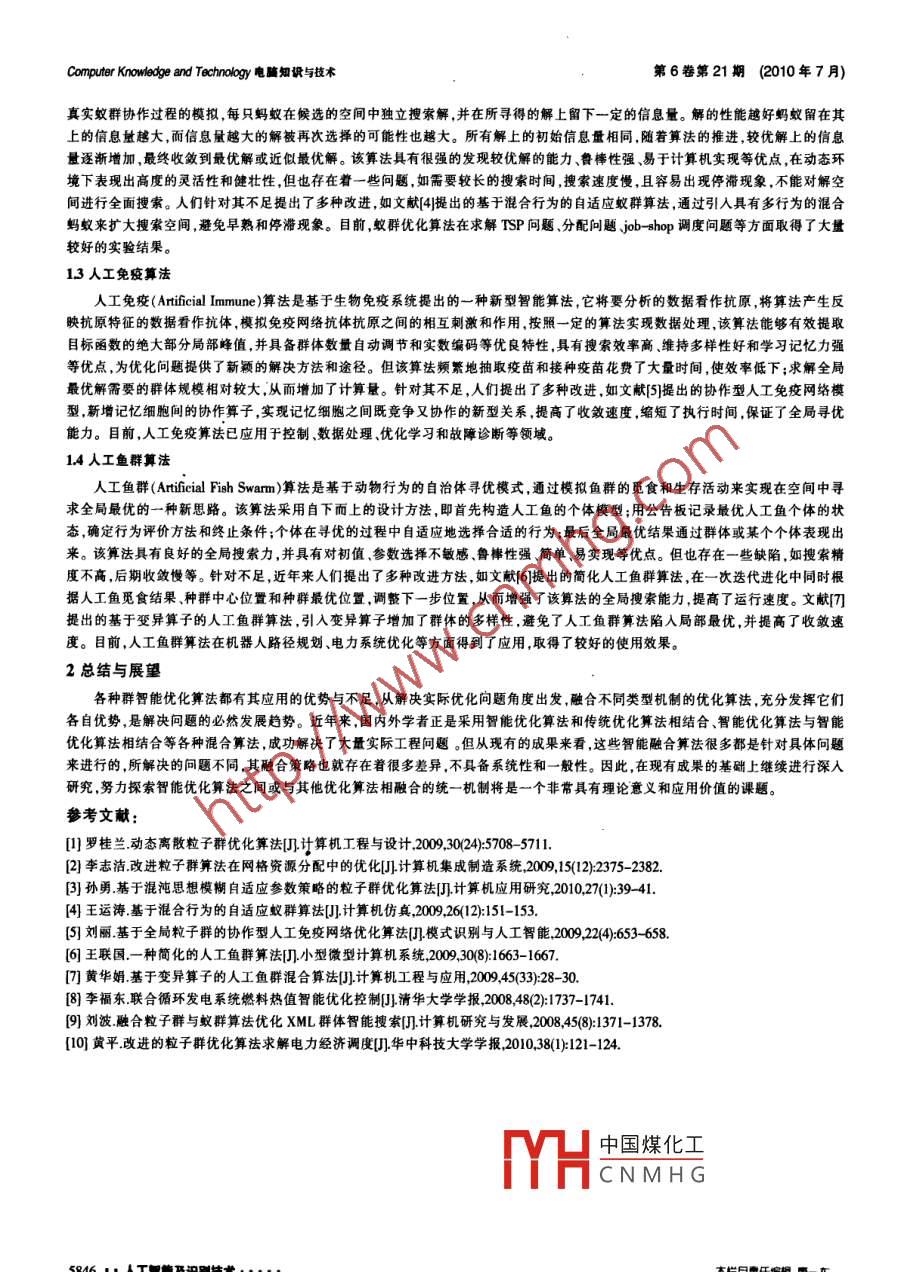 ISSN 1009 3044E-mail: eduf@cce.nel.cnComputer Knowleoge and Technology電脯知識與技術(shù)htp:/://ww dnzs.net.cnVol6,No.21, July 2010, pp.5845-5846Tel:+86- -51- -5690963 5690964群智能優(yōu)化算法研究王大將,蔡瑞英",徐新偉|(1.南京陸軍指揮學(xué)院作戰(zhàn)實(shí)驗(yàn)中心,江蘇南京210045 ;2.南京T業(yè)大學(xué)信息科學(xué)與工程學(xué)院,江蘇南京2100090)摘要:群智能優(yōu)化算法是一種新型的優(yōu)化算法。該文介紹了幾種常見的群智能優(yōu)化算法,包括粒子群優(yōu)化算法、蟻群優(yōu)化算法、人工免疫算法、人工魚群算法,分析了它們的優(yōu)缺點(diǎn)及使用情況,提出了群智能優(yōu)化算法的發(fā)展方向。關(guān)鍵詞:智能優(yōu)化算法;粒子群優(yōu)化算法;蟻群優(yōu)化算法;人工免疫算法;人工魚群算法中圈分類號:TP18文獻(xiàn)標(biāo)識碼:A文章編號:1009 3044(2010)21- -5845- 02Research on Swarm Intelligence Optimization AlgorithmWANG Da-jiang', CAI Rui- ying, XU Xin-weil(1.Army Command College, Experimental Operations Center, Nanjing 210045,China; 2.Nanjing Univenity of Technology, InformationScience and Engineering. Najing 210009, China)Abstract: Intelligence optimization algorithm is a new type optimization algorithm. This paper presents several common Swarm optimiza-tion algorithms, such as particle swarn optimization algorithm, ant colony optimization algorithm, artificial immune algorithm and artificialfish swarmn algorithm, suggests evolutional trend of itelligegnce optimization algorithm based on analyzing charcterstis.Key words: itelligence optimizarion algoithm; particle swarm opinization algorithm; ant colony optimization algorithm; arifcial im-mune algorithm; artifcial fish swarm algorithm優(yōu)化算法的研究是優(yōu)化技術(shù)研兗的關(guān)鍵內(nèi)容,它基于某種思想和機(jī)制,通過一定的途徑或規(guī)則來得到滿足用戶要求的問題的解。傳統(tǒng)的優(yōu)化算法有線性規(guī)劃和非線性規(guī)劃法動態(tài)規(guī)劃法、網(wǎng)絡(luò)流優(yōu)化算法等,其算法復(fù)雜度一般很大,只適于求解小規(guī)模向題,在實(shí)際工程中往往不適用。20世紀(jì)80年代以來,一種新穎的優(yōu)化算法.如遺傳算法、模擬退火算法、蟻群算法、粒子群算法.人工免疫算法及其混合優(yōu)化策略等,通過模擬或揭示某些自然現(xiàn)象或過程面得到發(fā)展,為那些傳統(tǒng)優(yōu)化技術(shù)難以處理的組合優(yōu)化問題提供了切實(shí)可行的解決方法。在優(yōu)化領(lǐng)城,由于這些算法構(gòu)造的直觀性與自然機(jī)理.因此通常稱作智能優(yōu)化算法。1群智能優(yōu)化算法智能優(yōu)化算法是模擬自然界生物系統(tǒng),各個生物體依賴自身的本能.通過無意識的進(jìn)化、尋優(yōu)行為來優(yōu)化生存狀態(tài),以適應(yīng)環(huán)境的依賴優(yōu)化方法,具有許多與傳統(tǒng)優(yōu)化算法不同的特點(diǎn)。智能優(yōu)化算法根據(jù)其中個體的數(shù)量.可分為基于個體的和基于群的兩種,如,模擬退火算法是基于個體的,而蟻群優(yōu)化算法粒子群優(yōu)化算法、人工免疫算法和人工魚群算法是基于種群的。以下對幾種常用的群智能優(yōu)化算法作簡要研究。1.1粒子群優(yōu)化算法粒子群優(yōu)化(Particle Swarm Opimization,PSO)算法是J.Kennedy和R.C.Eberhart 于1995年提出的- -種高效的群集智能協(xié)同優(yōu)化算法,其基本思想來源于對鳥群社會模型的研究及行為模擬,以個體的協(xié)作與競爭來完成對復(fù)雜搜索空閫內(nèi)優(yōu)解的搜索.即所有粒子根據(jù)個體經(jīng)驗(yàn)和群體經(jīng)驗(yàn)不斷調(diào)整自已的速度和位置,朗著個體最優(yōu)和群體最優(yōu)的目標(biāo)飛行來完成更新優(yōu)化,具有概念簡單,收斂速度快,可調(diào)參數(shù)少等優(yōu)點(diǎn),非常適用于復(fù)雜環(huán)境中的優(yōu)化問題求解。但粒子群算法在后期難以維持種群的多樣性,而且易陷人局部極值。自提出以來,很多研究者從參數(shù)設(shè)置收斂性、拓?fù)浣Y(jié)構(gòu)、與其它算法融合等角度對傳統(tǒng)PS0進(jìn)行研究,并針對其不足提出了各種改進(jìn).以提高算法性能。如文獻(xiàn)[1]提出的動態(tài)離散粒子群優(yōu)化算法較好地解決了動態(tài)環(huán)境下離散優(yōu)化問題。文獻(xiàn)[2]提出的并行粒子群優(yōu)化算法,較好地解決了網(wǎng)絡(luò)系統(tǒng)中具有異構(gòu)性和動態(tài)性的資源分配優(yōu)化問題。文獻(xiàn)[3]基于混沌思想模糊自適應(yīng)參數(shù)策略的粒子群優(yōu)化算法,有效提高了算法的收斂速度.改善了多維空間的全局搜索能力。目前,PSO已經(jīng)廣泛的應(yīng)用于函數(shù)優(yōu)化,人工神經(jīng)網(wǎng)絡(luò)訓(xùn)練,模式識別,模糊控制、車輛調(diào)度等領(lǐng)城。1.2蚊群優(yōu)化算法蟻群優(yōu)化(Ant Colony Opimization, ACO)算法是根據(jù)自然界中螞蟻群體尋優(yōu)的行為提出來的一種全局啟發(fā)式優(yōu)化算法,它是對中國煤化工收稿日期:2010-05-12基金項(xiàng)目;江蘇省高校自然科學(xué)基金(05K]JB520048)MHCNMHG作者簡介:王大將(1983-),女,南京陸軍指揮學(xué)院作戰(zhàn)實(shí)驗(yàn)中心講師,研究方向?yàn)閿?shù)據(jù)挖掘,智能決策;蔡瑞英(1950-),女,南京工業(yè)大學(xué)信息科學(xué)與工程學(xué)院教授,研究方向?yàn)橛嬎阒悄?虛擬制造;徐新偉(1984-),男,南京陸軍指揮學(xué)院圍書館助理館員,研