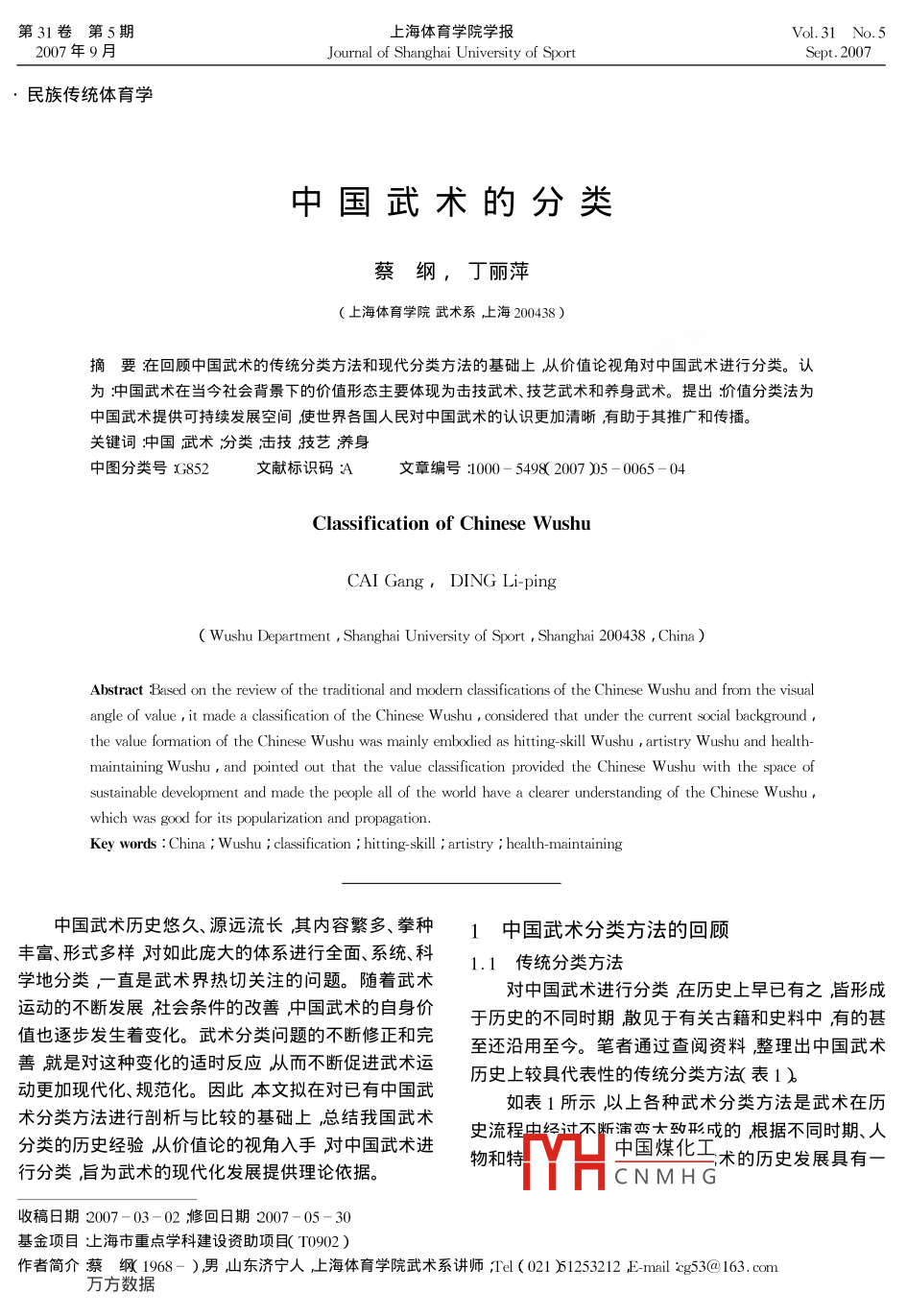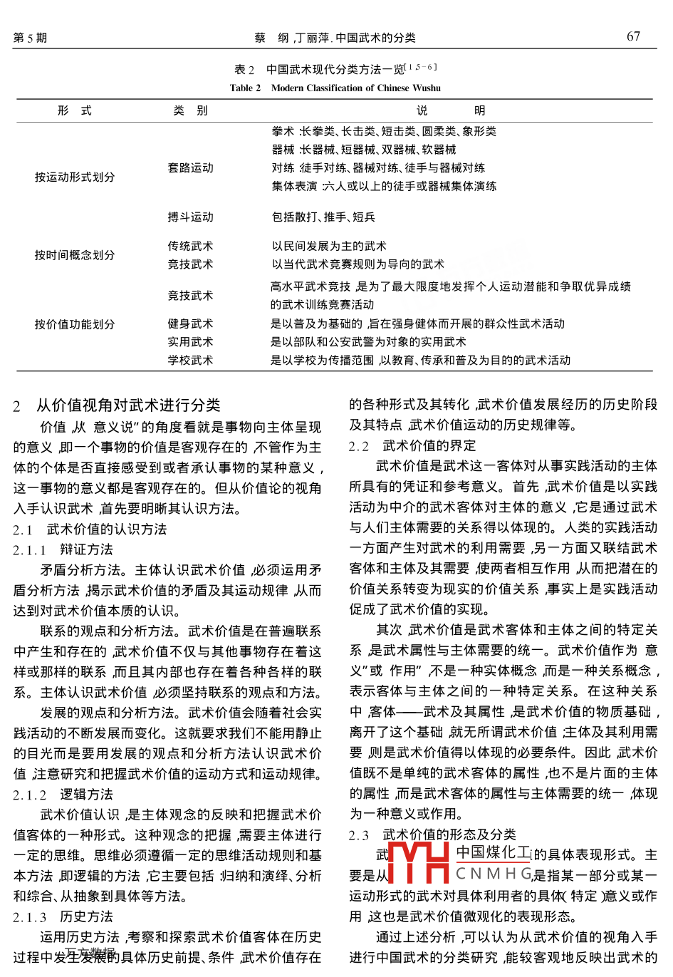 第31卷第5期上海體育學(xué)院學(xué)報o.31No.5207年9月Journal of Shanghai University of SportSept 2007民族傳統(tǒng)體育學(xué)中國武術(shù)的分類蔡綱,丁麗萍(上海體育學(xué)院武術(shù)系,海200438)摘要在回顧中國武術(shù)的傳統(tǒng)分類方法和現(xiàn)代分類方法的基礎(chǔ)上從價值論視角對中國武術(shù)進行分類。認(rèn)為沖國武術(shù)在當(dāng)今社會背景下的價值形態(tài)主要體現(xiàn)為擊技武術(shù)、技藝武術(shù)和養(yǎng)身武術(shù)。提出價值分類法為中國武術(shù)提供可持續(xù)發(fā)展空間使世界各國人民對中國武術(shù)的認(rèn)識更加清晰有助于其推廣和傳播。關(guān)鍵詞中國武術(shù)汾類油技技藝養(yǎng)身中圖分類號852文獻標(biāo)識碼∶文章編號:1000-5498(2007)5-0065-0Classification of chinese wushuCAI Gang, DING Li-pingWushu Department, Shanghai University of Sport, Shanghai 200438, ChinaAbstract Based on the review of the traditional and modern classifications of the Chinese wushu and from the visualgle of value it made a classification of the Chinese Wushu considered that under the current social backgroundthe value formation of the Chinese Wushu was mainly embodied as hitting-skill Wushu artistry Wushu and health-maintaining Wushu and pointed out that the value classification provided the Chinese Wushu with the space ofsustainable development and made the people all of the world have a clearer understanding of the Chinese Wushwhich was good for its popularization and propagationKey words: China Wushu classification hitting-skill i artistry health-maintaining中國武術(shù)歷史悠久、源遠(yuǎn)流長其內(nèi)容繁多、拳種1中國武術(shù)分類方法的回顧豐富、形式多樣對如此龐大的體系進行全面、系統(tǒng)、科1.1傳統(tǒng)分類方法學(xué)地分類,一直是武術(shù)界熱切關(guān)注的問題。隨著武術(shù)對中國武術(shù)進行分類在歷史上早已有之,形成運動的不斷發(fā)展社會條件的改善中國武術(shù)的自身價于歷史的不同時期散見于有關(guān)古籍和史料中有的甚值也逐步發(fā)生著變化。武術(shù)分類問題的不斷修正和完至還沿用至今。筆者通過查閱資料整理出中國武術(shù)善就是對這種變化的適時反應(yīng)從而不斷促進武術(shù)運動更加現(xiàn)代化規(guī)范化。因此本文擬在對已有中國武歷史上較具代表性的傳統(tǒng)分類方泫表1)術(shù)分類方法進行剖析與比較的基礎(chǔ)上總結(jié)我國武術(shù)如表1所示以上各種武術(shù)分類方法是武術(shù)在歷分類的歷史經(jīng)驗從價值論的視角入手對中國武術(shù)進建中經(jīng)過不斷瀋戀大致形成的根據(jù)不同時期、人史流中國煤化工行分類旨為武術(shù)的現(xiàn)代化發(fā)展提供理論依據(jù)。術(shù)的歷史發(fā)展具有CNMHG收稿日期2007-03-02修回日期2007-05-30基金項目止上海市重點學(xué)科建設(shè)資助項目(T0902作者簡介蔡綱1968-)男山東濟寧人上海體育學(xué)院武術(shù)系講師;el(021)61253212Emil!g53@163.cm上海體育學(xué)院學(xué)報第31卷定的概括性。然而可以清楚地看出以上分類由于受面即僅僅呈現(xiàn)出武術(shù)的部分內(nèi)容而不能概括武術(shù)的到歷史條件的制約而存在著不同程度的缺陷如在分整體內(nèi)容如因其師承、技術(shù)特點的不同而以姓氏命名類中表現(xiàn)出過于單一、籠統(tǒng)的特點而且在所分類別中分化出流派這種分類方法還滯留在較低的表面層次也存在著從內(nèi)容到說明較模糊不清、概括不全的跡象。上并不能把武術(shù)的全貌以整體形式表現(xiàn)岀來。與此同時從整體性來看這些分類方法都相對過于片表1中國武術(shù)傳統(tǒng)分類方法一覽Table 1 Traditional Classification of Chinese wushu楊家槍、馬家槍、石家槍等按姓氏劃分、楊、孫、吳、武氏太極拳等以套路創(chuàng)始人之姓氏等命名洪、劉、蔡、李、莫家拳等按拳術(shù)特點劃分長拳類遐舉遙擊、進退急速、大開大合、松長舒展類拳術(shù)短打類貼身近戰(zhàn)、勢險節(jié)短、動作幅度小、短促多變?nèi)g(shù)外家拳以少林拳為主其特點是主于搏人按內(nèi)外家劃分內(nèi)家拳內(nèi)家拳特點是以靜制動后發(fā)制」南派武術(shù)重視下盤功夫,上肢動作小巧多變講究以聲催力按地域劃分北派武術(shù)動作大開大合粗獷豪放直出直入黃河流域武術(shù)舒展大方柔和飄逸跌撲激烈按流域劃分冮流域武術(shù)講究小部位動作并融合民間舞蹈成分珠江流域武術(shù)動作多剛硬講究小部位動作少林派按山脈劃分武當(dāng)派以山得名峨眉派按門派劃分除太極拳、八卦掌、形意拳外的其他拳技武當(dāng)門太極拳、八卦掌、形意拳1.2現(xiàn)代分類方法在向多元化發(fā)展。4y因而提出了按照價值功能將武新中國建國至20世紀(jì)70年代武術(shù)分類法著重術(shù)劃分為4類的方法。于對各拳術(shù)技術(shù)特點的分類。鑒于當(dāng)時武術(shù)運動開展從表2可看出按運動形式、時間概念、價值功能的情況其內(nèi)容只限于套路運動這一單一形式。從武與類別分類雖然較之前述的分類更科學(xué)和規(guī)范把中術(shù)搏斗運動形式于20世紀(jì)70年代未恢復(fù)以來武術(shù)國武術(shù)的基本內(nèi)容進行了分析與歸納但也存在了分類又有了新的變化即把中國武術(shù)分為2種形式、內(nèi)定的問題如《中國武術(shù)教程》雖然提出現(xiàn)代武術(shù)