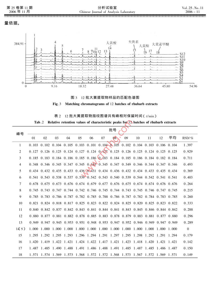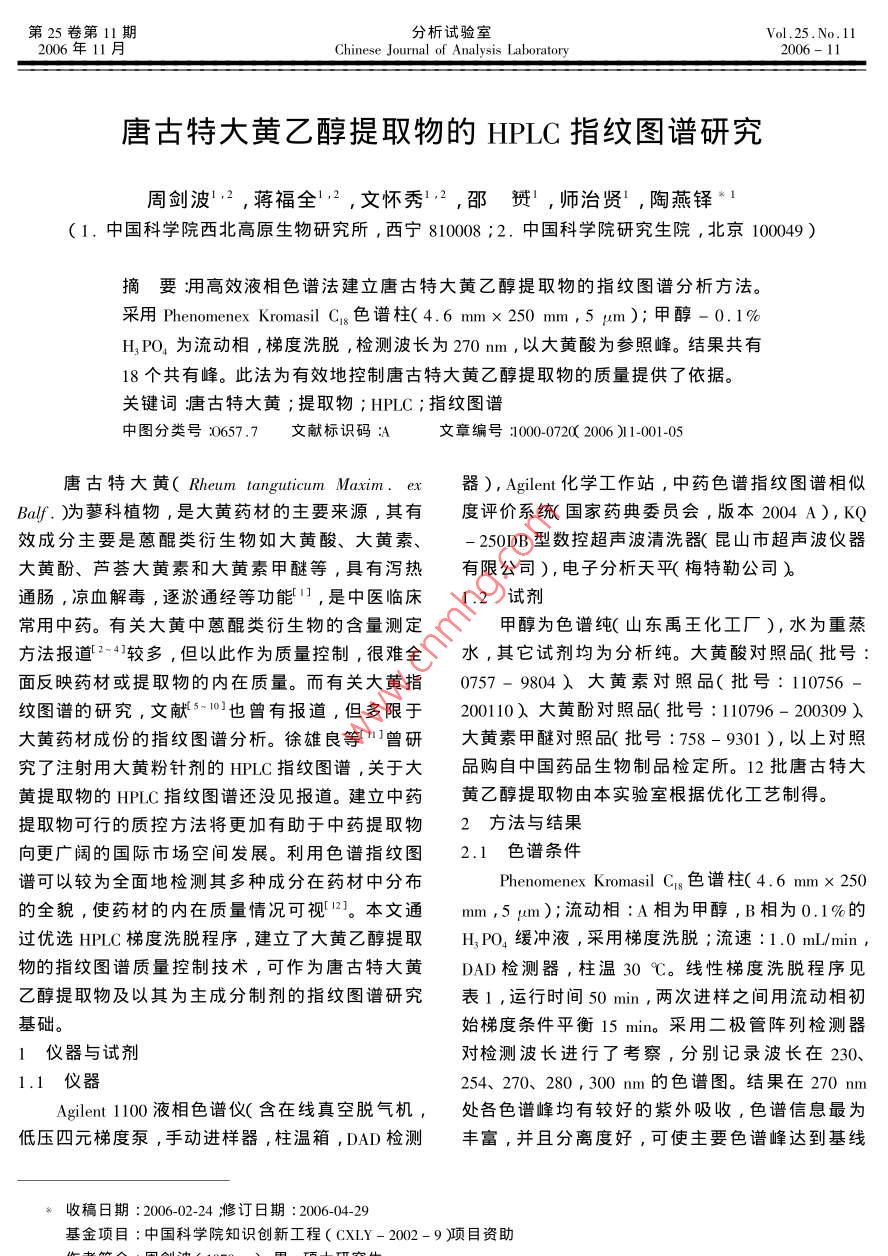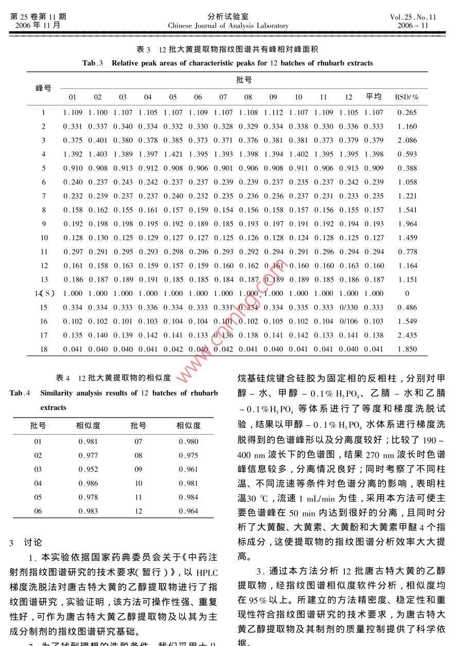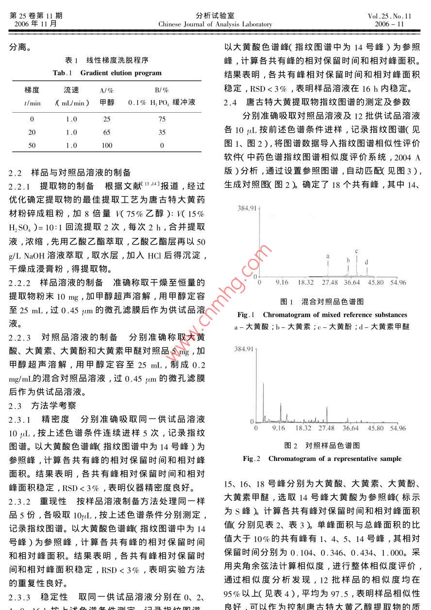 第25卷第11期分析試驗室25 No 11006年11月Chinese Journal of Analysis Laboratory唐古特大黃乙醇提取物的HPLC指紋圖譜研究周劍波2,蔣福全2,文懷秀12,邵赟,師治賢,陶燕鐸*〔Ⅰ.中國科學院西北高原生物研究所,西寧810008;2.中國科學院研究生院,北京100049)摘要闈高效液相色譜法建立唐古特大黃乙醇提取物的指紋圖譜分析方法。采用 Phenomenex Kromasil C色譜柱(4.6mm×250mm,5pm);甲醇-0.1%HPO為流動相,梯度洗脫,檢測波長為270nm,以大黃酸為參照峰。結果共有18個共有峰。此法為有效地控制唐古特大黃乙醇提取物的質量提供了依據(jù).關鍵詞唐古特大黃;提取物;HPLC;指紋圖譜中圖分類號657.7文獻標識碼A文章編號1000-07202006)1-001-05唐古特大黃( Rheum tanguticum Maxim.ex器), agilent化學工作站,中藥色譜指紋圖譜相似Ba∥f.)為蓼科植物,是大黃藥材的主要來源,其有度評價系統(tǒng)(國家藥典委員會,版本2004A),KQ效成分主要是蔥醌類衍生物如大黃酸、大黃素、-250DB型數(shù)控超聲波清洗器(昆山市超聲波儀器大黃酚、蘆薈大黃素和大黃素甲醚等,具有瀉熱有限公司),電子分析天平(梅特勒公司通腸,涼血解毒,逐淤通經(jīng)等功能,是中醫(yī)臨床1.2試劑常用中藥。有關大黃中蒽醌類衍生物的含量測定甲醇為色譜純(山東禹王化工廠),水為重蒸方法報道24較多,但以此作為質量控制,很難全水,其它試劑均為分析純。大黃酸對照品(批號面反映藥材或提取物的內在質量。而有關大黃指0757-9804)大黃素對照品(批號:110756紋圖譜的研究,文獻5也曾有報道,但多限于200110)大黃酚對照品(批號:110796-200309大黃藥材成份的指紋圖譜分析。徐雄良等曾研大黃素甲醚對照品(批號:758-9301),以上對照究了注射用大黃粉針劑的HPLC指紋圖譜,關于大品購自中國藥品生物制品檢定所。12批唐古特大黃提取物的HPC指紋圖譜還沒見報道。建立中藥黃乙醇提取物由本實驗室根據(jù)優(yōu)化工藝制得。提取物可行的質控方法將更加有助于中藥提取物2方法與結果向更廣闊的國際市場空間發(fā)展。利用色譜指紋圖2.1色譜條件譜可以較為全面地檢測其多種成分在藥材中分布Phenomenex Kromasil C1色譜柱(4.6mm×250的全貌,使藥材的內在質量情況可視。本文通m,5pm);流動相:A相為甲醇,B相為0.1%的過優(yōu)選HPLC梯度洗脫程序,建立了大黃乙醇提取H3PO緩沖液,采用梯度洗脫∶流速:1.0mI/r物的指紋圖譜質量控制技術,可作為唐古特大黃DAD檢測器,柱溫30℃。線性梯度洗脫程序見乙醇提取物及以其為主成分制劑的指紋圖譜研究表1,運行時間50min,兩次進樣之間用流動相初基礎始梯度條件平衡15min。采用二極管陣列檢測器1儀器與試劑對檢測波長進行了考察,分別記錄波長在2301.1儀器254、270、280,300mm的色譜圖。結果在270mmΔ gilet100液相色譜儀〔含在線真空脫氣機,處各色譜峰均有較好的紫外吸收,色譜信息最為低壓四元梯度泵,手動進樣器,柱溫箱,DAD檢測豐富,并且分離度好,可使主要色譜峰達到基線*收稿日期:2006-02-24修訂日期:2006-04-29基金項目:中國科學院知識創(chuàng)新工程(CXLY-2002-9項目資助第25卷第11期分析試驗室ol.25.No.112006年11月Chinese Joumal of Analysis Laboratory2006-11分離。以大黃酸色譜峰(指紋圖譜中為14號峰)為參照表1線性梯度洗脫程序峰,計算各共有峰的相對保留時間和相對峰面積。Gradient elution program結果表明,各共有峰相對保留時間和相對峰面積梯度流速B/%穩(wěn)定,RSD<3%,表明樣品溶液在16h內穩(wěn)定。t/min(ml/min)甲醇0.1%HPO4緩沖液2.4唐古特大黃提取物指紋圖譜的測定及參數(shù)分別準確吸取對照品溶液及12批供試品溶液各10μL按前述色譜條件進樣,記錄指紋圖譜(見圖1、圖2),將圖譜數(shù)據(jù)導入指紋圖譜相似性評價軟(中藥色譜指紋圖譜相似度評價系統(tǒng),2004A2.2樣品與對照品溶液的制備版)分析,通過設置參照圖譜,自動匹配(見圖3),2.2.1提取物的制備根據(jù)文獻"報道,經(jīng)過生成對照圖圖2)確定了18個共有峰,其中14優(yōu)化確定提取物的最佳提取工藝為唐古特大黃藥材粉碎成粗粉,加8倍量V75%乙醇):V(15%384.9H2SO4)=10:1回流提取2次,每次2h,合并提取液,濃縮,先用乙酸乙酯萃取,乙酸乙酯層再以50g/ L NaoH溶液萃取,取水層,加入HCl后得沉淀,干燥成浸膏粉,得提取物。2.2.2樣品溶液的制備準確稱取干燥至恒量的09.1618.3227.4836.6445.805496提取物粉末10mg,加甲醇超聲溶解,用甲醇定容圖1混合對照品色譜圖至25mL,過0.45m的微孔濾膜后作為供試品溶Fig. I Chromatogram of mixed reference substances液大黃酸;b-大黃素;c-大黃酚;d-大黃素甲醚2.2.3對照品溶液的制備分別準確稱取大黃酸、大黃素、大黃酚和大黃素甲醚對照品5mg,加384.91甲醇超聲溶解,用甲醇定容至25mL,制成0.2mg/m的混合對照品溶液,過0.45{m的微孔濾膜后作為供試品溶液。2.3方法學考察2.3.1精密度分別準確吸取同一供試品溶液0△10μL,按上述色譜條件連續(xù)進樣5次,記錄指紋09.1618.3227.4836.6445.8054.96圖譜。以大黃酸色譜峰(指紋圖譜中為14號峰)為圖2對照樣品色譜圖參照峰,計算各共有峰的相對保留時間和相對峰Fig 2 Chromatogram of a representative sample面積。結果表明,各共有峰相對保留時間和相對峰面積穩(wěn)定,RSD<3%,表明儀器精密度良好。15、16、18號峰分別為大黃酸、大黃素、大黃酚2.32重現(xiàn)性按樣品溶液制備方法處理同一樣大黃素甲醚,選取14號峰大黃酸為參照峰標示品5份,各吸取10L,按上述色譜條件分別測定為S峰)計算各共有峰
