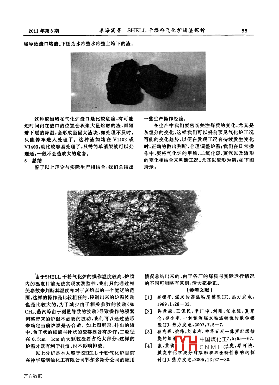 2011年第8期內(nèi)蒙古石油化工53SHELL干煤粉氣化爐堵渣探析李海賓,孫典文(中國神華煤制油鄂爾多斯分公司煤氣化生產(chǎn)中心,內(nèi)蒙古鄂爾多斯017209)摘要:由生物質(zhì) 能源緊缺帶來的一條列市場反應(yīng),使得植物質(zhì)能源成為了化工界的新寵。短短幾年內(nèi)國內(nèi)規(guī)劃、開工了一大批的煤化工項(xiàng)目。而煤氣化作為煤化工的龍頭,首當(dāng)其沖的成為了人們關(guān)注的焦點(diǎn)。為了適應(yīng)現(xiàn)在安全、環(huán)保、節(jié)能、高效這樣一個(gè)大環(huán)境的需求,國內(nèi)國外開發(fā)或升級(jí)了多種煤氣化技術(shù)。國外比較典型的有:Texaco、E-Gas(原Destec)等濕法進(jìn)料氣流床氣化爐, K-T爐、Shell、Prenflo和GSP等干法進(jìn)料氣流床氣化爐;國內(nèi)開發(fā)的有:山東省水煤漿氣化及煤化工國家工程研究中心開發(fā)的新型(多噴嘴對(duì)置式)氣流床干煤粉加壓氣化技術(shù),西安熱工院開發(fā)的兩段式干煤粉加壓氣化技術(shù),清華大學(xué)正在進(jìn)行研究的非熔渣一熔渣分級(jí)高壓純氧干煤粉氣化技術(shù)等。新一代的煤氣化技術(shù)中現(xiàn)在尤以干煤粉氣化技術(shù)最受推崇,而SHELL又是其中典型代表,但其在國內(nèi)的應(yīng)用過程較為曲折,目前尤以堵渣問題最為突出.關(guān)鍵詞:氣化; SHELL;堵渣中圖分類號(hào):TQ542文獻(xiàn)標(biāo)識(shí)碼:A文章編號(hào):1006- -7981 (2011)08- -0053- -03在煤化工興起初期,SHELL干煤粉加壓氣化1.2 Al2O3 的影響工藝作為一種新型的煤氣化工藝技術(shù),帶著它安全、當(dāng)灰中不含Al2O3時(shí)的軟化溫度比較高,當(dāng)環(huán)保、節(jié)能、高效等諸多優(yōu)點(diǎn)于2001年6月率先沖入Al2O3含量略有增加,會(huì)促進(jìn)可以產(chǎn)生低共熔現(xiàn)象中國市場搶占了先機(jī)。但作為新工藝,其應(yīng)用不會(huì)是的鈣長石的生成,從而使灰的軟化溫度降低;當(dāng)一帆風(fēng)順的,總會(huì)有意想不到的困難和問題發(fā)生。從Al2O3含量超過一定比例后,軟化溫度又會(huì)有上升該工藝引進(jìn)并于2006年正式投料試車到現(xiàn)在這四趨勢,這說明隨著Al2O3含量的進(jìn)- -步的上升,鈣長年運(yùn)行當(dāng)中,國內(nèi)工藝技術(shù)人員解決了一個(gè)個(gè)技術(shù)石含量增加。瓶頸,使其年運(yùn)行率達(dá)到了85%以上,但仍有一一個(gè)問1.3 Fe2O3的影響題困擾著各廠家一-堵渣。在高溫弱還原氣氛下,部分Fe+離子會(huì)被還原1渣的形 成機(jī)理及其熔點(diǎn)的影響因素(理論依據(jù))成為Fe+。Fe+離子的極性很高,是聚合物的構(gòu)成煤中的灰分主要成分是各種礦物質(zhì)(石英、白云者,能提高灰的熔融溫度;Fe2+離子易于和熔體網(wǎng)絡(luò)石、方解石、黃鐵礦以及高嶺石等),其在高溫中發(fā)生中位當(dāng)?shù)梨I飽和的O2相聯(lián)接而破壞網(wǎng)絡(luò)結(jié)構(gòu),降環(huán)境下會(huì)發(fā)生一系列的分解、化合、聚合、熔合等化低灰的熔融溫度。同時(shí),二價(jià)鐵氧化物極易和CaO、學(xué)物理反應(yīng),最終形成各元素化合物的熔融態(tài)聚合SiOz、Al2Os等形成低共熔體而降低灰的軟化溫度。體.由于灰中各元素的含量的不同,最終生成物的熔1.4 CaO 的影響點(diǎn)就有所不同,最終直接影響到了氣化爐的操作溫CaO屬于堿性氧化物,本身熔點(diǎn)很高,但它有度和掛渣、排渣的情況。助熔作用,是形成低熔點(diǎn)共熔體的重要組成部分。隨1.1 SiOz的影響著CaO含量的增加,CaO、SiO2、Al2O3等反應(yīng)生成研究發(fā)現(xiàn)當(dāng)灰中不含SiO2時(shí),軟化溫度會(huì)很鈣長石,促進(jìn)了低熔點(diǎn)共熔體的生成,但隨者CaO高,但隨著SiO2含量的增加,灰的軟化溫度灰逐漸含量的繼續(xù)增加,超過一定比例,有多余的CaO存降低,原因是在加熱時(shí)有鈣長石(CaO.Al2O3.2在,則軟化溫度會(huì)有回升的趨勢。SiO2)產(chǎn)生,鈣長石自身熔點(diǎn)較高,但含鈣氧化物群:1.5 Na2O 的影響與硅酸鹽礦物群會(huì)產(chǎn)生低共熔現(xiàn)象,從而導(dǎo)致熔點(diǎn)Na的化合物的熔點(diǎn)低,易于與灰中的其他氧化降低;隨著siOz含量的進(jìn)一步的上升并超過一-定 比物生成低熔點(diǎn)共熔體,并且Na+的離子勢較低,能破例時(shí),軟化溫度又有上升趨勢,這說明隨著SiO:含壞煤灰中的中國煤化工助熔劑的作量的進(jìn)一步的上升,鈣長石含量增加。用。1YHCNM HG收稿日期:2011-01-12.54內(nèi)蒙古石油化工2011 年第8期從以上的分析可以看出,灰分中的某些成分所SHELL煤氣化為氣流床氣化爐,反應(yīng)中心溫度占比例對(duì)灰熔點(diǎn)的影響并不是單向的,隨著其比例高于1400C,所以為液態(tài)排渣,同時(shí)SHELL氣化爐的增加或減少,對(duì)灰熔點(diǎn)的影響是雙向的.水冷壁膜內(nèi)表面采用以渣抗渣的方式來保護(hù)氣化爐2渣的類型.高溫側(cè)表面,這樣SHELL氣化爐所用的煤就需要在根據(jù)渣的形態(tài)可將渣分為三類:玻璃體渣、塑性反應(yīng)溫度下的結(jié)渣性相對(duì)高一些。通常結(jié)渣指數(shù)渣、結(jié)晶渣。(Se)劃分如下:Se0. 25為低結(jié)渣性能、Se0.45為中灰在熔融過程中,硅、鋁酸鹽中的Na.K會(huì)揮發(fā)等結(jié)渣性能、Se0.65為高結(jié)渣性能、Se0.65為嚴(yán)重而損失掉,硫酸鈣會(huì)分解并以三氧化硫的形式溢出,結(jié)渣性能。因此,真正影響灰渣粘度的主