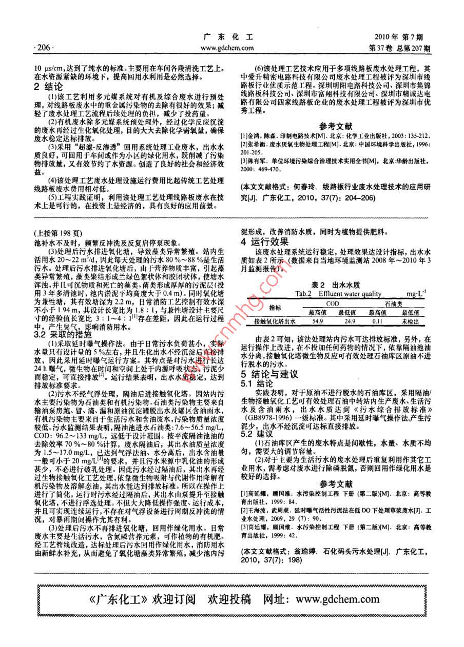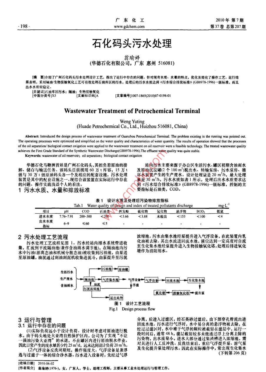 廣東化工2010年第7期。198.www.gdchem.com第37卷總第207期石化碼頭污水處理翁瑜婷(華德石化有限公司,廣東惠州516081)[摘要]介紹了廣州石化碼頭污水處理設(shè)計(jì)工藝,指出了運(yùn)行中存在的問題。針對(duì)現(xiàn)有水質(zhì)、水量的特點(diǎn),優(yōu)化及簡(jiǎn)化了操作工藝。運(yùn)行結(jié)果表明,采用隔油/生物按觸氧化工藝可有效處理石油庫(kù)區(qū)的污水,處理后的污水水質(zhì)達(dá)到《污水綜合排放標(biāo)準(zhǔn)》(G88978-1996)- -級(jí)標(biāo)準(zhǔn),而且出水水質(zhì)較穩(wěn)定。[關(guān)鍵詞]石油庫(kù)區(qū)污水;隔油;生物接觸氧化[中圖分類號(hào))X5[文獻(xiàn)標(biāo)識(shí)碼]A[文章編100-18652010)07-0198-01Wastewater Treatment of Petrochemical TerminalWeng Yuting,(Huade Petrochemical Co., Ltd, Huizhou 516081, China)Abstract: Introduced the design process of wastewater treatment of Guanzhou Petrochemical Terminal. The problem existing in the running was pointed out.The operating processes were optimized and simplified on the water quality and characteristis of water quantity. The results of operation showed that the processesof the oil separaion/ biological contact oxigation were applied to the wastewater treatment on oil reservoir were a feasible technology. The treated wastewater qualityachieves the First Grade Standard of the Synthetic Wastewater Discharge(GB8978-1996).The efluent water quality was quite stable.Keywords: wastewater of oil reservoir; oil separation; biological contact oxigation華德石化馬鞭洲首站是廣州石化碼頭,其擔(dān)負(fù)著原油的接站內(nèi)污水主要來(lái)源于辦公區(qū)生活污水、罐區(qū)初期含油雨水卸、儲(chǔ)存與輸送任務(wù)。該碼頭目前擁用60萬(wàn)t庫(kù)容,15 萬(wàn)t及原油沉淀罐(2個(gè)100 m)脫出水、轉(zhuǎn)輸泵房、污水泵房、循級(jí)與30萬(wàn)1級(jí)原油碼頭各一個(gè)及相應(yīng)的配套設(shè)施,污水處理環(huán)水裝置產(chǎn)生的生產(chǎn)廢水。設(shè)計(jì)處理量是20 m/h,最大處理裝置是其中的配食設(shè)施之一?,F(xiàn)結(jié)合該裝置在實(shí)際運(yùn)行中存在量是30 m/h,污水水質(zhì)如表1所示,處理后出水水質(zhì)要求達(dá)的問題、操作實(shí)踐淺談個(gè)人的看法。到《污水綜合排放標(biāo)準(zhǔn)》(GB8978-1996)- 級(jí)標(biāo)準(zhǔn),控制的主1污水水質(zhì)、水量和排放標(biāo)準(zhǔn)要指標(biāo)是石油類,COD。表1設(shè)計(jì)水質(zhì)及處理后污染物排放指標(biāo)Tab.1 Water quality of design and index of treated pollutants dischargemg:L項(xiàng)日pHCOD石油類揮發(fā)酚硫化物包化物杜浮物BOD,氨氣進(jìn)水水質(zhì)7.76-7.91 200 -300<3.66<3.88未檢出.< 100出水水質(zhì)6-9≤60≤s指標(biāo)2污水處理工藝流程濃縮池。污水由集水池經(jīng)泵提升進(jìn)入氣浮設(shè)備,在此裝置內(nèi)乳污水處理工藝流程見圖1.污水經(jīng)站內(nèi)排水系統(tǒng)管道收化油被去除。其出水流進(jìn)回流水池,液位達(dá)到一定高度時(shí)自流,匯流到平流隔油池(兼作含油雨水調(diào)節(jié)池),在隔油池內(nèi)污至生化集水池經(jīng)泵提升進(jìn)入生物接觸氧化塔,處理后排進(jìn)氧化水中污油(游離態(tài)油和機(jī)械分散態(tài)油)被收集到污油池,由泵送塘作為消防用水。至原油罐,油泥通過刮油刮泥機(jī)收集進(jìn)泥斗,由泵提升至污泥生活污水廠* 時(shí)油泡一原油罐生產(chǎn)廢水→通油道一山浮集水地十氣渾設(shè)備飛得設(shè)備一回流水泡一→生化集水他含油雨水污泥濃縮池j浮渣T[氧化塘→-接觸創(chuàng)化圖提升泵--一醫(yī) 出站州圖1設(shè)計(jì)工藝流程Figl Design process flow3運(yùn)行與管理分離,后進(jìn)入過濾區(qū),經(jīng)石英砂過濾后,由下部穿孔管流出進(jìn)3.1運(yùn)行中存在的問題回流水池。污水進(jìn)行氣行氣浮時(shí),水中易分離的懸浮物被去除,在(1)實(shí)際負(fù)荷遠(yuǎn)小于設(shè)計(jì)負(fù)荷。設(shè)計(jì)時(shí)考慮對(duì)原油進(jìn)行脫經(jīng)過過濾區(qū)時(shí),水中難于氣浮的顆粒被截留在濾層中,運(yùn)行一水,由于碼頭地處大亞灣自然保護(hù)區(qū)內(nèi),公司為了實(shí)現(xiàn)“不讓段時(shí)間后,通常48 h,濾層截留較多未能通過浮上分離去除的一滴油污染大亞灣”的承諾,不在罐區(qū)內(nèi)進(jìn)行原油脫水作業(yè)。污染物,出水流量小,進(jìn)水大部分通過集渣槽進(jìn)入濃縮池,需因此日常產(chǎn)生的廢水量甚少約25 m/d,遠(yuǎn)未達(dá)到設(shè)計(jì)負(fù)荷20 m/ho對(duì)其進(jìn)行人工反沖洗。反洗結(jié)束后,重啟氣浮提升泵、溶氣泵(2)氣浮設(shè)備反洗周期短,操作強(qiáng)度大。氣浮設(shè)備是兼浮及生化提升泵處理污水。因此在實(shí)際操作中,常出現(xiàn)生化集水選與過濾于一體的綜合凈水器。污水進(jìn)入設(shè)備時(shí),先經(jīng)過氣浮(下轉(zhuǎn)第206頁(yè))(收稿日期] 2010-06-02[作者簡(jiǎn)介]翁瑜婷(1976-), 女,廣東人,學(xué)士,助理工程師,主要從事工業(yè)水處理運(yùn)行與管理工作。廣東化工2010年第7期.206.www.gdchem.com第37卷總第207期10 us/cm,達(dá)到了純水的標(biāo)準(zhǔn)。主要用在車間各段清洗工藝上。_(6)該處 理工藝技術(shù)應(yīng)用于多項(xiàng)線路板廢水處理工程,其在水資源緊缺的環(huán)境F,提高回用水利用是必然選擇。中愛升精密電路科技有限公司廢水處理工程被評(píng)為深圳市線