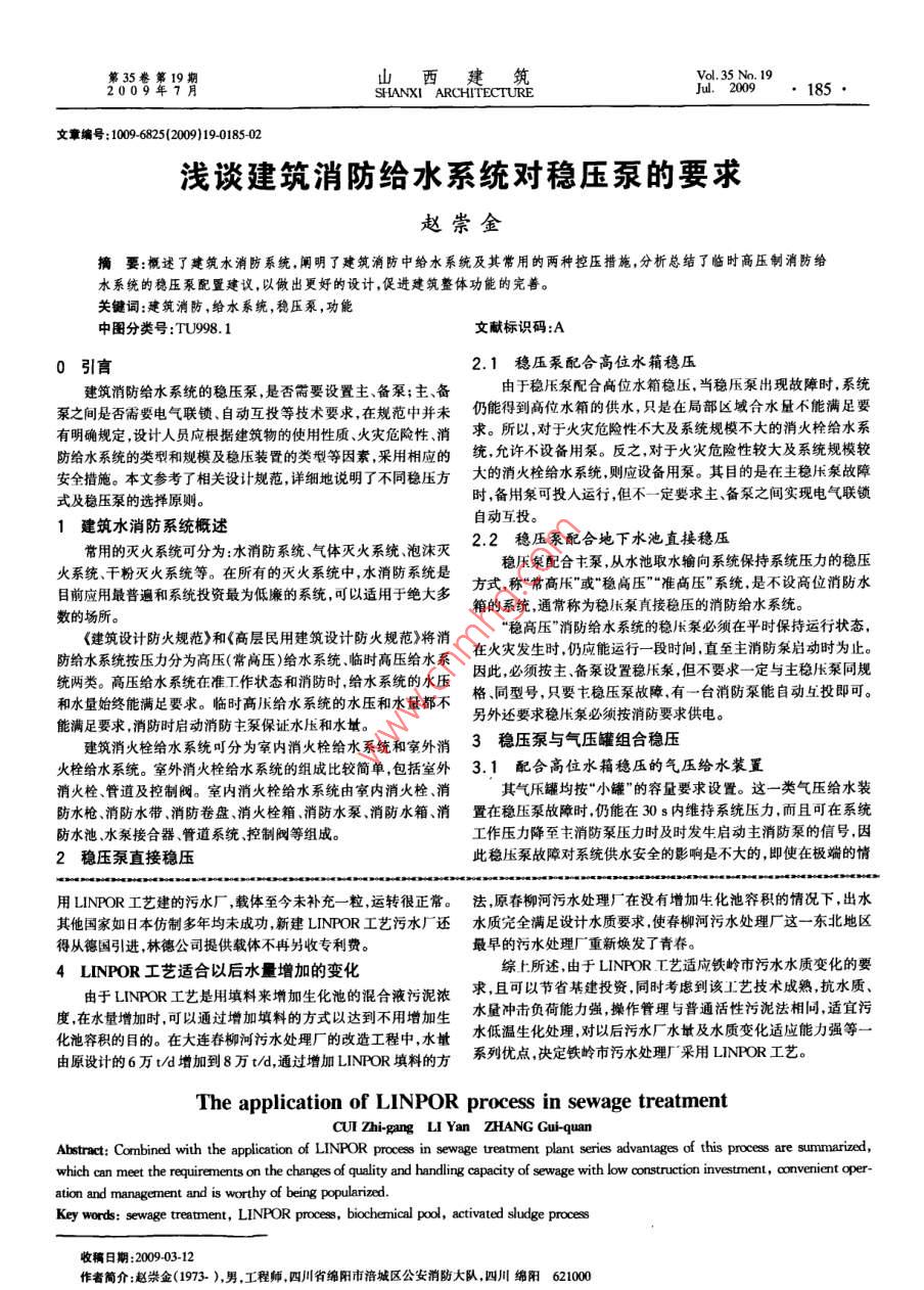 第35卷第19期山西建筑35N.19SHANXI ARCHITECTURE文章編號:10096825(2009)19018402LINPOR工藝在污水處理中的應用崔志剛李艷張貴權摘要:通過 LINPOR工藝在污水處理廠中的應用,總結出該工藝能適應污水水質變化的要求、可節(jié)省基建投資、操作管理筒便、對以后污水廠水量變化適應能力強等一系列優(yōu)點,從而進一步推廣應用。關鍵詞:污水處理,LⅠNPOR工藝,生化池,活性污泥法中圖分類號:X703文獻標識碼:ALⅠNPOR工藝是德國 LINDER公司在污水處理工藝上探索作用的同時存在反硝化,所以在去除污水中BOD的同時可去除出的一條新路它的核心是在生化池中加入LⅠNPOR填料,使生部分氮,比較適宜鐵嶺污水處理的要求,該工藝方案取消了普通化池的混合液污泥濃度得到提高,以達到減小生化池總容積的月二級污水廠的初沉池,不但節(jié)約了基建投資,而且有利于污水處的。這樣不但可以減少工程投資,而且二沉池的污泥更易于沉理當污水廠近期進水水質濃度低時由于生化池前未設初沉池降使總出水的水質更加有保障生化池內微生物相對可以得到較多的碳源,懸浮物多對形成活性LⅠNPOR工藝在鐵嶺市污水處理廠工程及大連春柳河污水污泥有利,對生化池正常進行也是有利的將來污水廠進水水質處理廠改造工程中已經(jīng)應用。根據(jù)LⅠNPOR工藝在鐵嶺污水處達到預測的濃度,雖未設初沉池,但由于林泡爾生化池為雙生物理廠中的應用,從總體上看, LINPOR工藝具有以下優(yōu)點群,不但混合液中污泥濃度高,而且載體上附著大量微生物,LN適應污水水質變化的要求POR生化池平均生物濃度MSS=4700m/L,是普通活性污泥1)原水水質。目前由于鐵嶺工業(yè)處在結構調整階段,城市污生化池污泥濃度MLS的兩倍,生化池效率要大大超過普通活性水水質濃度低,其中:C0=200mg1,.Onx=100mg1,ss=污泥法生化池,出水水質好。將來要求污水廠出水脫氮時本工藝200mg/。工業(yè)結構調整后,城市污水水質濃度將上升根據(jù)對不需增加生化池容積只要增加部分林泡爾載體即可以滿足要求。污水水質的預測確定污水廠設計水質:①D=420mg/幾,BO)=2節(jié)省基建投資200mg/L,S=230mgL。該水質屬城市污水廠中等污染濃度水用 LINPOR活性污泥法,雖然要從德國購進 LINPOR載體平(微孔泡沫塑料立方體),但該工藝省去了兩座直徑40m的輻流2)污水廠出水水質。遼寧省環(huán)境保護局2000年9月5日以式初沉池, LINPOR生化池容積只是普通生化池(AO法,普通活遼河發(fā)[2000107號文,對遼寧省轄區(qū)內城市二級污水處理廠執(zhí)性污泥法)容積的12,從而節(jié)約了基建投資和征地費該部分投行排放標準做了具體要求:其中D<100mg/L,BOD<30mg,資比較見表SS<30mg/,氨氮小于15mg/1L。這是目前的要求將來遼河水表1不同處理方法的投資比較萬元域和渤海灣水體富營養(yǎng)化加重,根據(jù)國內外經(jīng)驗,一定要求城市LNP活性污泥法厭氧一好氧活性混法污水在脫出污水中OOD,BOD,SS的同時,還要脫出污水中的N,P。針對鐵嶺市污水處理廠目前進水水質污染濃度低,出水只要求達到普通二級污水廠出水水質標準。不久的將來污水廠進行LINPOR生化池土建AO法生化池土建22550902.00L770.66水質達到預測值,并且針對出水水質不但要求脫出污水中的峽德公司牛產的2.00COD,BOD,Ss,有機污染物,還要求脫出污水中NP的具體情況,在設計招標中經(jīng)過認真方案比選,專家評估確定污水處理工藝選比方案一增加占地16畝用適合水質變化的“ LINPOR工藝”。16260林泡爾工藝( LINPOR)是投料活性污泥法的一種,但它必須由表1可知,采用 LINPOR工藝雖然要從德國林德在曝氣池中投加15%~30%德國林德公司生產的微孔泡沫塑料1810m3林德載體用去724萬元,但該丁藝可以省去初沉池減立方體作為活性生物體的載體材料,載體材料是該工藝的關鍵少生化池池容,減少占地比AO法節(jié)省投資7860萬元部分,且必須符合諸如孔隙度均勻度顆粒尺寸吸濕度以及有關3 LINPOR工藝是技術成熟的新工藝機械、化學和生物穩(wěn)定性的嚴格要求,才能保證最佳工藝性能,使LⅠNPOR工藝是德國林德公司開發(fā)的新工藝,該法是城市污裝置無故障運行,有較長的使用壽命(德國慕尼黑污水廠1984年水的有效生物處理工藝用于城市污水處理已有15年歷史,國外建成,至今運行正常,未補充一粒載體)。該種載體是林德公司專投產40座用于城市污水處理,其中日本3座韓國5座,我國利產品。連春柳河污水處理廠改擴建匚程采用林泡爾工藝,現(xiàn)已投產。前LⅠNPOR工藝,生化池內微生物為雙生物群落部分生物附已敘及該工藝的核心是林泡爾載體(微孔泡沫塑料立方體),對著于載體材料而其余存在于曝氣池游離的活性污泥中,由于載載體孔隙度、均勻度、吸濕度以及機械、化學和生物穩(wěn)定性有很嚴體上寄居生物體較大,好氧作用的同時存在部分缺氧作用,硝化格的要求,方能保證系統(tǒng)無故障運行。如慕尼黑污水廠1984年采收稿日期:20090306作者簡介:志剛(1972-),男,工程師遼寧石油化工大學,遼寧撫順11301李艷(1977),女助理工程師中國市政工程東北設計研究院占林長春1301張貴權(1973),男,高級工程師長春立源水處理技術有限責任公司吉林長春13021第35卷第19期SHANXI ARCHITECTUREJu.20185文章編號:10096825(2009)19018502淺談建筑消防給水系統(tǒng)對穩(wěn)壓泵的要求趙崇金摘要:概述了建筑水消防系統(tǒng),闡明了建筑消防中給水系統(tǒng)及其常用的兩種