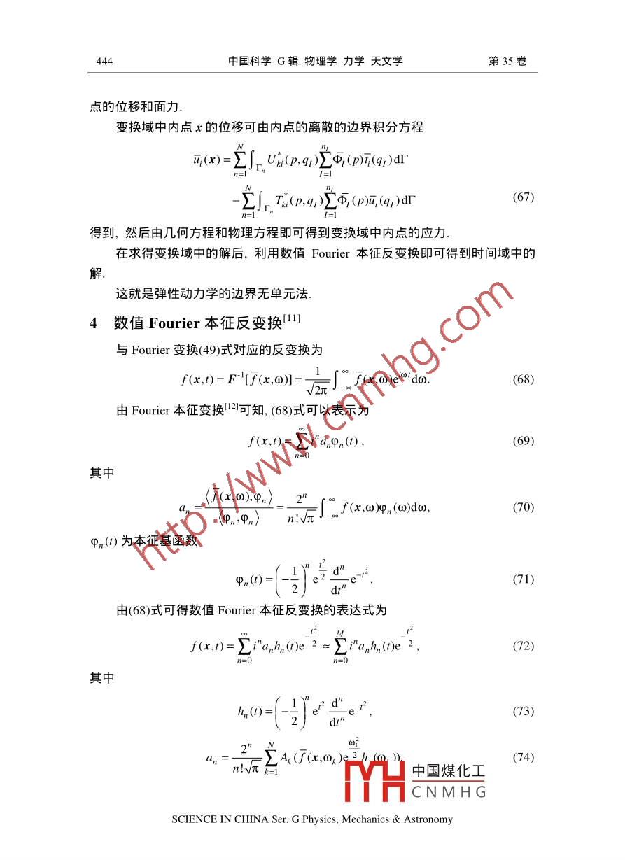 中國科學(xué)G輯物理學(xué)力學(xué)天文學(xué)2005,35(4):435-448435彈性動(dòng)力學(xué)的邊界無單元法程玉民彭妙娟上海大學(xué)上海市應(yīng)用數(shù)學(xué)和力學(xué)研究所,上海200072)上海大學(xué)土木工程系,上海200072)摘要討論了 Hilbert空間上的改進(jìn)的移動(dòng)最小二乘法,并將彈性動(dòng)力學(xué)的邊界積分方程方法與改進(jìn)的移動(dòng)最小二乘法結(jié)合,提出了彈性動(dòng)力學(xué)的邊界無單元法.改進(jìn)的移動(dòng)最小二乘法避免了求解病態(tài)方程組,既提高了效率,又提高了精度.邊界無單元法是邊界積分方程的無網(wǎng)格方法的直接列式法,容易引入邊界條件,且具有更高的精度.最后給出了彈性動(dòng)力學(xué)的邊界無單元法的數(shù)值實(shí)現(xiàn)方法和具體的算例關(guān)鍵詞移動(dòng)最小二乘法邊界積分方程無網(wǎng)格方法彈性動(dòng)力學(xué)改進(jìn)的移動(dòng)最小二乘法邊界無單元法無網(wǎng)格方法近年來得到了較大發(fā)展,是目前計(jì)算力學(xué)研究的熱點(diǎn)之無網(wǎng)格方法采用基于點(diǎn)的近似,在處理諸如大變形、裂紋擴(kuò)展等問題時(shí)不需進(jìn)行網(wǎng)格重構(gòu),具有較為明顯的優(yōu)越性.目前發(fā)展的無網(wǎng)格方法有擴(kuò)散單元法( Diffuse element method,即DEM)、無單元 Galerkin法( lement-Free GalerkinMethod,即EFG)、Hp- -clouds無網(wǎng)格方法、有限點(diǎn)法( The Finite Point method,即FPM)、無網(wǎng)格局部 Petrov-Galerkin方法( Meshless local petrov- Galerkin Method,即MLPG)、多尺度重構(gòu)核粒子方法(Mult- Scale Reproducing Kernel ParticleMethod,即MRKP)、小波粒子方法( Wavelet Particle Method,即WPM)、徑向基函數(shù)法( Radial basis Functions,即RBF)、無網(wǎng)格有限元法( Meshless finite elementMethod,即MFEM)、移動(dòng)粒子有限元法( Moving particle Finite Element Method,即 MPFEM)以及邊界積分方程的無網(wǎng)格方法等邊界積分方程的無網(wǎng)格方法是將邊界積分方程方法與無網(wǎng)格方法中的移動(dòng)最小二乘法結(jié)合而形成的.目前這一方面的研究主要有 Mukherjee等人提出的邊界點(diǎn)法( Boundary Node method,即BNM)3、Atui等人提出的局部邊界積分方004-08-02收稿,2005-04-22收修改稿中國煤化工*上海市重點(diǎn)學(xué)科建設(shè)項(xiàng)目資助(批準(zhǔn)號(hào):Y0103)*sE-mail:yecheng@sh163net:yecheng@staff.shu.edu.cnCNMHGSCIENCE IN CHINA Ser. G Physics, Mechanics Astronomy436中國科學(xué)G輯物理學(xué)力學(xué)天文學(xué)第35卷程方法 Local Boundary Integral Equation Method,即LBI)、姚振漢等人提出的雜交邊界點(diǎn)法( Hybrid Boundary Node Method)9、以及本文作者提出的邊界無單元法( Boundary Element-Free Method,即BEFM)等與邊界點(diǎn)法和局部邊界積分方程方法相比,邊界無單元法在形成的邊界積分方程中采用節(jié)點(diǎn)變量的真實(shí)解為未知量,而邊界點(diǎn)法和局部邊界積分方程方法均采用節(jié)點(diǎn)變量的近似解為未知量.邊界無單元法是邊界積分方程無網(wǎng)格方法的直接解法.邊界無單元法不僅直觀而且具有較高的精度,還可方便地引入邊界條件本文在 Hilbert空間上討論了改進(jìn)的移動(dòng)最小二乘法,并將彈性動(dòng)力學(xué)的邊界積分方程方法與改進(jìn)的移動(dòng)最小二乘法結(jié)合,提出了彈性動(dòng)力學(xué)的邊界無單元法,最后給出了彈性動(dòng)力學(xué)的邊界無單元法的數(shù)值實(shí)現(xiàn)方法和具體的算例1移動(dòng)最小二乘法在移動(dòng)最小二乘法( Moving least- square approximation)中,取試函數(shù)n(x)=∑n(x)a(x)=p(x)a(x)(x∈9)(1)為函數(shù)u(x)的逼近函數(shù).這里m是基函數(shù)的個(gè)數(shù),P(x)是基函數(shù),a1(x)是相應(yīng)的系數(shù).基函數(shù)的通常形式為線性基:p1=(1,x)(對(duì)一維區(qū)域)p=(,x,x2)(對(duì)二維區(qū)域二次基p2=(1,x1,x2)(對(duì)一維區(qū)域p=(1,x1,x2,x,xx2,x2)(對(duì)二維區(qū)域)對(duì)應(yīng)于(1)式的整體逼近,在點(diǎn)x的鄰域內(nèi)的局部逼近定義為n'(x,)=∑(x)a1(x)=p(x)a(x),(6)其中系數(shù)a1(x)根據(jù)加權(quán)最小二乘法來確定,它使得對(duì)函數(shù)n(x)的局部逼近誤差最小定義J=2w(r-x,u(r,x)-u(xn)w(x-x1)∑P(x7)a中國煤化工其中wx-x1)是具有緊支集特性的權(quán)函數(shù),xCNMH點(diǎn)SCIENCE IN CHINA Ser. G Physics, Mechanics Astronomy第4期程玉民等:彈性動(dòng)力學(xué)的邊界無單元法437(7)式可用矩陣形式表示為J=(Pa-u) w(r(pa-u)(8)其中(r,) p2(n)l pm(n)P=|()P2()LPm(與)(10)p,(An) P2(r,n)L Pm(n)L為了得到a(x),對(duì)J取極值,即得A(x)a(x)-B(r)u=0(12)A(x)a(r)=b(x )u(13)其中矩陣A(x)和B(x)分別為A(r)=P w(r)P(14)B(x)=Pw(x)(15)由(13)式,可得a(r)=A (xB(x)u(16)這樣,逼近函數(shù)u(x)的表達(dá)式為x)=φ(x)m=∑(17)其中Φ(x)為形函數(shù)Φ(x)=閩(x,2(x),,2(x)=p(x)A(x)B(x)(18)2改進(jìn)的移動(dòng)最小二乘法在移動(dòng)最小二乘法中,當(dāng)m較大時(shí),方程(13)有時(shí)是病態(tài)的,甚至是奇異的這樣,方程(13就難以求解或獲得正確的解.若選取正交函數(shù)作為基函數(shù),則所得到的方程即不病態(tài)也不奇異,而且不需求中國煤化工方程組的解THCNMHG中國科學(xué)G輯物理學(xué)力學(xué)天文學(xué)第35卷21 Hilbert空間span(p)為了討論正交基函數(shù),我們先來證明pam(p)是一個(gè) Hilbert空對(duì)vf(x),g(x)∈spmn(p),定義I=1那么(f,g)是一個(gè)內(nèi)積,spmn(p)是一個(gè)內(