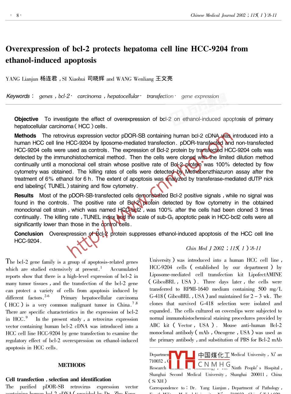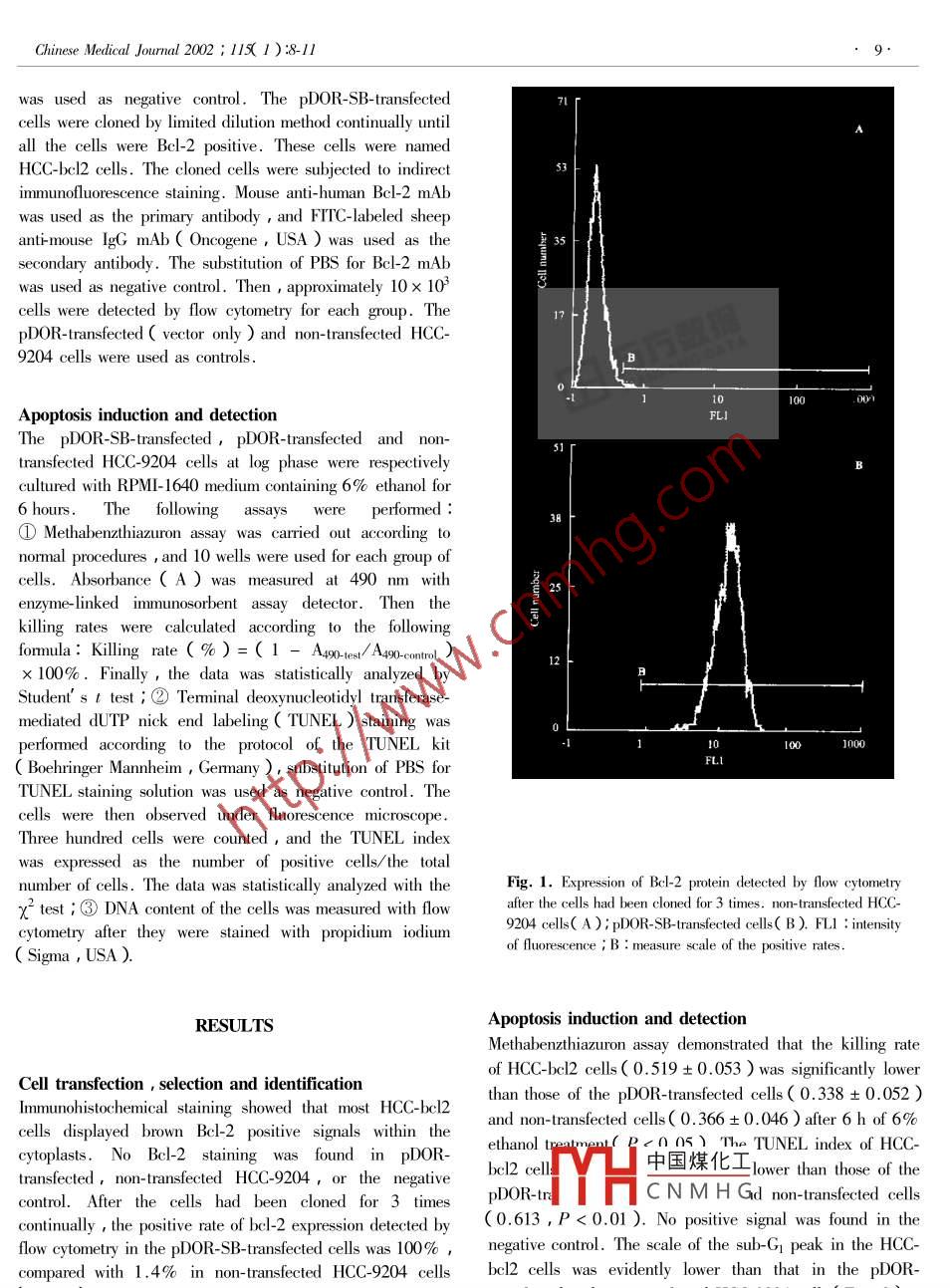 Chinese Medical Journal 2002 115(1): 8-11Overexpression of bcl-2 protects hepatoma cell line HCC-9204 fromethanol-induced apoptosisYANG Lianjun楊連君, SI Xiaohui司曉輝 and WANG Wenliang王文亮Keywordsbcl-2. carcinoma, hepatocellular. transfection gene expressionObjective To investigate the effect of overexpression of bcl-2 on ethanol-induced apoptosis of primaryhepatocellular carcinoma( HCC ) cellsMethods The retrovirus expression vector pDOR-SB containing human bcl-2 CDNA was introduced into ahuman HCC cell line HCC-9204 by liposome-mediated transfection. pDOR-transfected and non-transfectedHCC-9204 cells were used as controls. The expression of Bcl-2 protein by transfected HCC-9204 cells wasdetected by the immunohistochemical method. Then the cells were cloned with the limited dilution methodcontinually until a monoclonal cell strain whose positive rate of Bcl-2 protein was 100%detected by flowcytometry was obtained. The killing rates of cells were detected by Methabenzthiazuron assay aftertreatment of 6%ethanol for 6 h. The extent of apoptosis was analyzed by transferase-mediated dUTPend labeling( TUNEL staining and flow cytometryResults Most of the pDOR-SB-transfected cells demonstrated Bcl-2 positive signals while no signal wasfound in the controls. The positive rate of Bcl-2 protein detected by flow cytometry in the obtainedmonoclonal cell strain, which was named HcC-bcl2, was 100% after the cells had been cloned 3 timescontinually. The killing rate, TUNEL index and the scale of sub-G, apoptotic peak in HCC-bcl2 cells were allsignificantly lower than those in the control cellsConclusion Overexpression of Bcl-2 protein suppresses ethanol-induced apoptosis of the HCC cell lineHcC-9204Chin Med J2002: 115(1): 8-11which are studied extensively at present. I Accumulones University )was introduced into a human HCC cell lineThe bcl-2 gene family is a group of apoptosis-relatedHCC-9204 cells established by our department ) byreports show that there is a high-level expression of bcl-2 in Liposome-mediated cell transfection kit LipofectAMINEmany tumor tissues and the transfection of the bcl-2 gene GibcoBRL, USA ) Three days later, the cells werecan protect a variety of cells from apoptosis inducer entransferred to RPMI-1640 medium containing 500 mg/Ldifferent factors 2-6rimary hepatocellular carcinomG-418( GibcoBRL, USA) and maintained for 2-3 wk.TheHCC )is a very common malignant tumor in China. 78 clones that survived G-418 selection were isolated andThere are specific characteristics in the expression of bcl-2 expanded. The cells cultured on coverslips were subjected toin HCC.9 In the present study a retrovirus expression normal immunohistochemical staining procedures provided byvector containing human bcl-2 cdNa was introduced into a ABC kit( Vector, USA ) Mouse anti-human Bcl-2HCC cell line HCC-9204 by gene transfection tomonoclonal antibody( mAb, Oncogene, USA )was used asregulatory effect of bcl-2 overexpression on ethanol-induced the primary antibody and substitution of PBs for Bcl-2 mAbapoptosis in HCC cellsDepart:YH中國煤化工 Medical University,ximn710032METHODSResearchCNMHGNinth People s HospitalShanghai Second Medical University, Shanghai 200011, ChinaCell transfection, selection and identificationSi XH)The purified pDOR-SB retrovirus expression vector Correspondence to: Dr. Yang Lianjun, Department of Pathology1-2 cdNA provided by Dr. Zhu Feng, Fourth Military Medical University, Xi' an 710032, China( Tel: 029-DepariochemistryForthMilitaryMedical3374541-115.Email:yangsi@sina.comChinese Medical Journal 2002; 11( 1): 8-11was used as negative control. The pDOR-SB-transfectedcells were cloned by limited dilution method continually untilall the cells were Bcl-2 positive. These cells were namedHCC-bcl2 cells. The cloned cells were subjected to indirectimmunofluorescence staining. Mouse anti-human bcl-2 mAbwas used as the primary antibody and FITC-labeled sheepanti-mouse IgG mAb( Oncogene, USA )was used as thesecondary antibody. The substitution of PBS for Bcl-2 mAwas used as negative control. Then, approximately 10 x 10cells were detected by flow cytometry for each group. ThepDOR-transfected vector only and non-transfected HCC9204 cells were used as controlsApoptosis induction and detectionThe pDOR-SB-transfected, pDOR-transfected and nontransfected HCC-9204 cells at log phase were respectivelyultured with RPMI-1640 medium containing 6%0 ethanol for6 hours. The following assays were performedO Methabenzthiazuron assay was carried out according tonormal procedures and 10 wells were used for each group ofcells. Absorbance(a) was measured at 490 nm withvme-linked immunosorbent assay detector. Then thekilling rates were calculated according to the followingformula: Killing rate %)=( 1-A4go-test/A49o-controlX 100%0. Finally the data was statistically analyzed byStudents t test; @2 Terminal deoxynucleotidyl transferase-mediated dUTP nick end labeling( Tunel )staining wasperformed according to the protocol of the TUNEL kit1000Boehringer Mannheim Germany ) substitution of PBS forFL1TUNEL staining solution was used as negative control. Theells were then observed under fluorescence microscopeThree hundred cells were counted, and the TUNel indexwas expressed as the number of positive cells/the totalnumber of cells. The data was statistically analyzed with the1. Expression of Bcl-2 protein detected by flow cytometryx test; B DNA content of the cells was measured with flowafter the cells had been cloned for 3 times. non-transfected HCC-ometry after they were stained with9204 cells (A) pDOR-SB-transfected cells( B ) FLl: intensitynce:B: measure scale of the positive ratesRESULTSApoptosis induction and detectionMethabenzthiazuron assay demonstrated that the killing rateof HCC-bcl2 cells(0. 519+0.053 ) was significantly lowerCell transfection, selection and identificationthan those of the pDOR-transfected cells(0. 338+0.052)Immunohistochemical staining showed that most HCC-bcl2and non-tra
