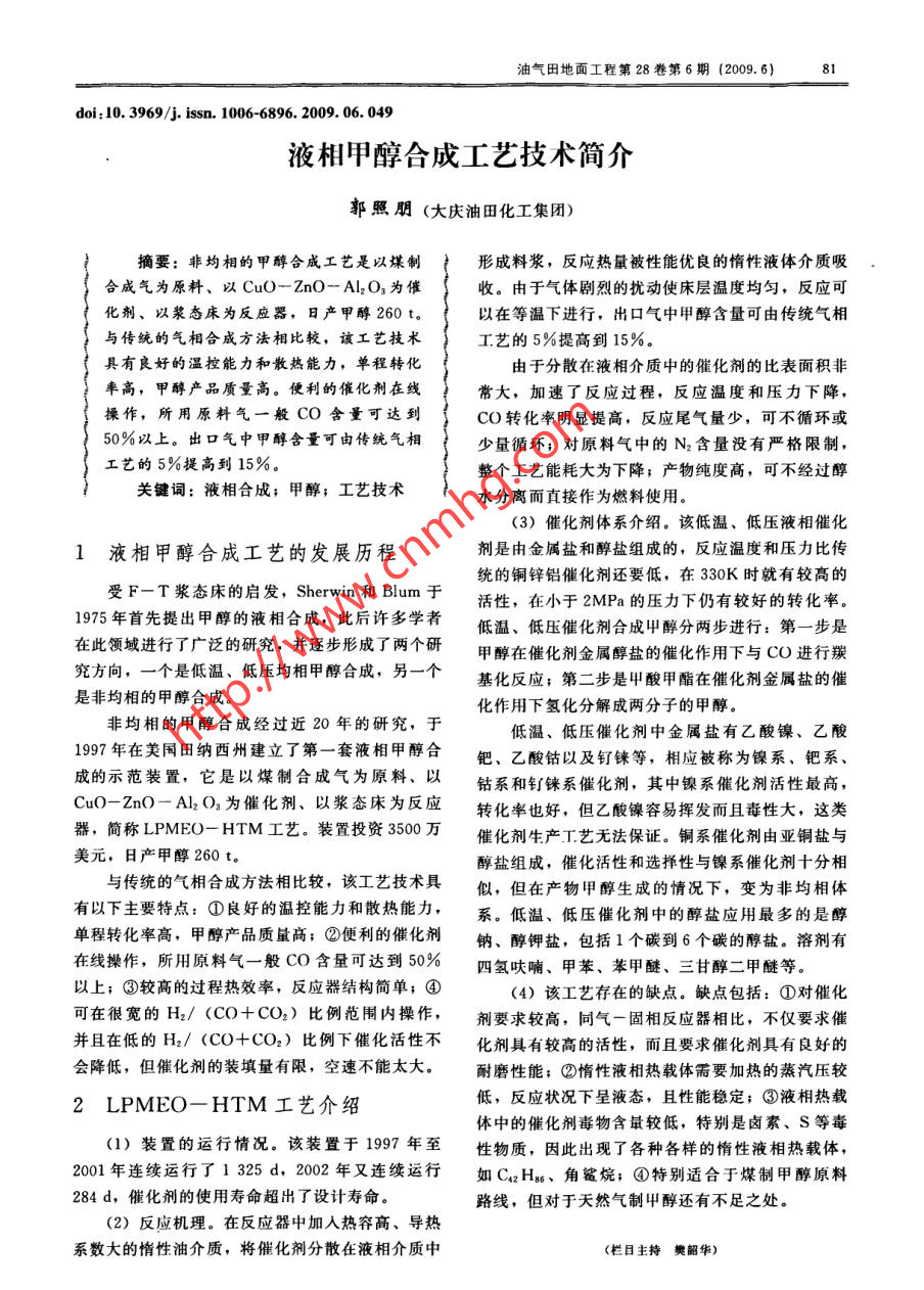油氣田地面工程第28卷第6期(2009. 6)31doi:10. 3969/j. issn. 1006-6896. 2009.06. 049液相甲醇合成工藝技術(shù)簡介郭照朋(大慶油田化工集團(tuán))摘要:非均相的甲醇合成工藝是以煤制形成料漿,反應(yīng)熱量被性能優(yōu)良的惰性液體介質(zhì)吸合成氣為原料、以CuO- ZnO- Al2O3為催收。由于氣體劇烈的擾動使床層溫度均勻,反應(yīng)可化劑、以漿態(tài)床為反應(yīng)器,日產(chǎn)甲醇260 t。以在等溫下進(jìn)行,出口氣中甲醇含量可由傳統(tǒng)氣相與傳統(tǒng)的氣相合成方法相比較,該工藝技術(shù)工藝的5%提高到15%。具有良好的溫控能力和散熱能力,單程轉(zhuǎn)化由于分散在液相介質(zhì)中的催化劑的比表面積非率高,甲醇產(chǎn)品質(zhì)量高。便利的催化劑在線常大,加速了反應(yīng)過程,反應(yīng)溫度和壓力下降,操作,所用原料氣一般CO含量可達(dá)到CO轉(zhuǎn)化率明顯提高,反應(yīng)尾氣量少,可不循環(huán)或50%以上。出口氣中甲醇含量可由傳統(tǒng)氣相少量循環(huán);對原料氣中的N2含量沒有嚴(yán)格限制,整個工藝能耗大為下降;產(chǎn)物純度高,可不經(jīng)過醇關(guān)鍵詞:液相合成;甲醇;工藝技術(shù)水分離而直接作為燃料使用。(3)催化劑體系介紹。該低溫、低壓液相催化1液相甲醇合成工藝的發(fā)展歷程劑是由金屬鹽和醇鹽組成的,反應(yīng)溫度和壓力比傳統(tǒng)的銅鋅鋁催化劑還要低,在330K時就有較高的受F- T漿態(tài)床的啟發(fā),Sherwin 和Blum于活性,在小于2MPa的壓力下仍有較好的轉(zhuǎn)化率。1975年首先提出甲醇的液相合成,此后許多學(xué)者低溫、低壓催化劑合成甲醇分兩步進(jìn)行:第一步是在此領(lǐng)域進(jìn)行了廣泛的研究,并逐步形成了兩個研甲醇在催化劑金屬醇鹽的催化作用下與CO進(jìn)行羰究方向,一個是低溫、低壓均相甲醇合成,另一個基化反應(yīng);第二步是甲酸甲酯在催化劑金屬鹽的催是非均相的甲醇合成?;饔孟職浠纸獬蓛煞肿拥募状?。.非均相的甲醇合成經(jīng)過近20年的研究,于低溫、低壓催化劑中金屬鹽有乙酸鎳、乙酸1997年在美國田納西州建立了第一套液相甲醇合鈀、乙酸鈷以及釘錸等,相應(yīng)被稱為鎳系、鈀系、成的示范裝置,它是以煤制合成氣為原料、以鈷系和釕錸系催化劑,其中鎳系催化劑活性最高,Cu0- ZnO - Al2O3為催化劑、以漿態(tài)床為反應(yīng)轉(zhuǎn)化率也好,但乙酸鎳容易揮發(fā)而且毒性大,這類器,簡稱LPMEO- HTM工藝。裝置投資3500萬催化劑生產(chǎn)工藝無法保證。銅系催化劑由亞銅鹽與美元,日產(chǎn)甲醇260 t.醇鹽組成,催化活性和選擇性與鎳系催化劑十分相與傳統(tǒng)的氣相合成方法相比較,該工藝技術(shù)具似,但在產(chǎn)物甲醇生成的情況下,變?yōu)榉蔷囿w有以下主要特點:①良好的溫控能力和散熱能力,系。低溫、低壓催化劑中的醇鹽應(yīng)用最多的是醇單程轉(zhuǎn)化率高,甲醇產(chǎn)品質(zhì)量高;②便利的催化劑鈉、醇鉀鹽,包括1個碳到6個碳的醇鹽。溶劑有在線操作,所用原料氣一般CO含量可達(dá)到50%四氫呋喃、甲苯、苯甲醚、三甘醇二甲醚等。以上;③較高的過程熱效率,反應(yīng)器結(jié)構(gòu)簡單;④(4)該工藝存在的缺點。缺點包括:①對催化可在很寬的H2/ (CO+CO2)比例范圍內(nèi)操作,劑要求較高,同氣-固相反應(yīng)器相比,不僅要求催并且在低的H2/ (CO+CO2)比例下催化活性不化劑具有較高的活性,而且要求催化劑具有良好的會降低,但催化劑的裝填量有限,空速不能太大。耐磨性能;②惰性液相熱載體需要加熱的蒸汽壓較2 LPMEO-HTM工藝介紹低,反應(yīng)狀況下呈液態(tài),且性能穩(wěn)定;③液相熱載.體中的催化劑毒物含最較低,特別是鹵素、S等毒.(1)裝置的運行情況。該裝置于1997年至性物質(zhì),因此出現(xiàn)了各種各樣的惰性液相熱載體,2001年連續(xù)運行了1325d,2002年又連續(xù)運行如CqzH8、角鯊?fù)?④特別適合于煤制甲醇原料284 d,催化劑的使用壽命超出了設(shè)計壽命。路線,但對于天然氣制甲醇還有不足之處。(2)反應(yīng)機理。在反應(yīng)器中加人熱容高、導(dǎo)熱系數(shù)大的惰性油介質(zhì),將催化劑分散在液相介質(zhì)中(欄目主持樊韶華)