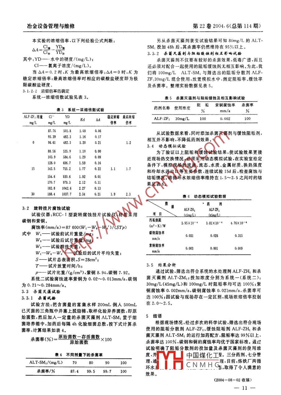 第22卷2004. 6(總第114期)冶金設(shè)備管理與維修凈循環(huán)水系統(tǒng)水質(zhì)穩(wěn)定試驗(yàn)與分析胡予秋王小美(安鋼煉鐵廠安陽(yáng) 455004浙江武義自來(lái)水公司 武義 321200)商要通過(guò)水質(zhì)穩(wěn)定試驗(yàn),確定了阻垢分散劑的投加量及殺茵滅藻劑的使用濃度,循環(huán)系統(tǒng)穩(wěn)定順行。關(guān)鍵詞水質(zhì)試驗(yàn)藥判加藥量安鋼煉鐵廠凈循環(huán)冷卻水系統(tǒng)總貯水量200m3 ,循環(huán)根據(jù)水質(zhì)分析結(jié)果,分別對(duì)其朗格利爾(Langlier)飽和量400m'/h,補(bǔ)充水量10~ 15m/h.系統(tǒng)管道材質(zhì)為碳鋼,指數(shù) 和雷茲納(Ryzner)穩(wěn)定指數(shù)判定,由于碳酸鈣飽和.換熱器材質(zhì)為紫銅。循環(huán)冷卻水通過(guò)循環(huán)水泵進(jìn)人設(shè)備換pHs是根據(jù)平衡理論推導(dǎo)出來(lái)的,對(duì)實(shí)際作用中各種復(fù)雜熱器,進(jìn)行熱交換,回水經(jīng)冷卻塔冷卻后回到吸水井,換熱因素考慮不全面,沒(méi)有考慮結(jié)晶、電化學(xué)過(guò)程和水中膠體的器進(jìn)口水溫25C、出口水溫28Cr全廠分為2套系統(tǒng)。為合影響,而且把碳酸鈣既可延緩腐蝕又促使結(jié)垢來(lái)考慮,所以理確定水處理藥劑及加藥量,我們分別對(duì)2系統(tǒng)進(jìn)行了水水質(zhì)腐蝕和結(jié)垢問(wèn)題應(yīng)該將飽和指數(shù)L.SI與穩(wěn)定指數(shù)RSI質(zhì)穩(wěn)定試驗(yàn)。配合應(yīng)用,用來(lái)分析循環(huán)冷卻水補(bǔ)水系統(tǒng)和在不同濃縮倍該試驗(yàn)遵照國(guó)家標(biāo)準(zhǔn)GB/50050- 95<工業(yè)循環(huán)冷卻水率下的水質(zhì)結(jié)構(gòu)或腐蝕傾向。處理設(shè)計(jì)規(guī)范)規(guī)定的原則和標(biāo)準(zhǔn)進(jìn)行擬定。RSI= 2pHs-pH敞開(kāi)式循環(huán)系統(tǒng)標(biāo)準(zhǔn)如下:污垢熱阻值為1. 72X10-+ .pHs= (9.3+A+B)- (C+D) (A,B,C,D 為可查表~3.44X 10~‘(m2●K)/W,碳鋼腐蝕率小于或等于系數(shù))0. 125mm/a,銅腐蝕率小于或等于0. 005mm/a,異養(yǎng)菌總.飽和指數(shù)與穩(wěn)定指數(shù)指標(biāo)見(jiàn)表2。數(shù)小于5X 105個(gè)/mL.試驗(yàn)中篩選的水處理藥劑主要采用國(guó)家推廣使用的有表2飽和指敷與穩(wěn)定指數(shù)指標(biāo)機(jī)膦低磷系統(tǒng)產(chǎn)品,經(jīng)試驗(yàn)證明,性能指標(biāo)均能達(dá)到GB/.SI>0結(jié)垢LSI=0時(shí)穩(wěn)定50050-95中有關(guān)規(guī)定的內(nèi)容,甚至優(yōu)于國(guó)家標(biāo)準(zhǔn)的要求。LSI<0胸蝕RSI<3.7嚴(yán)重結(jié)垢1循環(huán)水系統(tǒng)結(jié)垢腐 蝕原因分析RSI=7.5~9.0嚴(yán)重腐蝕 RSI=5.0~6.0 輕度結(jié)垢敞開(kāi)式循環(huán)水系統(tǒng)是冷卻水通過(guò)敞開(kāi)式對(duì)流、蒸發(fā)面RSI=7.0~7.5 輕微腐蝕 RSI=6. 0~7.0水質(zhì)較穩(wěn)定得到冷卻,其冷卻水可以循環(huán)使用,直至被濃縮到一定的濃縮倍數(shù)后再行排放的冷卻水系統(tǒng)。循環(huán)后可以大量節(jié)約用從表1指數(shù)判斷結(jié)果可知:煉鐵廠2套系統(tǒng)的循環(huán)冷水,尤其在北方等缺水地區(qū)更為適合。由于循環(huán)水在運(yùn)行過(guò)卻水屬于結(jié)垢性的水質(zhì),隨著濃縮倍率的增加,結(jié)垢的趨勢(shì)程中不斷依縮,溶解氧和二氧化碳含量也隨之改變,導(dǎo)致水增強(qiáng)。水系統(tǒng)在5種濃縮倍率條件下均判定為結(jié)垢性的水質(zhì)發(fā)生較大變化,大致情況為:水中各離子增加、溶解氧增質(zhì),當(dāng)濃縮倍率為2.5時(shí),為嚴(yán)重結(jié)垢性水質(zhì)。因此我們?cè)诩?、循環(huán)水中CO:脫除、微生物繁行、電偶腐蝕等。因此容配方篩選時(shí)主要側(cè)重于選擇性能優(yōu)良、對(duì)鈣的容忍度高、阻易引起系統(tǒng)的腐蝕結(jié)垢、沉積和微生物生長(zhǎng),需要投加一垢能力較強(qiáng)的阻垢分散劑。但水中存在溶解氧等因素,也有定量的阻垢劑和緩蝕劑來(lái)控制系統(tǒng)中的腐蝕和結(jié)垢現(xiàn)象??赡軐?duì)金屬結(jié)構(gòu)產(chǎn)生腐蝕的可能性,同時(shí)流經(jīng)冷卻塔時(shí)可能會(huì)進(jìn)人塵土雜質(zhì),光照和環(huán)境都給細(xì)菌和藻類生長(zhǎng)繁殖2水質(zhì)穩(wěn)定指數(shù)判斷提供了有利的條件,菌藻在生長(zhǎng)繁殖過(guò)程中產(chǎn)生生物粘泥2.1水質(zhì)分析根據(jù)某中心實(shí)驗(yàn)室在安鋼煉鐵分廠現(xiàn)場(chǎng)取得水樣進(jìn)行富集,其代謝產(chǎn)物都可能加速設(shè)備的腐蝕速度,因此在水處分析的結(jié)果,現(xiàn)場(chǎng)運(yùn)行的循環(huán)冷卻水補(bǔ)水水質(zhì)指標(biāo)見(jiàn)表1.理整體方案充分考慮阻垢的同時(shí),也綜合考慮對(duì)系統(tǒng)緩蝕和殺菌滅藻的治理。表1系統(tǒng)-.二補(bǔ)充水水質(zhì)指標(biāo)3兩系統(tǒng)的阻垢分散劑確定試驗(yàn)分析項(xiàng)目3.1阻垢 試驗(yàn)統(tǒng)_+總硬度+Ga2+ 總?cè)萁夤绦挝颯OF-總堿度Mg2+HOO- C-3.1.1 試驗(yàn)方法.plmg/L_ mg/L mg/Lmg/n/Lmng/L_ g/ mg/L試斯中國(guó)煤化工W按-定的濃度投一7.2 487.2 348.7160309.524.41 3.8541 80.51入現(xiàn)場(chǎng):浴鍋中進(jìn)行濃縮,三二7.1 452.4 313.82801.116.198 3.8.5 619.8 53.1溫度控MHCNMHG表中:一以CaC0s計(jì).3.1.2試驗(yàn)結(jié)果2.2 水質(zhì)評(píng)價(jià)3.1.2.1濃縮倍寧的判斷依據(jù)冶金設(shè)備管理與維修第22卷2004. 6(總第114期)本實(shí)驗(yàn)的濃縮倍率.以下列經(jīng)驗(y