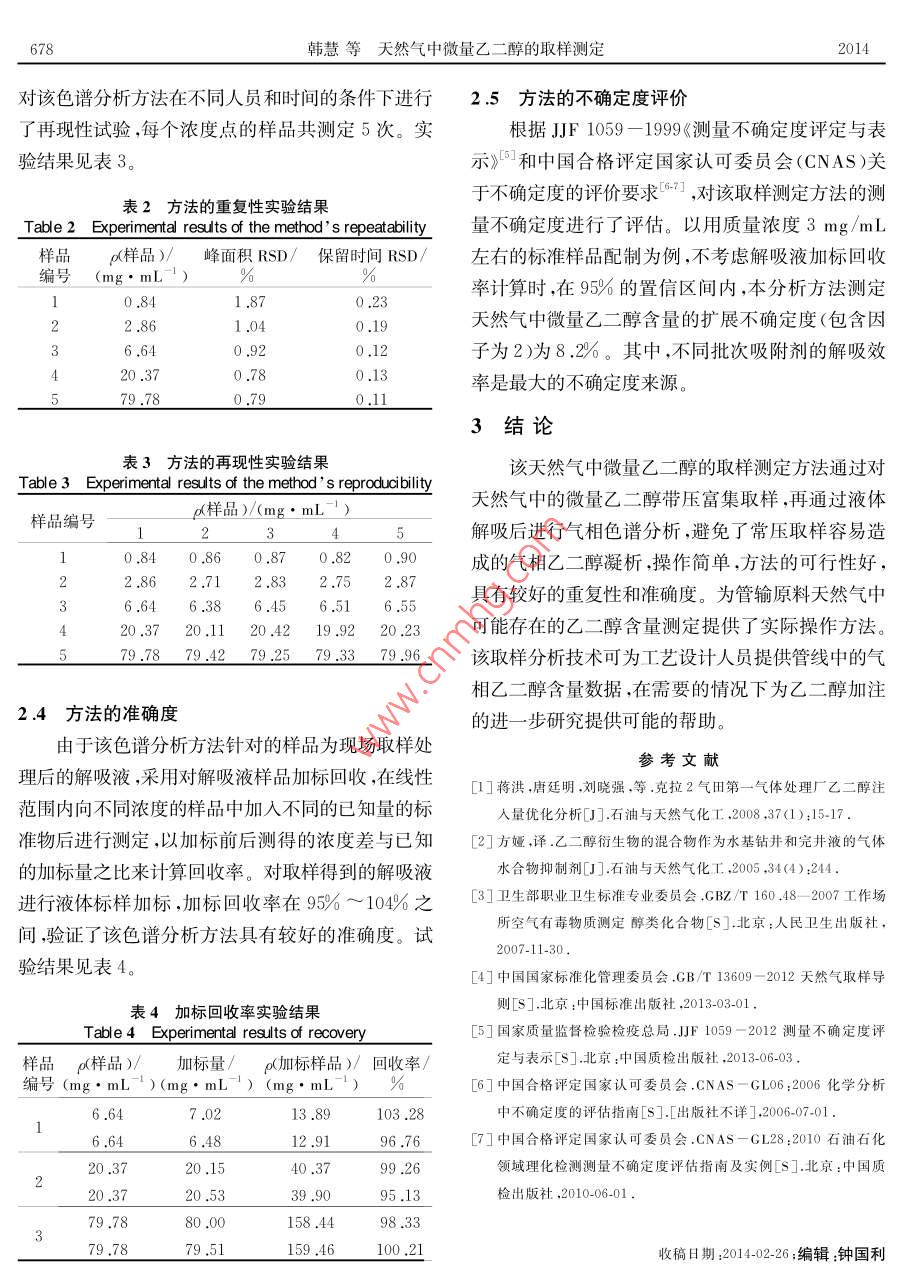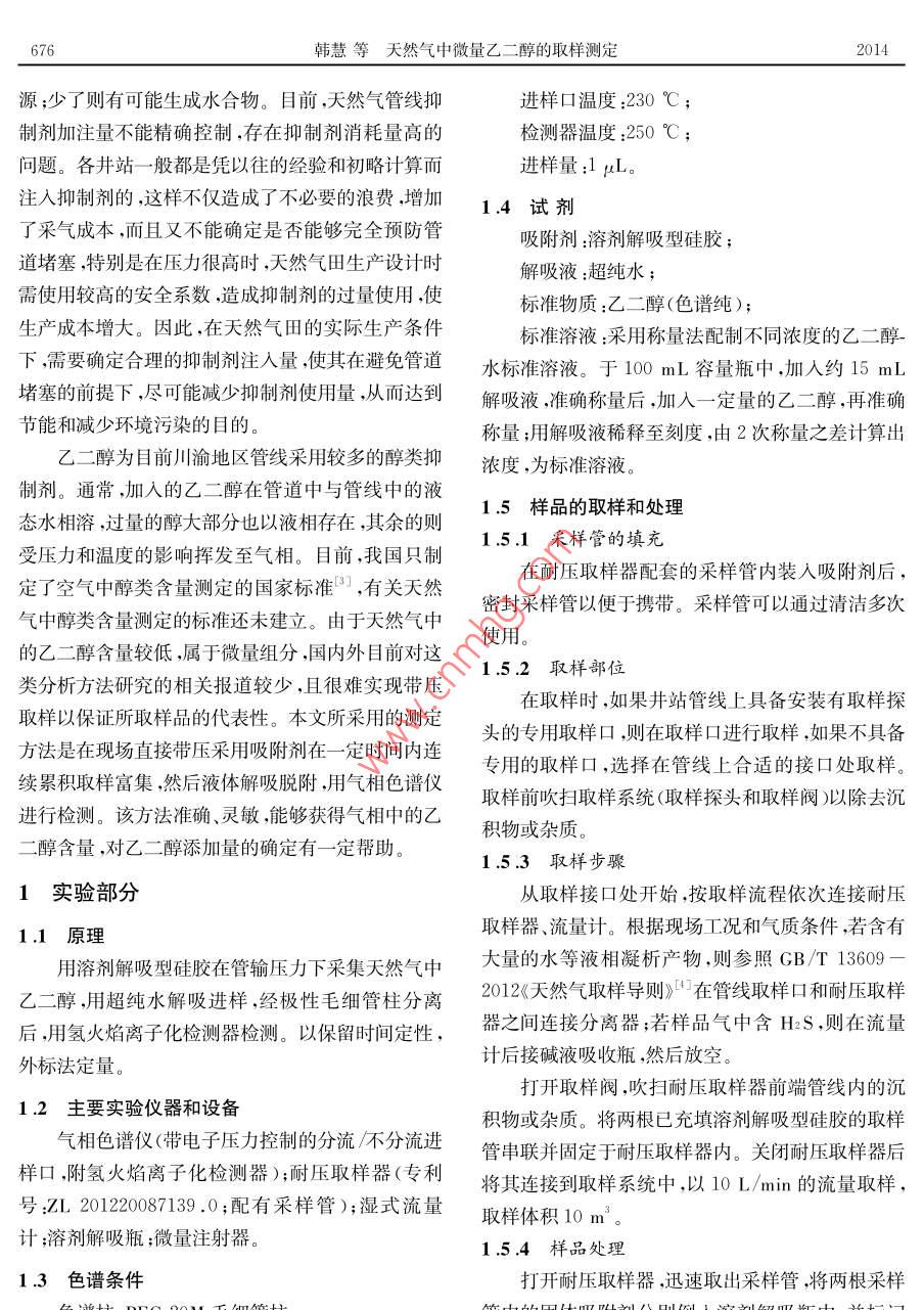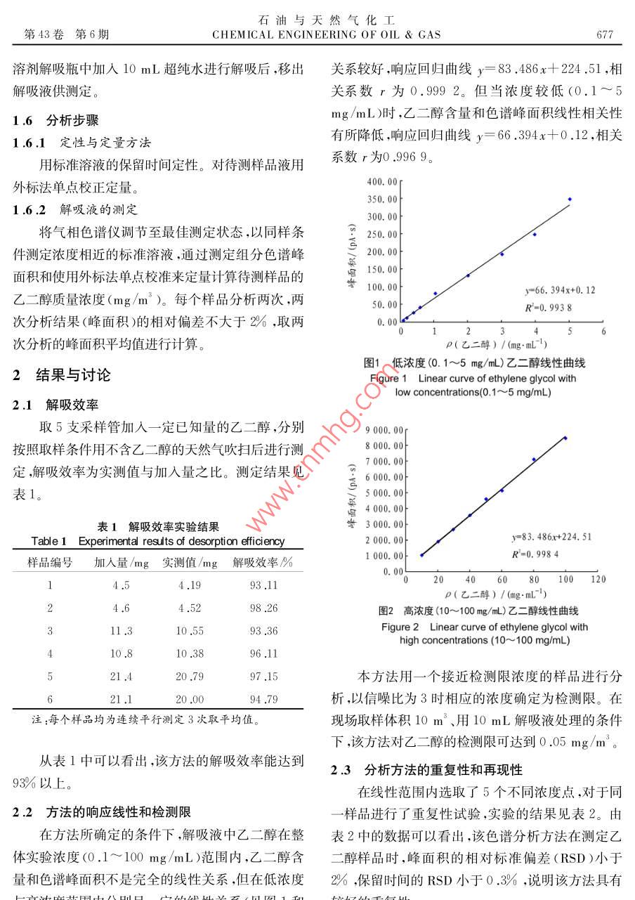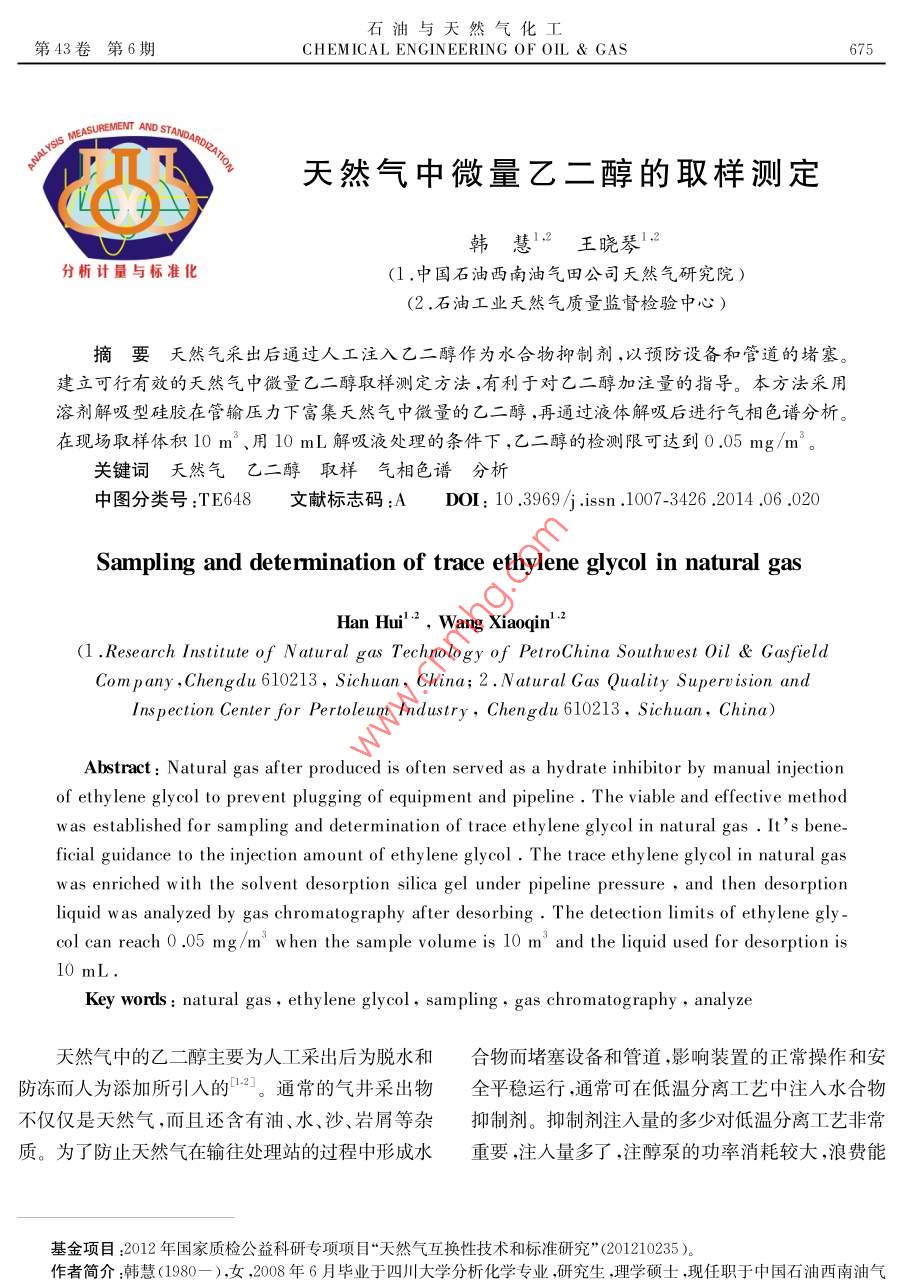 石油與天然氣化工第43卷第6期CHEMICAL ENGINEERING OF OIL gas675UREMENT AND天然氣中微量乙二醇的取樣測定韓慧王曉琴分析計量與標準化(1.中國石油西南油氣田公司天然氣研究院)(2,石油工業(yè)天然氣質(zhì)量監(jiān)督檢驗中摘要夭然氣采出后通過人工注入乙二醇作為水合物抑制劑,以預(yù)防設(shè)備和管道的堵塞。建立可行有效的夭然氣中微量乙二醇取樣測定方法,有利于對乙二醇加注量的指導(dǎo)。本方法采用溶劑解吸型硅膠在管輸壓力下富集夭然氣中微量的♂二醇,再通過液體解吸后進行氣相色譜分析在現(xiàn)場取樣體積10m3、用10mL解吸液處理的條件下,乙二醇的檢測限可達到0.05mg/m。關(guān)鍵詞天然氣乙二醇取樣氣相色譜分析中圖分類號:TE648文獻標志碼:ADO1:10.3969/isn.10073426.2014.06.020Sampling and determination of trace ethylene glycol in natural gasHan Hui, Wang Xiaoqin( Research Institute of Natural gas Technology of Petro China Southwest Oil GasfieldCom pany, Chengdu 610213, Sichuan, China; 2. Natural Gas Quality Supervision andIns pection Center for Pertoleum Industry, Chengdu 610213, Sichuan, China)Abstract Natural gas after produced is often served as a hy drate inhibitor by manual injectionof ethy lene glycol to prevent plugging of equipment and pipeline. The viable and effective methodwas established for sampling and determination of trace ethy lene glycol in natural gas. It's beneficial guidance to the injection amount of ethy lene glycol. The trace ethy lene glycol in natural gaswas enriched w ith the solvent desorption silica gel under pipeline pressure, and then desorptionliquid was analyzed by gas chromatography after desorbing. The detection limits of ethy lene glycol can reach 0.05 mg/m when the sample volume is 10 m and the liquid used for desorption isKey words: natural gas, ethylene glycol, sampling, gas chromatography analyze天然氣中的乙二醇主要為人工采出后為脫水和合物而堵塞設(shè)備和管道,影響裝置的正常操作和安防凍而人為添加所引入的2。通常的氣井采出物全平穩(wěn)運行,通??稍诘蜏胤蛛x工藝中注入水合物不僅僅是天然氣,而且還含有油、水、沙、巖屑等雜抑制劑。抑制劑注入量的多少對低溫分離工藝非常質(zhì)。為了防止天然氣在輸往處理站的過程中形成水重要,注入量多了,注醇泵的功率消耗較大,浪費能基金項目:2012年國家質(zhì)檢公益科研專項項目“天然氣互換性技術(shù)和標準研究”(201210235)作者簡介:韓慧(1980—),女,2008年6月畢業(yè)于四川大學(xué)分析化學(xué)專業(yè),研究生,理學(xué)碩士,現(xiàn)任職于中國石油西南油氣676韓慧等天然氣中微量乙二醇的取樣測定2014源;少了則有可能生成水合物。目前,天然氣管線抑進樣口溫度:230℃制劑加注量不能精確控制,存在抑制劑消耗量高的檢測器溫度:250℃;問題。各井站一般都是憑以往的經(jīng)驗和初略計算而進樣量:1L注入抑制劑的,這樣不僅造成了不必要的浪費增加14試劑了采氣成本,而且又不能確定是否能夠完全預(yù)防管吸附劑:溶劑解吸型硅膠;道堵塞,特別是在壓力很高時,天然氣田生產(chǎn)設(shè)計時解吸液:超純水;需使用較高的安全系數(shù),造成抑制劑的過量使用,使標準物質(zhì):乙二醇(色譜純);生產(chǎn)成本增大。因此,在天然氣田的實際生產(chǎn)條件標準溶液:采用稱量法配制不同濃度的乙二醇-下,需要確定合理的抑制劑注入量,使其在避免管道水標準溶液。于100mL容量瓶中,加入約15mL堵塞的前提下,盡可能減少抑制劑使用量,從而達到解吸液,準確稱量后,加入一定量的乙二醇,再準確節(jié)能和減少環(huán)境污染的目的。稱量;用解吸液稀釋至刻度,由2次稱量之差計算出乙二醇為目前川渝地區(qū)管線采用較多的醇類抑濃度,為標準溶液。制劑。通常,加入的乙二醇在管道中與管線中的液態(tài)水相溶,過量的醇大部分也以液相存在,其余的則1.5樣品的取樣和處理受壓力和溫度的影響揮發(fā)至氣相。目前,我國只制1.5.1采樣管的填充在耐壓取樣器配套的采樣管內(nèi)裝入吸附劑后定了空氣中醇類含量測定的國家標準3,有關(guān)天然氣中醇類含量測定的標準還未建立。由于天然氣中密封采樣管以便于攜帶。采樣管可以通過清潔多次的乙二醇含量較低,屬于微量組分,國內(nèi)外目前對這使用。1.5.2取樣部位類分析方法研究的相關(guān)報道較少,且很難實現(xiàn)帶壓取樣以保證所取樣品的代表性。本文所采用的測定在取樣時,如果井站管線上具備安裝有取樣探頭的專用取樣口,則在取樣口進行取樣,如果不具備方法是在現(xiàn)場直接帶壓采用吸附劑在一定時間內(nèi)連續(xù)累積取樣富集,然后液體解吸脫附,用氣相色譜儀專用的取樣口,選擇在管線上合適的接口處取樣取樣前吹掃取樣系統(tǒng)(取樣探頭和取樣閥)以除去沉進行檢測。該方法準確、靈敏,能夠獲得氣相中的乙積物或雜質(zhì)。醇含量,對乙二醇添加量的確定有一定幫助。1.5.3取樣步驟1實驗部分從取樣接口處開始,按取樣流程依次連接耐壓1.1原理取樣器、流量計。根據(jù)現(xiàn)場工況和氣質(zhì)條件,若含有用溶劑解吸型硅膠在管輸壓力下采集天然氣中大量的水等液相凝析產(chǎn)物,則參照GB/T13609乙二醇,用超純水解吸進樣,經(jīng)極性毛細管柱分離2012《天然氣取樣導(dǎo)則》在管線取樣口和耐壓取樣后,用氫火焰離子化檢測器檢測。以保留時間定性,器之間連接分離器;若樣品氣中含H2S,則在流量外標法定量計后接