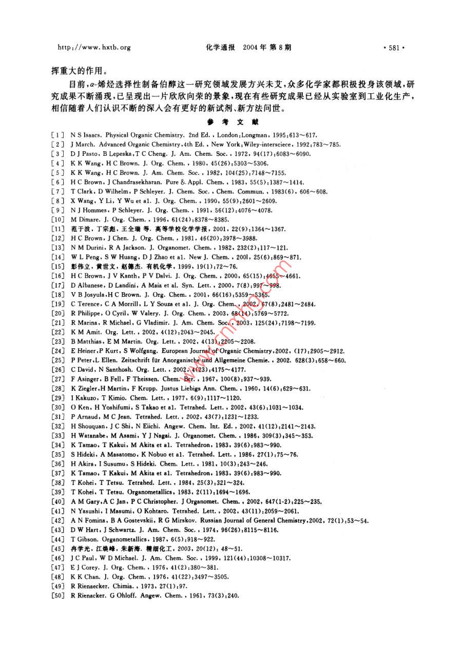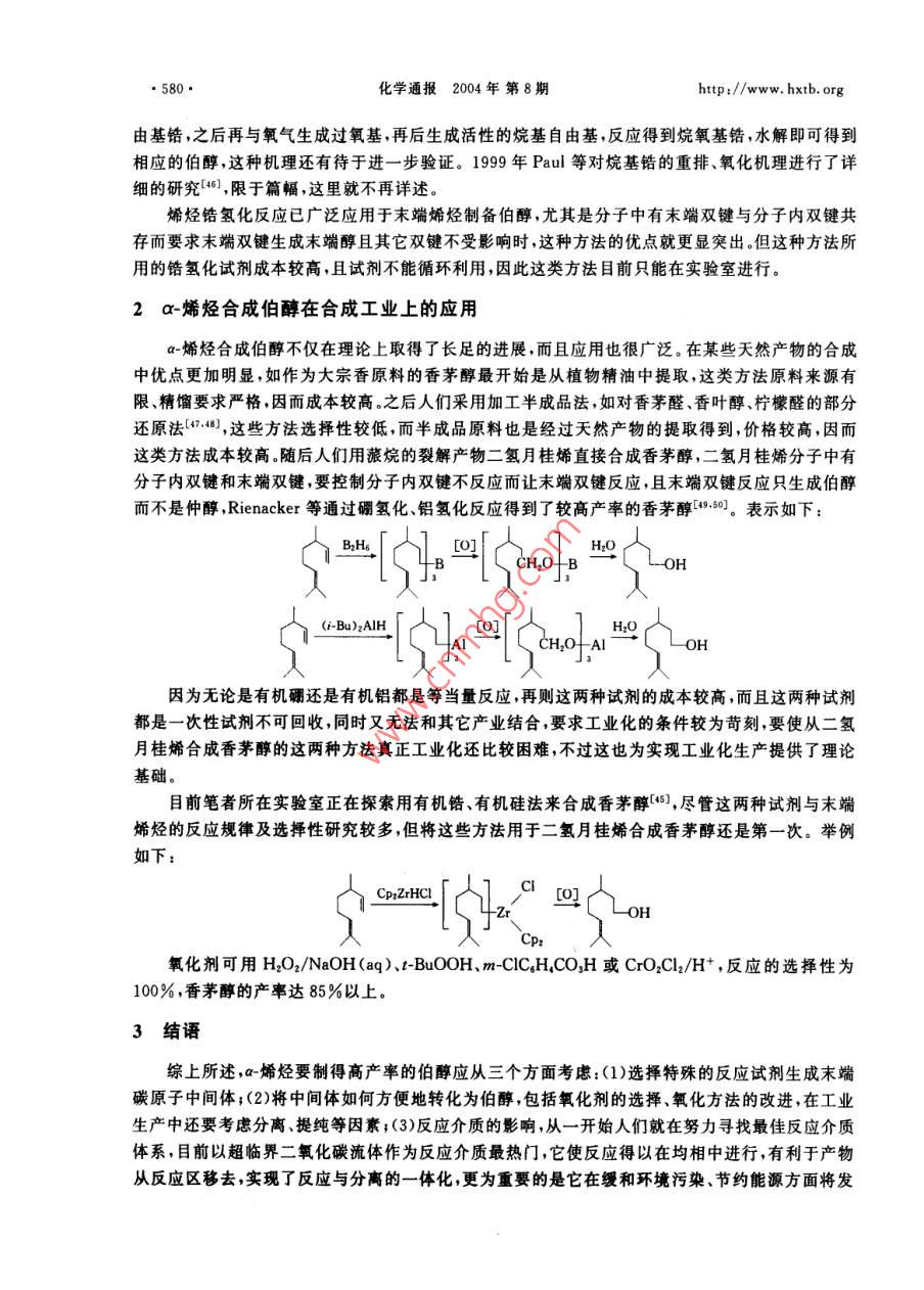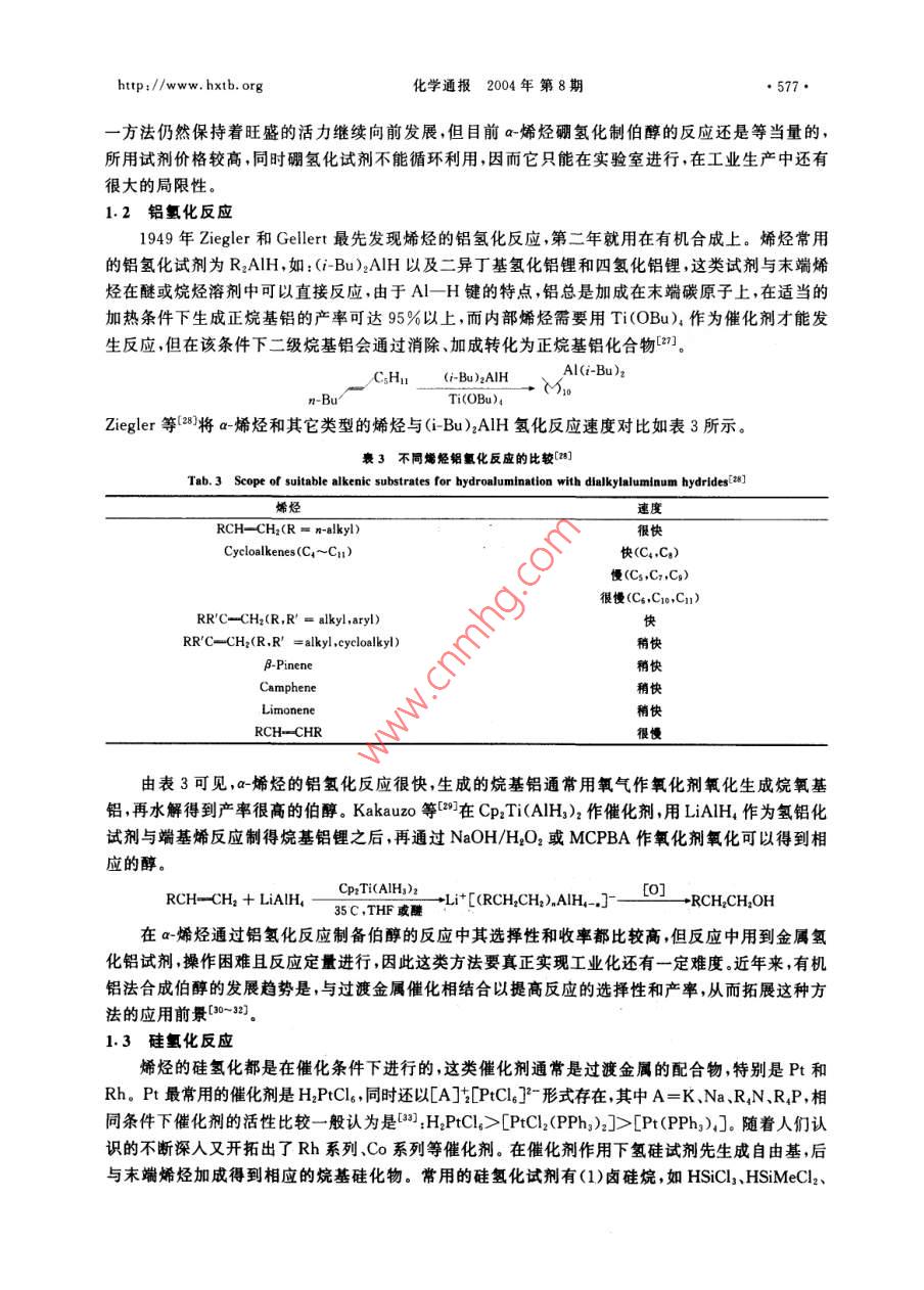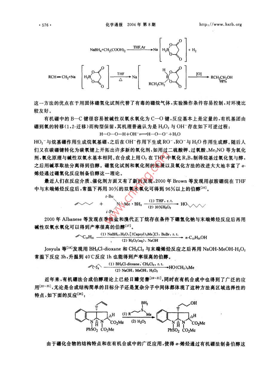 ●574●化學通報2004年 第8期http://www. hxtb. orga-烯烴合成伯醇的研究進展冉學光江煥峰*朱新海許琳(中國科學院廣州化學研究所廣 州510650)摘要綜述了a-烯烴通過有機硼、有機鋁、有機硅、有機鋯氧化水解法選擇性反應(yīng)生成伯醇的研究進展及其合成應(yīng)用。關(guān)鍵詞a-烯烴選擇性伯醇The Progress in Preparation of Primary Alcohol via SelectiveReaction of a-OlefinsRan Xueguang ,Jiang Huanfeng" , Zhu Xinhai ,Xu Lin(Guangzhou Institute of Chemistry ,Chinese Academy of Sciences ,Guangzhou 510650 ,China)Abstract The progress in selective reaction of a-olefins to afford primary alcohols is reviewed inthis paper. These reactions mainly include oxidation-hydrolysis of organoboron, organoaluminum,organosilicon and organozirconium. Also its application is stated in organic-synthesis.Key words a-Olefins ,Selectivity , Primary alcohol以烯烴為原料的合成反應(yīng)是有機合成中用途最廣、最基本的反應(yīng),也是目前報道最深人、最廣泛和系統(tǒng)的化學專題之一。這主要是基于烯烴來源廣泛、價格低廉,引人氧、氮等其它原子之后不僅經(jīng)濟附加值成倍地增長,而且應(yīng)用極其廣泛,因此人們一直在努力通過烯烴合成醇、醛、酮、羧酸、酯、胺、酰胺等化合物。在合成這些化合物的過程中選擇性尤為重要。近幾十年來烯烴的選擇性反應(yīng)已成為有機合成化學研究最興盛并已取得長足進步的領(lǐng)域之--。這些選撣性反應(yīng)包括:區(qū)域選擇性、立體選揮性和對映異構(gòu)選擇性等,特別是最近20年來其理論研究已日臻完善,技術(shù)開發(fā)方面不少工藝已經(jīng)從實驗室走向工業(yè)化生產(chǎn)。a-烯烴選擇性反應(yīng)制備伯醇是其區(qū)域選擇性的一個典型反應(yīng)實例。- 方面,-烯烴的1位和2位碳_上均可以連接羥基分別成為伯醇、仲醇;另一方面當分子中末端雙鍵與非末端雙鍵共存的時候,控制反應(yīng)只生成伯醇更是一件富有挑戰(zhàn)性的工作。本文綜述了a-烯烴選擇性反應(yīng)制備伯醇這方面的工作,主要包括通過a-烯烴分別生成烷基硼、烷基鋁、烷基硅以及烷基鋯,然后氧化-水解制備伯醇。論述了這些反應(yīng)的基本原理、基本路線、優(yōu)缺點及發(fā)展趨勢等。1 a-烯烴反應(yīng)生成伯醇的理論研究1.1 與硼氫化試劑反應(yīng)冉學光男,28 歲,碩士生,現(xiàn)從事有機合成與天然產(chǎn)物的研究與開發(fā)。* 聯(lián)系人,E-mail:jhf@mail gic. ac. cn國家自然科學基金資助項目(20172053)2003-08-02收稿,2003-12-20接受http://www. hxtb. org化學通報2004年 第8期.●575.最初用到的硼氫化試劑為硼烷、簡單鹵代硼烷和烷基取代硼烷,通常用醚或硫醚作反應(yīng)催化劑1.2 ,然而數(shù)十年來,人們雖然對這一加成反應(yīng)進行了大量的動力學研究[3~6]和理論研究[^~10] ,但仍未能提出詳細而明確的反應(yīng)機理。1972年P(guān)asto等對四甲基乙烯在THF溶液中硼氫化反應(yīng)進行的動力學研究結(jié)果提出了交換機理[8],1980年Brown等對多種二烷基取代硼烷與烯烴硼氫化的動力學研究提出了分解機理(4,2001年陶鳳崗等通過理論計算提出了理論模型1。反之硼氫化反應(yīng)的應(yīng)用遠遠超出了理論研究。Brown等(12研究了不同鹵代硼烷、不同溶劑對不同類型烯烴反應(yīng)的選擇性比較,如表1所示。表1不同鹵代硼烷與烯烴反應(yīng)選擇性的比較[12]Tab. 1 Regioselectivtles of hydroborations with haloboranes alkenes[12])選擇性%硼氫化試劑n-Bu~Ph廠7F↑BHs. THF69419 8155 45BH2Cl●OEt2<0.5>99.54 9658 42BH2CI●SMez0.8 99.2793BH:Br●SMer0.4 99.6.6337從表1看出這類硼氫化試劑對a-烯烴加成生成末端烷基硼選擇性很高,由于硼烷為有毒氣體,實驗操作極為不方便,因此人們不斷地開拓出新的硼氫化試劑,如:9-BBN-H、Sia,BH、Chx,BH、MeS.BH.JIpc:BH等硼氫化試劑,這類試劑的特點是硼氫化試劑本身位阻較大。簡單硼烷、大位阻硼烷與不同類型末端烯烴以及一個內(nèi)部烯烴反應(yīng)的選擇性比較如表2所示。衰2不同硼燒與烯烴反應(yīng)選擇性的比較([1]Tab.2 Reloslectvites of bydroboratlons with boranes on alkenes[L8]選擇性/%r-ClOAc廠¥- SiMesBHs●THF6 943 576040653540 60SiaeBH9397955.982559-BBN-H0.1 99.90.2 99.898.9 1.197.6 2.41000表2表明,這類大位阻硼烷作為硼氫化試劑對末端烯烴反應(yīng)的選擇性很高,這主要是空間效應(yīng)起控制作用。當分子中同時存在分子內(nèi)雙鍵與末端雙鍵時其區(qū)域選擇性表現(xiàn)得尤為明顯,這對某些.特殊天然產(chǎn)物的轉(zhuǎn)化是一種非常有用的方法。而且這類硼氫化試劑還有一個優(yōu)點就是只發(fā)生一次加成反應(yīng)。2001年P(guān)eng等[0又開發(fā)出新的硼氫化試劑,即用丙二酸與硼氫化鈉反應(yīng)生成丙二酰氧基硼氫化鈉,它與烯烴反應(yīng)通常也具有高度的選擇性。當分子中有分子內(nèi)雙鍵與末端雙鍵共存時,該試劑只與末端雙鍵反應(yīng)生成相應(yīng)的硼化物,且這類試劑不能進一步 反應(yīng)生成二烷基取代硼氫化物。- -方面由于丙二酰氧基硼氫化鈉空間位阻大,另-方面由于B-H鍵受到兩個酰氧基的影響而變得更為惰性,這表明該硼氫化試劑為單-硼氫化試劑。趙德杰等[5]也得到相同的結(jié)果,生成的丙二酰氧基烷基硼經(jīng)過氧化水解可以得到產(chǎn)率很高的伯醇,表示如下:●576●化學通報2004年 第8期.http:/www. hxtb. orgNaBH+CH2(COOH)2 .THFAr- →Na H2B'pTHF0]RCH一CH2+NaH2B→Na+ RCH2CH2OH△98%RCH2CH2這一