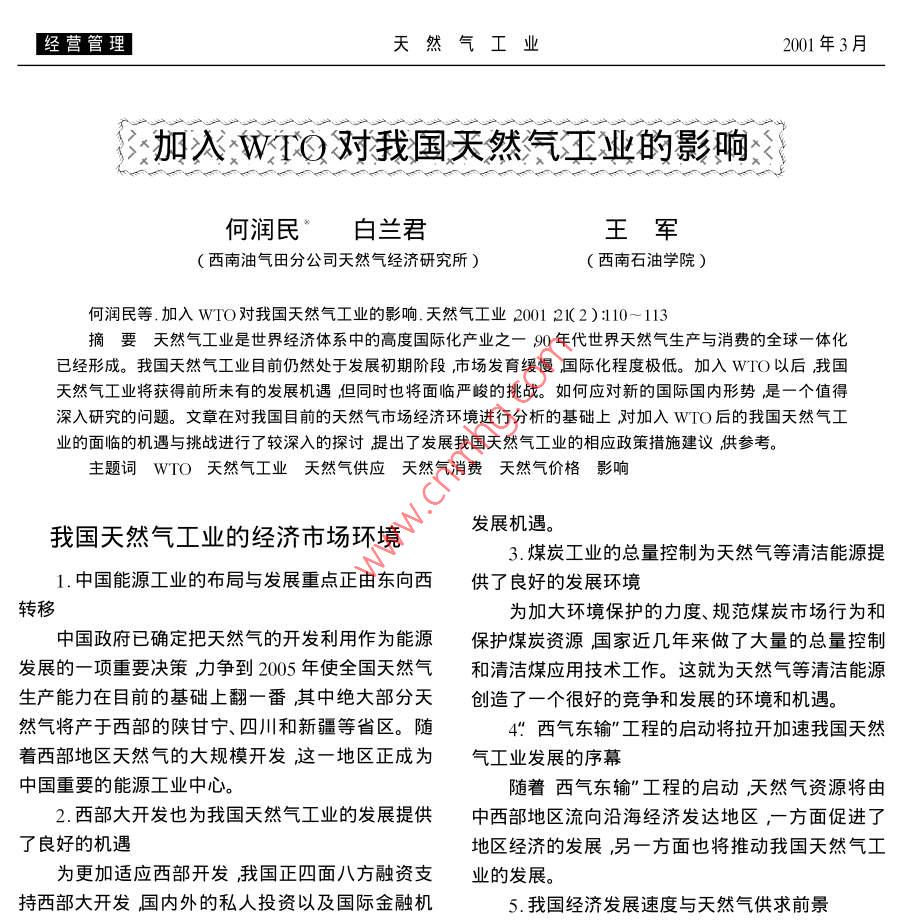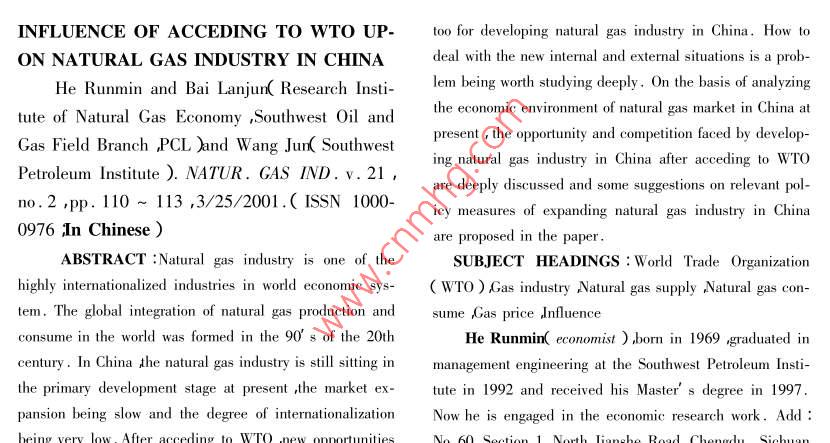 加入WTO對我國天然氣工業(yè)的影響