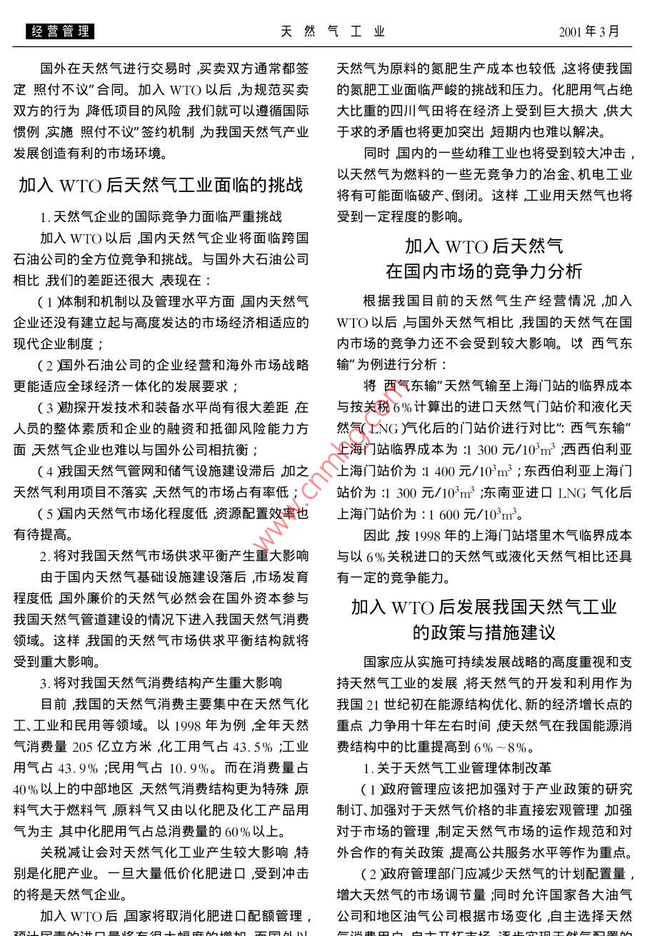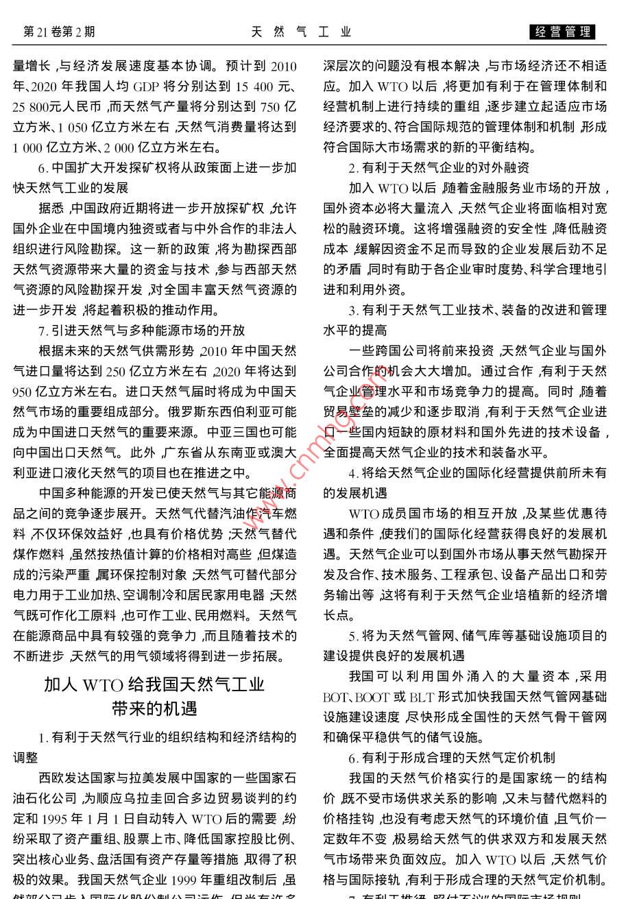 〖經(jīng)營管理天然氣工業(yè)年3月加入WQ對我國天然氣工業(yè)的影響何潤民白蘭君王軍(西南油氣田分公司天然氣經(jīng)濟研究所)西南石油學院)何潤民等加入wTO對我國天然氣工業(yè)的影響天然氣工業(yè)2001212)10-113摘要天然氣工業(yè)是世界經(jīng)濟體系中的高度國際化產(chǎn)業(yè)之一90年代世界天然氣生產(chǎn)與消費的全球一體化已經(jīng)形成。我國天然氣工業(yè)目前仍然處于發(fā)展初期階段,市場發(fā)育緩慢國際化程度極低。加入WIO以后我國天然氣工業(yè)將獲得前所未有的發(fā)展機遇但同時也將面臨嚴峻的挑戰(zhàn)。如何應對新的國際國內(nèi)形勢是一個值得深入研究的問題。文章在對我國目前的天然氣市場經(jīng)濟環(huán)境進行分析的基礎上對加入WTO后的我國天然氣工業(yè)的面臨的機遇與挑戰(zhàn)進行了較深入的探討提出了發(fā)展我國天然氣工業(yè)的相應政策措施建議供參考主題詞WTO天然氣工業(yè)天然氣供應天然氣消費天然氣價格影響我國天然氣工業(yè)的經(jīng)濟市場環(huán)境發(fā)展機遇。3.煤炭工業(yè)的總量控制為天然氣等清潔能源提1.中國能源工業(yè)的布局與發(fā)展重點正由東向西供了良好的發(fā)展環(huán)境轉(zhuǎn)移為加大環(huán)境保護的力度、規(guī)范煤炭市場行為和中國政府已確定把天然氣的開發(fā)利用作為能源保護煤炭資源國家近幾年來做了大量的總量控制發(fā)展的一項重要決策力爭到2005年使全國天然氣和清潔煤應用技術工作。這就為天然氣等清潔能源生產(chǎn)能力在目前的基礎上翻一番其中絕大部分天創(chuàng)造了一個很好的競爭和發(fā)展的環(huán)境和機遇然氣將產(chǎn)于西部的陜甘寧、四川和新疆等省區(qū)。隨西氣東輸”工程的啟動將拉開加速我國天然著西部地區(qū)天然氣的大規(guī)模開發(fā)這一地區(qū)正成為氣工業(yè)發(fā)展的序幕中國重要的能源工業(yè)中心隨著西氣東輸”工程的啟動,天然氣資源將由2.西部大開發(fā)也為我國天然氣工業(yè)的發(fā)展提供中西部地區(qū)流向沿海經(jīng)濟發(fā)達地區(qū),一方面促進了了良好的機遇地區(qū)經(jīng)濟的發(fā)展,另一方面也將推動我國天然氣工為更加適應西部開發(fā)我國正四面八方融資支業(yè)的發(fā)展持西部大開發(fā)國內(nèi)外的私人投資以及國際金融機5.我國經(jīng)濟發(fā)展速度與天然氣供求前景第21卷第2期天然氣工業(yè)〖經(jīng)營管理量增長,與經(jīng)濟發(fā)展速度碁本協(xié)調(diào)。預計到2010深層次的問題沒有根本解決與市場經(jīng)濟還不相適年、20)20年我國人均GDP將分別達到15400元、應。加入WTO以后將更加有利于在管理體制和25800元人民幣而天然氣產(chǎn)量將分別達到750億經(jīng)營機制上進行持續(xù)的重組逐步建立起適應市場立方米、1050億立方米左右天然氣消費量將達到經(jīng)濟要求的、符合國際規(guī)范的管理體制和機制形成1000億立方米、2000億立方米左右。符合國際大市場需求的新的平衡結(jié)構(gòu)。6.中國擴大開發(fā)探礦權將從政策面上進一步加2.有利于天然氣企業(yè)的對外融資快天然氣工業(yè)的發(fā)展加入WTO以后隨著金融服務業(yè)市場的開放據(jù)悉中國政府近期將進一步開放探礦權允許國外資本必將大量流入天然氣企業(yè)將面臨相對寬國外企業(yè)在中國境內(nèi)獨資或者與中外合作的非法人松的融資環(huán)境。這將增強融資的安全性降低融資組織進行風險勘探。這一新的政策將為勘探西部成本緩解因資金不足而導致的企業(yè)發(fā)展后勁不足天然氣資源帶來大量的資金與技術參與西部天然的矛盾同時有助于各企業(yè)審時度勢、科學合理地引氣資源的風險勘探開發(fā)對全國豐富天然氣資源的進和利用外資進一步開發(fā)將起著積極的推動作用3.有利于天然氣工業(yè)技術、裝備的改進和管理7.引進天然氣與多種能源市場的開放水平的提高根據(jù)未來的天然氣供需形勢2010年中國天然些跨國公司將前來投資天然氣企業(yè)與國外氣進口量將達到250億立方米左右2020年將達到公司合作的機會大大增加。通過合作有利于天然950億立方米左右。進口天然氣屆時將成為中國天氣企業(yè)管理水平和市場競爭力的提高。同時隨著然氣市場的重要組成部分。俄羅斯東西伯利亞可能貿(mào)易壁壘的減少和逐步取消,有利于天然氣企業(yè)進成為中國進口天然氣的重要來源。中亞三國也可能口一些國內(nèi)短缺的原材料和國外先進的技術設備向中國出口天然氣。此外廣東省從東南亞或澳大全面提高天然氣企業(yè)的技術和裝備水平。利亞進口液化天然氣的項目也在推進之中。4.將給天然氣企業(yè)的國際化經(jīng)營提供前所未有中國多種能源的開發(fā)已使天然氣與其它能源商的發(fā)展機遇品之間的競爭逐步展開。天然氣代替汽油作汽車燃WTO成員國市場的相互開放,及某些優(yōu)惠待料不僅環(huán)保效益好,也具有價格優(yōu)勢;天然氣替代遇和條件使我們的國際化經(jīng)營獲得良好的發(fā)展機煤作燃料雖然按熱值計算的價格相對高些但煤造遇。天然氣企業(yè)可以到國外市場從事夭然氣勘探開成的污染嚴重屬環(huán)??刂茖ο筇烊粴饪商娲糠职l(fā)及合作、技術服務、工程承包、設備產(chǎn)品出口和勞電力用于