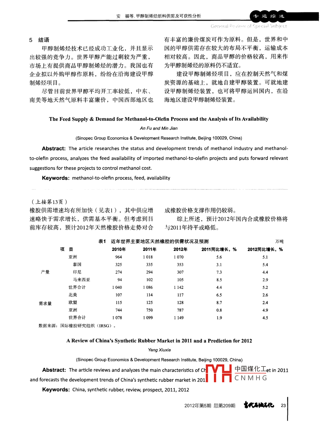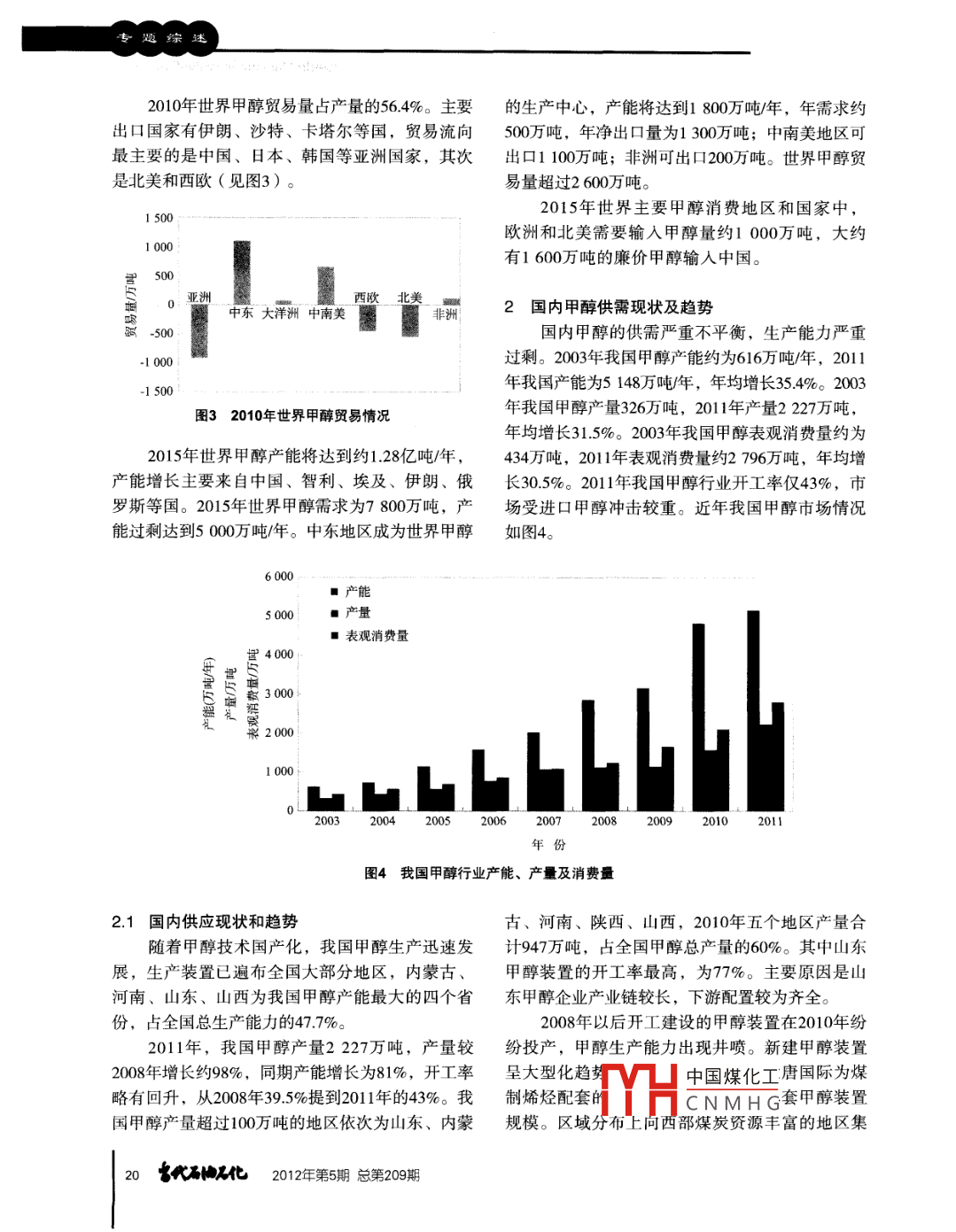甲醇制烯烴原料供需及可獲性分析安福閔劍(中國石化集團公司經(jīng)濟技術研究院,北京100029)摘要:研究了甲醇行業(yè)和甲醇制烯烴的現(xiàn)狀及發(fā)展趨勢,對外購甲醇制烯烴項目的原料可獲性進行了分析,提出了此類項目控制甲醇成本的相關建議關鍵詞:甲醇制烯烴原料可獲性隨著國際原油價格的上漲,新型煤化工在產(chǎn)1世界甲醇供需現(xiàn)狀及趨勢品競爭力方面顯示出較強的競爭力。在我國煤炭2010年世界甲醇生產(chǎn)能力達到8731萬噸/年,資源豐富的內(nèi)蒙古、寧夏等地區(qū)建設的煤經(jīng)甲醇產(chǎn)量為4942萬噸,表觀消費量為4942萬噸。世界制烯烴項目運行情況良好,在我國蒸汽裂解乙烯甲醇產(chǎn)能增長速度超過需求增長速度,產(chǎn)能出現(xiàn)裝置普遍虧損的情況下,具有較強的盈利能力。嚴重過剩的情況。2010年平均開工率為56.6%,比MTO/MTP成功工業(yè)化,擁有良好的商業(yè)前景,已2008年降低了3.5個百分點。世界各地區(qū)甲醇供需經(jīng)成為國內(nèi)化工行業(yè)關注的焦點?,F(xiàn)狀見表1。表12010年世界甲醇供需狀況萬噸地區(qū)產(chǎn)能(萬噸庫年產(chǎn)量進口量出口量衰觀消費量開工率,%492618341239372中東142092.1中南美1025中東歐75661.8非洲160686.0北美8358271.6大洋洲928合計494227852785*注:不包括中東,以下同。1.1供應現(xiàn)狀及趨勢有所減少,但裝置更加大型化。西歐和北美的甲目前甲醇生產(chǎn)裝置主要分布在亞洲、中東醇產(chǎn)能出現(xiàn)萎縮。和中南美等煤炭和天然氣資源比較豐富的地區(qū)2010年以上地區(qū)的甲醇生產(chǎn)能力占到世界總生產(chǎn)收稿日期:201204-07能力858%,其中亞洲占564%,中東占177%,中作者簡介學碩士,高級工程師,1985南美洲占1.7%(見圖1)。最近幾年,亞洲甲醇生年畢業(yè)于中國煤化工中國石化集產(chǎn)能力增長最快,2010年產(chǎn)能達到4926萬噸/年,團公司經(jīng)CNMHG主要從事石主要增長來自于中國。中南美洲總產(chǎn)能比2005年油化工與煤化工項目評估、咨詢和規(guī)劃等工作18北代2012年第5期總第209期安福等.甲醇制烯烴原料供需及可獲性分析中南美洲、中東等地的甲醇企業(yè)規(guī)模大,天其他然氣原料成本低廉,具有很強的競爭力。因此,中東和中南美洲的甲醇裝置開工率較高。預計2015年,世界甲醇生產(chǎn)能力達到12795甲基丙烯酸萬噸/年(見圖1),2010-2015年產(chǎn)能年均增速甲酯2%燃料7.9%,產(chǎn)能增長仍然較快,開工率可能會進甲胺3%步降低。在全部已公開的擴建計劃中,未來全球溶劑4%甲醇新增生產(chǎn)能力主要集中在亞洲,尤其以中國氯甲烷產(chǎn)能增長為主。除中國外,甲醇產(chǎn)能將明顯增長圖22010年世界甲醇消費結(jié)構(gòu)的國家主要有智利、埃及、伊朗、俄羅斯等。另外,由于北美天然氣價格下降,加拿大、美國一受金融危機影響,2010年世界甲醇消費較些閑置的甲醇裝置將會重新啟動。2008年有較大的變化。甲醛主要用于建筑行業(yè)的粘合劑,北美、西歐的經(jīng)濟衰退導致房地產(chǎn)行14000魯大洋洲■中東歐業(yè)不景氣,較大程度地影響甲醛對甲醇的需求,12000北美中南美2010年甲醇消費結(jié)構(gòu)程度地中,用于生產(chǎn)甲醛的100非洲中東甲醇比例下降較快,降低了8個百分點。甲醇作直■西歐■亞洲8000接燃料的消費量增長迅速,占甲醇消費的比例已6000由2008年的78%上升到107%。由于美國禁止使用4000MTBE,歐洲推廣ETBE替代品,從2003年開始,世界MTBE的消費量就在逐年下降,目前,世界2000MTBE消費的甲醇量已從甲醇消費結(jié)構(gòu)的原第二位2005年010年2015年降至第四位。圖1世界甲醇生產(chǎn)能力及地區(qū)分布變化趨勢預計2015年全球甲醇需求量為7800萬噸左右,亞洲仍是世界甲醇消費最大的地區(qū)。甲醇消1.2需求現(xiàn)狀及趨勢費結(jié)構(gòu)中,傳統(tǒng)甲醇消費領域,如甲醛、MTBE等2010年世界甲醇需求為4942萬噸,2005-所占比例將持續(xù)下降,受中國煤化工的影響,直2010年年均增長62%。目前全球甲醇消費地區(qū)集接用于燃料的甲醇,以及用于生產(chǎn)乙烯、丙烯、中在亞洲、西歐和北美等地區(qū),2010年以上區(qū)域二甲醚等產(chǎn)品的甲醇將逐步增多。甲醇總消費量約為4153萬噸,占當年全球總消費1.3世界甲醇貿(mào)易平衡和流向分析量的840%。以上區(qū)域同時也是甲醇的主要凈進口007年以前,世界甲醇供需較為平衡,過剩區(qū)域。產(chǎn)能基本維持在1000萬噸/年以下。2008年以后世界范圍內(nèi),僅中國對甲醇的需求增長供獻甲醇產(chǎn)能擴張迅猛,世界甲醇產(chǎn)能過剩情況急劇惡較大。2008年金融危機發(fā)生后,北美和西歐房地化,到2010年,產(chǎn)能過剩已經(jīng)接近4000萬噸/。產(chǎn)、汽車等行業(yè)的衰退使這些地區(qū)對甲醇的需求預計2013年左右,世界甲醇產(chǎn)能過剩將達到頂峰,量明顯減少,中東地區(qū)大量過剩的甲醇商品涌入超過5500萬噸年,此后甲醇行業(yè)開工率將逐漸恢中國市場。復。世界甲醇市場的供應能力將長期保持過剩。在2010年世界甲醇消費結(jié)構(gòu)中,甲醛是最大由于世界甲醇的主要生產(chǎn)能力分布在亞洲、的消費領域,占27%;其次為直接燃料用途,約中東和中南美,需求主要集中在北美、歐洲和亞占總消費量的17%;第三為醋酸,約占10%;甲洲。供給與需求V凵中國煤化工的世界貿(mào)基叔丁基醚(MTBE)用途約占10%。2