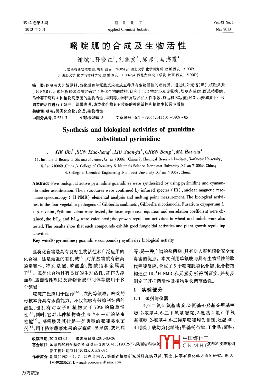第42卷第5期應(yīng)用化工Vol. 42 No.52013 年5月Applied Chemical IndustryMay 2013嘧啶胍的合成及生物活性謝斌',孫曉紅2 ,劉源發(fā),陳邦,馬海霞‘(1.陜西省西安植物園,陜西西安710061 ;2.西北大學(xué)化學(xué)研究所,陜西西安710069;3.西北大學(xué)化學(xué)與材料學(xué)院,陜西西安710069;4. 西北大學(xué)化工學(xué)院,陜西西安710069)摘要:以嘧啶 為起始原料,酸化后和單氰胺反應(yīng)生成五種具有生物活性的嘧啶胍。通過(guò)紅外光譜( IR)、核磁共振('HNMR)、元索分析和熔點(diǎn)測(cè)定確定了各化合物的結(jié)構(gòu).研究了化合物對(duì)小麥赤霉病煙草赤星病、西瓜枯萎病、馬鈴薯干腐病4種植物病原菌的生物活性,得到毒力回歸方程及相關(guān)性系數(shù)、ECo和ECgs值;還對(duì)小麥和蘿卜生長(zhǎng)調(diào)節(jié)的活性進(jìn)行了研究。結(jié)果表明,該類化合物具有較好的抑菌活性和植物生長(zhǎng)調(diào)節(jié)活性。關(guān)鍵詞:嘧啶;胍類化合物;合成;生物活性中圖分類號(hào):0 621.3文獻(xiàn)標(biāo)識(shí)碼:A文章編號(hào):1671 - 3206(2013)05 -0809 -05Synthesis and biological activities of guanidinesubstituted pyrimidineXIE Bin' ,SUN Xiao -hong2 ,U Yuan-fa? ,CHEN Bang' ,MA Hai-xia'(1. Institute of Botany of Shaanxi Province ,Xi' an 710061 ,China;2. Chemical Research Institute , Northwest University ,Xi' an 710069 ,China ;3. Collge of Chemistry & Materials Science , Northwest University ,Xi' an 710069 ,China;4. College of Chemical Engineering, Northwest University , Xi' an 710069 ,China)Abstract: Five biological active pyrimidine guanidines were synthesized by using pyrimidine and cyanam-ide under acidification. Their structures were confirned by infrared spectra ( IR) , nuclear magnetic reso-nance spectroscopy (' H NMR ) elemental analysis and melting point measurement. The biological activi-ties to the four vegetable pathogens of Gibberlla saubineti , Gibberlla nicotiancola , Fusarium oxysporium f.s. p. niveum, Pythium solani were tested, the toxic regression equation and correlation coefficient were ob-tained , the ECso and ECgs were calculated; the growth regulation activities to wheat and radish were alsotested. The results show that such compounds exhibit good fungicidal activities and plant growth regulatingactivities.Key words:pyrimidine ; guanidine compounds; synthesis ; biological activity胍類化合物是具有良好生物活性和廣泛應(yīng)用的等,是一種廣譜的殺菌劑,具有對(duì)人畜和植物安全無(wú)化合物。胍是最強(qiáng)的有機(jī)堿" ,對(duì)某些物質(zhì)有較高毒害的優(yōu)點(diǎn)。本文利用單氰胺與具有生物活性的取的親和性,特別是酸、磷酸脂、羧酸脂和金屬離代嘧啶反應(yīng),合成了5個(gè)嘧啶胍類化合物,化合物結(jié)子(21。胍類化合物具有良好的生理活性,常作為添構(gòu)通過(guò)IR、'HNMR和元素分析得到證實(shí),并初步加劑、表面活性劑以及藥物合成中間體等被用于多測(cè)定了其抑菌活性及植物生長(zhǎng)調(diào)節(jié)活性。個(gè)領(lǐng)域。嘧啶廣泛應(yīng)用于醫(yī)藥135]、農(nóng)藥等領(lǐng)域。嘧啶的1實(shí)驗(yàn)部分母核本身具有殺菌能力。不僅能夠有效抑制細(xì)菌的1.1 試劑與儀器滋生,也擁有對(duì)雙子葉植物大于70%的除草活4.6-二氯-5-氨基嘧啶、2-氨基4-羥基6-甲基嘧性[61,同時(shí),它對(duì)幾種植物寄生蟲也有一定的殺蟲啶、2-氨基4,6-二甲氧基嘧啶、2-氨基4-氯-6-甲氧性能”。嘧霉胺及其鹽是一類典型的嘧啶類殺菌基嘧啶、2-氨基4 ,6-二羥基嘧啶均為自制;吐溫40、劑(8] ,用于防治蔬菜水果的灰霉病、黑星病、灰星病3-_吲哚丁酸均為化學(xué)純;甲基托布津,工業(yè)品;菌種:收稿日期:2013-03-05修改稿日期:2013-03-26中國(guó)煤化工基金項(xiàng)目:國(guó)家自然科學(xué)基金資助項(xiàng)目(21073141 ,31200257);陜西省科學(xué)院YHCN M H夾西科技統(tǒng)籌刨新工程計(jì)劃項(xiàng)目(2012KTCL02-07)作者簡(jiǎn)介:謝斌(1985-),男,臺(tái)灣臺(tái)南人,陜西省植物研究所研究實(shí)習(xí)員,碩士,從事有機(jī)化學(xué)方面的研究。電話:18049283628 , E - mail:0000scar@ sina. com810應(yīng)用化工第42卷小麥赤霉病( Gbebrla saubineti), 煙草赤星病(Gib-三角 瓶依次趁熱取出,用移液槍從低濃度到高濃度berlla nicotiancola) ,西瓜枯萎病( Fusarium oxyspori-依次吸取0.4 mL已知濃度藥液,加入三角瓶,搖勻,umf. s. p. niveum) , 馬鈴薯干腐病( Pythium solani)。則藥液被稀釋為100,250 ,500,1 000 mg/L,迅速倒X4型顯微熔點(diǎn)儀; VarioEL鞏型元素分析儀;人培養(yǎng)皿中,并在培養(yǎng)皿上依次進(jìn)行編號(hào),倒完后平VERTEX 70型紅外分光光度計(jì)( KBr) ; Varian unity放在無(wú)菌操作臺(tái)上冷卻凝固,待用。用高溫滅菌后INOVA- 400超導(dǎo)核磁共振儀。的注射器針頭將4種真菌的菌餅菌絲朝下置于裝有.2 化合物的合成含藥培養(yǎng)基的平板中央,按一定順序放在恒溫培養(yǎng)合成路線如下:箱中,在28 C下培養(yǎng)72 h。R一NH,濃HCl>R一NH,●HCl+NH.CN1.3.5抑菌活性測(cè)試 72 h后,取出培養(yǎng)皿,測(cè)量NH菌落直徑(以游標(biāo)卡尺測(cè)量,十字交叉2次,取平均)。重復(fù)測(cè)量3次,取平均值進(jìn)行抑制率的計(jì)算:"0),→R-NH NH,●HCl抑制率=:空白對(duì)照菌落直徑=處理菌落直徑x 100%空白對(duì)照菌落直徑-4NF1.4植物生長(zhǎng)活性11]1.4.1 種子前處理 因?yàn)樽尤~形狀大小基本均勻R- NHNH,●HCI- NaOH+ R--NH NH,可以保證實(shí)驗(yàn)的準(zhǔn)確,所以選擇單子葉(小