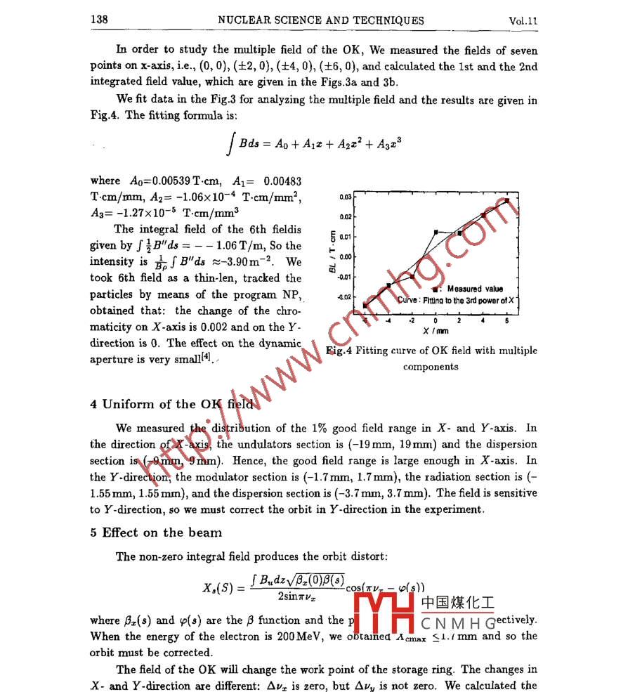 Vol.11 No.2NUCLEAR SCIENCE AND TECHNIQUESMay 2000Analysis of the measurement field of the optical klystron*DIAO Cao Zheng, XU Hong Liang, JIA QiKa, LI Ge, LI Jing-Yi, LI Wei-Min,ZHOU An-Qi, LIU Gong-Fa, LI Yong-Jun, YAO Cheng-Gui, HE Duo Hui(National Synchrotron Radiation Laboratory,The University of Science and Technology of China, Hefei 230029)AbstractThe measured fields of the optical klystron in NSRL (National Sy-chrotron Radiation Laboratory) are given, including the distribution on the axis, andthe integrated feld distribution. The harmonic magnet field and the spectra of thespontaneous enission are analyzed, and the multiple field is presented by ftting thediagram. The infuence of the integrated field on the close orbit of the bearn and onthe operation paramneters of the storage ring, and the compensation in the cxperimentare also discussed.Keywords Optical klystron, Integrated field, Multiple ficldCLC numbers TL501, TL5941 IntroductionThe NSRL storage ring in Hefei, China has been routinized to run for users since1993. An optical klystron (0K) has been designed and constructed for investigation ofthe storage ring FELL. In the process of manufacturing the optical klystron, because ofthe errors come from the production of the magnet blocks, the fix of the blocks, and thequality of the blocks etc., the magnet field is not ideal and it afects the gain of FEL,the spontaneous emission and the operation of the storage ring. Hence we must analyzethe field of the optical klystron seriously.The measurement fields are presented by Hall probe technical2]. The oritentedprecision of the measurerent device is 0.01 mm/m. The position of measurement pointis located by the dual- frequence laser, and the precision is土5 pm. The size of the hallprobe is 0.5 mmx1 mm. The sampling points is 80 in each period of the magnet field,and the step is 0.9 mm.2 The field distribution on axis and the effect on the spontaneous emis-sionIn order to get the information of the中國煤化工.m SE3D to simulatethe spontaneous emission with the measthe harmonic fieldby using the method of FFT (Fast FouriYHCNMHGThe condition of the 0K is that the gap of the dispersion section is 55 and the gapsof the undulators are 40 mm.Supported by 863 CHG FEL fund and the youth fund of USTCManyssipt preceived date:99-11-23*Email: dex@ustc.edu.cnNo.2 DIAO Cao _Zheng et al: Analysis of the measurement field of the optical klystron137The measured field of Y -axis is approximately a sine function and it is consistentwith the theoretic result. Each peak field of the undulators is different and the RMS ofthe spread of the peak feld is 1.5%.The spatial harmonic distribution of the field will distorted the orbit of the beam,and affect the emission of the optical klystron3l. We analyzed the measured fields byFFT and the result is given in Fig.1. The 7th and 11th harmonics are showed in the figureexpect the 5th, 9th and 13th harmonics. However, the amplitudes are very small (10- 3order of the 1st harmonic), so they are not affect the emission of the optical klystron.We simulated the spontaneous emission of the 0K with the measurement field by theprogram SE3D and the result is shown in Fig.2. The modulated rate is 0.98, approximateto the ideal field. Hence the field distribution on axis is good.。1rm0.0的1001001011Hrmonlc numborsA InmFig.1 Distribution of the OK harmonic fieldFig.2 Spontaneous crmission of the OK3 Integrated fieldWe integrated the field at the direction of Y -axis, and obtained that the 1st integralvalue is 0.005 T.cm and the 2nd integral value is 0.04T.cm2 .The offsets of angle and the position at the exits of OK are x'(z)=9.1x 10-5 rad and△x=- 4.22x10 -3 mm when the energy of the electron is 163 MeV.0.02 |201}-i 0∞0-中國煤化工101-MYHCNMHG-0.02 I@)(b方4”2o24古X /mmFig.3 First integral (a) and 2nd integral (b) over' OK length v8.出138NUCLEAR SCIENCE AND TECHNIQUES ,Vol.11In order to study the multiple field of the OK, We measured the fields of sevenpoints on x-axis, i.e., (0, 0}, (土2, 0}, (士4, 0), (土6, 0), and calculated the 1st and the 2ndintegrated field value, which are given in the Figs.3a and 3b.We fit data in the Fig.3 for analyzing the multiple field and the results are given inFig.4. The ftting formula is:Bds= Ao+ Az+ Azz2 + Ax3where Ao=0.00539T.cm, A1= 0.00483T.cm/mm, A2= -1.06x10-4 T.cm/mm2,03A3= -1.27x10-5 T.cm/mm30.02The integral field of the 6th fieldis,..01given by SIB"ds=一- 1.06T/m, So the0.00intensity is 言」B"ds≈-3.90m-2. Wetook 6th field as a thin-len, tracked theo.011: Measured valueparticles by means of the program NP,.020Cuve : Fting to the 3rd Dower o1X-obtained that: the change of the chro-maticity on X-axis is 0.002 and on the Y-x /mmdirection is 0. The effect on the dynamicFig.4 Fitting curve of OK feld with multipleaperture is very smll4l. .components4 Uniform of the OK fieldWe measured the distribution of the 1% good field range in X- and Y-axis. Inthe direction of X-axis, the undulators section is (-19 mm, 19mm) and the dispersionsection is (-9mm, 9mm). Hence, the good field range is large enough in X-axis. Inthe Y-direction, the modulator section is (-1.7 mm, 1.7 mm), the radiation section is (-1.55 mm, 1.55 mm), and the dispersion section is (-3.7 mm, 3.7 mm). The field is sensitiveto Y-direction, so we must correct the orbit in Y -direction in the experiment.5 Effect on the beamThe non-zero integral field produces the orbit distort:xX,(S)= IB.devV-208CO).cos(πv, - 4(s))2sinπVx中國煤化工where βz(s) and p(s) are the β function and the PTHC N M H Gectively.When the energy of the electron is 200MeV, we obtainea Acmax≤1.1 mm and so theorbit must be corrected.The field of the 0K will change the work point of the storage ring. The changes inX- and Y-direction are diferent: Ovx is zero, but Ovy is not zero. We calculated the萬方縝媧ge of the work point by resorting to the measured field,No.2 DIAO Cao Zheng et al: Analysis of the measurement field of the optica