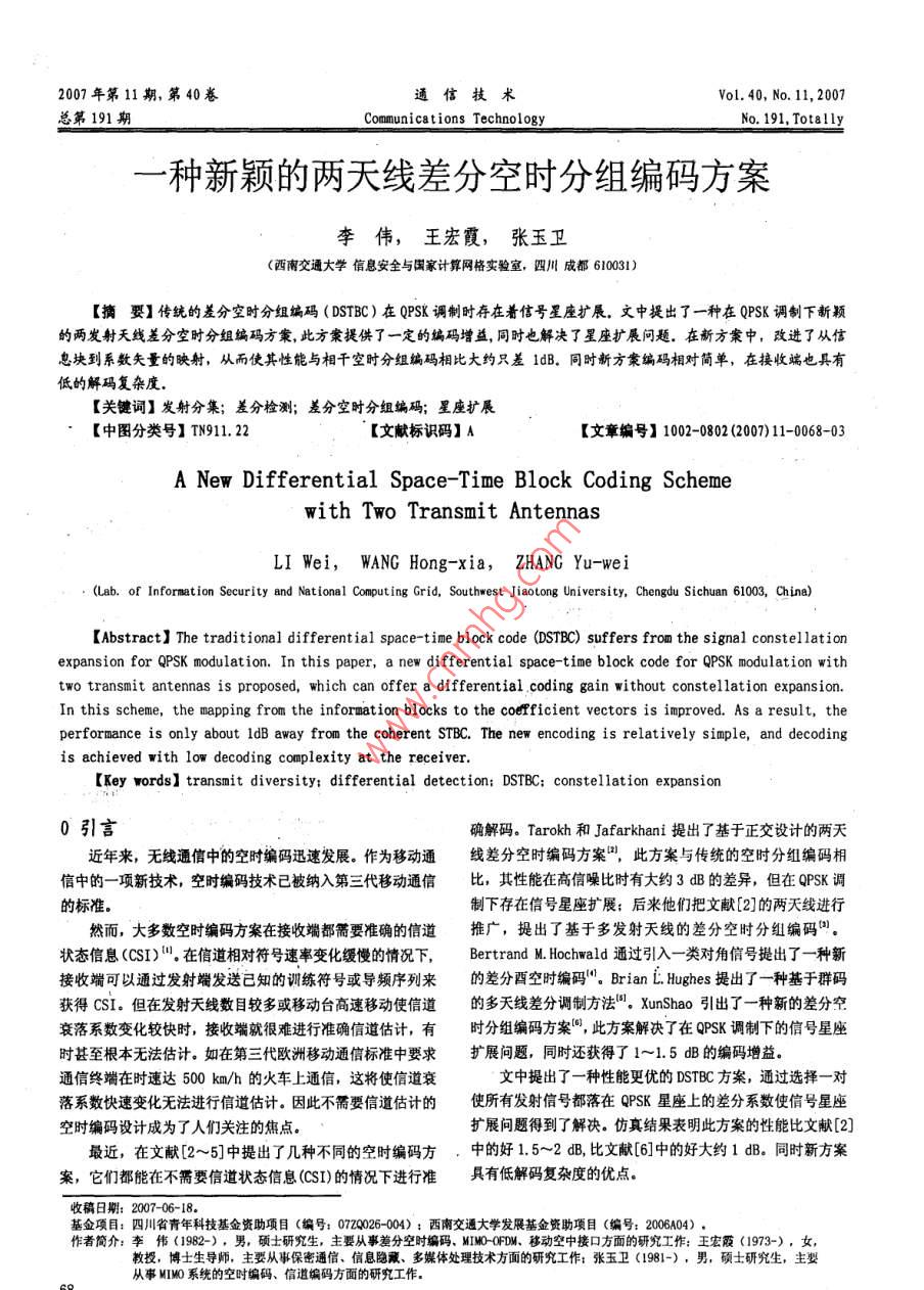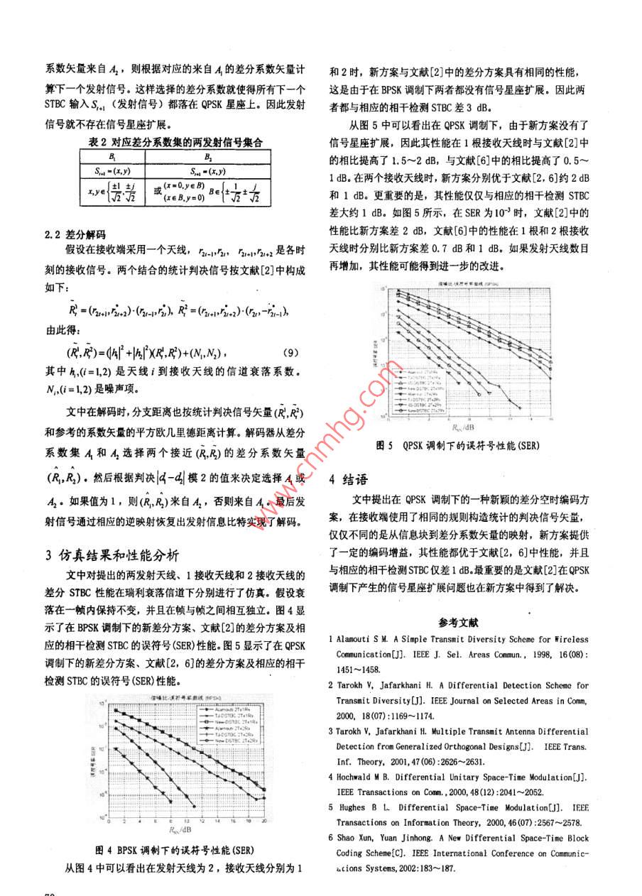 2007年第11期,第40卷通信技術Vol.40,No.11,2007總第191期Communications TechnologyNo. 191, To種新穎的兩天線差分空時分組編碼方案李偉,王宏霞,張玉衛(wèi)(西南交通大學信息安全與國家計算網格實驗室,四川成都610031)【摘要】傳統(tǒng)的差分空時分組編碼( DSTBC)在QPSK調制時存在著信號星座擴展。文中提出了一種在QPSK調制下新穎的兩發(fā)射天線差分空時分組編碼方策,此方案提供了一定的編碼增益,同時也解決了星座擴展問題。在新方案中,改進了從信息塊到系數矢量的映射,從而使其性能與相干空時分組編碼相比大約只差1dB.同時新方象編碼相對簡單,在接收端也具有低的解瑪復雜度【關鍵詞】發(fā)射分集;差分檢測;差分空時分組編碼;星座擴展【中圖分類號】TN911.22【文獻標識碼】A【文章編號】1002-0802(2007)11-0068-03A New Differential Space-Time Block Coding Schemewith two Transmit antennasLI Wei, WANG Hong-xia, ZHANG Yu-wei(Lab. of Information Security and National Computing Grid, Southwest Jiaotong University, Chengdu Sichuan 61003, China)(Abstract] The traditional differential space-time block code(DSTBC)suffers from the signal constellationexpansion for QPSK modulation. In this paper, a new differential space-time block code for QPSK modulation withtwo transmit antennas is proposed, which can offer a differential coding gain without constellation expansion.In this scheme, the mapping from the information blocks to the coefficient vectors is improved. As a result, theperformance is only about ldb away from the coherent STBC. the new encoding is relatively simple, and decodingis achieved with low decoding complexity at the receiver[Key words] transmit diversity: differential detection: DSTBC: constellation expansi0引言確解碼。 Tarokh和 Jafarkhani提出了基于正交設計的兩天近年來,無線通信中的空時編碼迅速發(fā)展。作為移動通線差分空時編碼方案,此方案與傳統(tǒng)的空時分組編碼相信中的一項新技術,空時編碼技術已被納入第三代移動通信比,其性能在高信噪比時有大約3dB的差異,但在QPSK調的標準。制下存在信號星座擴展;后來他們把文獻[2]的兩天線進行然而,大多數空時編碼方案在接收端都需要準確的信道推廣,提出了基于多發(fā)射天線的差分空時分組編碼狀態(tài)信息(CSI)在信道相對符號速率變化緩慢的情況下, Bertrand M Hochwald通過引入一類對角信號提出了一種新接收端可以通過發(fā)射端發(fā)送已知的訓練符號或導頻序列來的差分酉空時編碼"。 Brian L. Hughes提出了一種基于群碼獲得CSI。但在發(fā)射天線數目較多或移動臺高速移動使信道的多天線差分調制方法, Xun Shae引出了一種新的差分空衰落系數變化較快時,接收端就很難進行準確信道估計,有時分組編碼方案,此方案解決了在QPSK調制下的信號星座時甚至根本無法估計。如在第三代歐洲移動通信標準中要求擴展問題,同時還獲得了1~1.5dB的編碼增益。通信終端在時速達500km/h的火車上通信,這將使信道衰文中提出了一種性能更優(yōu)的 DSTBC方案,通過選擇一對落系數快速變化無法進行信道估計。因此不需要信道估計的使所有發(fā)射信號都落在QPSK星座上的差分系數使信號星座空時編碼設計成為了人們關注的焦點擴展問題得到了解決。仿真結果表明此方案的性能比文獻[2]最近,在文獻[2~5]中提出了幾種不同的空時編碼方,中的好15~2dB,比文獻[6]中的好大約1dB同時新方案案,它們都能在不需要信道狀態(tài)信息CSI)的情況下進行準具有低解碼復雜度的優(yōu)點收稿日期:2007-06-18基僉項目:四川省青年科技基金資助項目(編號:072026-004):西南交通大學發(fā)展基金資助項目(編號:200604),作者簡介:李偉(1982-),男,碩士研究生,主要從事差分空時編碼、M-ΦFDM、移動空中接口方面的研究工作:王宏霞(1973-),女,教授,博士生導師,主要從事保密通信、信息隱藏、多媒體處理技術方面的研究工作;張玉衛(wèi)(1981-),男,碩士研究生,主要從事MI系統(tǒng)的空吋編碼、信道編碼方面的研究工作1傳統(tǒng)的差分分組編碼2新的差分空時分組編碼假設兩個發(fā)射天線和個接收天線的系統(tǒng),且采用MPSK2.1差分編碼器調制:文獻[2]中從信息塊到差分系數矢量的映射如式(3)所A={ew/√2,k=0,示。差分系數矢量與初始參考發(fā)射信號和映射符號有關,從其中M=2°,文獻[2]差分STBC編碼器如圖1所示而促使發(fā)射信號可能落在QPSK星座之外,如文獻[2]中發(fā)射信號就擴展到了9QAM星座文中根據當前的格雷映射符號提出了一種新的信息塊到差分系數矢量的映射。在時間2+1,編碼器的4bbitYapping它們表示為al,a2t,t3.,d2,通過差分星座映射Md)調制成4個符號,其中b=log(M),M是星座符號個數。圖1差分空時編碼器如圖1發(fā)射天線開始發(fā)射任意初始信號矢量S1=(51,52),●01接收端并不知道此信號且不攜帶任何信息。經過STBC之后在時間1分別從發(fā)射天線1和發(fā)射天線2發(fā)射信號S和S2,并在時間2分別從發(fā)射天線1和發(fā)射天線2發(fā)射信號●11S2,和S.假設S,=S2,S2是在第t+1個編碼操作中反頃到STBC中的信號矢量,編碼器就生成兩個信號矢量圖3ad.,d2l或d,d,的信號星座映射(S1,S)和(-S2S}n)形成一對正交基:調制信號按照下面的結合產生兩個混合信號構成差分D(S)=(1)系數矢量R=M(dl,42)+M(d-,dt,),信號(S21,S2)和(-S23S)在兩個時刻分別從發(fā)射R=M(d,2)-M(d-,d1)天線1和發(fā)射天線2發(fā)送,D(S)是計算下一個STBC輸入可得差分系數矢量:S,=(S2,S2+2)的參考矩陣:R RS,1=R D(S),其中R1=(RR2