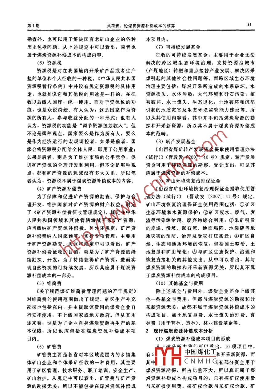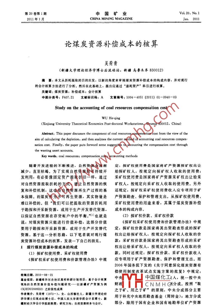 第20卷第1期中國(guó)礦業(yè)Vol. 20, No. 12011年1月CHINA MINING MAGAZINEJan.2011論煤炭資源補(bǔ)償成本的核算吳荷青(新疆大學(xué)理論經(jīng)濟(jì)學(xué)博士后流動(dòng)站,新疆烏魯木齊830012)摘要:本文從折耗提取的目的出發(fā),以新的角度來(lái)審視煤炭資源補(bǔ)償成本的構(gòu)成內(nèi)容,并對(duì)現(xiàn)行的會(huì)計(jì)核算方法進(jìn)行了分析。然后在此基礎(chǔ)上,提出應(yīng)通過(guò)“遞耗資產(chǎn)”科目進(jìn)行核算。關(guān)鍵詞:煤炭資源;補(bǔ)償成本;會(huì)計(jì)核算中圈分類(lèi)號(hào): F407.21文獻(xiàn)標(biāo)識(shí)碼: A文章編號(hào): 1004-4051 (2011) 01-0040-03Study on the accounting of coal resources compensation costWU He-qing(Xinjiang University Theoretical Economics Post doctoral Workstations, Urumqi 830012, China)Abstract: This paper discusses the component of coal resources compensation cost from the view of theaim of calculating the depletion, and then analyzes the current method of accounting coal resources compen-sation cost, Finally, the paper puts forward some suggestion to accounting the compensation cost throughthe wasting asset accounts.Key words: coal resources; compensation cost; accounting methods隨著開(kāi)發(fā)進(jìn)程的不斷推進(jìn),自然資源會(huì)逐漸定:探礦權(quán)使用費(fèi)是國(guó)家將礦產(chǎn)資源探礦權(quán)出讓減少,直至枯竭。為了實(shí)現(xiàn)自然資源的可持續(xù)開(kāi)給探礦權(quán)人,按規(guī)定向探礦權(quán)人收取的使用費(fèi);發(fā)利用,有必要像固定資產(chǎn)提取折舊一樣,通過(guò)采礦權(quán)使用 費(fèi)是國(guó)家將礦產(chǎn)資源采礦權(quán)出讓給采對(duì)自然資源提取折耗的方式,建立自然資源的恢礦權(quán)人,按規(guī)定向采礦權(quán)人收取的使用費(fèi)。另外復(fù)和補(bǔ)償機(jī)制,這也是自然資源再生產(chǎn)過(guò)程的基還規(guī)定:探礦權(quán)采礦權(quán)使用費(fèi)收入應(yīng)專(zhuān)項(xiàng)用于礦本保障。而煤炭作為不可再生資源,其實(shí)物量是產(chǎn)資源勘查、保護(hù)和管理支出。從探礦權(quán)使用費(fèi)、難以補(bǔ)償?shù)?。但“我們可以把提取的資源折耗用采礦權(quán)使用費(fèi)的用途來(lái)看,其屬于煤炭資源補(bǔ)償于勘探和開(kāi)采新資源,或用于生產(chǎn)開(kāi)發(fā)替代資源,成本的構(gòu)成內(nèi)容。以保證自然資源在存貨帳戶中的平衡?!盵也就是(2)探礦權(quán)價(jià)款、采礦權(quán)價(jià)款說(shuō),對(duì)煤炭資源只能進(jìn)行價(jià)值補(bǔ)償,這部分價(jià)值《探礦權(quán)采礦權(quán)使用費(fèi)和價(jià)款管理辦法》中規(guī)要用于勘探和開(kāi)采新資源,或用于生產(chǎn)開(kāi)發(fā)替代定:探礦權(quán)價(jià)款是國(guó)家將其出資勘查形成的探礦資源?;谶@一分析思路,以下筆者就對(duì)現(xiàn)行煤權(quán)出讓給探礦權(quán)人,按規(guī)定向探礦權(quán)人收取的價(jià)炭資源補(bǔ)償成本的核算,發(fā)表一下自己的拙見(jiàn)???采礦權(quán)價(jià)款是國(guó)家將其出資勘查形成的采礦1現(xiàn)行煤炭資源補(bǔ)償成本的構(gòu)成權(quán)出讓給采礦權(quán)人,按規(guī)定向采礦權(quán)人收取的價(jià)(1)探礦權(quán)使用費(fèi)、采礦權(quán)使用費(fèi)款。同時(shí)還規(guī)定:探礦權(quán)價(jià)款、采礦權(quán)價(jià)款收人應(yīng)專(zhuān)項(xiàng)用于礦產(chǎn)資源勘查、保護(hù)和管理支出。而2006年國(guó)務(wù)院下發(fā)的《關(guān)于同意深化煤炭資源有償使用制度改革試點(diǎn)實(shí)施方案的批復(fù)》中規(guī)定:收稿日期: 2010-08-21基金項(xiàng)目:新疆維吾爾自治區(qū)高??蒲杏?jì)劃項(xiàng)目:基于會(huì)計(jì)核算中央中國(guó)煤化工人,統(tǒng)一按中央.視角的自然資源價(jià)值補(bǔ)償問(wèn)題研究一-以新疆礦產(chǎn)資源為例財(cái)政|Y片CN MHG分成。按照“取(XJEDU2009132)之階段性成果之于礦、用之于礦”的原則,中央分成部分主要作者簡(jiǎn)介:吳荷青(1973-). 女山西榆社人,新疆大學(xué)理論經(jīng)用于補(bǔ)充中央地質(zhì)勘查基金(周轉(zhuǎn)金);地方分成濟(jì)學(xué)博士后流動(dòng)站博士后,中國(guó)人民大學(xué)商學(xué)院會(huì)計(jì)系博士,新疆財(cái)經(jīng)大學(xué)會(huì)計(jì)學(xué)院副教授,研究方向:自然資源財(cái)務(wù)與會(huì)計(jì). .部分,除用于國(guó)有企業(yè)和國(guó)有地勘單位礦產(chǎn)資源第1期吳荷青:論煤炭資源補(bǔ)償成本的核算1勘查外,也可以用于解決國(guó)有老礦山企業(yè)的各種本項(xiàng)目?jī)?nèi)。歷史包袱問(wèn)題。從上述規(guī)定中可以看出,兩者也(7)可持續(xù)發(fā)展基金屬于煤炭資源補(bǔ)償成本的構(gòu)成內(nèi)容。征收的可持續(xù)發(fā)展基金,主要用于企業(yè)無(wú)法(3) 資源稅解決的跨區(qū)域生態(tài)環(huán)境治理、支持資源型城市資源稅是對(duì)在我國(guó)境內(nèi)開(kāi)采礦產(chǎn)品或者生產(chǎn)(產(chǎn)煤地區(qū))轉(zhuǎn)型和重點(diǎn)接替產(chǎn)業(yè)發(fā)展、解決因采鹽的單位和個(gè)人征收的一種稅。《中華人民共和國(guó)煤引起的其他社會(huì)性問(wèn)題等。而跨區(qū)域生態(tài)環(huán)境資源稅暫行條例》中并沒(méi)有規(guī)定資源稅的具體用治理主要包括:煤炭開(kāi)采所造成的水系破壞、水途,也就是說(shuō)