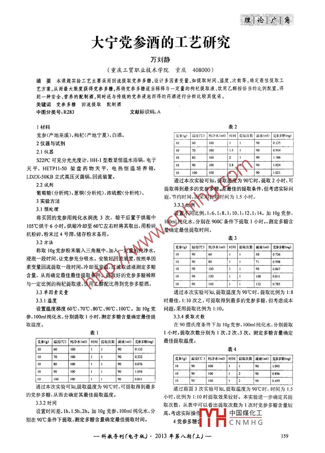 理論廣「角大寧黨參酒的工藝研究萬劉靜(重慶工貿職業(yè)技術學院重慶408000摘要本課題實驗工藝主要采用回流提取黨參多糖,設計多因素變量,如提取時間、溫度、次數等。確定最佳提取工藝方案,從而最大限度獲得黨參多糖,再將黨參多糖適當稀釋與一定量的枸杞提取液、飲用乙醇按恰當的比例配置,得到一種安全、營養(yǎng)的配制酒,同時還與傳統(tǒng)的黨參浸泡而得的藥酒進行分析比較其優(yōu)劣。關鍵詞黨參多糖回流提取配制酒中圖分類號:R283文獻標識碼:A1材料表2黨參(產地巫溪),枸杞(產地寧夏),白酒。黨參(g)溫度(℃)|純凈水mD時間提取次數濾液m)克多mnp2儀器與試劑0.135器0954S2PC可見分光光度計,HH-1型數顯恒溫水浴鍋,電子2811024天平, HETPIl-50架盤藥物天平,電熱恒溫培養(yǎng)箱,LDZX-50KB立式高壓滅菌鍋,回流裝置通過本次實驗可知,提取溫度為90℃時,提取2小時,可22試劑葡萄糖(分析純),蒽銅(分析純),濃硫酸(分析純)提取得到最多的黨參多糖,是最佳的提取條件,但考慮實際問3實驗方法題,節(jié)約時間,而采用提取時間為1.5小時。333比例3.1預處理設置不同比例,1:6、1:8、1:10、1:12、:14。加10g黨參將買回的黨參用純化水潤洗3次,晾干后置于烘箱中100ml純化水,分別在900C條件下提取1小時。,測定多糖含105℃烘干6小時。烘箱冷卻至60℃左右時將其取出,用粉碎量確定最佳提取時間。機粉碎,粉末過4號篩,儲存粉末備用。表332方法稱取10g黨參粉末裝入三角瓶中,加入一定量的純凈水參g)溫度(℃)純凈水(m)時問提取次數濾液(mD黨參多(mp浸泡一段時間,讓黨參充分吸水。安裝好回流裝置,按照單因710.998素變量回流提取一段時間,冷卻至室溫,過濾取濾液測定多糖含量,從而確定最佳最佳提取條件。提取好的黨參多糖稀釋08l與一定比例的枸杞提取液,飲用乙醇配比得到黨參多糖酒。00033單因素變量通過本次實驗可知提取溫度為90℃時,提取比例為18331溫度時最佳,1:10次之,可提取得到最多的黨參多糖,但考慮成本設置溫度梯度60℃、70℃、80℃、90℃、100℃。加10g黨問題,采用提取比例為1:10。參,100m純化水,分別提取l小時,測定多糖含量確定最佳提.34提取次數取溫度。在90攝氏度條件下加10g黨參,100m純化水,分別提取表l1小時,提取次數分別為1次、2次、3次。測定多糖含量確定參(g)溫度(℃)純凈水(m)時間提取次數|濾液(m)克參多糖(m最佳提取溫度。100.l33表40232黨參(g)溫度(℃)純凈水(m)時間提取次數濾液(m)覺參多貼ony)1093通過本次實驗可知提取溫度為90℃時,可提取得到最多通過前面3次實驗可知,提取溫度為90℃時,時間為15的黨參多糖,從而去確定其最佳提取溫度。小時,比例為1:10時提取效果較好。本實驗進一步確定其提332時間取次數,從表中可以看出提取次數為1次時黨參多糖含量較設置時間差,hhh加10g黨參,100m純化水,分高考慮實際操中國煤化工別在90℃條件下提取,測定多糖含量確定最佳提取時間。4黨參多糖CNMHG科教導刊(電子版)·2013年第八期(上)理|論|廣|角葡萄糖標準曲線y=9.938X+0.00220.4NR2◆系列1線性(系列1)00010.0020.0030.0040.0050.006c mg/ml5重金屬含量測定高,為了節(jié)約實驗時間確定提取時間為lh。提取一次黨參多取濾液5nl,置于25ml納氏比色管中,加水l8m搖勻后,糖含量較高,隨著提取次數的增加黨參多糖的含量減少加醋酸鈉緩沖溶液(pH3.5)2ml:另取一支25ml納氏比色管綜上所述實以固液比1:10,提取溫度90℃,提取次數1加入標鉛溶液(1ml中相當于10ug的Pb)5ml,加水18m,再次,時間h為條件進行提取。加醋酸鈉緩沖溶液2ml。7討論兩支比色管中分別加入2ml硫代乙酰胺試液,充分搖勻本實驗通過設置的單因素變量,提取黨參多糖含量較高,置于白紙上,自上向下透視,試樣比色管中顯出的顏色與對照應該做四因素三水平正交實驗,得到的結果會更優(yōu)。液管比較,不得更深。6結果參考文獻通過設計單因素變量確定最佳提取條件。提取溫度90℃楊榮平,等GCMS法分析大寧黨參揮發(fā)油化學成分以中國實用醫(yī)藥,2007為最佳提取溫度隨著溫度的增加黨參多糖的含量增加,但溫12)杜清春民堅郭巧生明黨參多糖提取工藝研究現代中醫(yī)研究與實踐度超過90℃時含量下降。固液比為1:8,1:10時,提取效果較005(4)好,1:8的提取效果比1:10又好一些,但考慮成本問題采用1:1劉魯生湯金森自制配制酒M上海上??茖W技術出版社,99[4]李曉燕張曉輝現代儀器分析M北京:化工出版社,200810的比例進行提取。提取時間為h,1h時黨參多糖含量較s)張俊藥物分析北京高等教育出版社206上接第158頁)先,要搜集盡可能全面的情報,認真分析搜集保工作的積極性和能動性。最后,要建立公眾環(huán)境監(jiān)督的法來的資料,確定可能污染源根據規(guī)定控制污染源的排污總量,律救濟制度,以確保社會公眾及社會團體積極參與監(jiān)督管理達到預防的目標。其次,要對企業(yè)環(huán)保設施的運行按照環(huán)保后的生命安全及財產安全等等,保證我國在以后的環(huán)保工作設施運行管理制度進行嚴格的監(jiān)督管理,防止企業(yè)偷排及其中存在持續(xù)穩(wěn)定的社會力量環(huán)保設施的不正常運行。最后,要核實企業(yè)的實際排污總量排污去向和污水處理情況等,進行嚴格的監(jiān)督檢查達到對已★基金項目:國家社會科學基金項目“京津冀區(qū)域經濟排出污染物進行控制的目的。體化戰(zhàn)略與推進河北沿海地區(qū)發(fā)展對策研究
