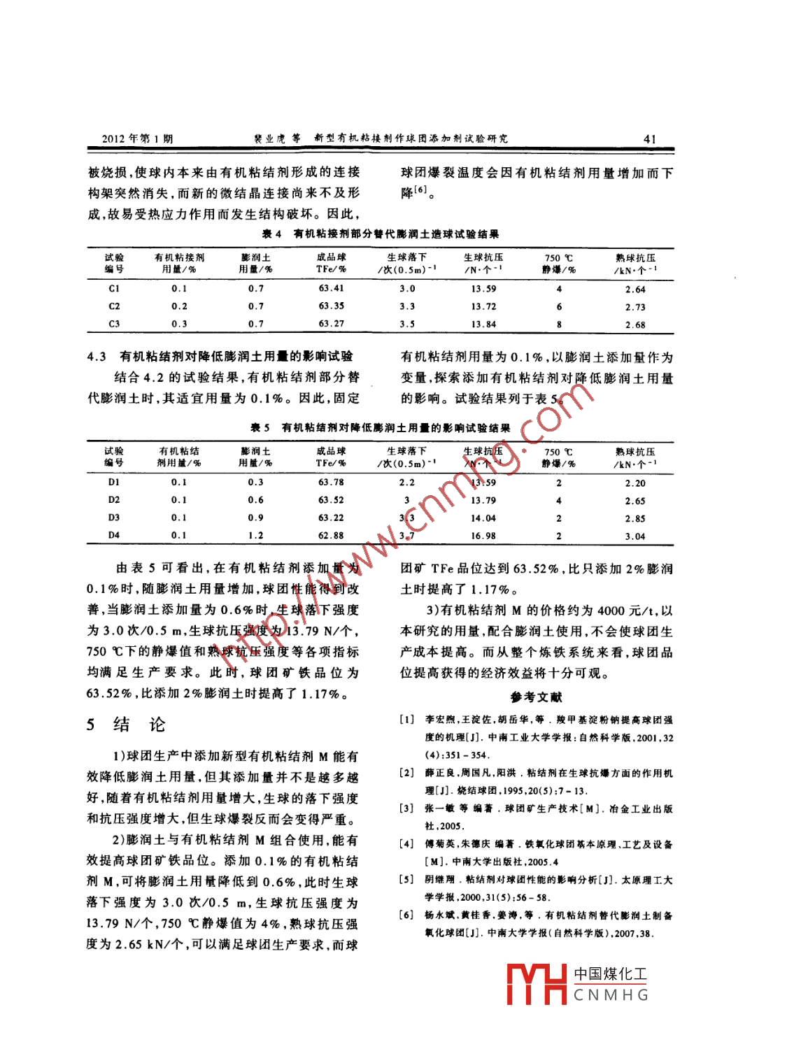 第37卷第1期燒結(jié)球2012年2月Sintering and Pelletizing9新型有機粘接劑作球團添加劑試驗研究裴業(yè)虎'2,甘學鋒',2,陳義勇2(1.佛山地質(zhì)局,廣東佛山528000;2.四會飛來峰非金屬礦物材料有限公司,廣東四會市526240)摘要:針對國 內(nèi)球團廠膨潤土添加量過大,造成球團礦鐵晶位降低的問題,研究了新型添加劑M部分昝代膨潤土制備球團的效果。結(jié)果表明,添加少量的有機粘結(jié)劑可有效降低膨潤土用量,用0.1%的M拌0.6%的膨潤土造球,球團礦的各項性能指標均能滿足生產(chǎn)要求.比只添加2%膨潤土的球團鐵品位提高了1.17%。關(guān)鍵詞:球團礦;有機粘結(jié)劑;膨潤土;球團試驗中圈分類號: TF046.6文獻標識碼: A文章編號: 1000- 8764(2012)01 - 0039- 03Experimental Research on New Type of Organic Binder as Pellet AdditivePEI Ye-bul.2 ,GAN Xue feng.2 ,CHEN Yi-yong2(1. Foshan Bureau of Geology , Foshan 528000, Guangdong ;2. Sihuifilaifeng Non- metallicMineral Materials Co.. Lid., Sihui 526240, Cuangdong)Abstract In view of lower grade iron grade in pellet caused by addition of excessive bentonite in domestic plletizingplant, the effet of partial replacement of bentonite with new type of additive M for preparation of pellet was researched. Themix with 0.6% bentonite for pelletizing, all the performance indexes can meet production requirements, and the iron grade inpellet is 1.17% higher than that with addition of only 2 % bentonite.Key words pllet;organie binder;entniteletizing test本研究旨在應(yīng)用新型有機粘結(jié)劑部分代替1前言膨潤土,以降低膨潤土用量,提高成品球團礦鐵,目前,鐵礦球團生產(chǎn)主要以膨潤土作粘結(jié)品位,同時滿足球團生產(chǎn)對成本的控制。劑,國內(nèi)球團廠膨潤土的添加量一般為2% ~2試驗原料3.5%。高爐煉鐵實踐表明,提高人爐球團礦的鐵品位,對高爐實現(xiàn)高產(chǎn)、低耗意義重大。從理2.1 膨潤土論上講,人爐原料球團鐵品位每提高1%,焦比試驗所用膨潤土取自河南信陽,原礦為粉降低2%,產(chǎn)量可提高3%1.2]。原料SiO2 含量砂狀,呈白色一淺灰色、磚紅色致密塊狀,蠟狀升高,會使焦比上升,對球團生產(chǎn)和高爐冶煉都-土狀光澤,鋸齒狀斷口。其成分分析(XRF)帶來不利影響。國內(nèi)外很多學者對降低球團中列于表1。膨潤土添加量進行了大量研究,有人嘗試過全此土堿性系數(shù)=(ENa* + zK* )/(ECa2+ +部用有機粘結(jié)劑代替膨潤土生產(chǎn)球團礦,但由EMg2*) = 0.32/3.66=0.09< 1,系鈣基膨潤于球團的冶煉性能不佳或者生產(chǎn)成本過高而未土。將其用堆場鈉化法進行鈉化改性,改性后能在實際生產(chǎn)中得到廣泛應(yīng)用。膨潤土的各項指標見表2。收稿日期:2011- 10-31中國煤化工作者簡介:裴業(yè)虎(1989 - ),男,研究員,現(xiàn)就職于佛山地質(zhì)局所屬四會飛來峰非金屬礦物材料有.MYHCNMHG40燒第37卷第1期表1膨潤土原礦X光熒光分析結(jié)果(%)SiOzAl2O3Fe20;CaOMgO20SrOZrO3BaONa2069. 4614.850.401.524.270.0160.0540. 0240.240.089表2鈉化改性后的膨潤土性能指標1250C,焙燒時間31min。成品球的抗壓強度吸藍量蒙脫石 膨脹容 2h吸水 膠質(zhì)價在智能球團壓力機上測定。/g*(100g)-'含量/% /mL'g"'_ 率/% /mL(I5g) -132.5 .67.71375.70684試驗結(jié)果及分析2.2 鐵精礦4.1膨潤土 造球試驗試驗用鐵精礦來自尖山鐵礦,是尖山鐵礦A為基準試樣,不加任何添加劑,B組用膨選礦廠的最終精礦。經(jīng)陶瓷過濾機脫水后,含潤土作添加劑參與造球,檢測球團礦的各項性水率為8% ~9%, TFe64.76%。鐵精礦中的鐵能,以研究膨潤土在不同用量時對球團各項技礦物主要是磁鐵礦,脈石礦物主要是石英,術(shù)指標的影響。試驗結(jié)果列于表3。-0.074 mm的含量為97.48%,-0.045 mm的3膨潤土造球試驗結(jié)果含量為79.80%。特驗膨潤土成品球落下強生球抗 750 C熟球抗2.3有機粘接劑試驗用量TFe度/次壓強度靜爆壓強度/kN.個-1本試驗使用一種新型有機粘結(jié)劑M,它是A064.252.27.32$ 2.08-種聚合物,是在天然高分子化合物上植人了大量的羧基和羥基基團的合成物質(zhì)。其主要成B2 1.5 62.76 3.1 9.50 10 2.54分為碳水化合物,具有多種支鏈結(jié)構(gòu),其特點是溶10.542.89于水后粘結(jié)性強,經(jīng)高溫氧化焙燒后生成CO2和B4 2.5 61.86 4.1 12.29水蒸氣,在球團礦中殘留量少,帶人有害物質(zhì)少。由表3可知,生球落下強度和抗壓強度均隨膨潤土添加量增大而升高,當膨潤土添加量3試驗方法達2.0%時,球團的各項性能才能滿足生產(chǎn)要3.1 試驗流程求。此時球團礦TFe為62.35%,比不加入任何球團試驗流程見圖1。添加劑時降低了1 .90%??梢姡砑优驖櫷翆鐵精礦+生球檢測1球團鐵品位影響很大。主要原因是膨潤土作為|添加劑[混料→運球了一干燥.球團添加劑幾乎全部殘留在球團礦中[3-5]。4.2用有機粘結(jié)劑部分替代膨潤土造球試驗成品球檢測成品球]培燒]-考慮到有機粘結(jié)劑全部代替膨潤土作為球圈1球團試驗流程圉團粘結(jié)劑會降低球團的爆裂溫度,因此保留部分膨潤土,以有機粘結(jié)劑的添加量作為變量,分3.2試驗方法鐵精礦烘干后與添加劑配合,采用人工混別對球團的各項指標進行測試,以研究有機粘勻,然后送入F- 800圓盤造球機(0800 mm,轉(zhuǎn)結(jié)劑的部分代替性能。試驗結(jié)果列于表4。速22 r/min,傾角45°)中造球。為了模擬實際由表4可知,生球的落下強度和抗壓強度生產(chǎn)情況,造球過程分為母球形成、母球長大和隨有機粘結(jié)劑用量增加而提高。膨潤土添加量生球