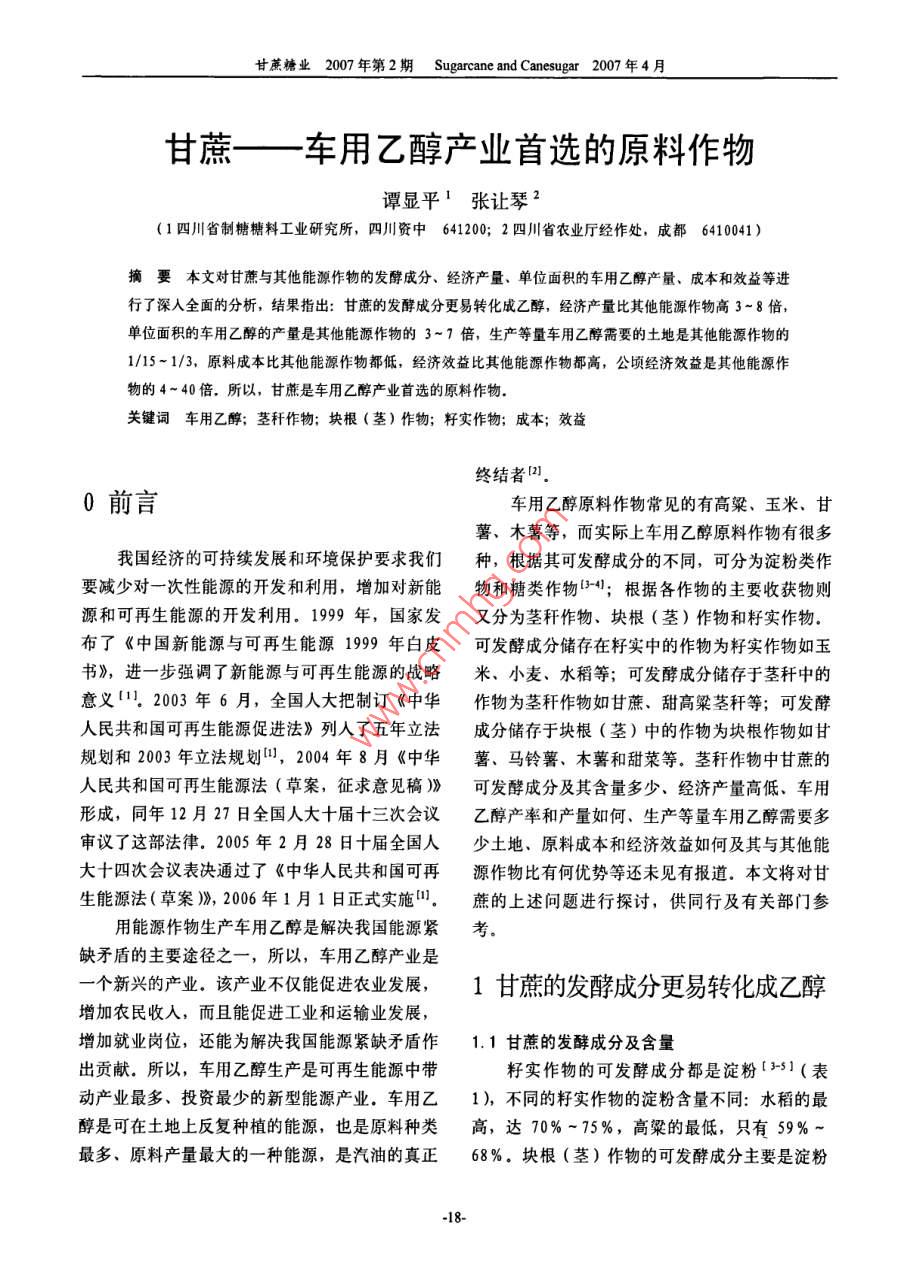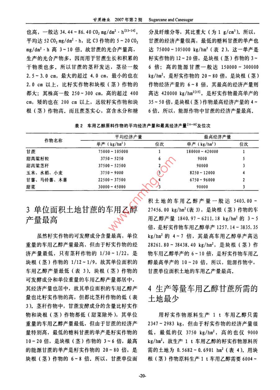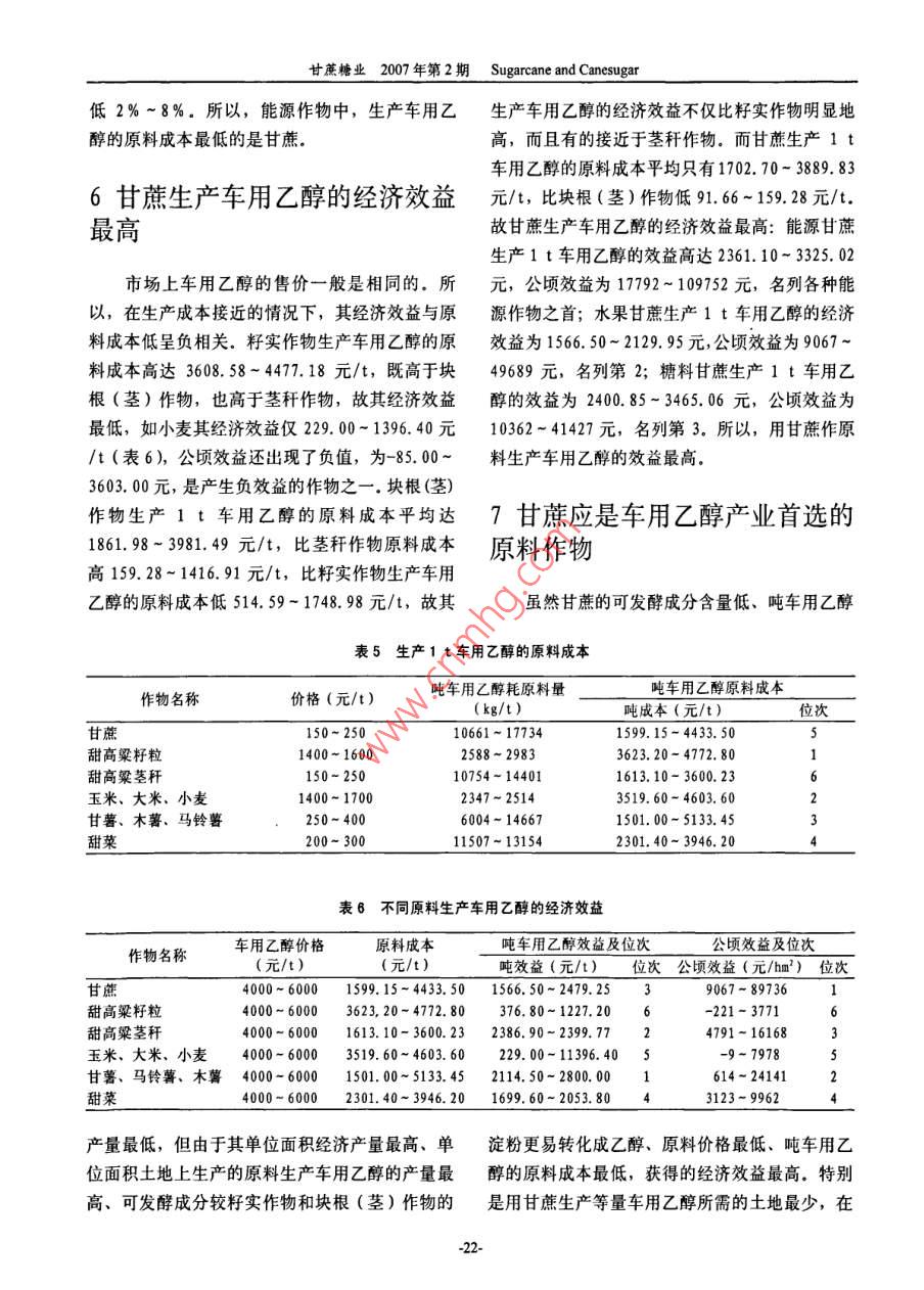 甘蔗糖業(yè)2007年第2期 Sugarcane and Canesugar200年4月甘蔗——一車用乙醇產(chǎn)業(yè)首選的原料作物譚顯平1張讓琴2(1四川省制糖糖料工業(yè)研究所,四川資中641200;2四川省農(nóng)業(yè)廳經(jīng)作處,成都6410041)摘要本文對(duì)甘蔗與其他能源作物的發(fā)酵成分、經(jīng)濟(jì)產(chǎn)量、單位面積的車用乙醇產(chǎn)量、成本和效益等進(jìn)行了深人全面的分析,結(jié)果指出:甘蔗的發(fā)酵成分更易轉(zhuǎn)化成乙醇,經(jīng)濟(jì)產(chǎn)量比其他能源作物高3~8倍單位面積的車用乙醇的產(chǎn)量是其他能源作物的3~7倍,生產(chǎn)等量車用乙醇需要的土地是其他能源作物的1/15-1/3,原料成本比其他能源作物都低,經(jīng)濟(jì)效益比其他能源作物都高,公頃經(jīng)濟(jì)效益是其他能源作物的4~40倍,所以,甘蔗是車用乙醇產(chǎn)業(yè)首選的原料作物關(guān)鍵詞車用乙醇;莖稈作物;塊根(莖)作物;籽實(shí)作物;成本;效益終結(jié)者田0前言車用乙醇原料作物常見的有高粱、玉米、甘薯、木薯等,而實(shí)際上車用乙醇原料作物有很多我國經(jīng)濟(jì)的可持續(xù)發(fā)展和環(huán)境保護(hù)要求我們種,根據(jù)其可發(fā)酵成分的不同,可分為淀粉類作要減少對(duì)一次性能源的開發(fā)和利用,增加對(duì)新能物和糖類作物34";根據(jù)各作物的主要收獲物則源和可再生能源的開發(fā)利用,1999年,國家發(fā)又分為莖稈作物、塊根(莖)作物和籽實(shí)作物布了《中國新能源與可再生能源1999年白皮可發(fā)酵成分儲(chǔ)存在籽實(shí)中的作物為籽實(shí)作物如玉書》,進(jìn)一步強(qiáng)調(diào)了新能源與可再生能源的戰(zhàn)略米、小麥、水稻等;可發(fā)酵成分儲(chǔ)存于莖稈中的意義12003年6月,全國人大把制訂《中華作物為莖稈作物如甘蔗、甜高粱莖稈等;可發(fā)酵人民共和國可再生能源促進(jìn)法》列人了五年立法成分儲(chǔ)存于塊根(莖)中的作物為塊根作物如甘規(guī)劃和203年立法規(guī)劃,204年8月《中華薯、馬鈴薯、木薯和甜菜等。莖稈作物中甘蔗的人民共和國可再生能源法(草案,征求意見稿)》可發(fā)酵成分及其含量多少、經(jīng)濟(jì)產(chǎn)量高低、車用形成,同年12月27日全國人大十屆十三次會(huì)議乙醇產(chǎn)率和產(chǎn)量如何、生產(chǎn)等量車用乙醇需要多審議了這部法律,2005年2月28日十屆全國人少土地、原料成本和經(jīng)濟(jì)效益如何及其與其他能大十四次會(huì)議表決通過了《中華人民共和國可再源作物比有何優(yōu)勢(shì)等還未見有報(bào)道。本文將對(duì)甘生能源法(草案)》,2006年1月1日正式實(shí)施,蔗的上述問題進(jìn)行探討,供同行及有關(guān)部門參用能源作物生產(chǎn)車用乙醇是解決我國能源緊考缺矛盾的主要途徑之一,所以,車用乙醇產(chǎn)業(yè)是一個(gè)新興的產(chǎn)業(yè)該產(chǎn)業(yè)不僅能促進(jìn)農(nóng)業(yè)發(fā)展,1甘蔗的發(fā)酵成分更易轉(zhuǎn)化成乙醇增加農(nóng)民收入,而且能促進(jìn)工業(yè)和運(yùn)輸業(yè)發(fā)展增加就業(yè)崗位,還能為解決我國能源緊缺矛盾作1.1甘蔗的發(fā)酵成分及含量出貢獻(xiàn),所以,車用乙醇生產(chǎn)是可再生能源中帶籽實(shí)作物的可發(fā)酵成分都是淀粉[51(表動(dòng)產(chǎn)業(yè)最多、投資最少的新型能源產(chǎn)業(yè),車用乙1),不同的籽實(shí)作物的淀粉含量不同:水稻的最醇是可在土地上反復(fù)種植的能源,也是原料種類高,達(dá)70%-75%,高粱的最低,只有9%最多、原料產(chǎn)量最大的一種能源,是汽油的真正68%。塊根(莖)作物的可發(fā)酵成分主要是淀粉譚顯平等:甘蔗一一車用乙醇產(chǎn)業(yè)首選的原料作物(甜菜除外),其含量因作物而異:木薯最高,比其他莖稈能源作物低1.2%-2.0%,甘蔗中,為22%-28%,鮮馬鈴薯的最低,只有12%~糖料甘蔗的蔗糖含量最高,平均達(dá)13%-16%25%,甘蔗的可發(fā)酵成分與其他莖稈能源作物一還含有0.2%-1.5%的單糖;能源甘蔗的蔗糖樣,都是蔗糖、葡萄糖和果糖(表1),其中蔗含量居中,平均12%-15%,其單糖為0.5%糖的含量最高,一般在12%-16%之間,最高2.0%;水果甘蔗的蔗糖含量為10%-13%,單超過17%,比其他莖稈能源作物高;而葡萄糖糖含量為0.8%-2.5%·甜高粱的可發(fā)酵成分和果糖(二者都是單糖,統(tǒng)稱還原糖)的含量則含量最低,蔗糖含量只有11%-13%,單糖含較低,最高不超過3%,最低的僅0.2%(表1),量為2.0%-4.5%表1車用乙醇原料作物中可發(fā)酵成分及其含量1作物名稱主要收獲物主要可發(fā)酵成分、含量及位次次要可發(fā)酵成分,含量及位次發(fā)酵成分含量(%)位次發(fā)酵成分含量(%)位次甘蔗桿蔗糖單糖0.2-2.5甜高粱籽粒淀粉甜高粱莖稈蔗糖單糖玉米、水稻,小麥籽粒淀粉甘薯、馬鈴薯、木薯塊根(莖)淀粉12-28單糖0.03-3.52甜菜蔗糖14-164單糖0.13-0.151.2甘蔗的可發(fā)酵成分容易轉(zhuǎn)化成乙醇成分比籽實(shí)作物和塊根(莖)作物(甜菜除外)蔗莖中的可發(fā)酵成分經(jīng)過壓榨等工藝過程被的發(fā)酵成分更易轉(zhuǎn)化成乙醇提取出來后,經(jīng)過稀釋處理和添加營養(yǎng)鹽后即可用于酒精發(fā)酵.其中的單糖通過擴(kuò)散作用進(jìn)人酵2甘蔗的光能利用率和經(jīng)濟(jì)產(chǎn)量母菌細(xì)胞體內(nèi),在酵母體內(nèi)酒化酶系的作用下發(fā)最高酵生成乙醇和二氧化碳3CH O-MfEM+2C H, OH+2CO, t2.1甘蔗的光能利用率
