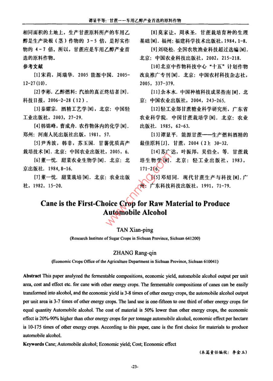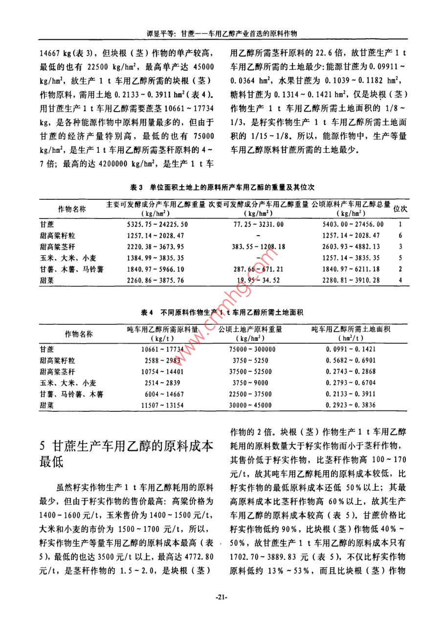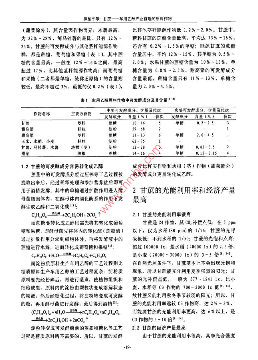 甘蔗糖業(yè)2007年第2期 Sugarcane and Canesugar200年4月甘蔗——一車用乙醇產(chǎn)業(yè)首選的原料作物譚顯平1張讓琴2(1四川省制糖糖料工業(yè)研究所,四川資中641200;2四川省農(nóng)業(yè)廳經(jīng)作處,成都6410041)摘要本文對(duì)甘蔗與其他能源作物的發(fā)酵成分、經(jīng)濟(jì)產(chǎn)量、單位面積的車用乙醇產(chǎn)量、成本和效益等進(jìn)行了深人全面的分析,結(jié)果指出:甘蔗的發(fā)酵成分更易轉(zhuǎn)化成乙醇,經(jīng)濟(jì)產(chǎn)量比其他能源作物高3~8倍單位面積的車用乙醇的產(chǎn)量是其他能源作物的3~7倍,生產(chǎn)等量車用乙醇需要的土地是其他能源作物的1/15-1/3,原料成本比其他能源作物都低,經(jīng)濟(jì)效益比其他能源作物都高,公頃經(jīng)濟(jì)效益是其他能源作物的4~40倍,所以,甘蔗是車用乙醇產(chǎn)業(yè)首選的原料作物關(guān)鍵詞車用乙醇;莖稈作物;塊根(莖)作物;籽實(shí)作物;成本;效益終結(jié)者田0前言車用乙醇原料作物常見的有高粱、玉米、甘薯、木薯等,而實(shí)際上車用乙醇原料作物有很多我國經(jīng)濟(jì)的可持續(xù)發(fā)展和環(huán)境保護(hù)要求我們種,根據(jù)其可發(fā)酵成分的不同,可分為淀粉類作要減少對(duì)一次性能源的開發(fā)和利用,增加對(duì)新能物和糖類作物34";根據(jù)各作物的主要收獲物則源和可再生能源的開發(fā)利用,1999年,國家發(fā)又分為莖稈作物、塊根(莖)作物和籽實(shí)作物布了《中國新能源與可再生能源1999年白皮可發(fā)酵成分儲(chǔ)存在籽實(shí)中的作物為籽實(shí)作物如玉書》,進(jìn)一步強(qiáng)調(diào)了新能源與可再生能源的戰(zhàn)略米、小麥、水稻等;可發(fā)酵成分儲(chǔ)存于莖稈中的意義12003年6月,全國人大把制訂《中華作物為莖稈作物如甘蔗、甜高粱莖稈等;可發(fā)酵人民共和國可再生能源促進(jìn)法》列人了五年立法成分儲(chǔ)存于塊根(莖)中的作物為塊根作物如甘規(guī)劃和203年立法規(guī)劃,204年8月《中華薯、馬鈴薯、木薯和甜菜等。莖稈作物中甘蔗的人民共和國可再生能源法(草案,征求意見稿)》可發(fā)酵成分及其含量多少、經(jīng)濟(jì)產(chǎn)量高低、車用形成,同年12月27日全國人大十屆十三次會(huì)議乙醇產(chǎn)率和產(chǎn)量如何、生產(chǎn)等量車用乙醇需要多審議了這部法律,2005年2月28日十屆全國人少土地、原料成本和經(jīng)濟(jì)效益如何及其與其他能大十四次會(huì)議表決通過了《中華人民共和國可再源作物比有何優(yōu)勢(shì)等還未見有報(bào)道。本文將對(duì)甘生能源法(草案)》,2006年1月1日正式實(shí)施,蔗的上述問題進(jìn)行探討,供同行及有關(guān)部門參用能源作物生產(chǎn)車用乙醇是解決我國能源緊考缺矛盾的主要途徑之一,所以,車用乙醇產(chǎn)業(yè)是一個(gè)新興的產(chǎn)業(yè)該產(chǎn)業(yè)不僅能促進(jìn)農(nóng)業(yè)發(fā)展,1甘蔗的發(fā)酵成分更易轉(zhuǎn)化成乙醇增加農(nóng)民收入,而且能促進(jìn)工業(yè)和運(yùn)輸業(yè)發(fā)展增加就業(yè)崗位,還能為解決我國能源緊缺矛盾作1.1甘蔗的發(fā)酵成分及含量出貢獻(xiàn),所以,車用乙醇生產(chǎn)是可再生能源中帶籽實(shí)作物的可發(fā)酵成分都是淀粉[51(表動(dòng)產(chǎn)業(yè)最多、投資最少的新型能源產(chǎn)業(yè),車用乙1),不同的籽實(shí)作物的淀粉含量不同:水稻的最醇是可在土地上反復(fù)種植的能源,也是原料種類高,達(dá)70%-75%,高粱的最低,只有9%最多、原料產(chǎn)量最大的一種能源,是汽油的真正68%。塊根(莖)作物的可發(fā)酵成分主要是淀粉譚顯平等:甘蔗一一車用乙醇產(chǎn)業(yè)首選的原料作物(甜菜除外),其含量因作物而異:木薯最高,比其他莖稈能源作物低1.2%-2.0%,甘蔗中,為22%-28%,鮮馬鈴薯的最低,只有12%~糖料甘蔗的蔗糖含量最高,平均達(dá)13%-16%25%,甘蔗的可發(fā)酵成分與其他莖稈能源作物一還含有0.2%-1.5%的單糖;能源甘蔗的蔗糖樣,都是蔗糖、葡萄糖和果糖(表1),其中蔗含量居中,平均12%-15%,其單糖為0.5%糖的含量最高,一般在12%-16%之間,最高2.0%;水果甘蔗的蔗糖含量為10%-13%,單超過17%,比其他莖稈能源作物高;而葡萄糖糖含量為0.8%-2.5%·甜高粱的可發(fā)酵成分和果糖(二者都是單糖,統(tǒng)稱還原糖)的含量則含量最低,蔗糖含量只有11%-13%,單糖含較低,最高不超過3%,最低的僅0.2%(表1),量為2.0%-4.5%表1車用乙醇原料作物中可發(fā)酵成分及其含量1作物名稱主要收獲物主要可發(fā)酵成分、含量及位次次要可發(fā)酵成分,含量及位次發(fā)酵成分含量(%)位次發(fā)酵成分含量(%)位次甘蔗桿蔗糖單糖0.2-2.5甜高粱籽粒淀粉甜高粱莖稈蔗糖單糖玉米、水稻,小麥籽粒淀粉甘薯、馬鈴薯、木薯塊根(莖)淀粉12-28單糖0.03-3.52甜菜蔗糖14-164單糖0.13-0.151.2甘蔗的可發(fā)酵成分容易轉(zhuǎn)化成乙醇成分比籽實(shí)作物和塊根(莖)作物(甜菜除外)蔗莖中的可發(fā)酵成分經(jīng)過壓榨等工藝過程被的發(fā)酵成分更易轉(zhuǎn)化成乙醇提取出來后,經(jīng)過稀釋處理和添加營養(yǎng)鹽后即可用于酒精發(fā)酵.其中的單糖通過擴(kuò)散作用進(jìn)人酵2甘蔗的光能利用率和經(jīng)濟(jì)產(chǎn)量母菌細(xì)胞體內(nèi),在酵母體內(nèi)酒化酶系的作用下發(fā)最高酵生成乙醇和二氧化碳3CH O-MfEM+2C H, OH+2CO, t2.1甘蔗的光能利用率