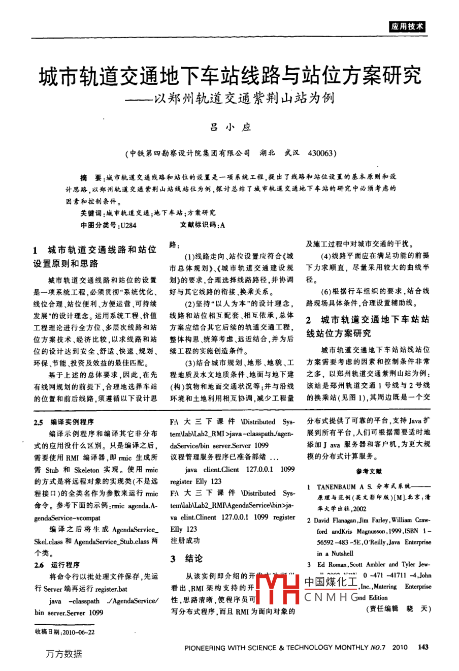 用技術RMI原理及應用劉派(北京郵電大學軟件學院北京100876)摘要:為了屏蔽計算機網(wǎng)絡硬件設備及操作系統(tǒng)上的差別從而系統(tǒng)之間的通信,筆者引入了基于JAA的遠程方法調(diào)用(RM)。RM提供分布式對象間的通訊,允許獲得在遠程進程中的對象的引用,進而通過引用調(diào)用遠程對象的方法,就好像該對象是與客戶端代碼同樣運行在本地進程中一樣。通過RM議程服務的實例,介紹了基于JAVA的RM與 Socket結(jié)合的應用。RM架構使編程思路更為清晰,代碼結(jié)構化更強,更加容易實現(xiàn)關鍵字:通信;遠程方法調(diào)用;分布式對象;議程中圖分類號:TP12文獻標識碼:A隨著信息化的飛速發(fā)展,信息資源共享成了必經(jīng)之路,此時就要用到遠程c1.2RM優(yōu)點方法調(diào)用RMI( RemoteMeth Invoca-包括:①面向?qū)ο?可將完整的對ion),可以在不同的Java虛擬機(JVM)象作為參數(shù)和返回值進行傳遞,而不僅之間實現(xiàn)對象與對象的通信。VM可以僅是預定義的數(shù)據(jù)類型;②可移動:可位于相同或不同計算機上,在多個JVM將屬性從客戶機移到服務器或從服務中,一個JVM可以調(diào)用存儲在其它器移到客戶機;③安全:使用java內(nèi)置JVM的對象的方法。的安全機制保證下載執(zhí)行時用戶系統(tǒng)圈1 Call, RPC22BM三層果構圖的安全;④可連接現(xiàn)有或者原有的系1RMI技術原理客戶程序和服務程序彼此交互的接口,統(tǒng):可通過Java本機方法接口JN與現(xiàn)11基于RPC的RM介紹它傳輸給遠程引用層的數(shù)據(jù)是從調(diào)度有系統(tǒng)進行交互;⑤編寫一次,到處運Java遠程方法調(diào)用(RM)使得運行流中提取而來。調(diào)度流使用對象序列化行:可移植到任何WM上;⑥分布式在一個Java虛擬機( Java Virtual Ma-機制實現(xiàn)的,通過這個機制,Java對象圾收集:⑦并行計算:多線程處理方法,chine,vM)的對象可以調(diào)用運行另一可以在地址空間進行傳遞。Stb是客戶可使服務器利用這些JAVA線程更好個vM之上的其他對象的方法從而提端的代理,它實現(xiàn)了所有遠程對象的接地并行處理客戶端請求。供了程序間進行遠程通訊的途徑。遠程口; Skeleton是服務器端的實體,它包括13RM實戰(zhàn)過程調(diào)用( Remote Procedure Cal,了一個被具體遠程對象所支持的接口(1)一個正常工作的RMI系統(tǒng)由以RPC),可以用于一個進程調(diào)用另一個進(2)遠程引用( Remote Reference)下幾個部分組成:遠程服務的接口定程(很可能在另一個遠程主機上)中的層。這一層相當于在其之上的Sub義,遠程服務接口的具體實現(xiàn),Smb和過程,從而提供了過程的分布能力。 Java Skeleton層和在其之下的傳輸協(xié)議層之 Skeleton文件,一個運行遠程服務的服的RM則在RPC的基礎上向前又邁進前的中間件,負責處理遠程對象引用的務器,一個RM命名服務,類文件的提了一步,即提供分布式對象間的通訊,創(chuàng)建和管理供者(一個HTP或者FTP服務器),一允許獲得在遠程進程中的對象(稱為遠(3)傳輸協(xié)議( Transport Protocol)個需要這個遠程服務的客戶端程序程對象)的引用(稱為遠程引用),進而層。該層提供了數(shù)據(jù)協(xié)議,用以通過線通過引用調(diào)用遠程對象的方法就好像路傳輸客戶程序和遠程對象間的請求2開發(fā)實例對象是與你的客戶端代碼同樣運行和應答。主要執(zhí)行以下動作①建立遠使用 Java RMI構建一個分布式議在本地進程中一樣。RM使用了術語程地址空間的連接;②對連接進行管理程服務。不同的客戶應能連接到這一共“方法”( Method)強調(diào)了這種進步,即在和監(jiān)控連接狀態(tài);③監(jiān)聽新的調(diào)用:④享的議程服務,并查詢、添加和刪除議分布式基礎上,充分支持面向?qū)ο蟮奶亟⒉⒕S護地址空間的遠中國煤化工服務程序應具備新用性建立新調(diào)用的連接;⑥定位CNMHG用戶所有會踏安排等(1)sudb/ Skeleton層。該層提供了調(diào)度程序,并建立與此調(diào)度圖目理切。丌的步驟見圖2。收稿日期:2010-05-18PIONEERING WITH SCIENCE TECHNOLOGY MONTHLY NO. 7 2010 141到技創(chuàng)叫界RMI原理及應用public AgendaService() throws ja-Lmi RemoteException Ipublic synchronized String register [])I(String userName, String password)if (args length = 0)t=java. mi. Remote ExceptionSystem.out. println("需要UserlsExsited Exception一個命令行參數(shù):程序運行的端口號1099");圖2使用 Java RM構建分布式議程服務田retum message:21定義遠程接口(1)遠程接口必須直接或者間接的擴展自 java rmi Remote接口。遠程接口23創(chuàng)建 Server端parseInt (args[O3);展其它接口,只要被擴展的接口的所有象,就需要將遠程對象注冊到RM的 cateRegistry. create Registry(pot ;3.Lo-還可以在擴展該接口的基礎上,同時擴為了讓客戶程序可以找到遠程對方法與遠程接口的所有方法一樣滿足注冊表。這個過程有時被稱為“引導”過下一個要求。程。為此編寫一個獨立的引導程序負 vice manager= new Server(();(2)遠程方法必須聲明拋出java.責創(chuàng)建和注冊遠程對象首先創(chuàng)建一個java. mi. Namingrmi Remote Exception異常,或者該異常遠程對象(同時導出了該對象)之后將 rebind(" AgendaManager'", manager);的超類( Superclass),在遠程方法聲明該對象綁定到RM注冊表中。 Naming中,作為參數(shù)或者返回值的遠程對象,的 rebind()方法接受一個URL形式的議程管理服務程序已準備就緒…")或者包含在其它非遠程對象中的遠程名字作綁定之